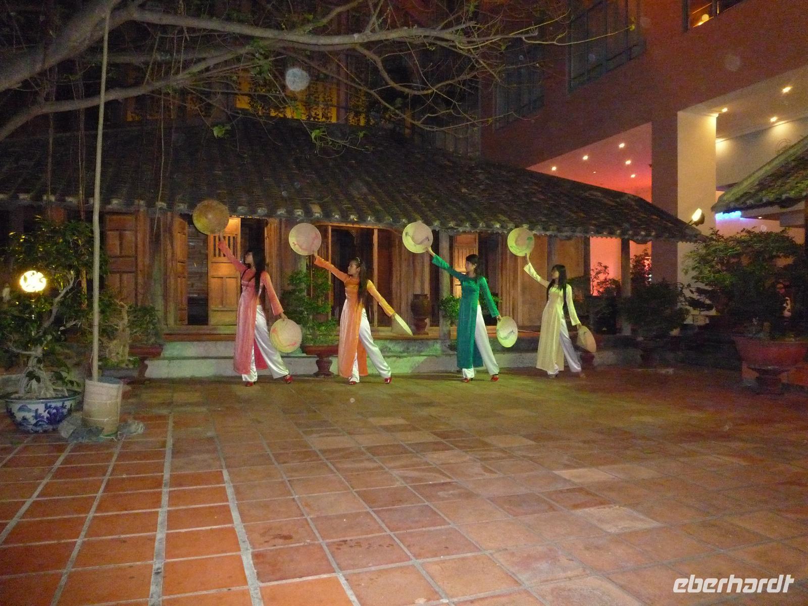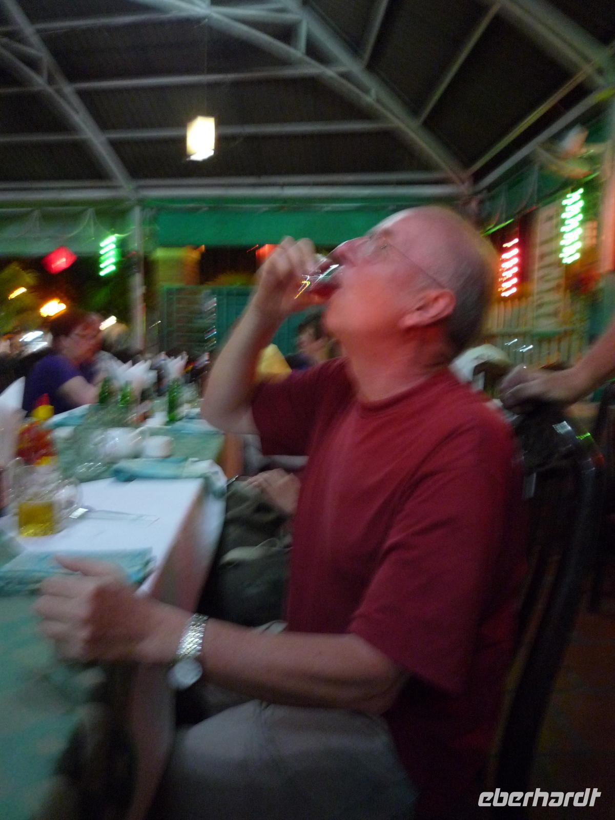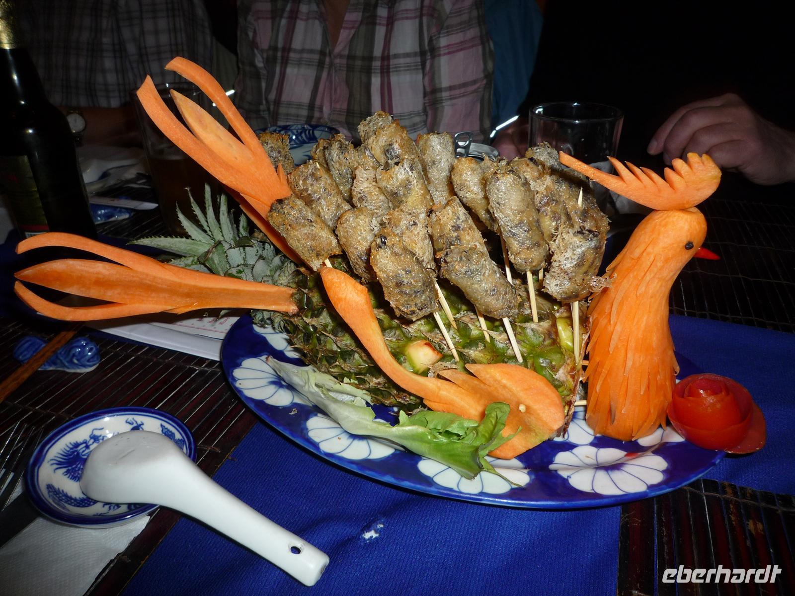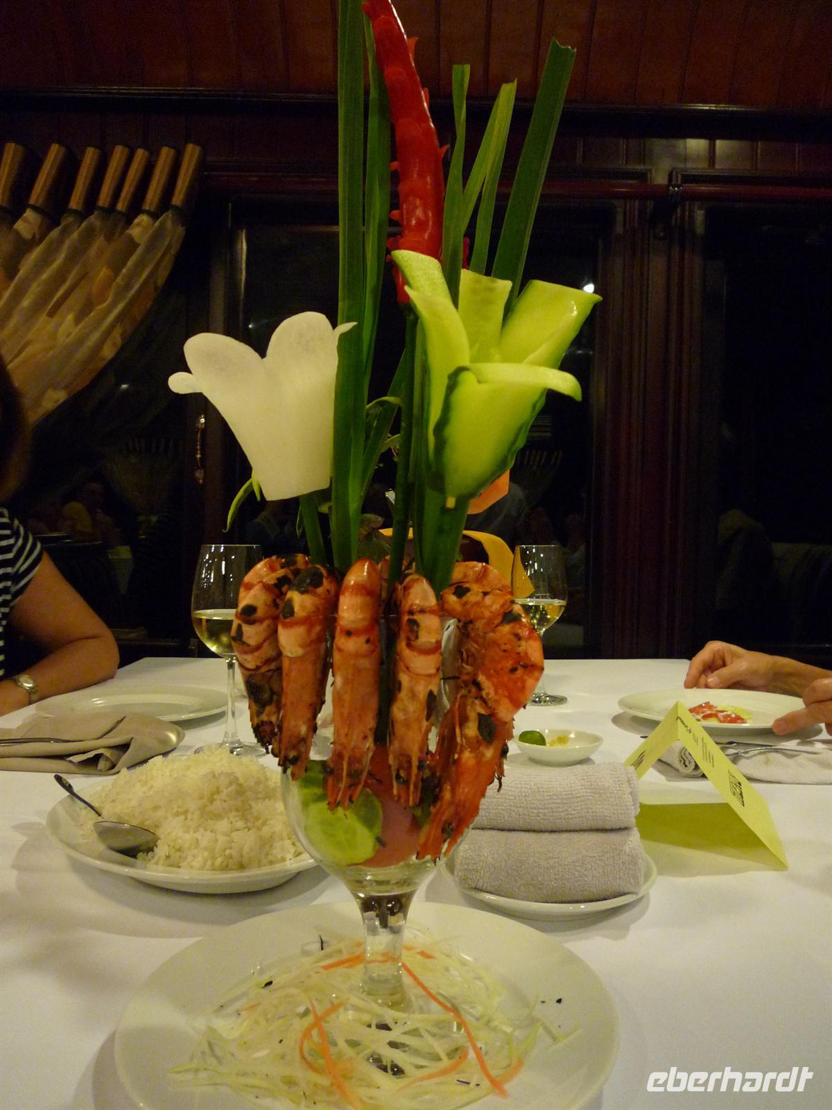 Nun fuhren wir zum Abendessen, was wir uns verdient hatten. In einem schönen Restaurant saßen wir im freien und genossen unser vietnamesisches Menü. Jeden Tag gab es nun 6 - 8 Gänge und jeder konnte sich nehmen, was er wollte. Auch mit dem Stäbchen-Essen wurde es von Tag zu Tag besser, war aber keine Pflicht.