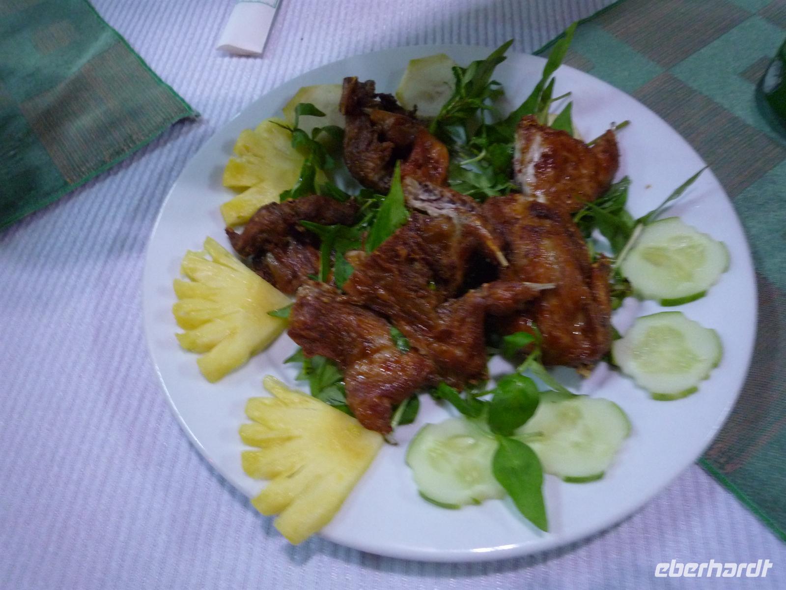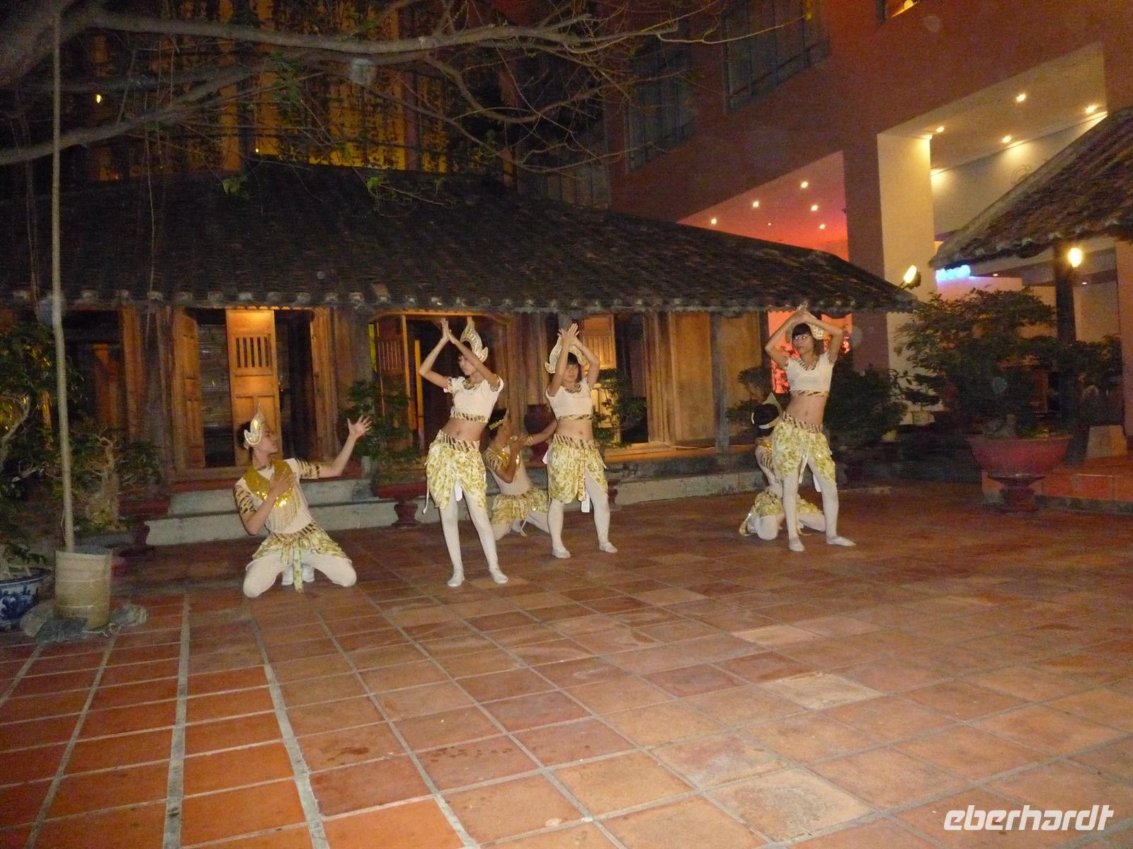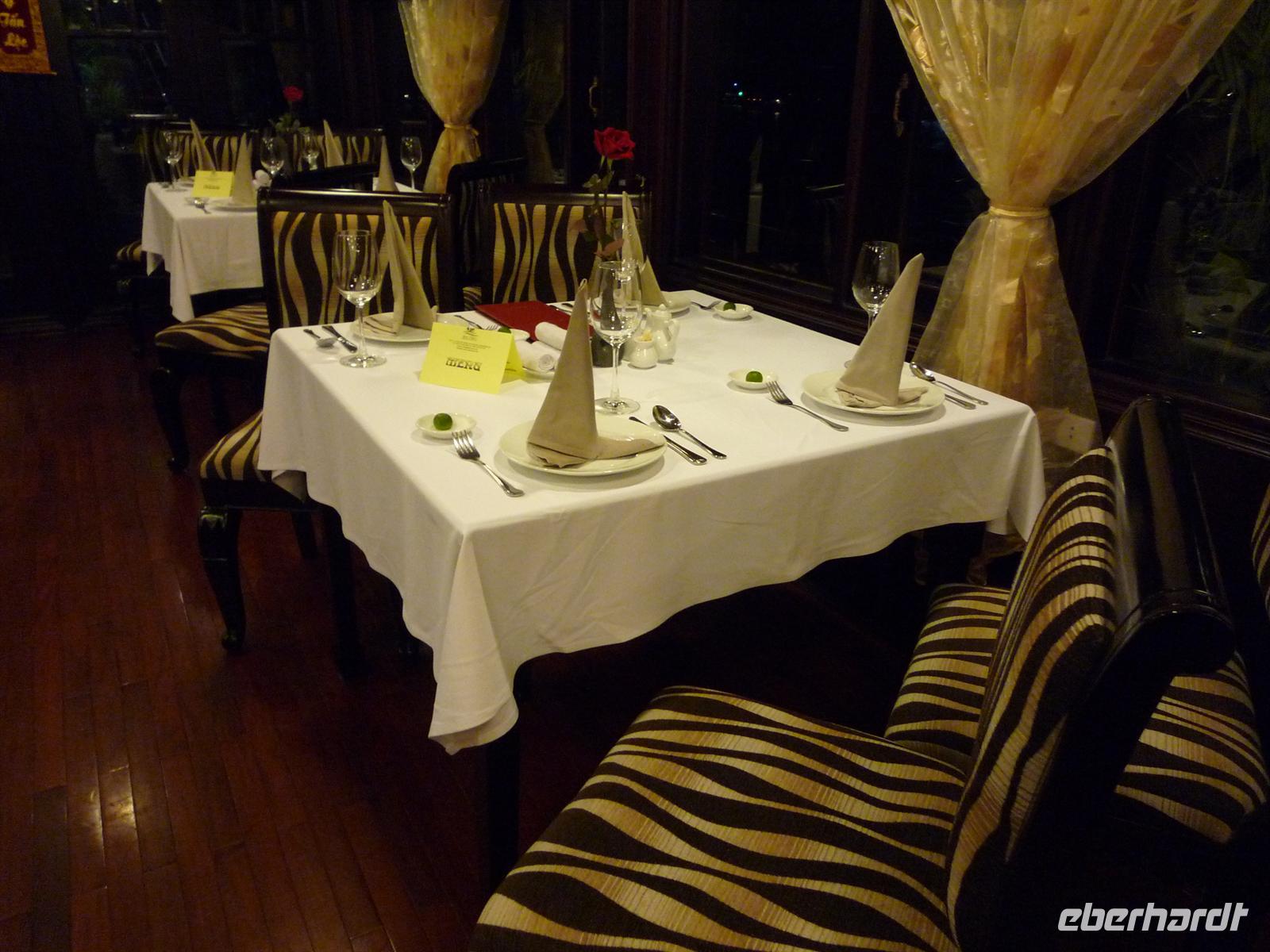 Nun fuhren wir zum Abendessen, was wir uns verdient hatten. In einem schönen Restaurant saßen wir im freien und genossen unser vietnamesisches Menü. Jeden Tag gab es nun 6 - 8 Gänge und jeder konnte sich nehmen, was er wollte. Auch mit dem Stäbchen-Essen wurde es von Tag zu Tag besser, war aber keine Pflicht.