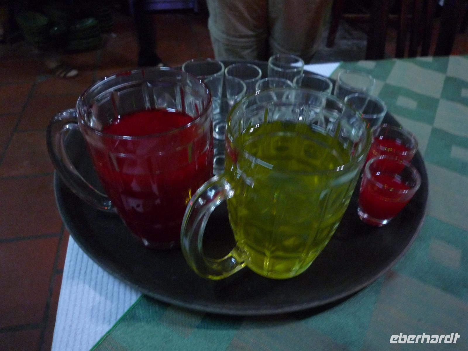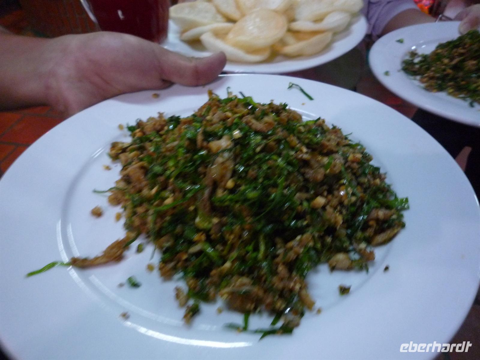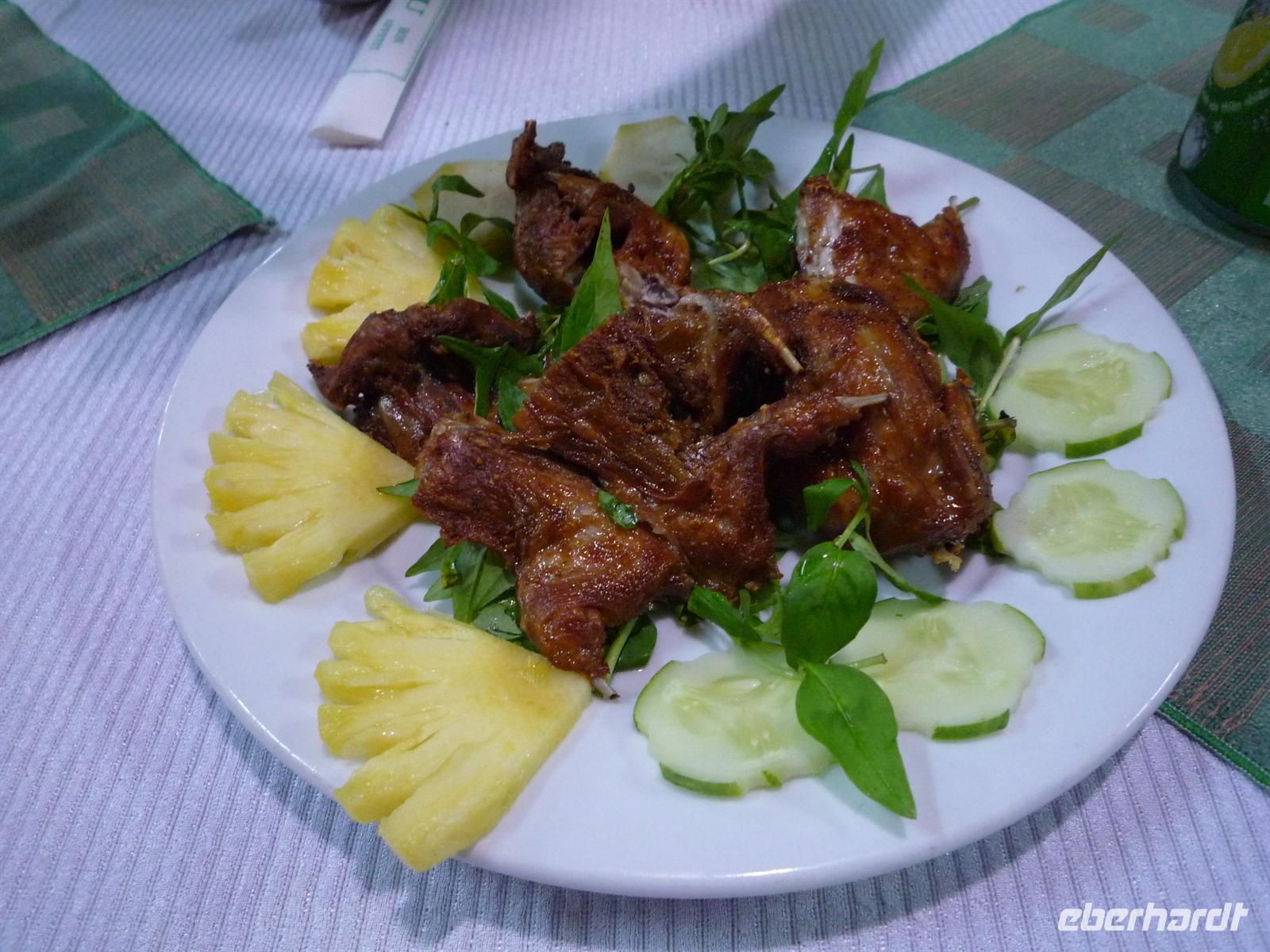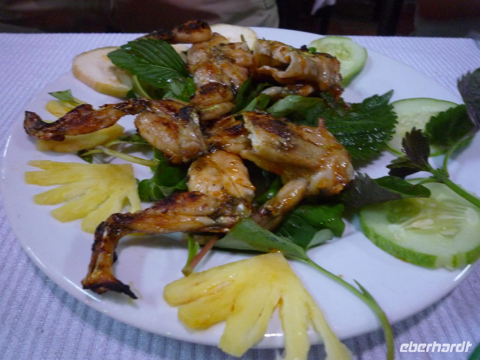Nun fuhren wir zum Abendessen, was wir uns verdient hatten. In einem schönen Restaurant saßen wir im freien und genossen unser vietnamesisches Menü. Jeden Tag gab es nun 6 - 8 Gänge und jeder konnte sich nehmen, was er wollte. Auch mit dem Stäbchen-Essen wurde es von Tag zu Tag besser, war aber keine Pflicht.