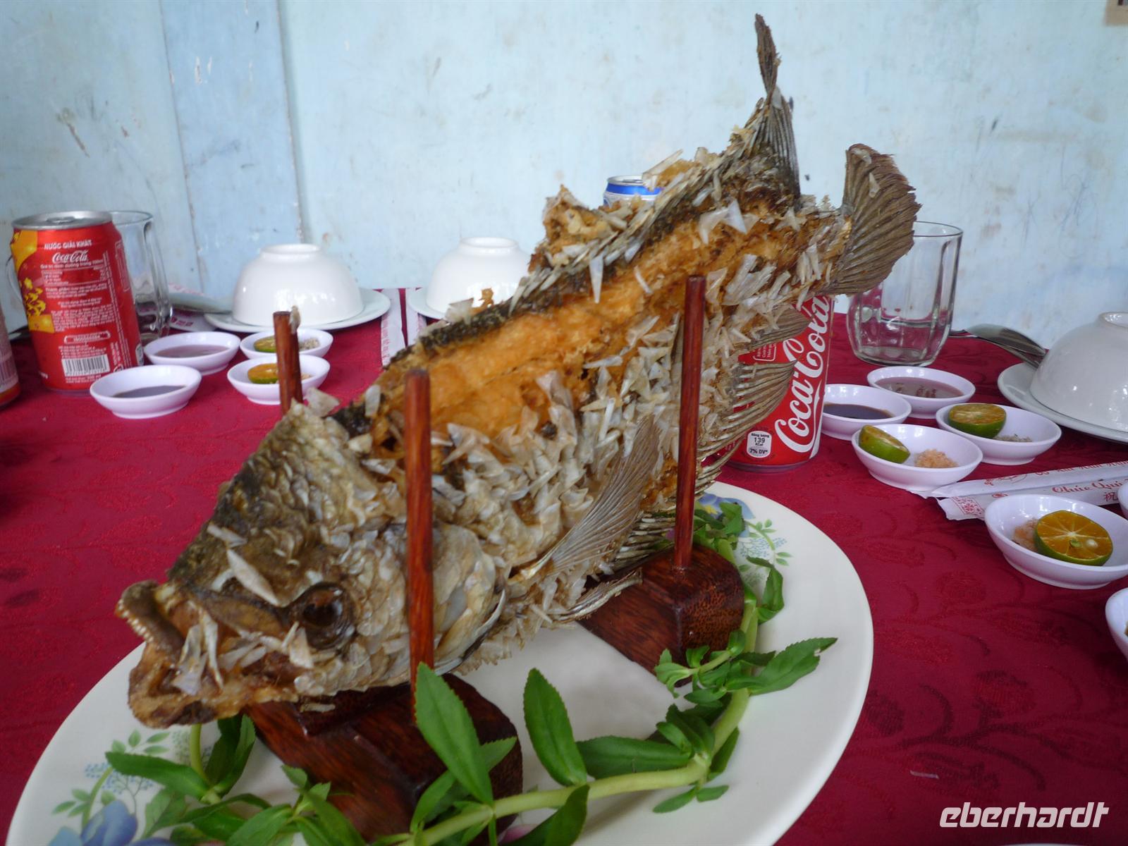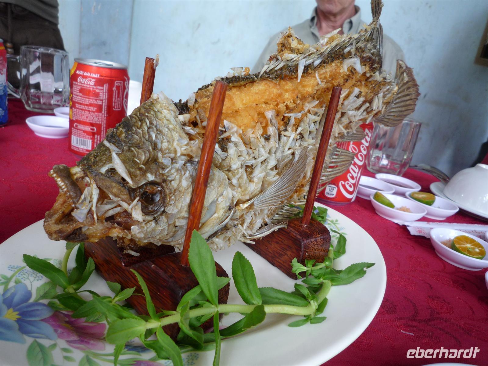 Heute verlassen wir Saigon. Wir fahren ins grüne und saftige Mekong Delta. Per Bus geht es ungefähr zwei Stunden bis My Tho, wo wir aufs Boot umsteigen. Mit dem Motor-Boot geht es entlang des Mekongs. Wir bekommen Kokussnuss-Saft zu trinken. Bald steigen wir aus und verkosten typische Früchte aus der Region. Dabei wird für uns Musik gespielt. Weiter geht es mit dem Boot zum nächsten Stopp. Dort sehen wir, wie in mühsamer Handarbeit Karamel-Bonbons in verschiedenen Geschmacksrichtungen hergestellt werden. Ja, jeder Bonbon wird einzeln per Hand verpackt, das gibt es nur noch hier. Weiter spazieren wir ein Stück durch ein Dorf bis wir zu kleinen Pferdekutschen kommen mit denen wir weiter fahren. Nach einem weiteren kleinen Spaziergang steigen wir nun in kleine Boote um und gleiten entlang eines kleinen Mekong-Arms mitten durch die, für die Region typischen, Mangroven. Der Ausflug war sehr erlebnisreich. Anschließend fahren wir nun wieder mit unserem Boot zu einer Bauernfamilie, wo wir die Spezialität des Mekong Deltas, den Elefantenohrfisch verkosten. Der Fisch wird in kleinen Stücken mit Gemüse und Fischsoße in Reisfladen eingewickelt und schmeckt dann ganz lecker. Anschließend gibt es noch weitere Gerichte. Nun fahren wir mit dem Bus weiter in Richtung Can Tho, die größte Stadt des Mekong Deltas. Unterwegs machen wir einen Stopp an einem Reisfeld, wo wir den Reisanbau beobachten können und auch in einem Hängematten-Café, wo wir gemütlich in der Hängematte unser Café genießen können. Nach der Ankunft in Can Tho checken wir in unser Hotel ein. Zum Abendessen verabreden wir uns, denn laut Programm gibt es heute nichts, und gehen in ein Restaurant, was unser Reiseleiter Ot ausgesucht hat. Einige sind heute mutig und bestellen Feldmaus und Frosch. Viele kosten nach anfänglicher Skepzis doch und man stellt fest, dass man es doch essen kann. Anschließend werden wir noch mutiger und lassen Ot eine Schlange bestellen. Vor unseren Augen wir die Schlange zubereitet, ja selbst das Blut der Schlange bekommen wir dann gemischt mit Reisschnaps zum probieren, woran sich aber nur einige wenige wagen. Das Fleisch der Schlange letztendlich probieren viele, denn es sieht nicht mehr nach Schlange aus, sondern wurde wie Geschnetzeltes zubereitet. Wir reden und denken heut nach lange nach, wie mutig wir heut waren….
