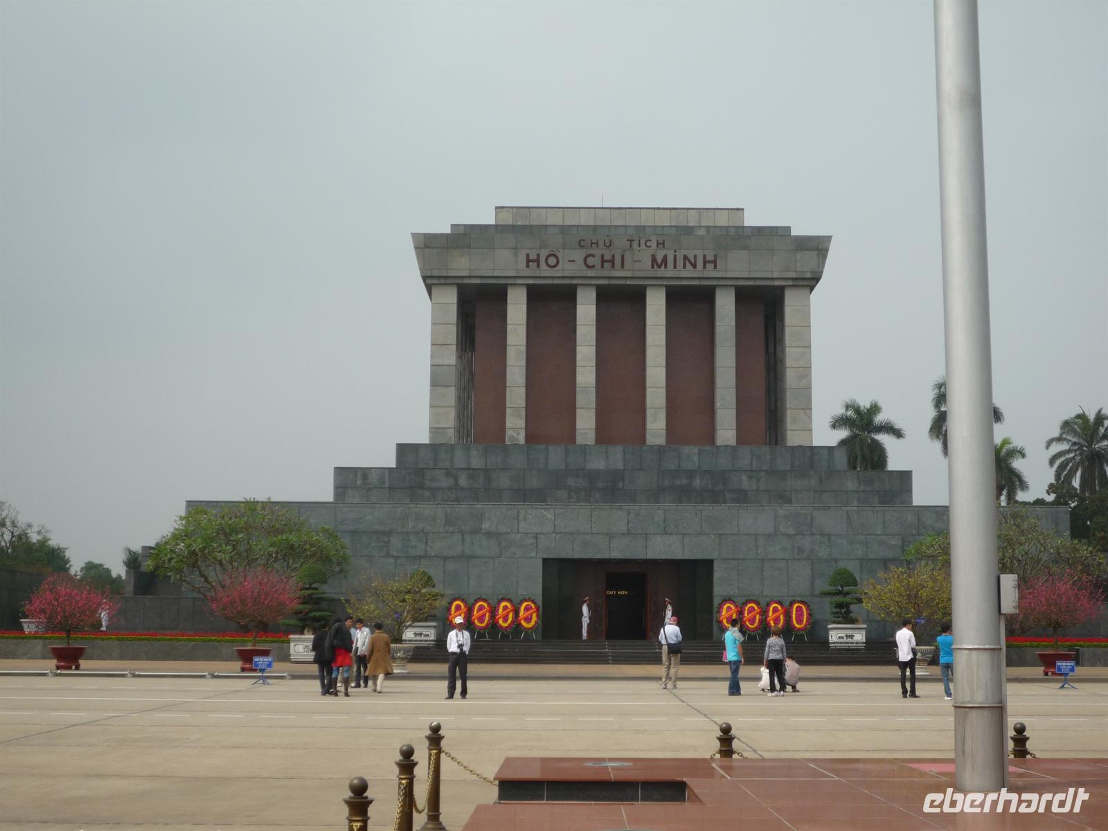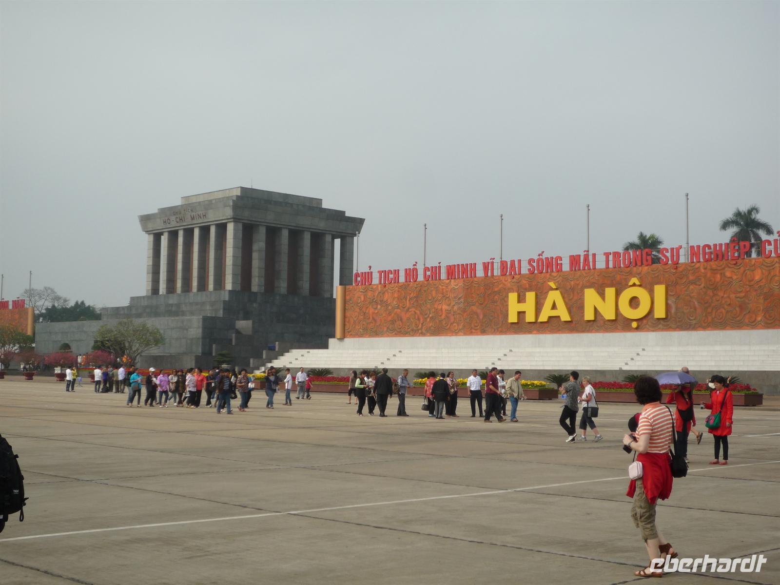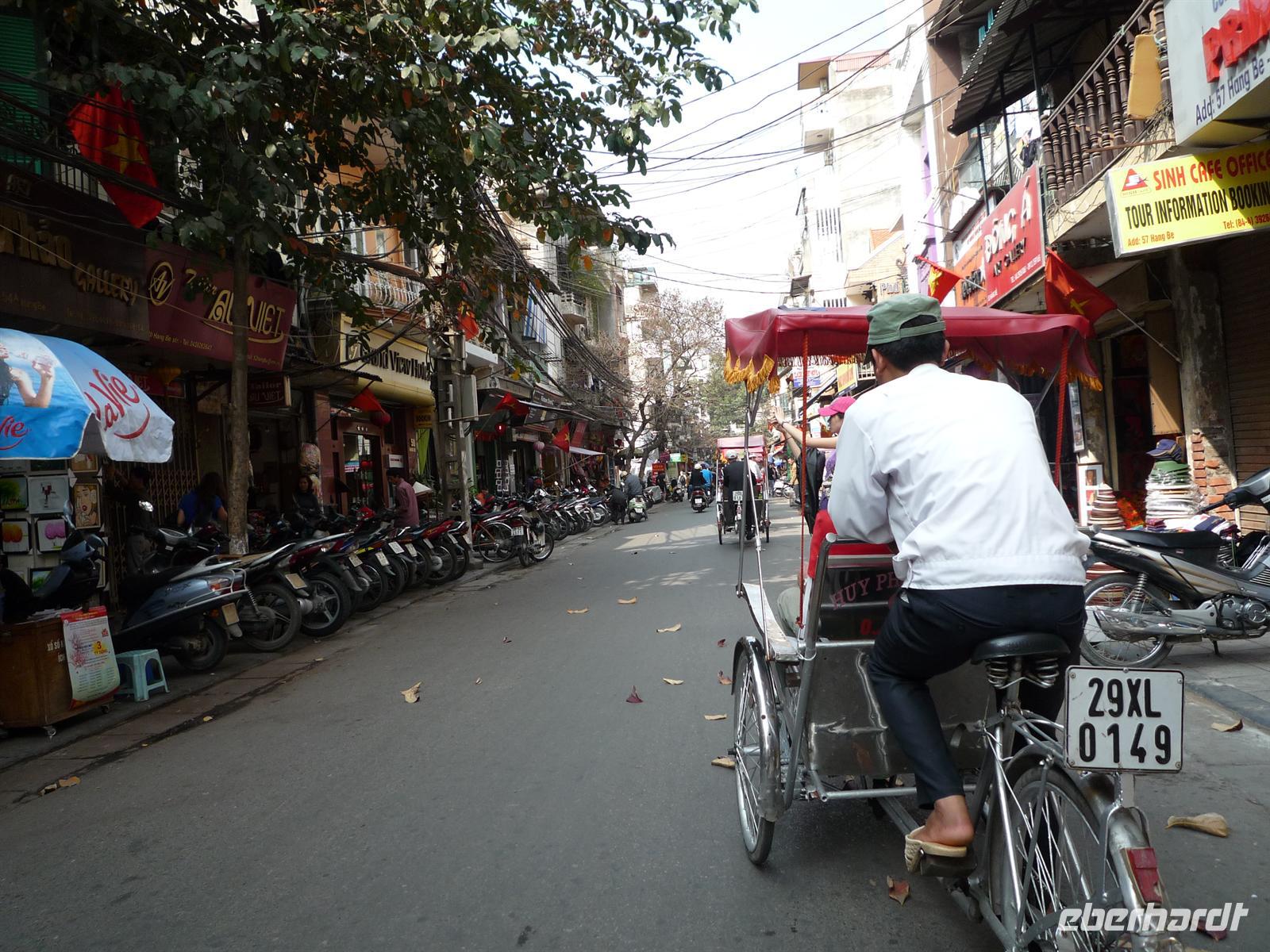 Heute stand die Erkundung der Stadt Hanoi auf dem Programm. Zuerst fuhren wir zum Mausoleum von Ho-Chi-Minh. Nach Gepäckkontrollen, durften wir im Gänsemarsch an ihm vorbei gehen und uns ihn anschauen, dabei war natürlich sprechen, fotografieren, essen und trinken verboten. Selbst die Arme mussten in strenger Weise nach unten hängen. Anschließend spazierten wir zum Präsidentenpalast und Ho Chi Minhs-Wohnhaus, was doch erstaunlich bescheiden ausfällt. Weiter ging es zur Einsäulen-Pagode, wo wir für ein langes Leben beten könnten, danach ging es zum Literaturtempel, der ältesten Universität Südostasiens. Nach dem Besuch der Tran Quoc Pagode, erwartete uns nun ein besonderes Erlebnis. Jeder bestieg eine Rikscha und dann ging es durch die Gassen der Altstadt, die auch die „Stadt der 36 Gassen“ genannt wird. Die Rikscha stammt aus Japan, wenn auch ihr Erfinder ein Europäer war. Der Name kommt aus dem japanischen und setzt sich wie folgt zusammen: Jinrikisha, jin = Mensch, riki = Kraft, sha = Wagen. Die Fahrt durch die belebten Straßen ist ein Abenteuer und manchmal möchte man die Luft anhalten, wenn von links und rechts die Mopeds heran sausen. Wir staunten wir nicht schlecht, wie viele Mofas und Mopeds auf Hanois Straßen verkehren. Eine nicht enden wollende Masse dieses Fortbewegungsmittels rollte an uns vorbei- Mitten durch den Verkehr fahren die Rikschas und man bekommt einen herrlichen Einblick. Besonders für die Fotografen unter uns, ist es natürlich ideal so, denn man kann Aufnahmen vom Leben in den Straßen machen. Für alle war das ein besonderes Erlebnis. Anschließend essen wir die typische Hanoi-Nudelsuppe „Pho“, die allen gut schmeckt.