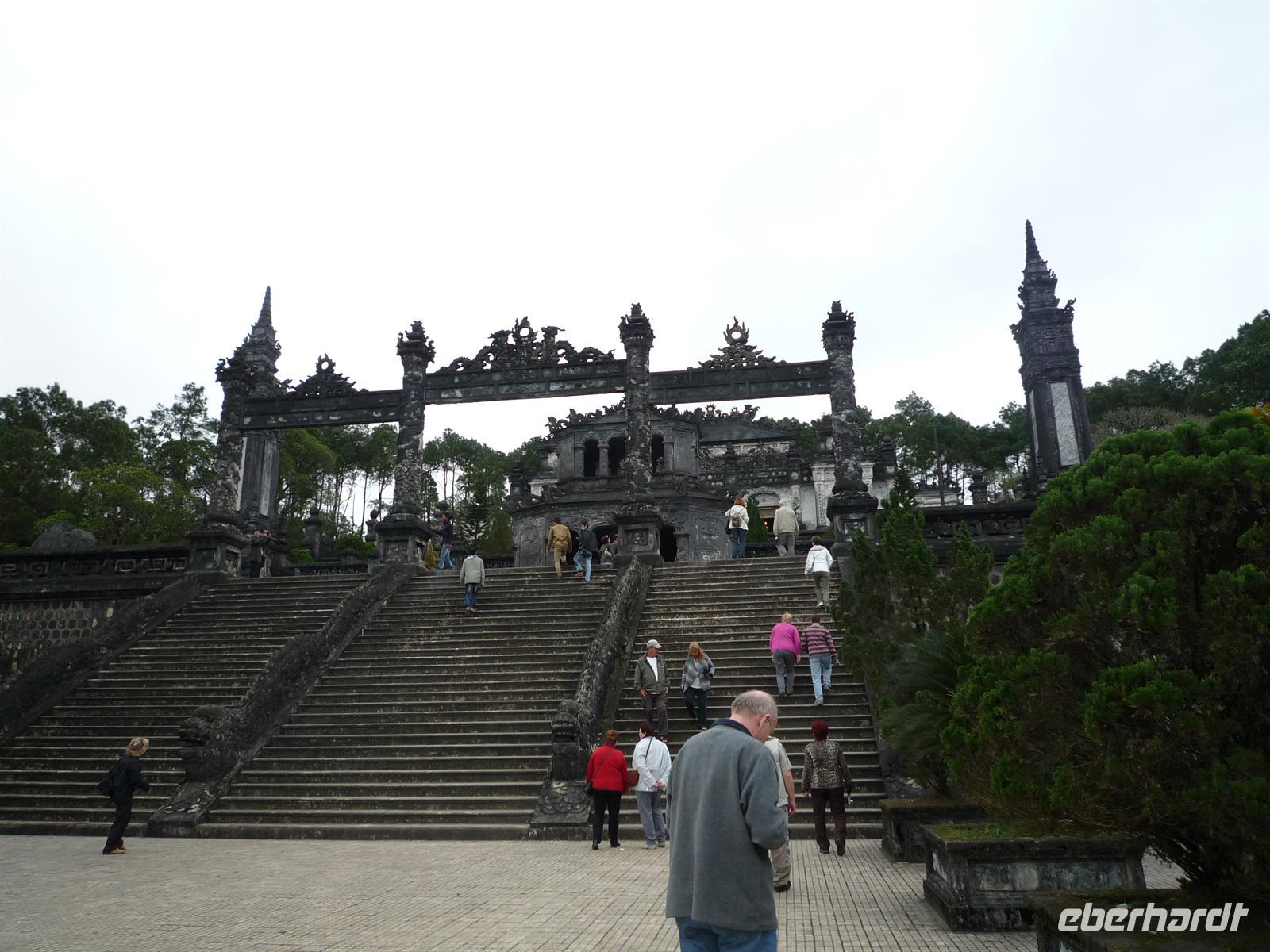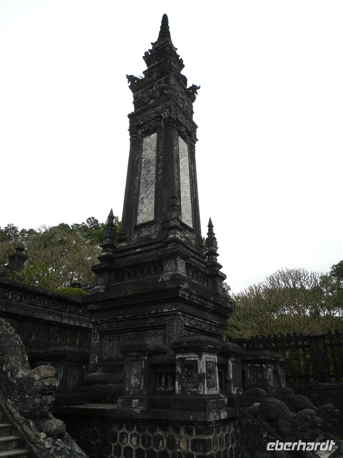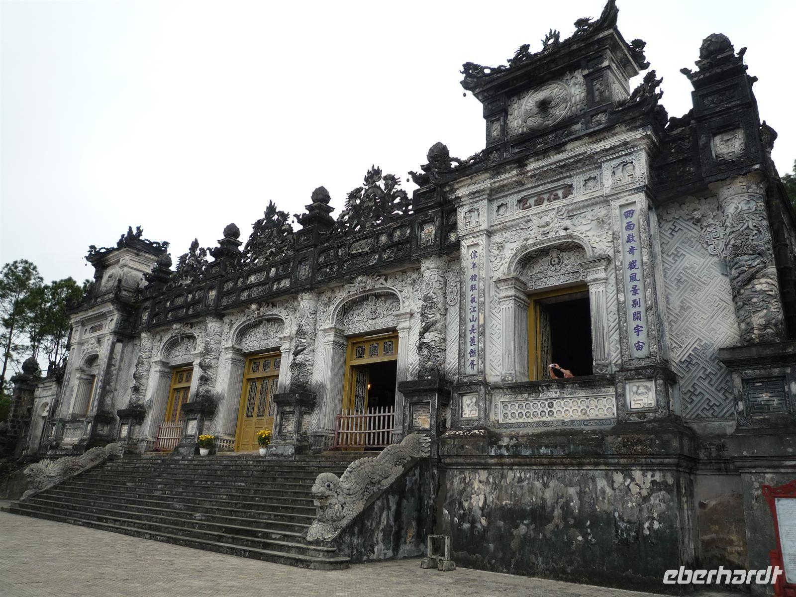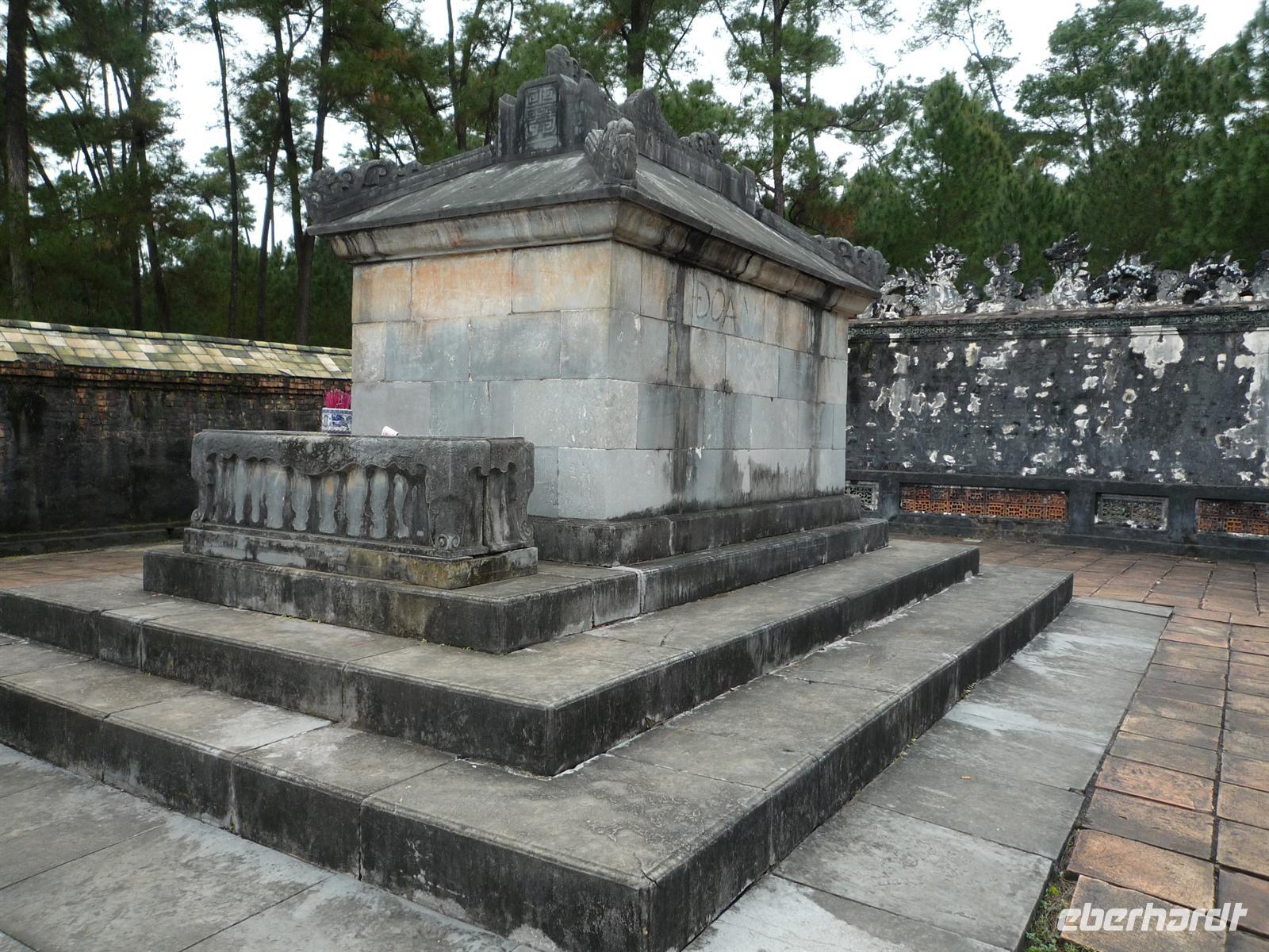 Während der vierte Kaiser Tu Duc in einer schönen Parkanlage die ihm auch als Sommerpalast diente, bescheiden begraben ist, hat der zwölfte Kaiser eine prunkvolle Ruhestätte mit einer reichhaltigen und kunstvollen Ausstattung. Khai Dinh ist auch als eine Marionette der Franzosen bekannt, er bevorzugte auch die französische Lebensart und war von der Architektur Frankreichs sehr angetan. Sein Grab thront majestätisch auf einem Berg, ist aus Beton erbaut und mit unzähligen Glas- und Keramikscherben verziert. Der Aufstieg ist gesäumt von Drachen und führt vorbei am Ehrenhof mit den obligatorischen Statuen von Mandarinen, Elefanten und Pferden. Unter einem Thron mit einer Bronzestatue des Kaisers befindet sich in 18 Meter Tiefe sein Sarg.