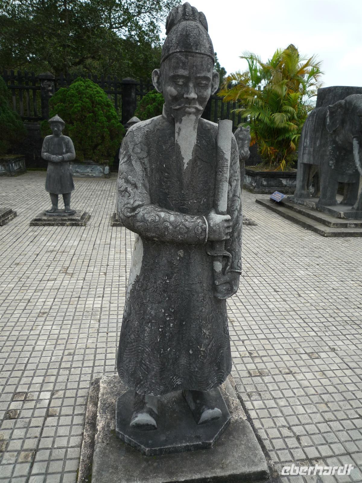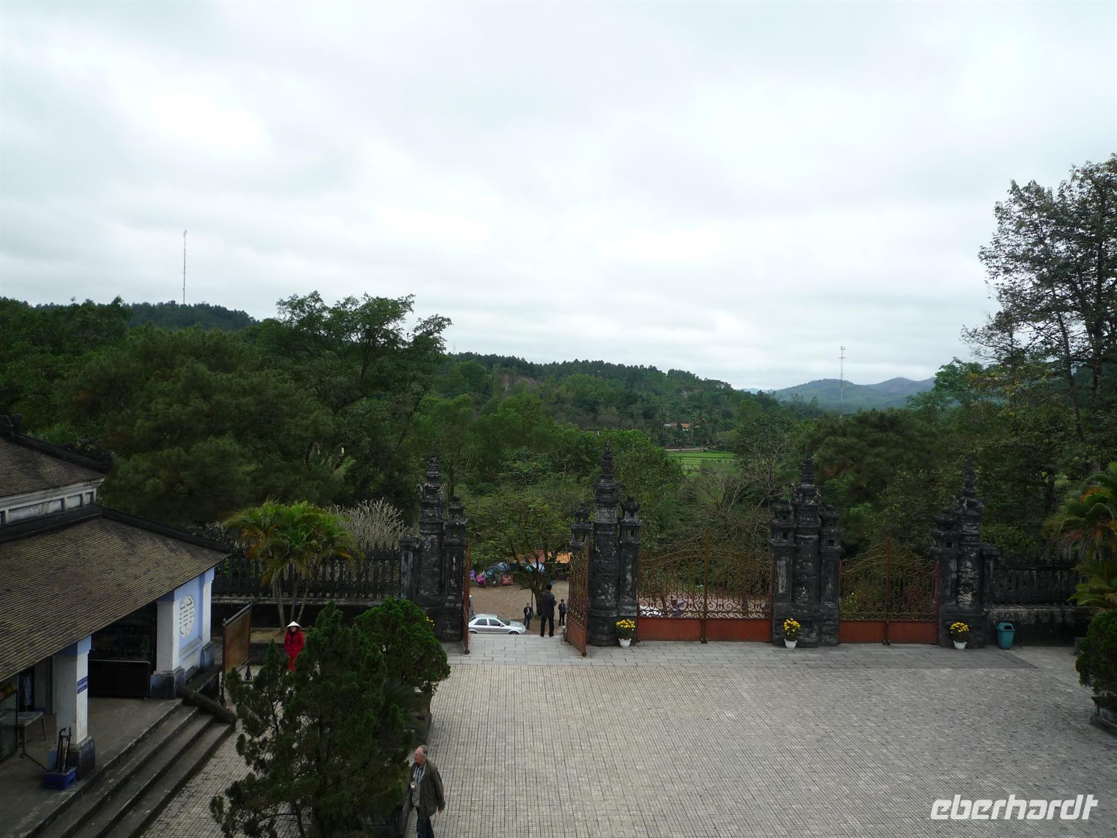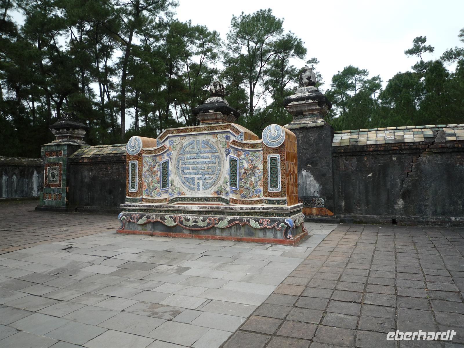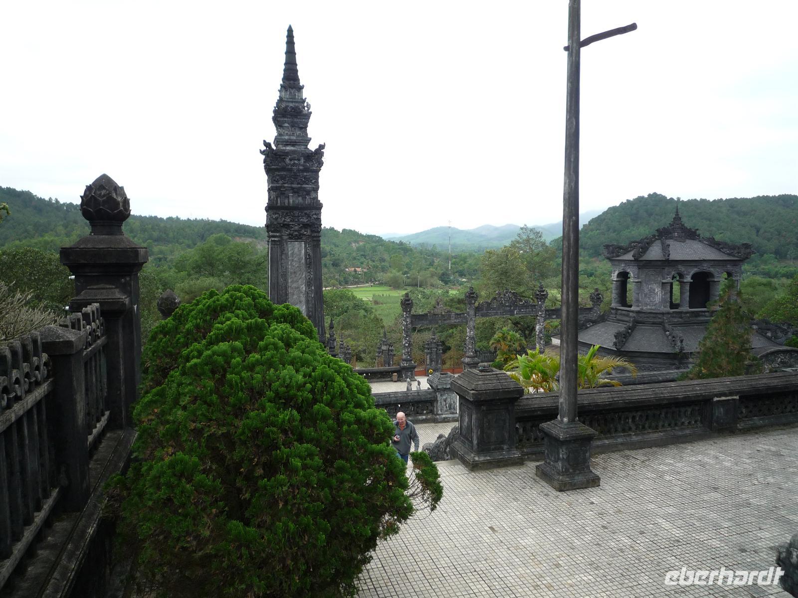Während der vierte Kaiser Tu Duc in einer schönen Parkanlage die ihm auch als Sommerpalast diente, bescheiden begraben ist, hat der zwölfte Kaiser eine prunkvolle Ruhestätte mit einer reichhaltigen und kunstvollen Ausstattung. Khai Dinh ist auch als eine Marionette der Franzosen bekannt, er bevorzugte auch die französische Lebensart und war von der Architektur Frankreichs sehr angetan. Sein Grab thront majestätisch auf einem Berg, ist aus Beton erbaut und mit unzähligen Glas- und Keramikscherben verziert. Der Aufstieg ist gesäumt von Drachen und führt vorbei am Ehrenhof mit den obligatorischen Statuen von Mandarinen, Elefanten und Pferden. Unter einem Thron mit einer Bronzestatue des Kaisers befindet sich in 18 Meter Tiefe sein Sarg.