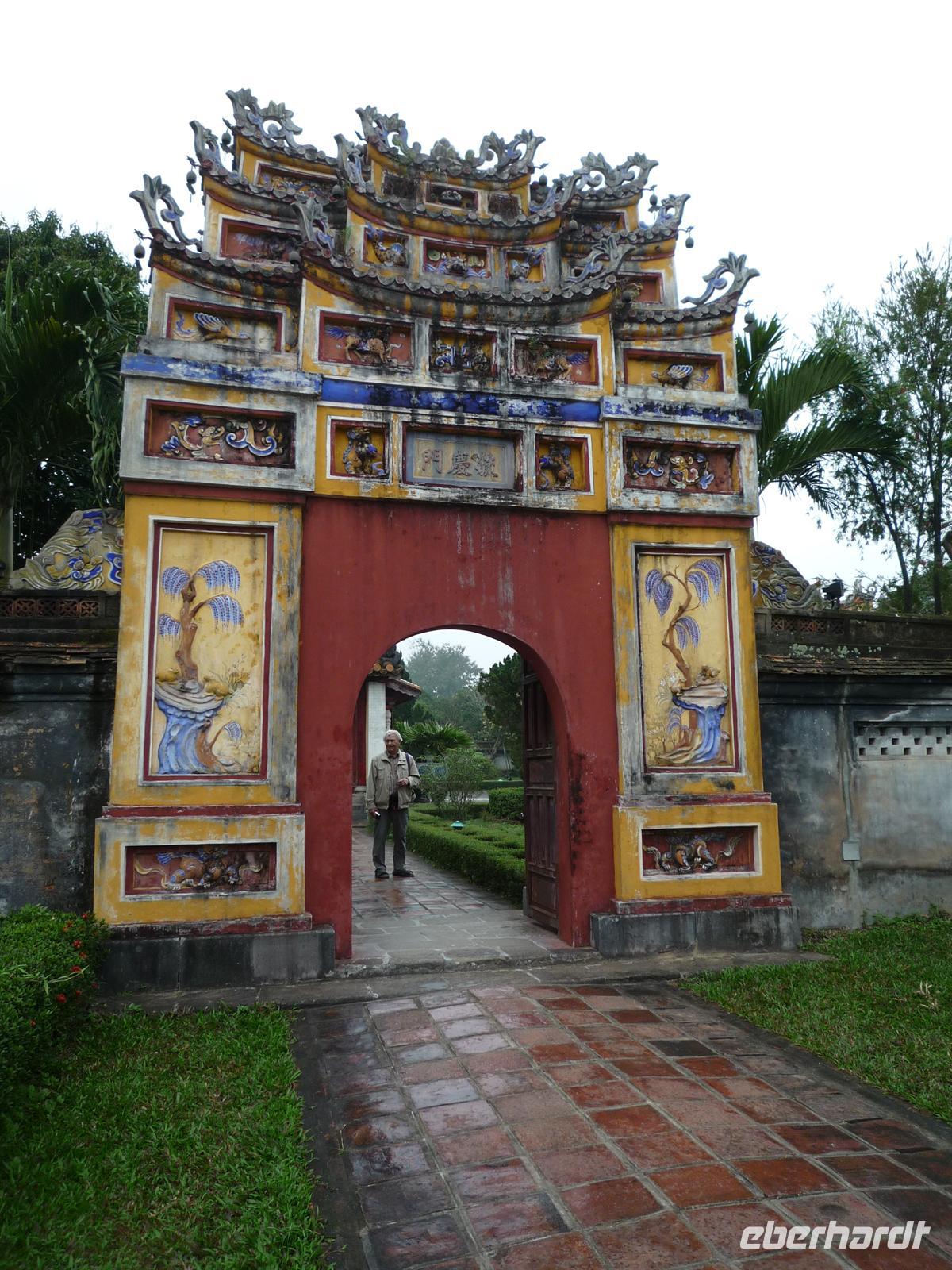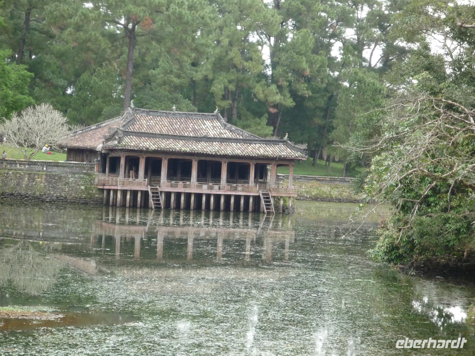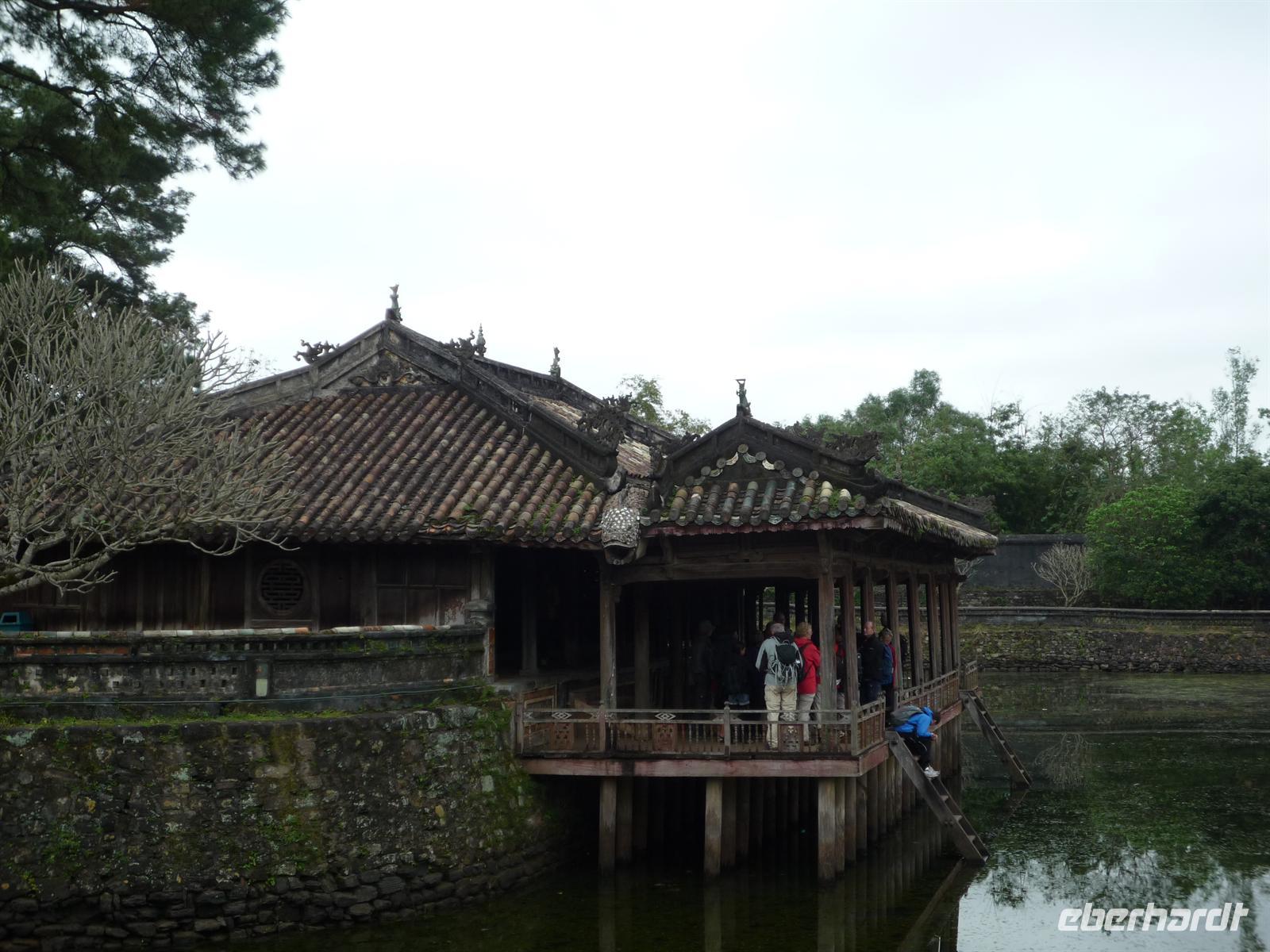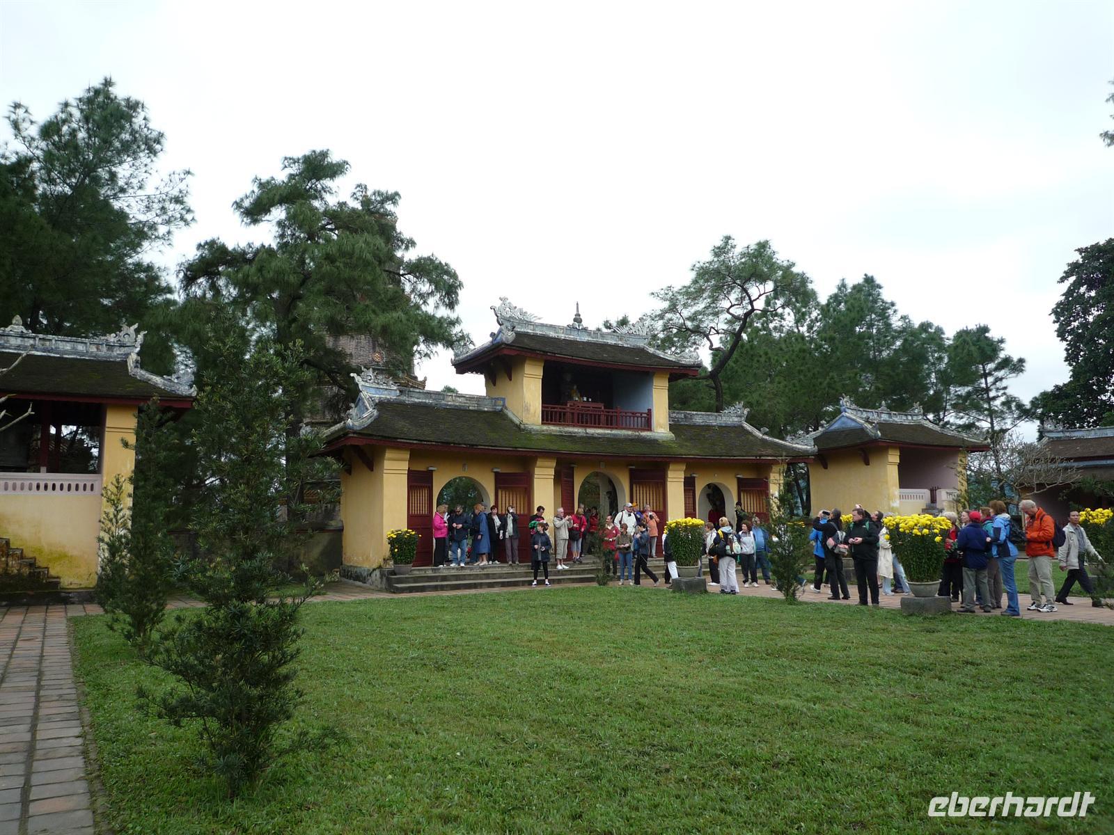 Am Morgen schippern wir mit einem Drachenboot auf dem Fluss entlang bis zur Thin-Mu-Pagode. Auf dem Boot werden verschiedene Textilien und Souvenirs angeboten und einige von uns machen davon reichlich Gebrauch. Die Preise sind auch sehr verführerisch. Die Pagode, welche der Himmelsgöttin geweiht ist, liegt zauberhaft am Fluss. Gleich am Eingang befindet sich der Turm der Pagode, welchen man schon von weitem sehen kann. Es ist in Hue die älteste Pagode, sie stammt aus dem Jahre 1601 und wurde durch den Fürsten Nguyen Hoang errichtet. Ein Traum wies ihm die richtige Stelle zum Bau dieses Heiligtums. fahren wir zu den außerhalb von Hue gelegenen Kaisergräbern. Wir werden zwei Anlagen besuchen, die des vierten Kaisers Tu Duc (1829-1883) und des zwölften Kaisers Khai Dinh (1885-1925).