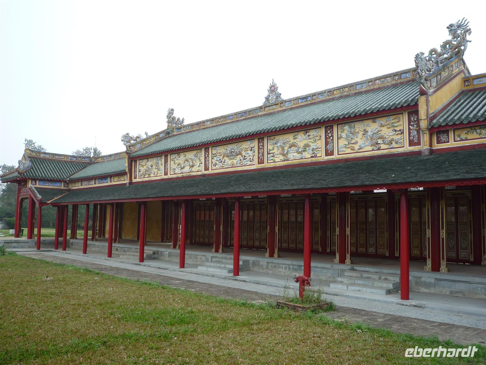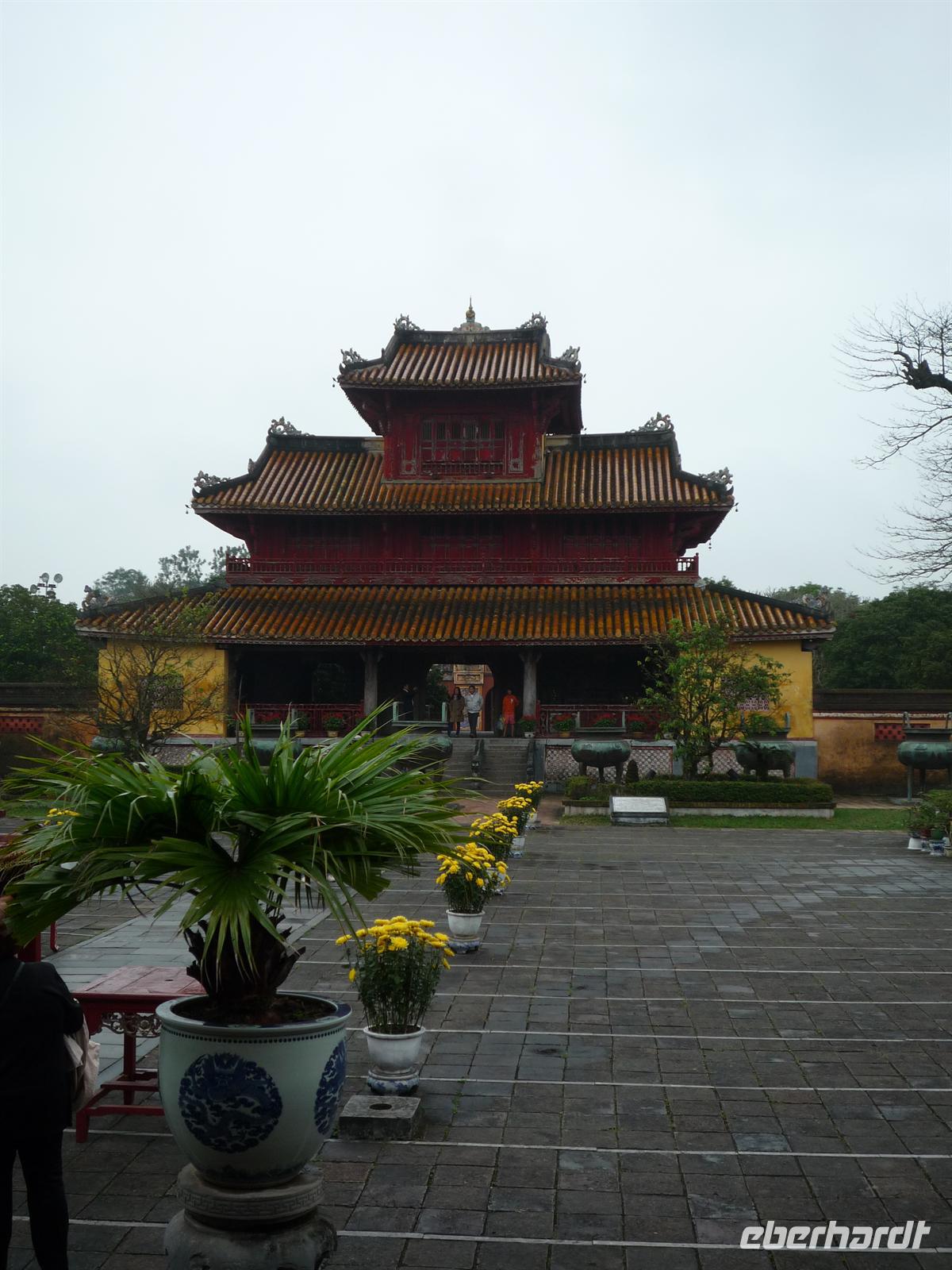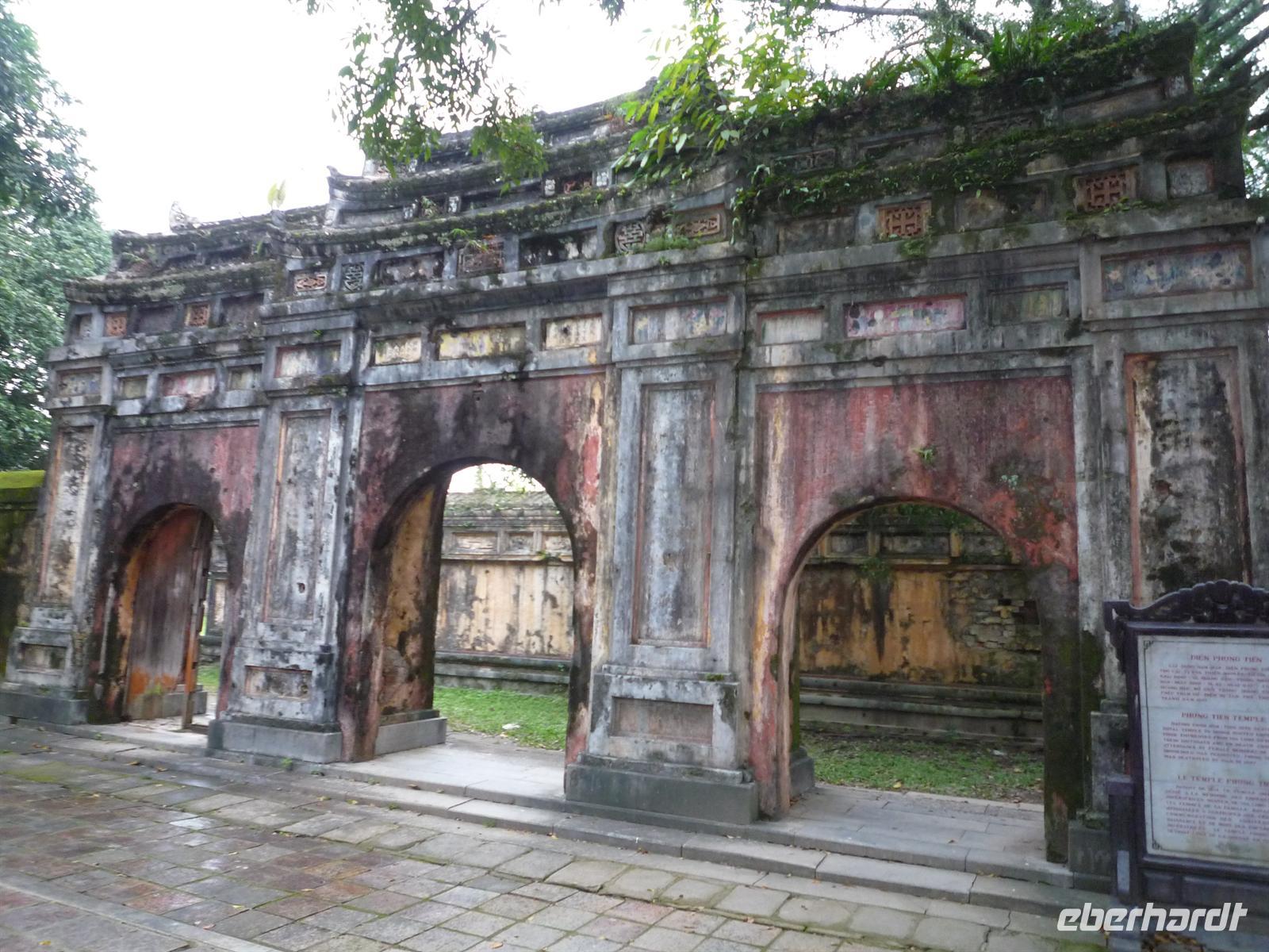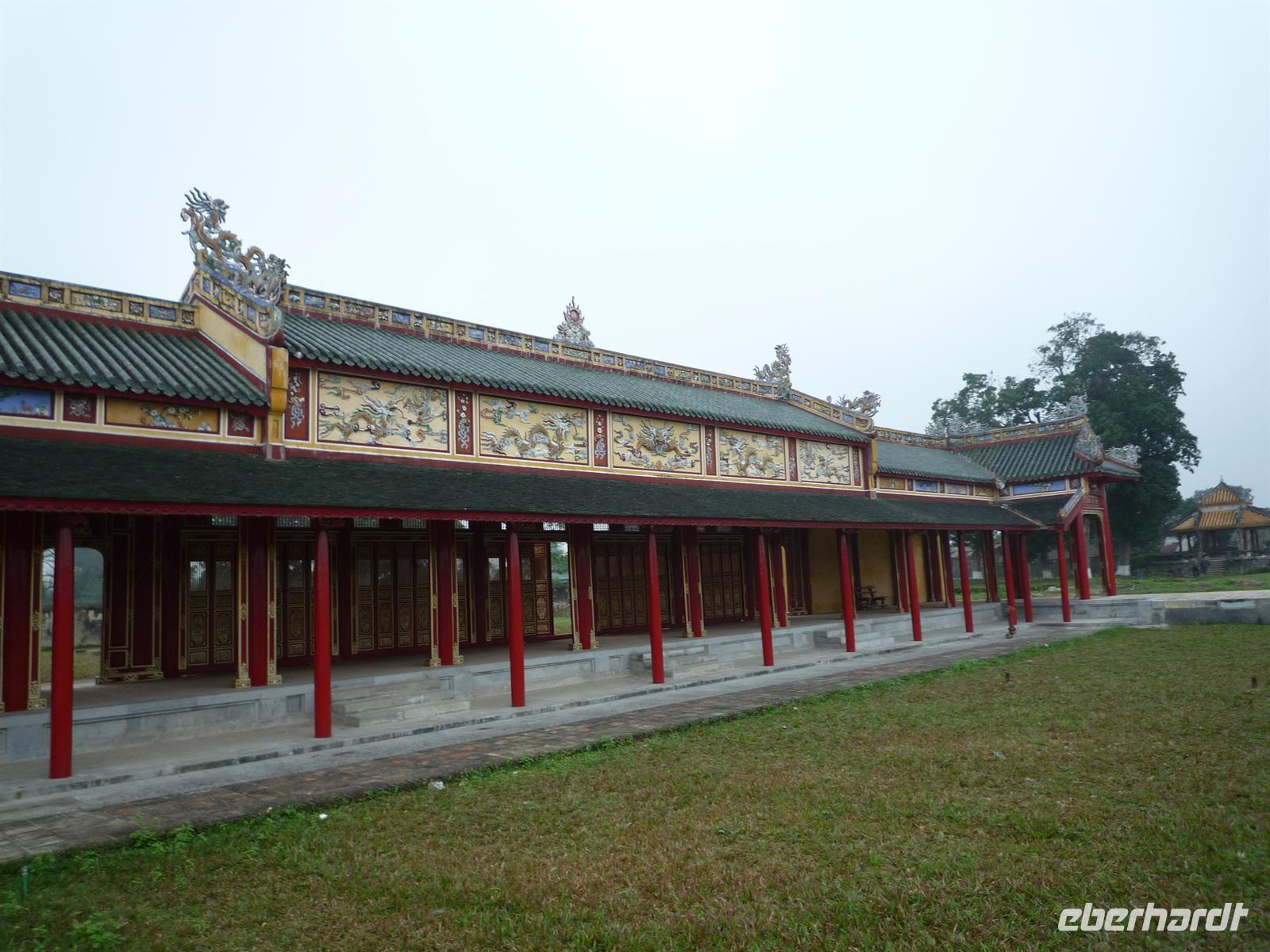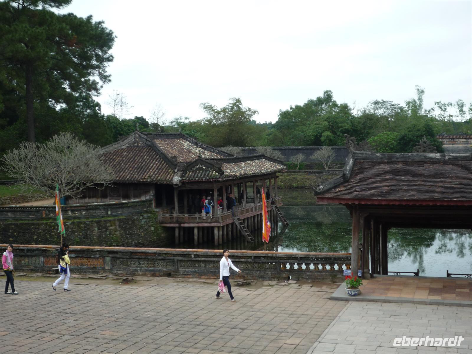 Am Morgen schippern wir mit einem Drachenboot auf dem Fluss entlang bis zur Thin-Mu-Pagode. Auf dem Boot werden verschiedene Textilien und Souvenirs angeboten und einige von uns machen davon reichlich Gebrauch. Die Preise sind auch sehr verführerisch. Die Pagode, welche der Himmelsgöttin geweiht ist, liegt zauberhaft am Fluss. Gleich am Eingang befindet sich der Turm der Pagode, welchen man schon von weitem sehen kann. Es ist in Hue die älteste Pagode, sie stammt aus dem Jahre 1601 und wurde durch den Fürsten Nguyen Hoang errichtet. Ein Traum wies ihm die richtige Stelle zum Bau dieses Heiligtums. fahren wir zu den außerhalb von Hue gelegenen Kaisergräbern. Wir werden zwei Anlagen besuchen, die des vierten Kaisers Tu Duc (1829-1883) und des zwölften Kaisers Khai Dinh (1885-1925).