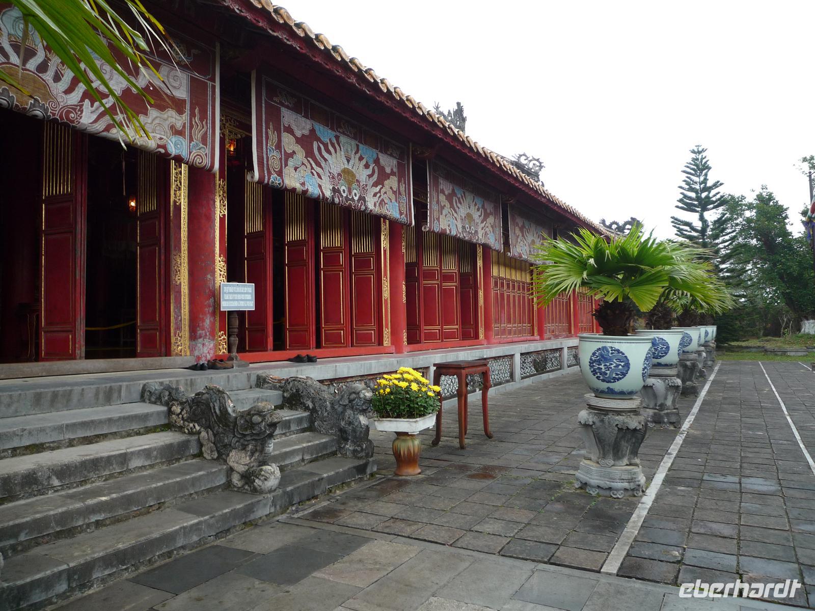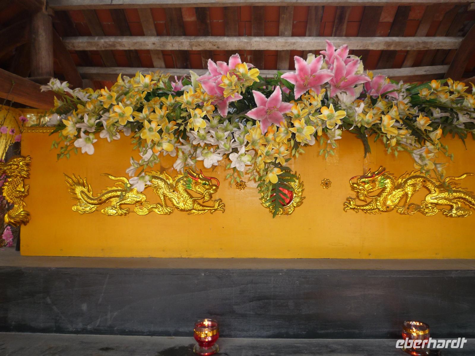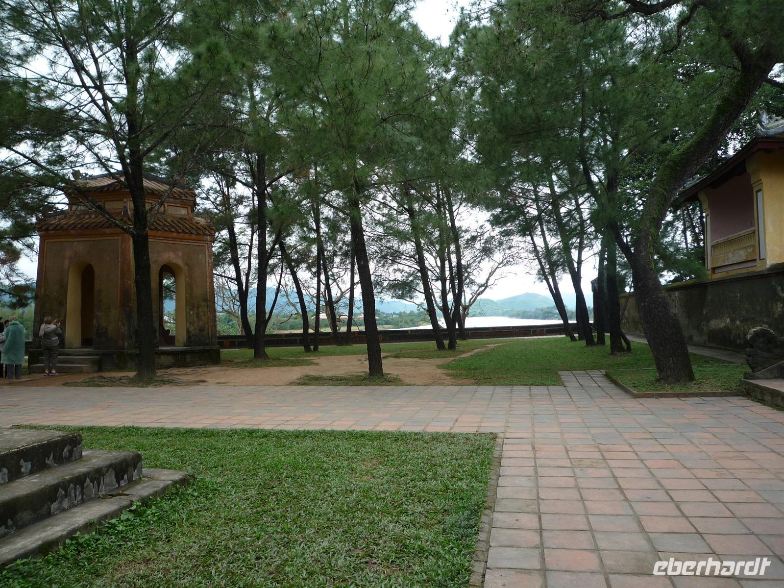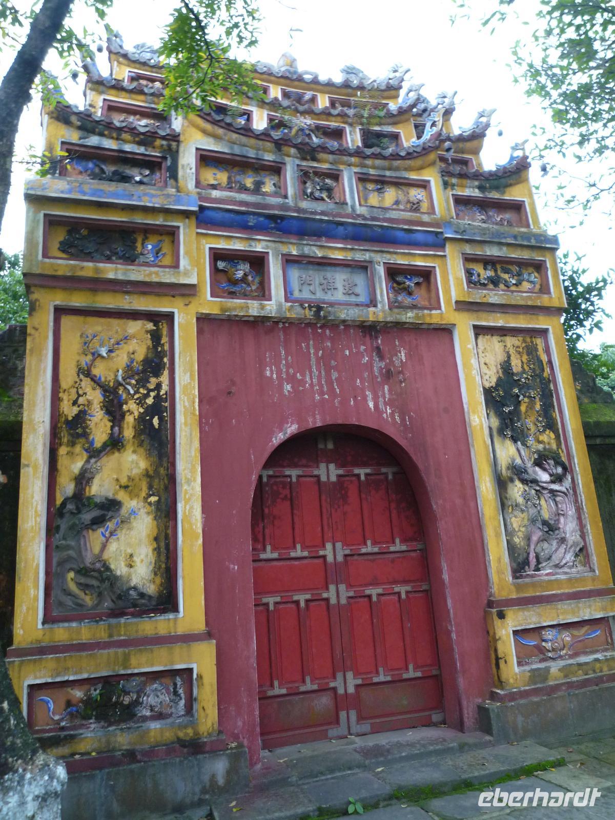 Am Morgen schippern wir mit einem Drachenboot auf dem Fluss entlang bis zur Thin-Mu-Pagode. Auf dem Boot werden verschiedene Textilien und Souvenirs angeboten und einige von uns machen davon reichlich Gebrauch. Die Preise sind auch sehr verführerisch. Die Pagode, welche der Himmelsgöttin geweiht ist, liegt zauberhaft am Fluss. Gleich am Eingang befindet sich der Turm der Pagode, welchen man schon von weitem sehen kann. Es ist in Hue die älteste Pagode, sie stammt aus dem Jahre 1601 und wurde durch den Fürsten Nguyen Hoang errichtet. Ein Traum wies ihm die richtige Stelle zum Bau dieses Heiligtums. fahren wir zu den außerhalb von Hue gelegenen Kaisergräbern. Wir werden zwei Anlagen besuchen, die des vierten Kaisers Tu Duc (1829-1883) und des zwölften Kaisers Khai Dinh (1885-1925).