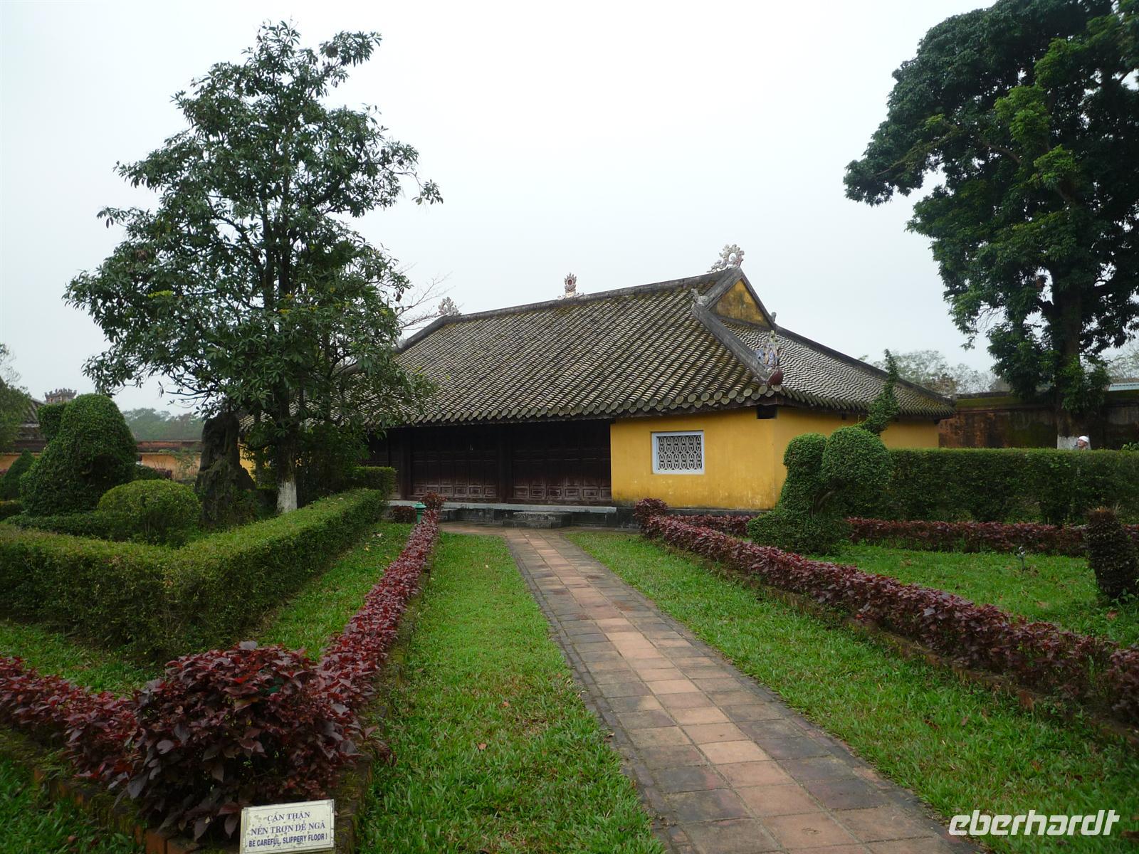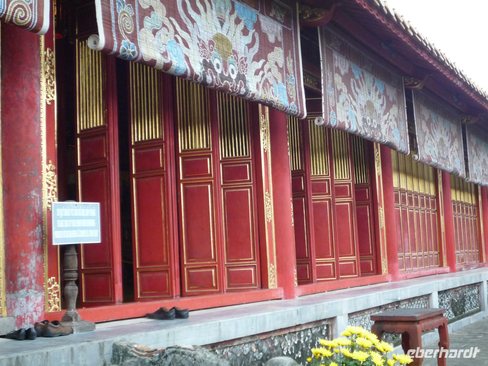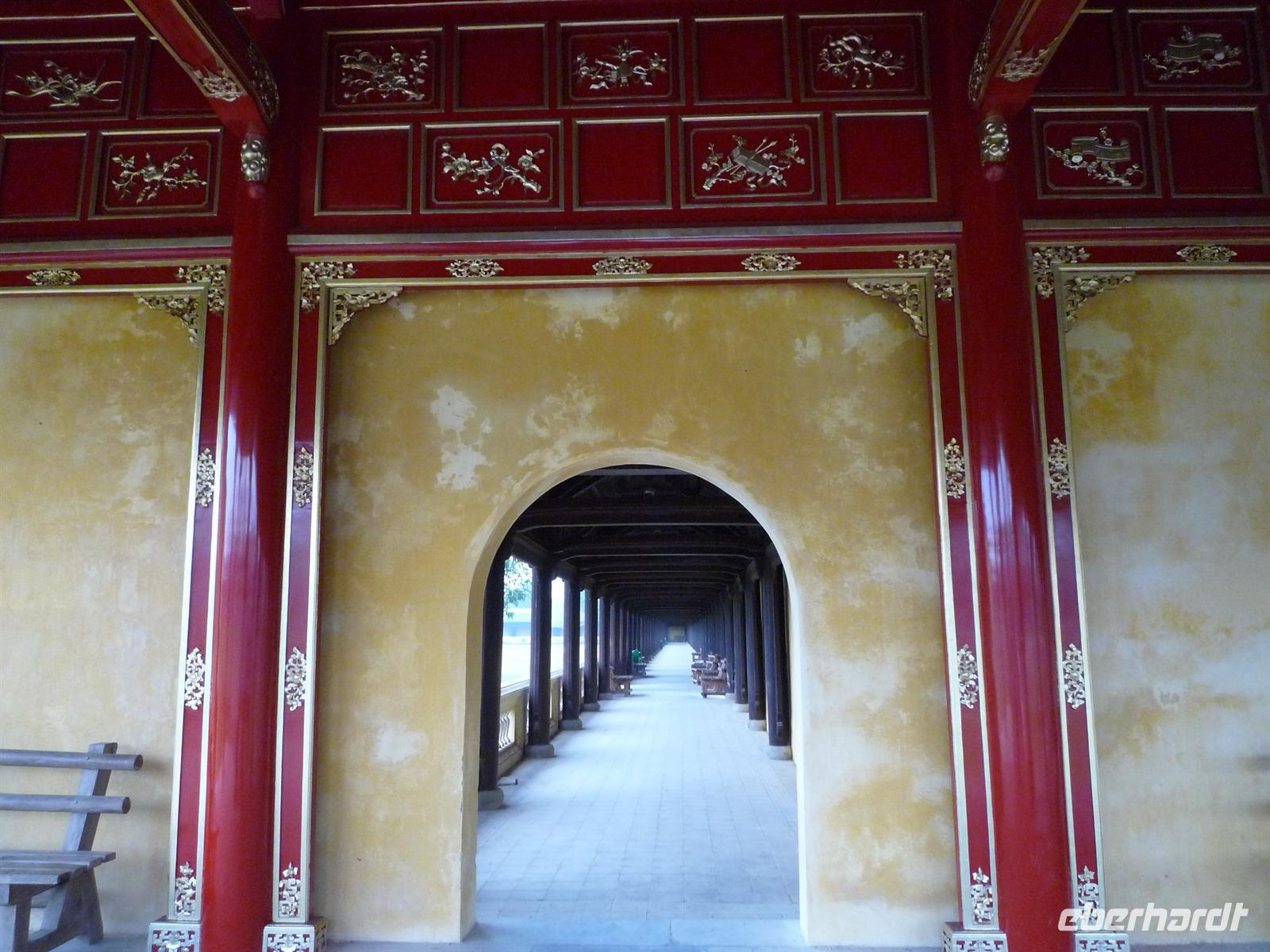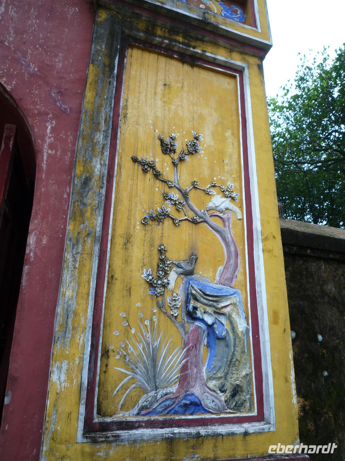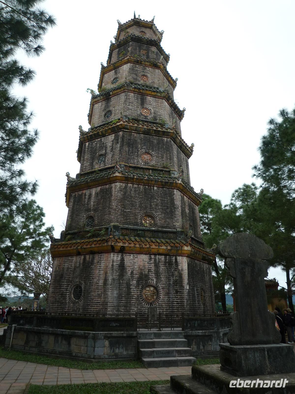 Am Morgen schippern wir mit einem Drachenboot auf dem Fluss entlang bis zur Thin-Mu-Pagode. Auf dem Boot werden verschiedene Textilien und Souvenirs angeboten und einige von uns machen davon reichlich Gebrauch. Die Preise sind auch sehr verführerisch. Die Pagode, welche der Himmelsgöttin geweiht ist, liegt zauberhaft am Fluss. Gleich am Eingang befindet sich der Turm der Pagode, welchen man schon von weitem sehen kann. Es ist in Hue die älteste Pagode, sie stammt aus dem Jahre 1601 und wurde durch den Fürsten Nguyen Hoang errichtet. Ein Traum wies ihm die richtige Stelle zum Bau dieses Heiligtums. fahren wir zu den außerhalb von Hue gelegenen Kaisergräbern. Wir werden zwei Anlagen besuchen, die des vierten Kaisers Tu Duc (1829-1883) und des zwölften Kaisers Khai Dinh (1885-1925).