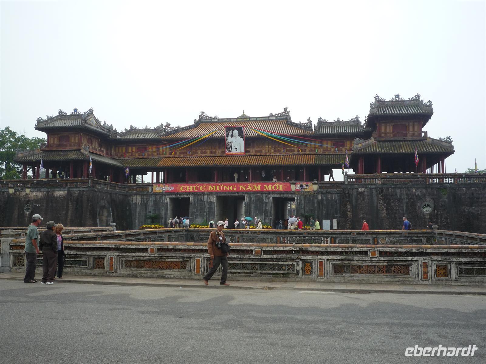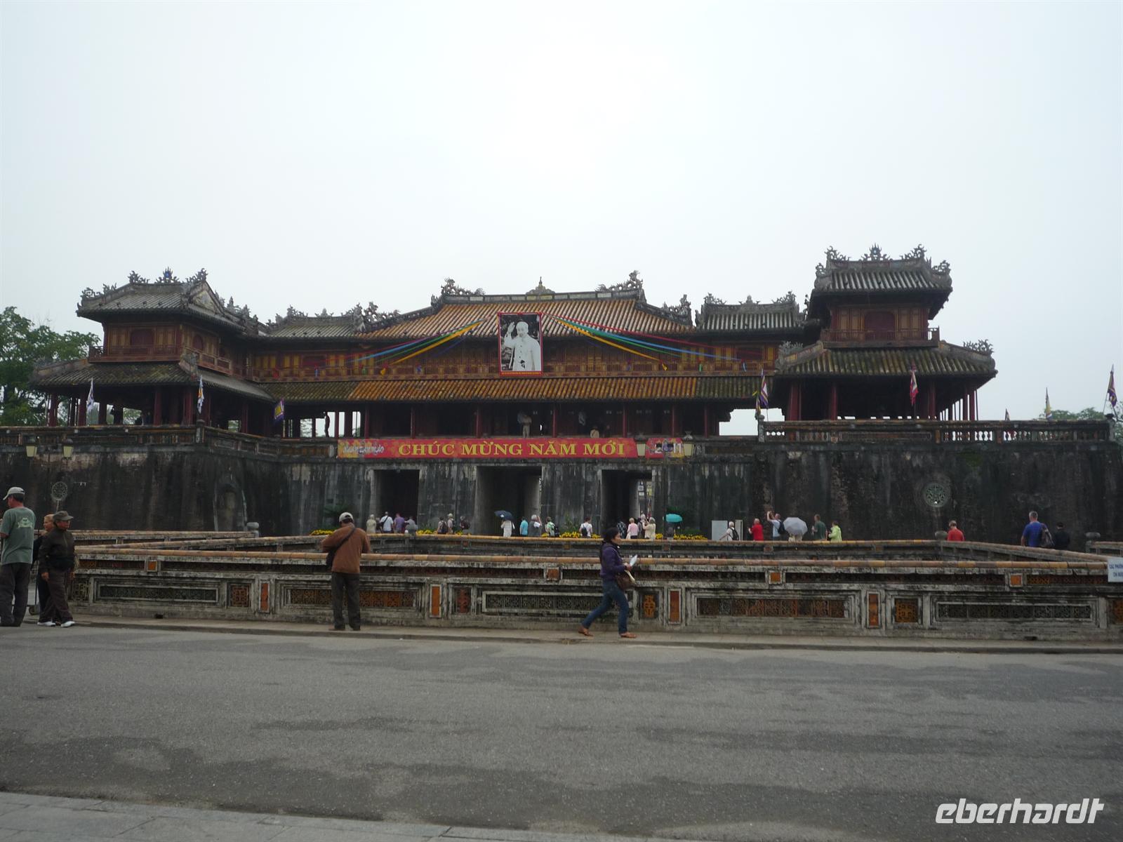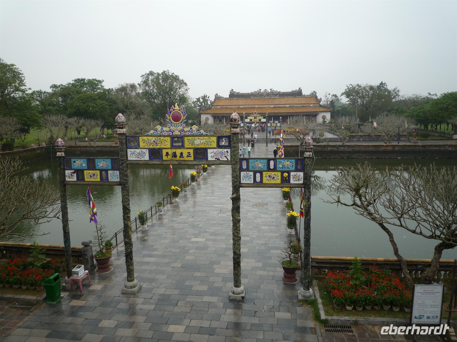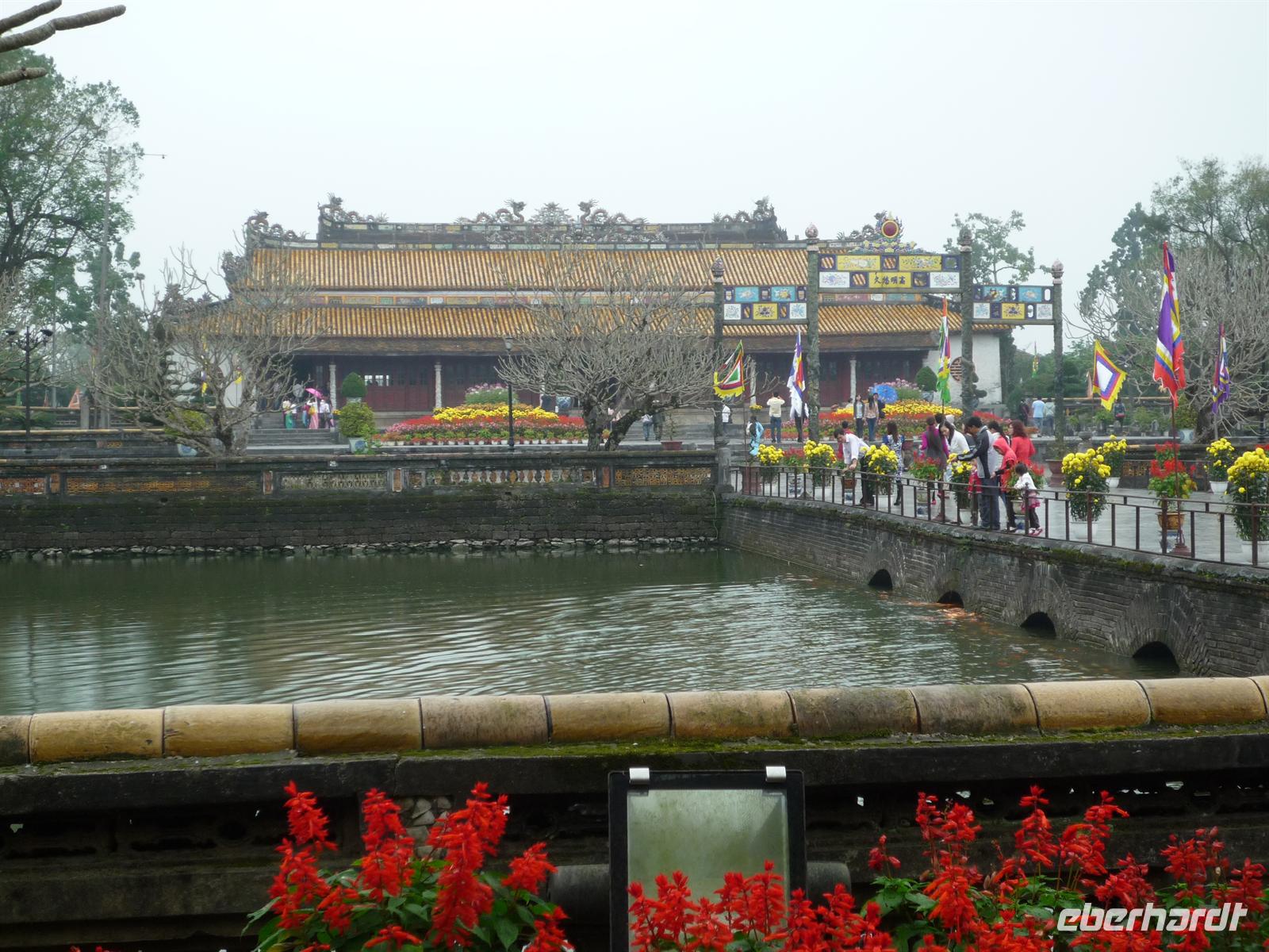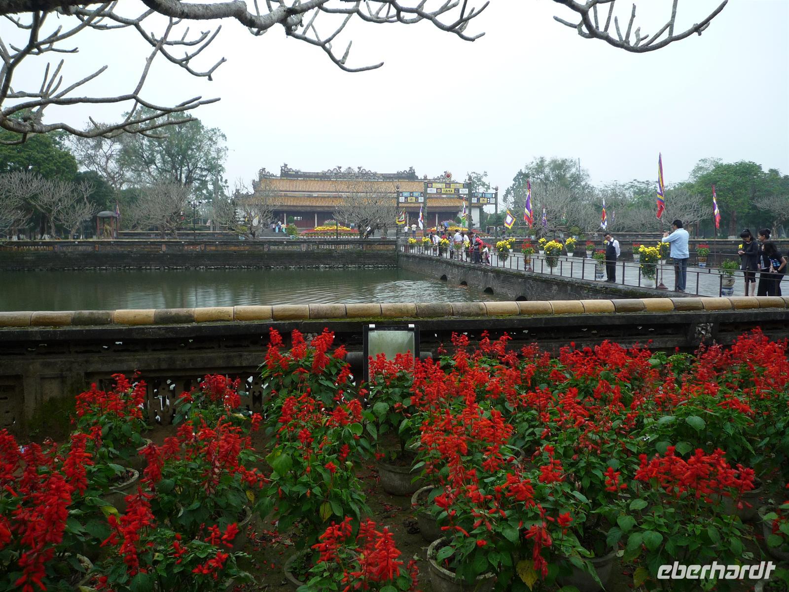 Zeitig am Morgen klingelt der Wecker. Nach einem Kaffee und einer Frühstücksbox geht es zum Flughafen und um 6 Uhr heben wir pünktlich ab nach Hue. Hue, die alte Kaiserstadt erwartet uns. Nach der Ankunft besichtigen wir zuerst die Zitadelle. Hue war 1802 bis 1945 die Hauptstadt von Vietnam. Hue als alte Kaiserstadt in Vietnam besitzt, ähnlich wie Peking, einen Kaiserpalast. Der Kaiser Gia Long ordnete 1802 den Bau der Zitadelle an und so wurde Hue bis 1945 Sitz des Kaisers und Hauptstadt. Der letzte Kaiser Bao Dai verkündete hier 1945 seinen Rücktritt. Wir laufen durch die weitflächige Anlage und sehen neben dem Eingangsbereich mit dem Mittagstor auch die Halle der höchsten Harmonie, das Theater und den Generationentempel. Wir besuchen den Palastkomplex und müssen dann doch feststellen, dass noch viel zu restaurieren ist. Trotzdem erkennt man die gewaltige Anlage und deren Ausmaß.