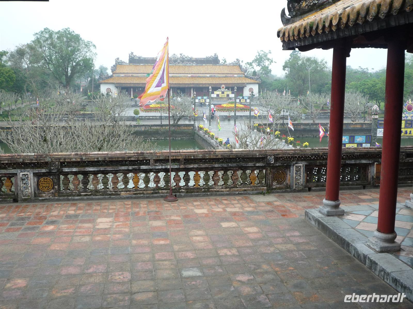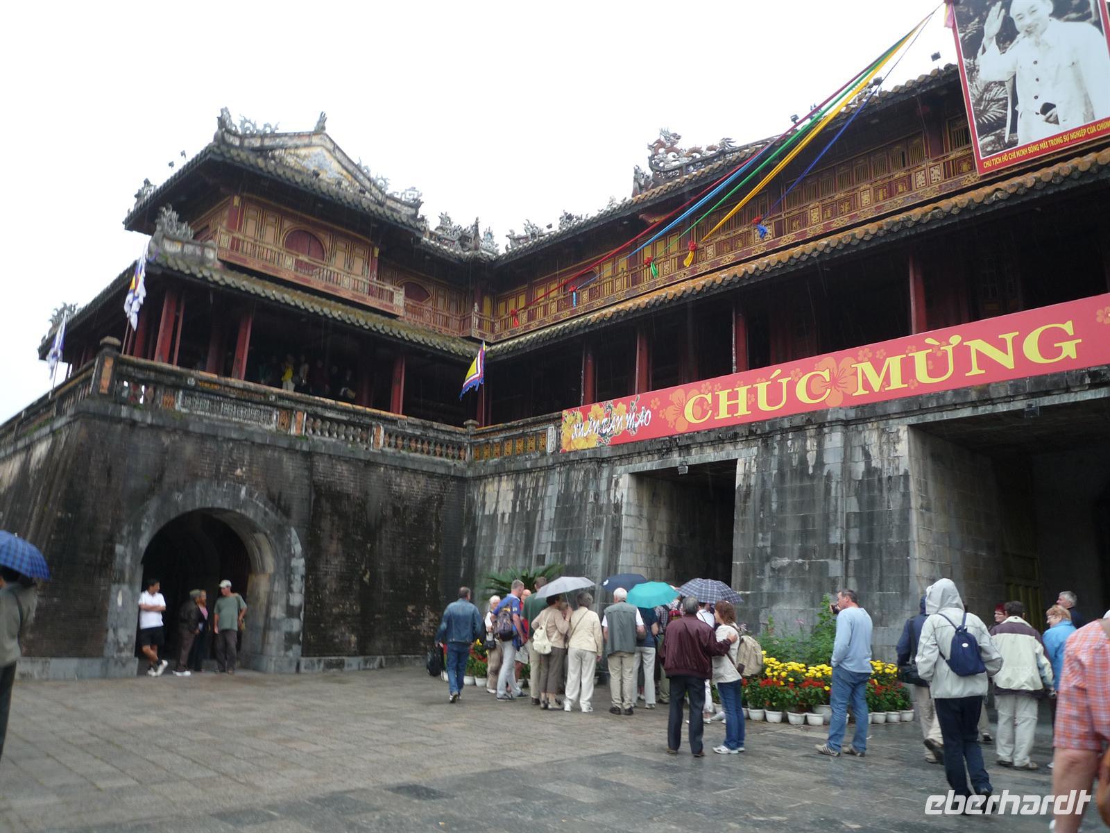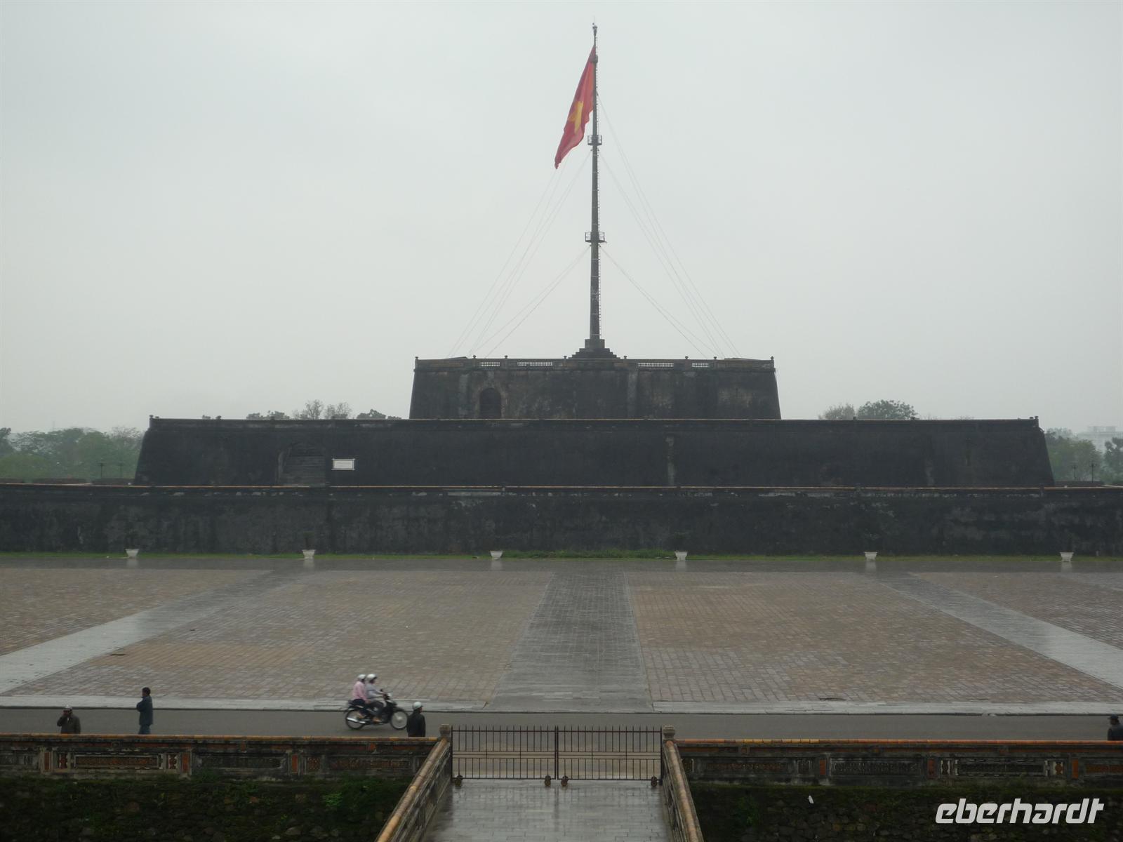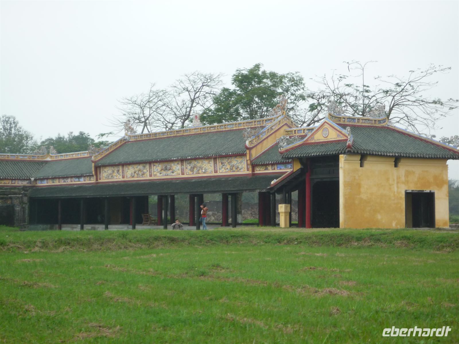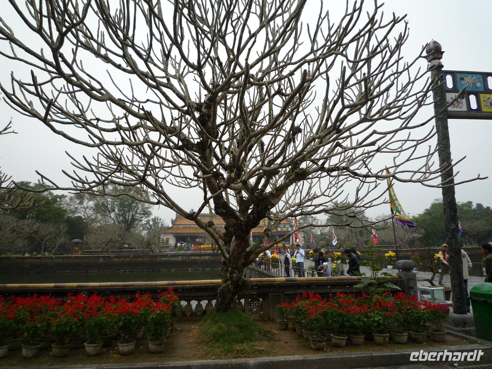 Zeitig am Morgen klingelt der Wecker. Nach einem Kaffee und einer Frühstücksbox geht es zum Flughafen und um 6 Uhr heben wir pünktlich ab nach Hue. Hue, die alte Kaiserstadt erwartet uns. Nach der Ankunft besichtigen wir zuerst die Zitadelle. Hue war 1802 bis 1945 die Hauptstadt von Vietnam. Hue als alte Kaiserstadt in Vietnam besitzt, ähnlich wie Peking, einen Kaiserpalast. Der Kaiser Gia Long ordnete 1802 den Bau der Zitadelle an und so wurde Hue bis 1945 Sitz des Kaisers und Hauptstadt. Der letzte Kaiser Bao Dai verkündete hier 1945 seinen Rücktritt. Wir laufen durch die weitflächige Anlage und sehen neben dem Eingangsbereich mit dem Mittagstor auch die Halle der höchsten Harmonie, das Theater und den Generationentempel. Wir besuchen den Palastkomplex und müssen dann doch feststellen, dass noch viel zu restaurieren ist. Trotzdem erkennt man die gewaltige Anlage und deren Ausmaß.