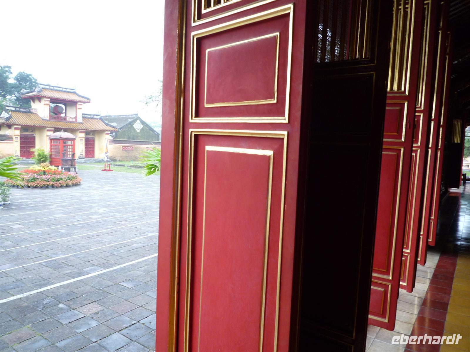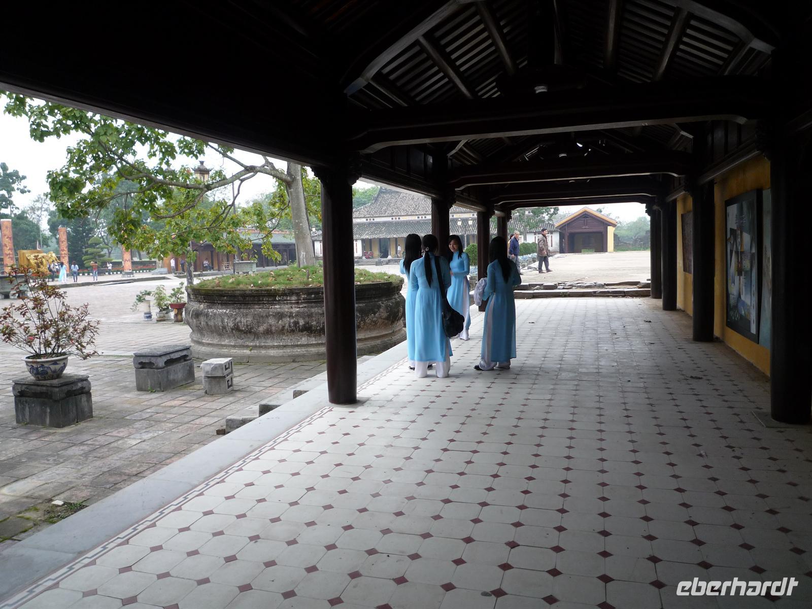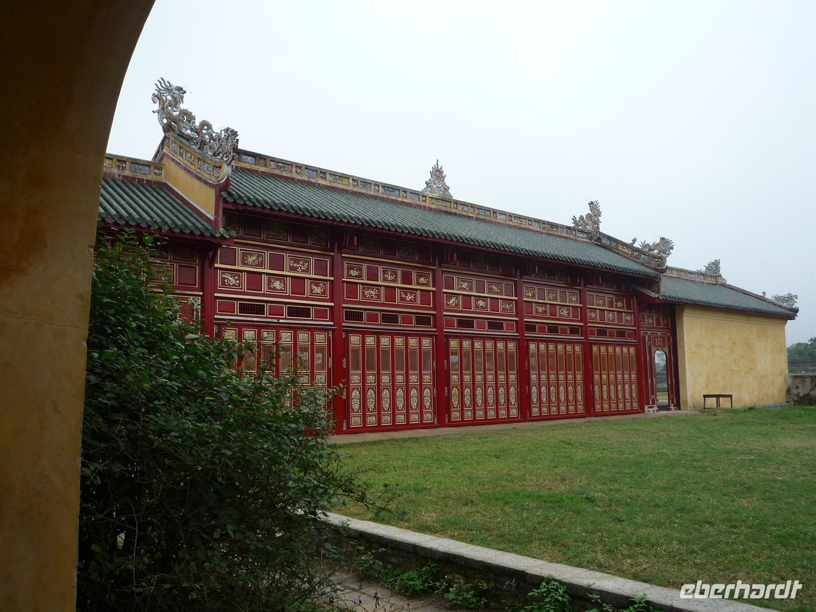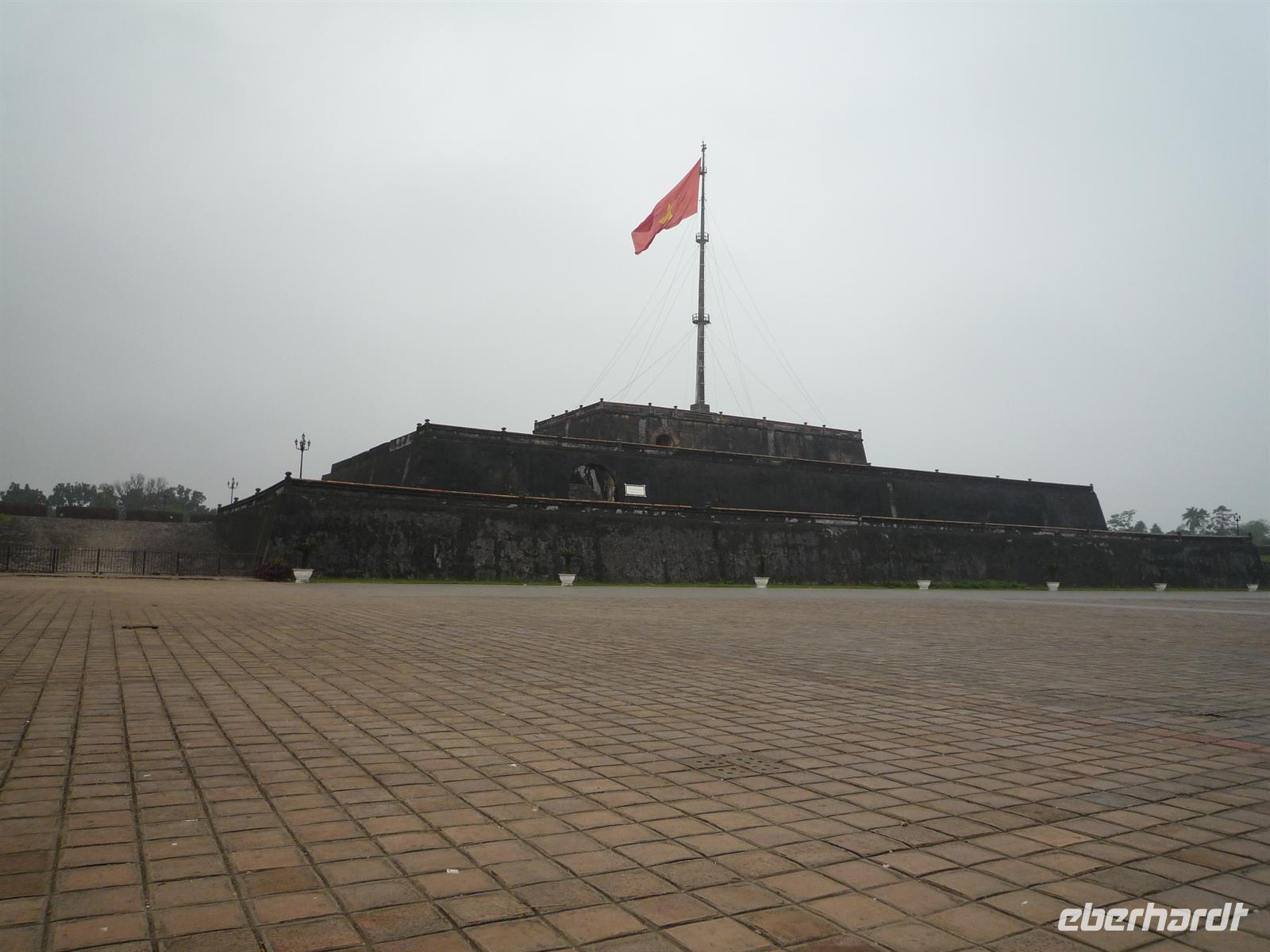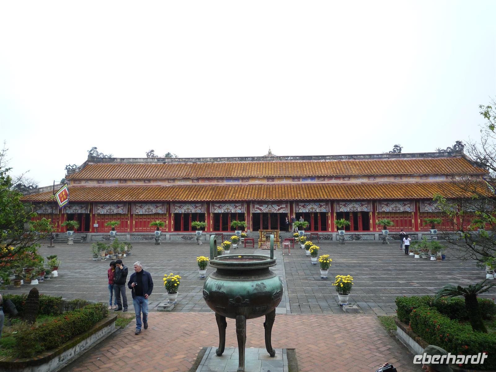 Zeitig am Morgen klingelt der Wecker. Nach einem Kaffee und einer Frühstücksbox geht es zum Flughafen und um 6 Uhr heben wir pünktlich ab nach Hue. Hue, die alte Kaiserstadt erwartet uns. Nach der Ankunft besichtigen wir zuerst die Zitadelle. Hue war 1802 bis 1945 die Hauptstadt von Vietnam. Hue als alte Kaiserstadt in Vietnam besitzt, ähnlich wie Peking, einen Kaiserpalast. Der Kaiser Gia Long ordnete 1802 den Bau der Zitadelle an und so wurde Hue bis 1945 Sitz des Kaisers und Hauptstadt. Der letzte Kaiser Bao Dai verkündete hier 1945 seinen Rücktritt. Wir laufen durch die weitflächige Anlage und sehen neben dem Eingangsbereich mit dem Mittagstor auch die Halle der höchsten Harmonie, das Theater und den Generationentempel. Wir besuchen den Palastkomplex und müssen dann doch feststellen, dass noch viel zu restaurieren ist. Trotzdem erkennt man die gewaltige Anlage und deren Ausmaß.