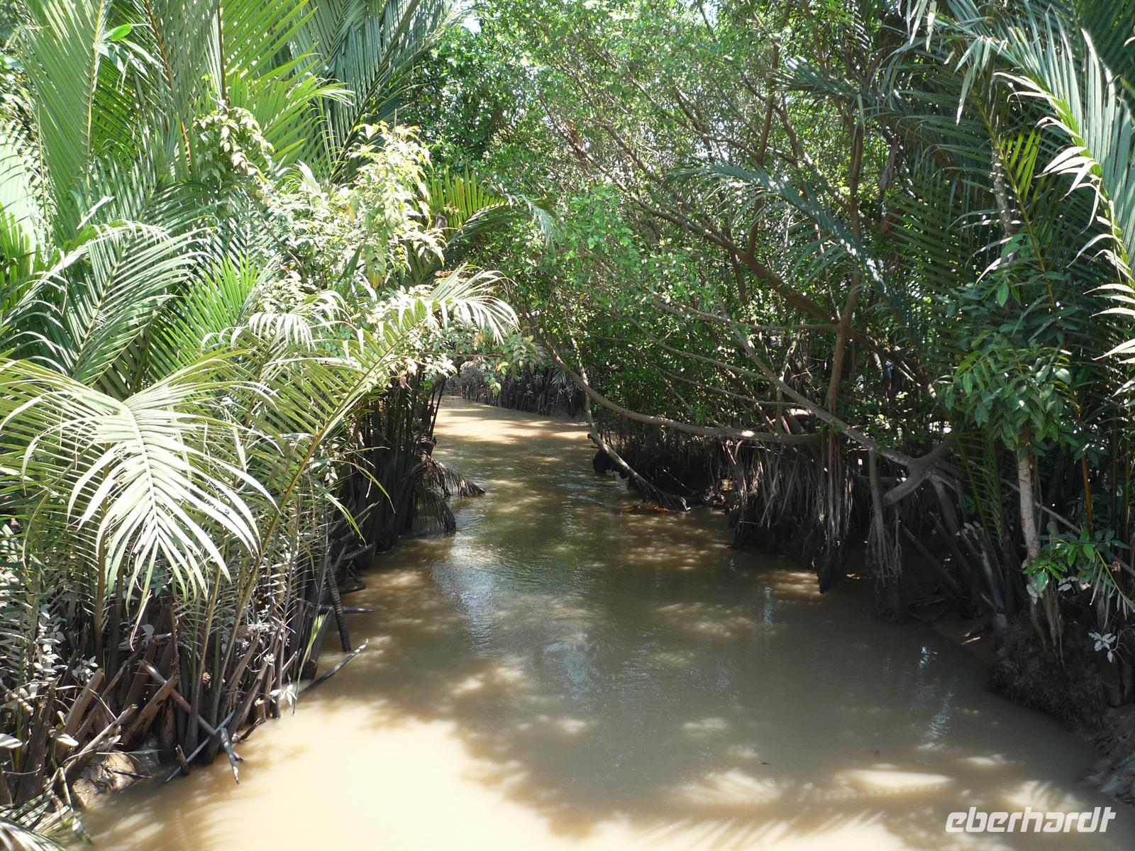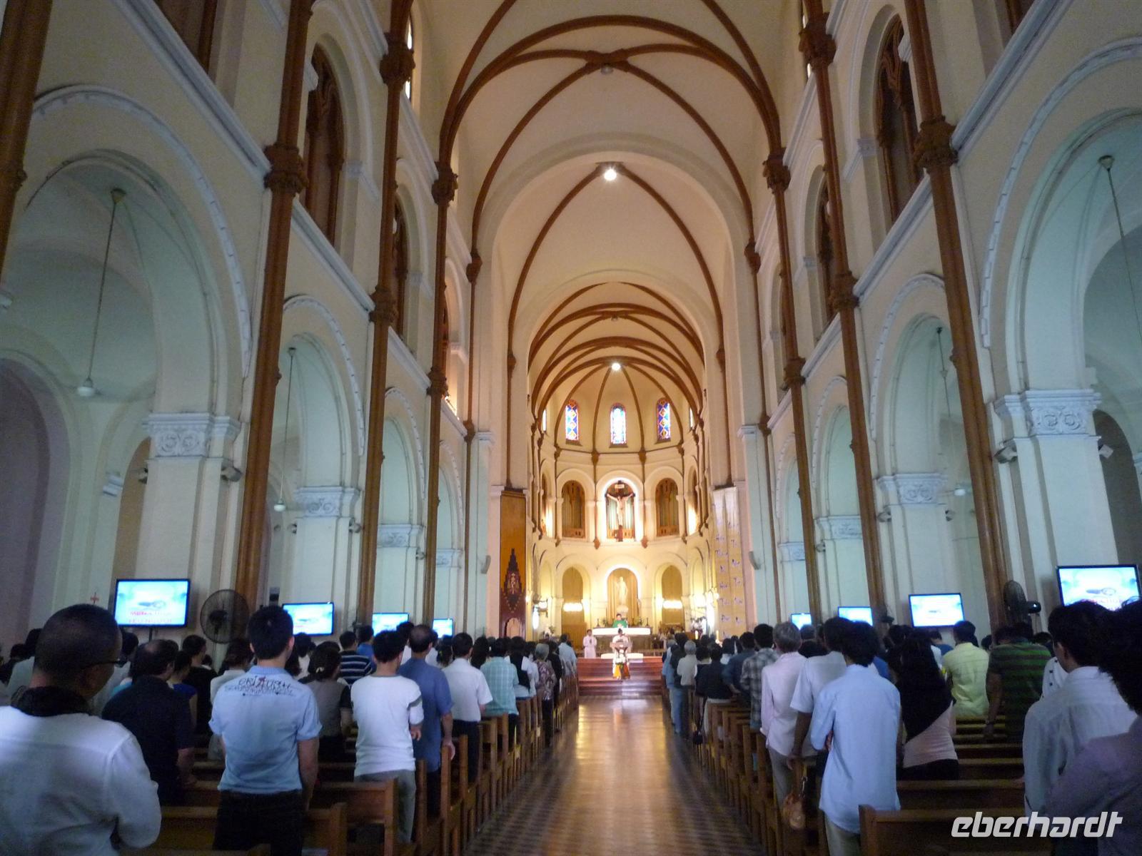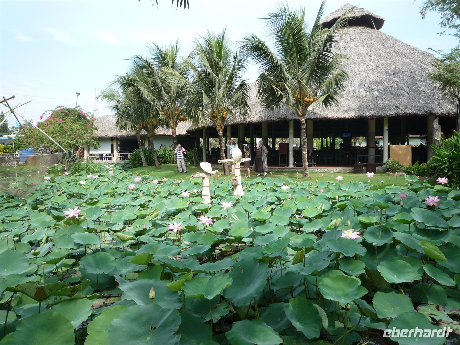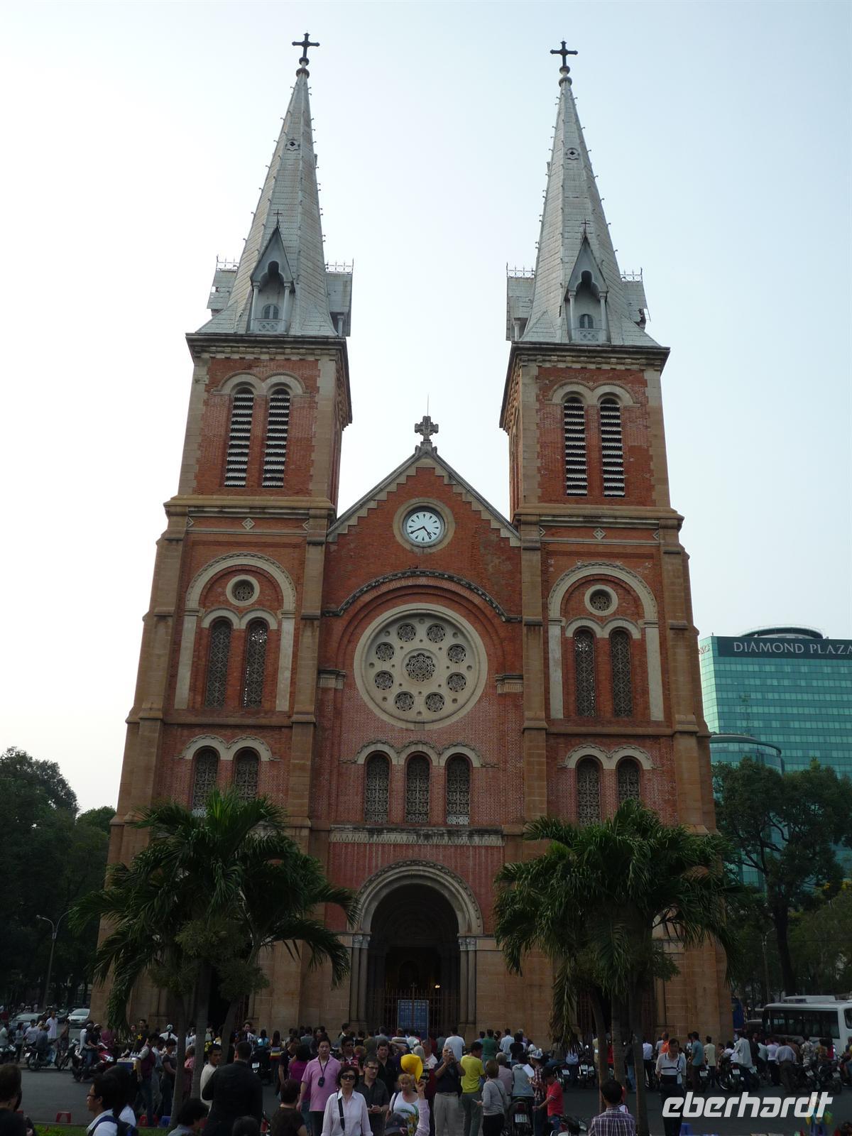 Mit der Erstürmung durch die vietnamesische Armee und der Kapitulation endete im April 1975 endgültig das Kapitel des Vietnamkrieges. Der Palast wird auch heute noch genutzt, allerdings nur der Konferenzsaal. Unweit von hier befindet sich die Kathedrale Notre Dame. Die Kirche aus rotem Backstein, 1880-1883 erbaut wurde von den französischen Kolonialherren errichtet, damit die Gläubigen immer regelmäßig zum Gottesdienst erscheinen konnten. Auch heute noch ist die Kirche bei Gottesdiensten voller Menschen. Als wir sie besuchen, findet gerade ein Gottesdienst statt. Die Kirche ist so voll, dass noch vor der Kirche in Reihen Menschen auf ihren Mopeds dem Gottesdienst lauschen. Gleich nebenan befindet sich, ebenfalls im kolonialfranzösischen Baustil, das Postamt von Saigon. Neben Briefmarken kann man hier, auch allerlei Andenken erwerben. Markant ist die große Halle, die ein Bildnis von Ho Chi Minh schmückt. Abschließend fahren wir noch zu einer Werkstatt, wo Lackmalereien hergestellt werden. Hier werden doch viele unserer Gruppe bei der Suche nach Souvenirs fündig. Die Zeit in Saigon verging schnell, am nächsten Tag geht es nun ins Mekong Delta