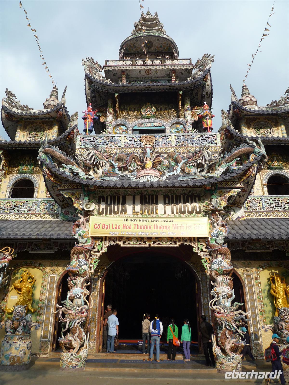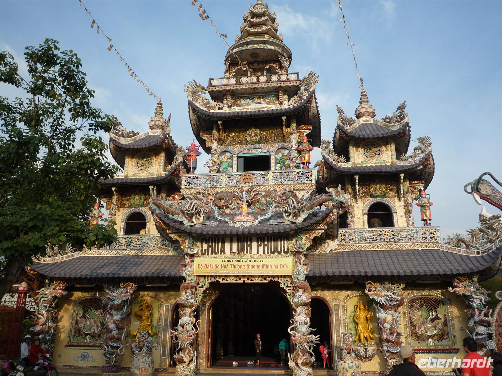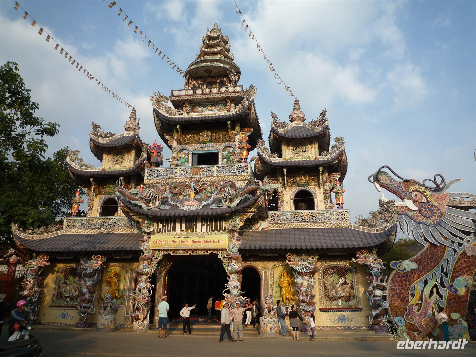 Da Lat hatte früher eine Bahnverbindung nach Saigon, davon ist noch eine kleine Strecke Strecke übrig geblieben, die sich bei Touristen großer Beliebtheit erfreut. Zwanzig Minuten dauert die Fahrt bis nach Trai Mat. Hier befindet sich die imposante Linh-Phouc-Pagode. Die Linh Phuoc-Pagode unterscheidet sich in der Architektur deutlich vom Stil der meisten vietnamesischen Pagoden, da diese Pagode im chinesischen Stil errichtet wurde.