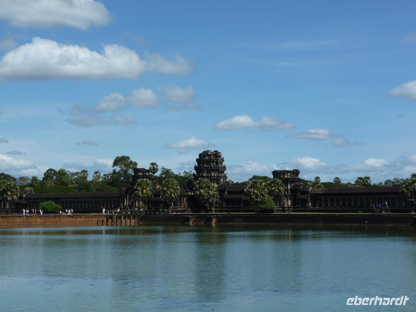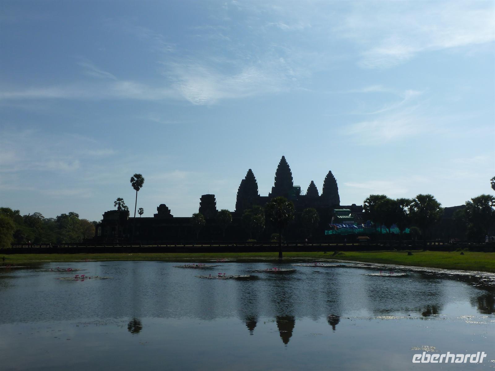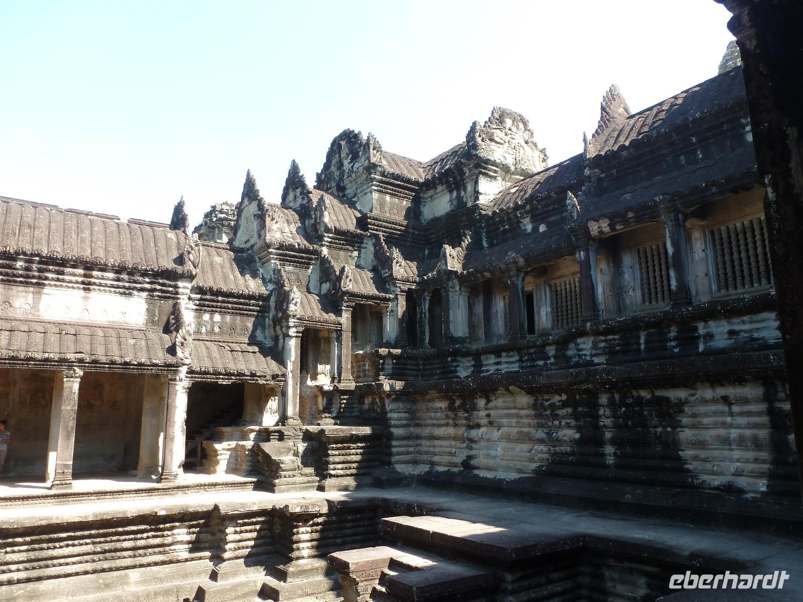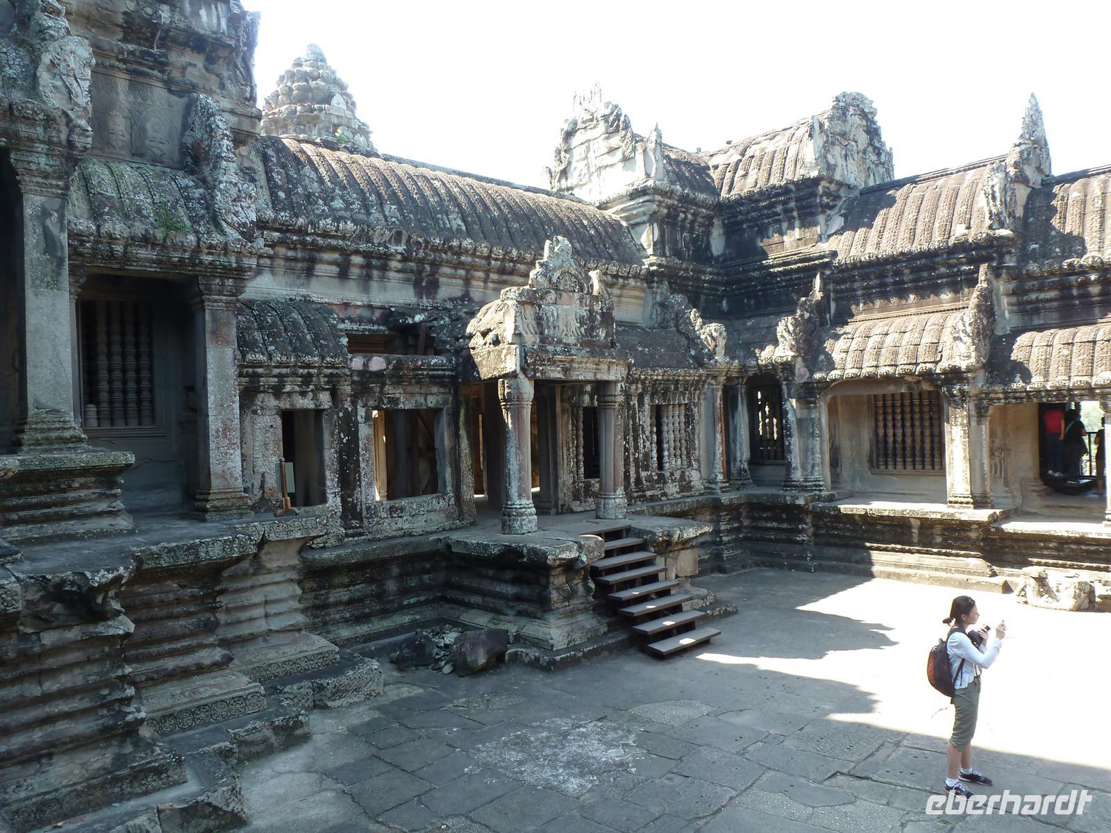 Der beginnende Tag versprach ganz heiße Temperaturen und sehr viel Kultur, von den Sehenswürdigkeiten im Angkor-Areal standen heute die eigentlichen Höhepunkte auf dem Programm. Aber wo viel Licht ist, ist auch viel Schatten. Oder treffender gesagt, eben gerade nicht. Das machte unsere Besichtigung der weltgrößten Tempelanlage zu einer echten Herausforderungen für Körper, Geist und Seele. Doch der Reihe nach. Wir begannen unsere Tour beim Tempel von Angkor Wat, dem Sinnbild und Cover-Motiv schlechthin, wenn es um diese tausend Jahre alte Tempelstätte mitten im Dschungel geht. Unser Reiseleiter Min Thol erklärte mit Hingabe und großen Fachwissen die einzelnen Reliefs, Figuren und Lotosornamente der ersten und zweiten Ebene. Wir erfuhren, woher die Buddha- und die Affengalerie ihre Namen haben. Darüber hinaus kann man seit knapp zwei Jahren auch wieder auf die dritte Ebene von Angkor hinauf, was allerdings Schwindelfreiheit und eine gute Konstitution voraussetzt, ist doch der Aufstieg über eine unglaublich steile Treppe zu bewerkstelligen. Und da es sich bei den Tempeln von Angkor um UNESCO-Weltkulturerbe handelt, ist man selbstverständlich auch nicht allein. Mit uns wogte, schob und gestikulierte eine enorme Menschenmenge, in allen Sprachen plappernd, durch die beeindruckende Anlage. Bis zu sechstausend Menschen besuchen jeden Tag das Herz des