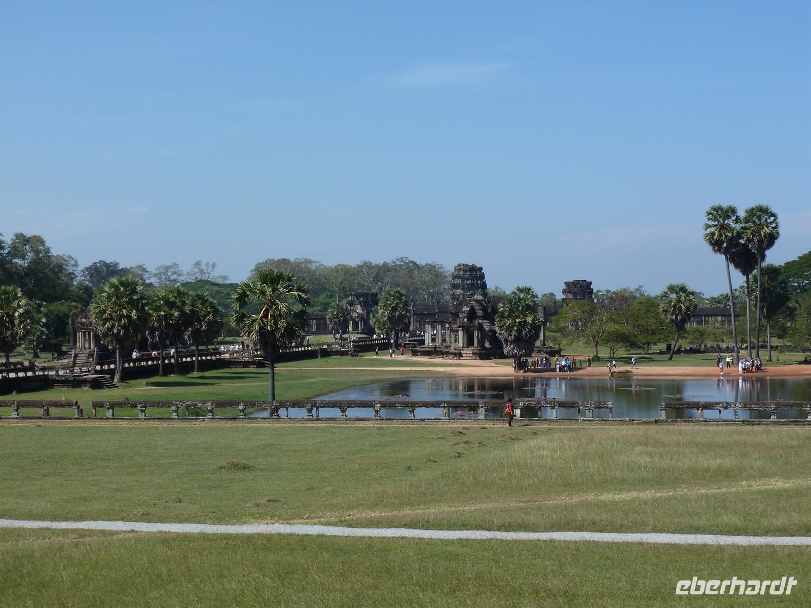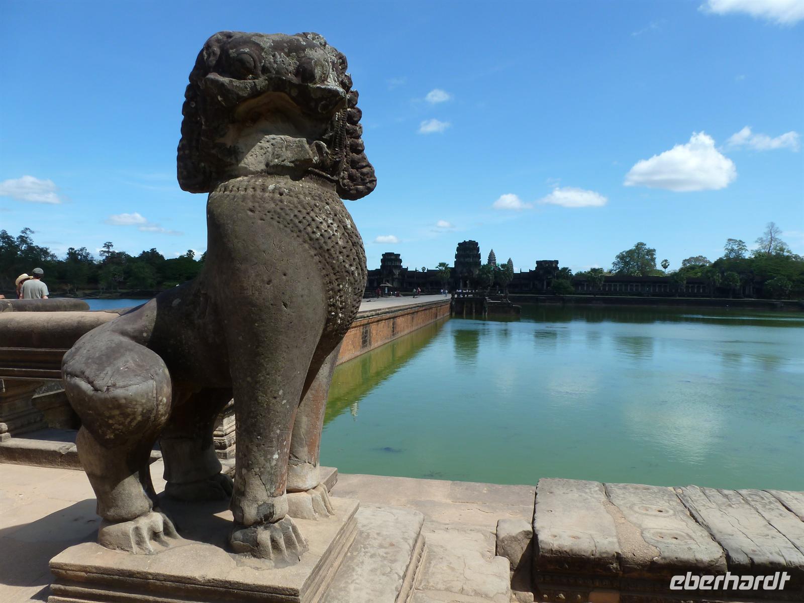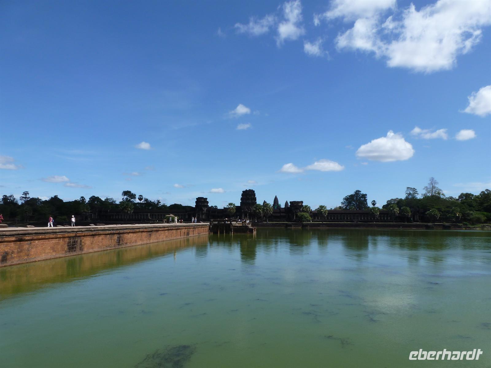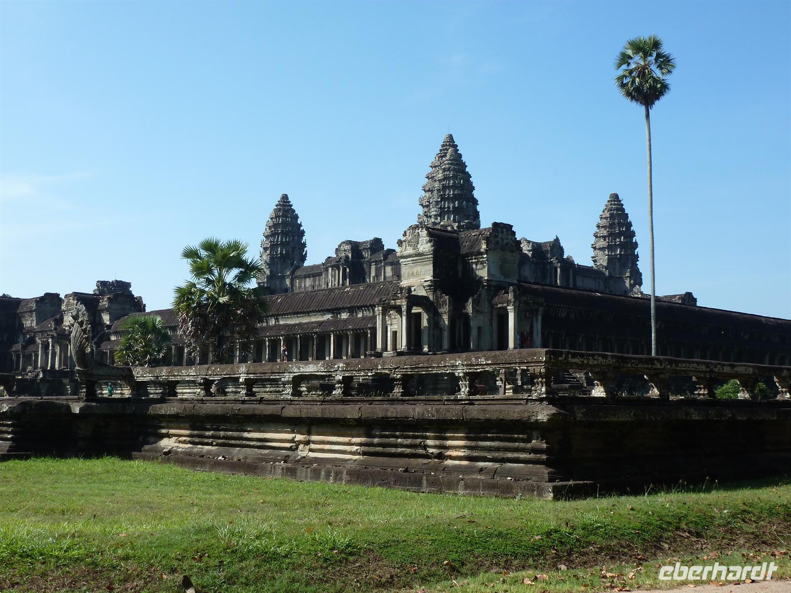 Der beginnende Tag versprach ganz heiße Temperaturen und sehr viel Kultur, von den Sehenswürdigkeiten im Angkor-Areal standen heute die eigentlichen Höhepunkte auf dem Programm. Aber wo viel Licht ist, ist auch viel Schatten. Oder treffender gesagt, eben gerade nicht. Das machte unsere Besichtigung der weltgrößten Tempelanlage zu einer echten Herausforderungen für Körper, Geist und Seele. Doch der Reihe nach. Wir begannen unsere Tour beim Tempel von Angkor Wat, dem Sinnbild und Cover-Motiv schlechthin, wenn es um diese tausend Jahre alte Tempelstätte mitten im Dschungel geht. Unser Reiseleiter Min Thol erklärte mit Hingabe und großen Fachwissen die einzelnen Reliefs, Figuren und Lotosornamente der ersten und zweiten Ebene. Wir erfuhren, woher die Buddha- und die Affengalerie ihre Namen haben. Darüber hinaus kann man seit knapp zwei Jahren auch wieder auf die dritte Ebene von Angkor hinauf, was allerdings Schwindelfreiheit und eine gute Konstitution voraussetzt, ist doch der Aufstieg über eine unglaublich steile Treppe zu bewerkstelligen. Und da es sich bei den Tempeln von Angkor um UNESCO-Weltkulturerbe handelt, ist man selbstverständlich auch nicht allein. Mit uns wogte, schob und gestikulierte eine enorme Menschenmenge, in allen Sprachen plappernd, durch die beeindruckende Anlage. Bis zu sechstausend Menschen besuchen jeden Tag das Herz des
