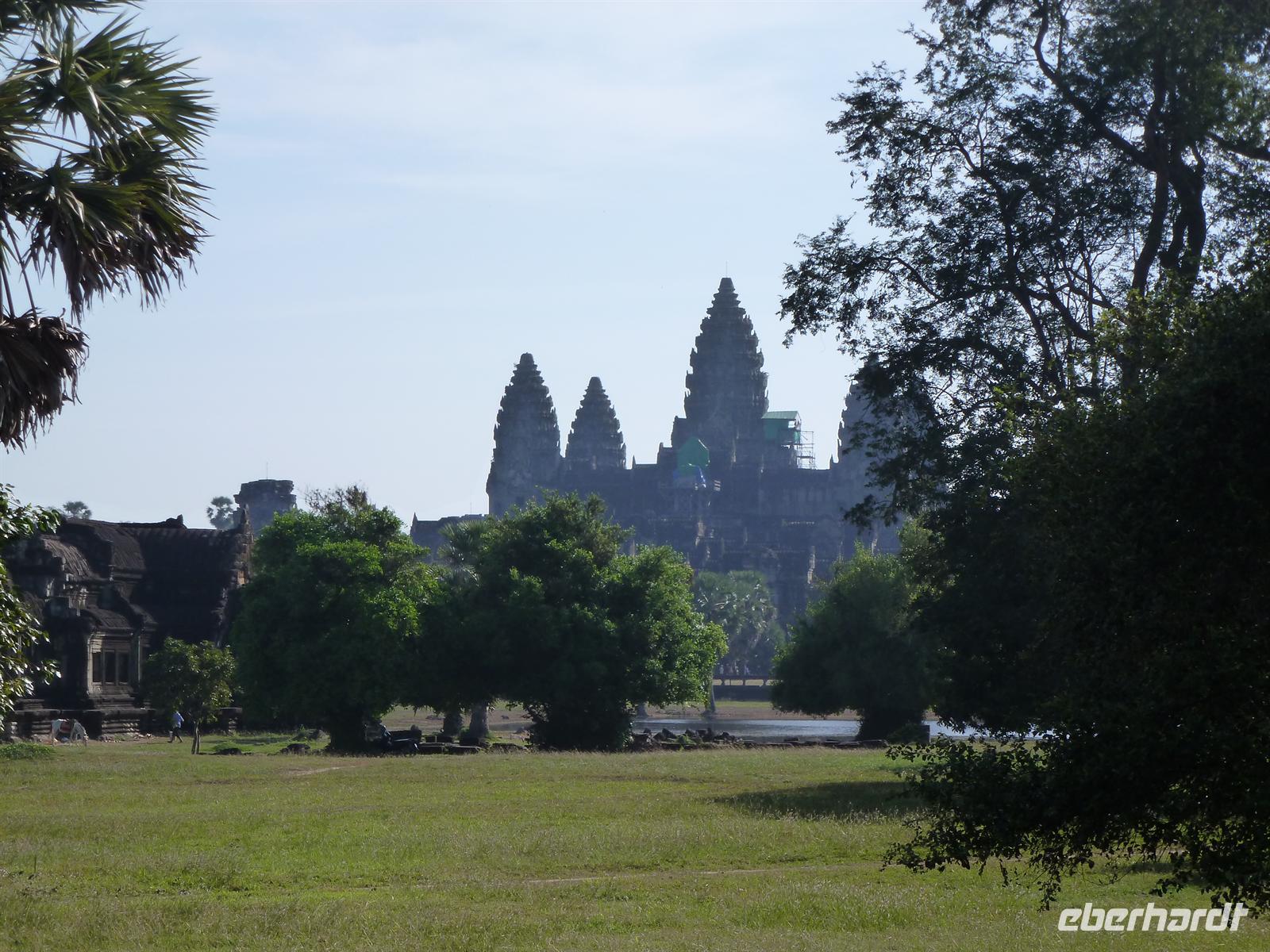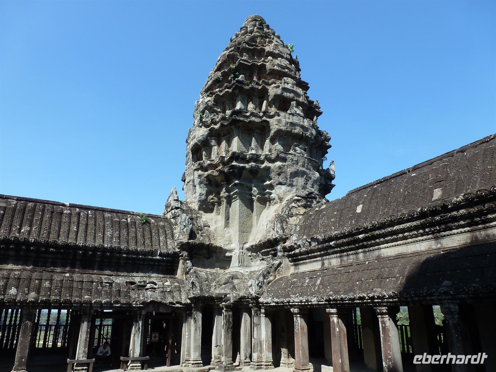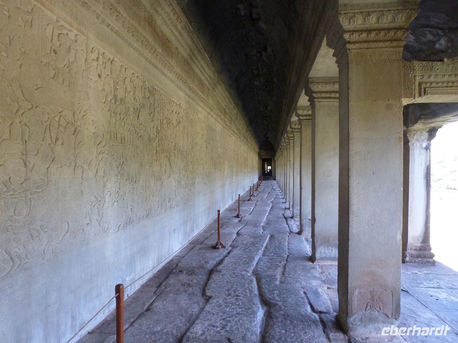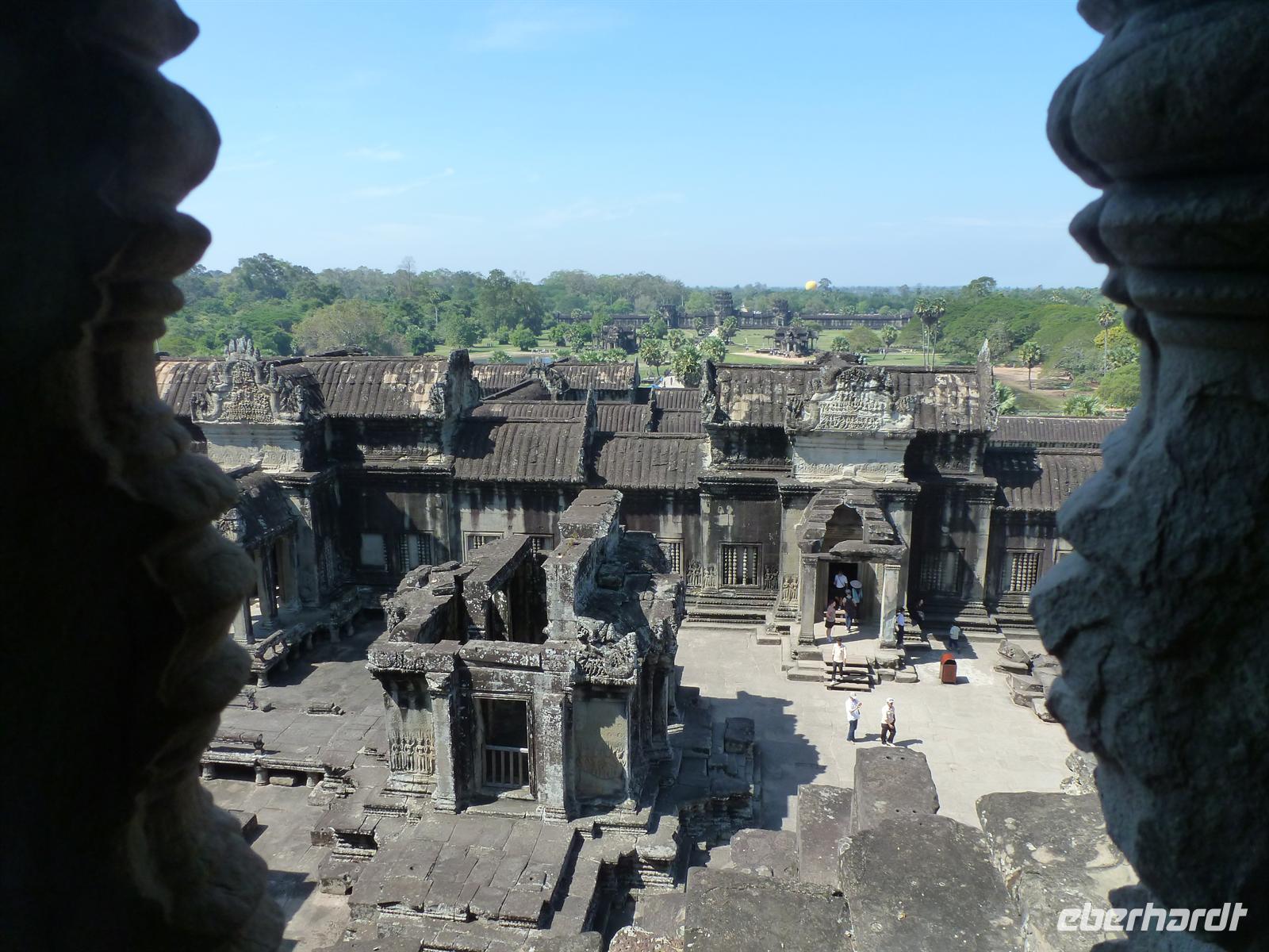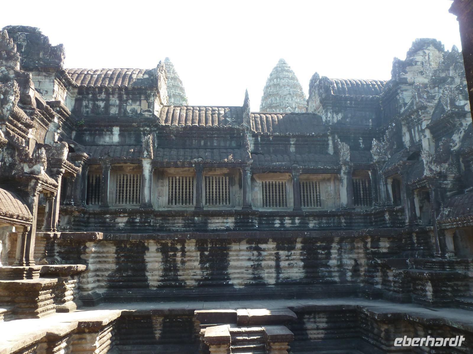 Der beginnende Tag versprach ganz heiße Temperaturen und sehr viel Kultur, von den Sehenswürdigkeiten im Angkor-Areal standen heute die eigentlichen Höhepunkte auf dem Programm. Aber wo viel Licht ist, ist auch viel Schatten. Oder treffender gesagt, eben gerade nicht. Das machte unsere Besichtigung der weltgrößten Tempelanlage zu einer echten Herausforderungen für Körper, Geist und Seele. Doch der Reihe nach. Wir begannen unsere Tour beim Tempel von Angkor Wat, dem Sinnbild und Cover-Motiv schlechthin, wenn es um diese tausend Jahre alte Tempelstätte mitten im Dschungel geht. Unser Reiseleiter Min Thol erklärte mit Hingabe und großen Fachwissen die einzelnen Reliefs, Figuren und Lotosornamente der ersten und zweiten Ebene. Wir erfuhren, woher die Buddha- und die Affengalerie ihre Namen haben. Darüber hinaus kann man seit knapp zwei Jahren auch wieder auf die dritte Ebene von Angkor hinauf, was allerdings Schwindelfreiheit und eine gute Konstitution voraussetzt, ist doch der Aufstieg über eine unglaublich steile Treppe zu bewerkstelligen. Und da es sich bei den Tempeln von Angkor um UNESCO-Weltkulturerbe handelt, ist man selbstverständlich auch nicht allein. Mit uns wogte, schob und gestikulierte eine enorme Menschenmenge, in allen Sprachen plappernd, durch die beeindruckende Anlage. Bis zu sechstausend Menschen besuchen jeden Tag das Herz des