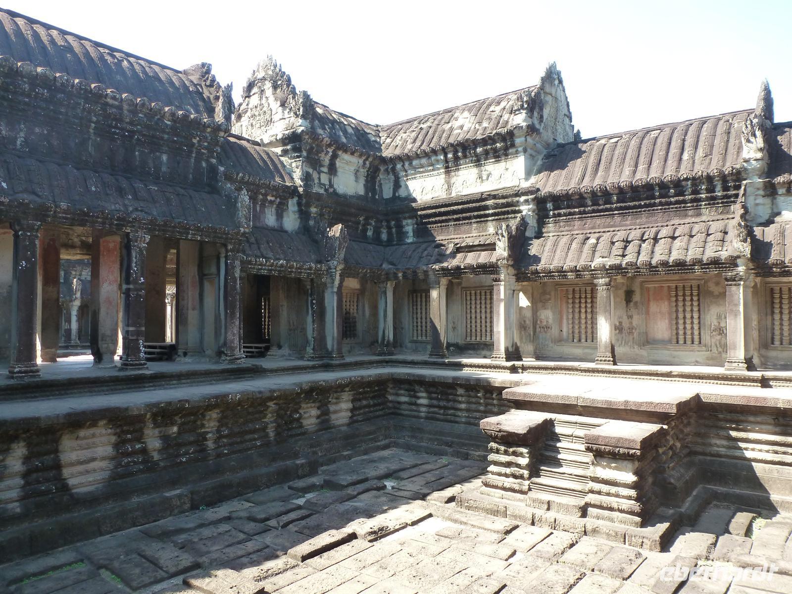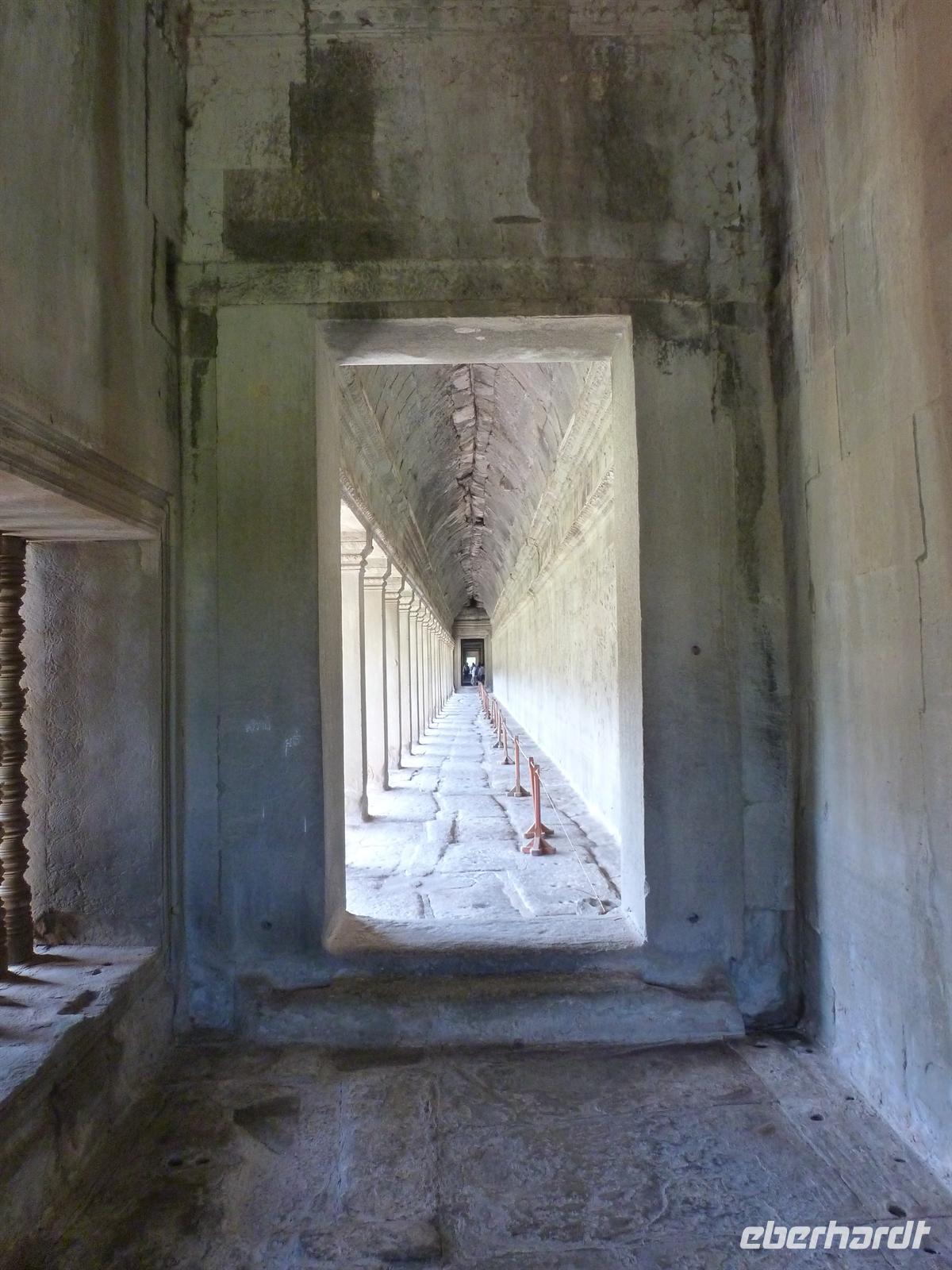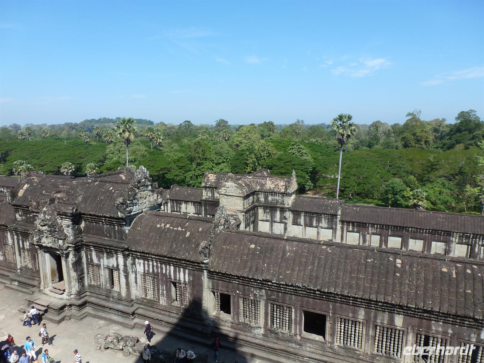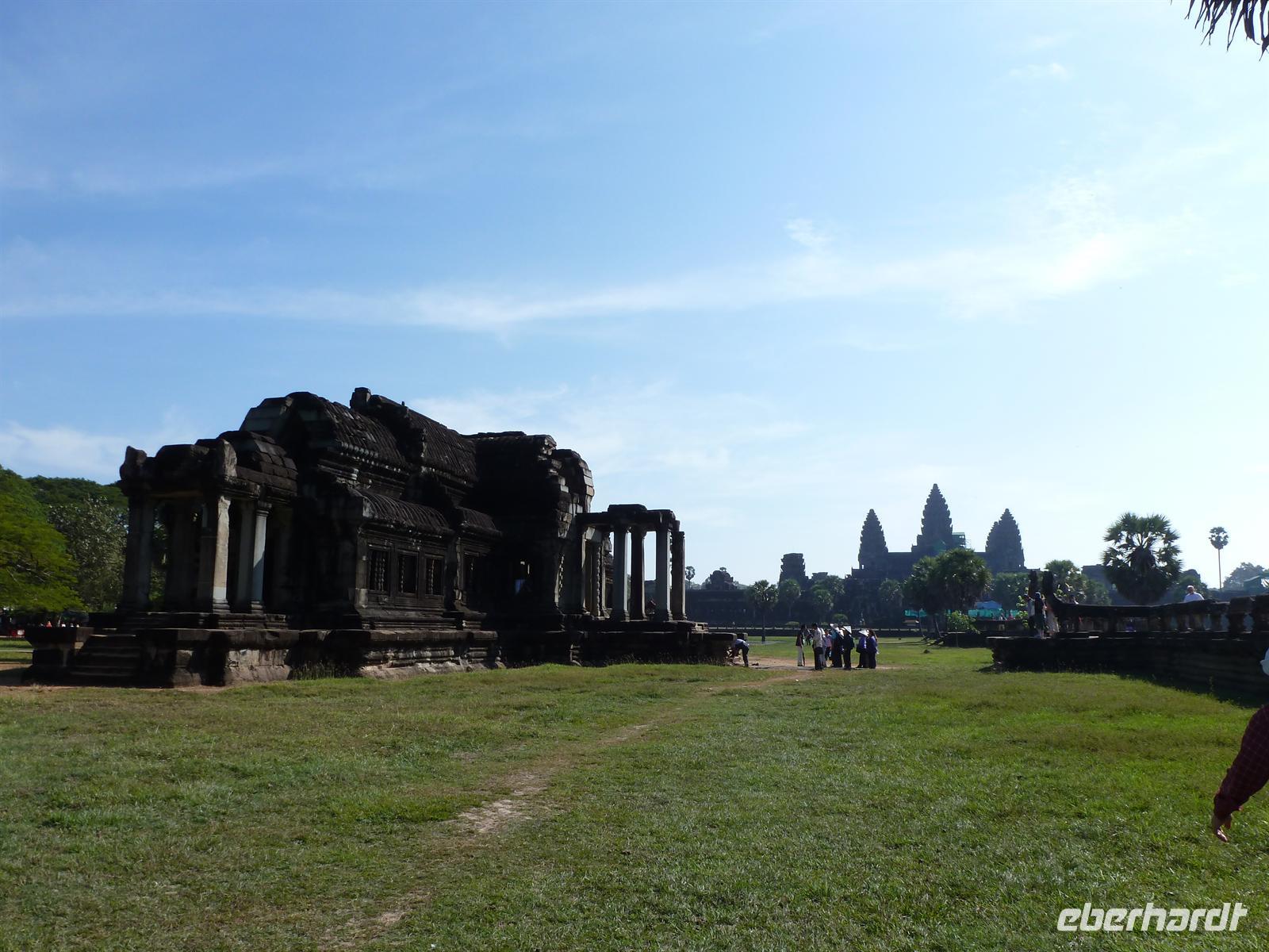 Der beginnende Tag versprach ganz heiße Temperaturen und sehr viel Kultur, von den Sehenswürdigkeiten im Angkor-Areal standen heute die eigentlichen Höhepunkte auf dem Programm. Aber wo viel Licht ist, ist auch viel Schatten. Oder treffender gesagt, eben gerade nicht. Das machte unsere Besichtigung der weltgrößten Tempelanlage zu einer echten Herausforderungen für Körper, Geist und Seele. Doch der Reihe nach. Wir begannen unsere Tour beim Tempel von Angkor Wat, dem Sinnbild und Cover-Motiv schlechthin, wenn es um diese tausend Jahre alte Tempelstätte mitten im Dschungel geht. Unser Reiseleiter Min Thol erklärte mit Hingabe und großen Fachwissen die einzelnen Reliefs, Figuren und Lotosornamente der ersten und zweiten Ebene. Wir erfuhren, woher die Buddha- und die Affengalerie ihre Namen haben. Darüber hinaus kann man seit knapp zwei Jahren auch wieder auf die dritte Ebene von Angkor hinauf, was allerdings Schwindelfreiheit und eine gute Konstitution voraussetzt, ist doch der Aufstieg über eine unglaublich steile Treppe zu bewerkstelligen. Und da es sich bei den Tempeln von Angkor um UNESCO-Weltkulturerbe handelt, ist man selbstverständlich auch nicht allein. Mit uns wogte, schob und gestikulierte eine enorme Menschenmenge, in allen Sprachen plappernd, durch die beeindruckende Anlage. Bis zu sechstausend Menschen besuchen jeden Tag das Herz des