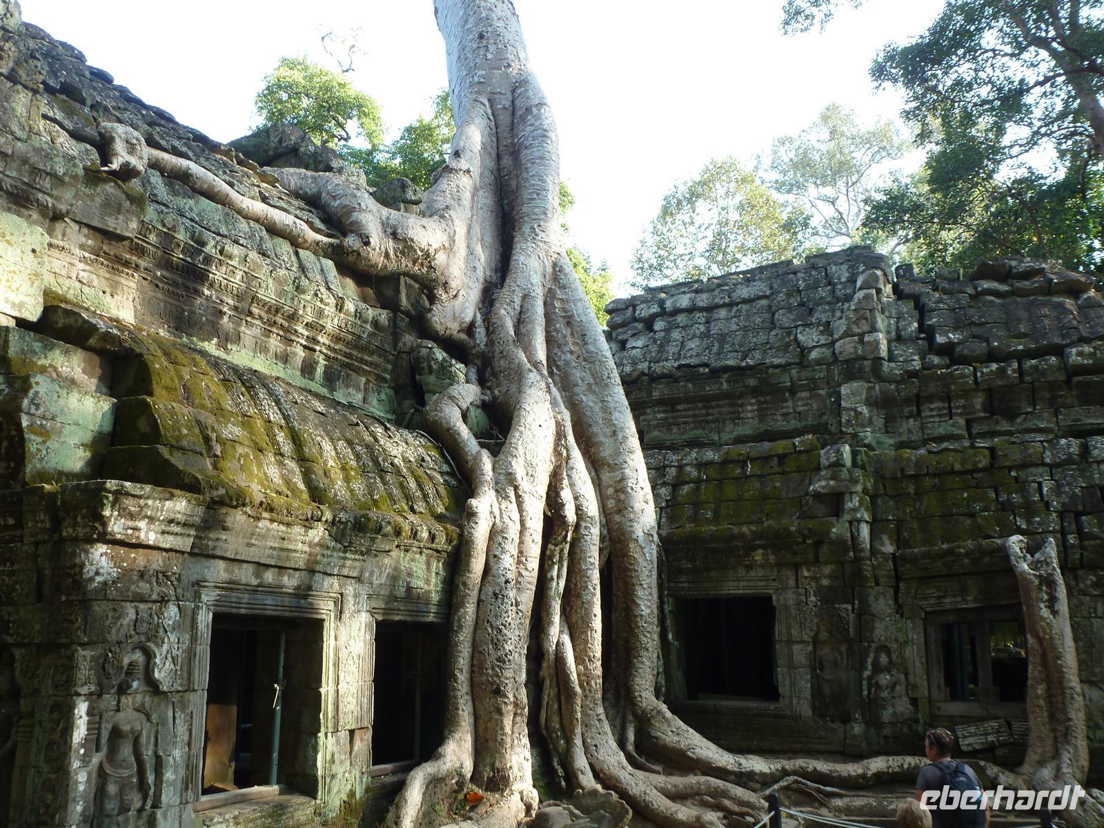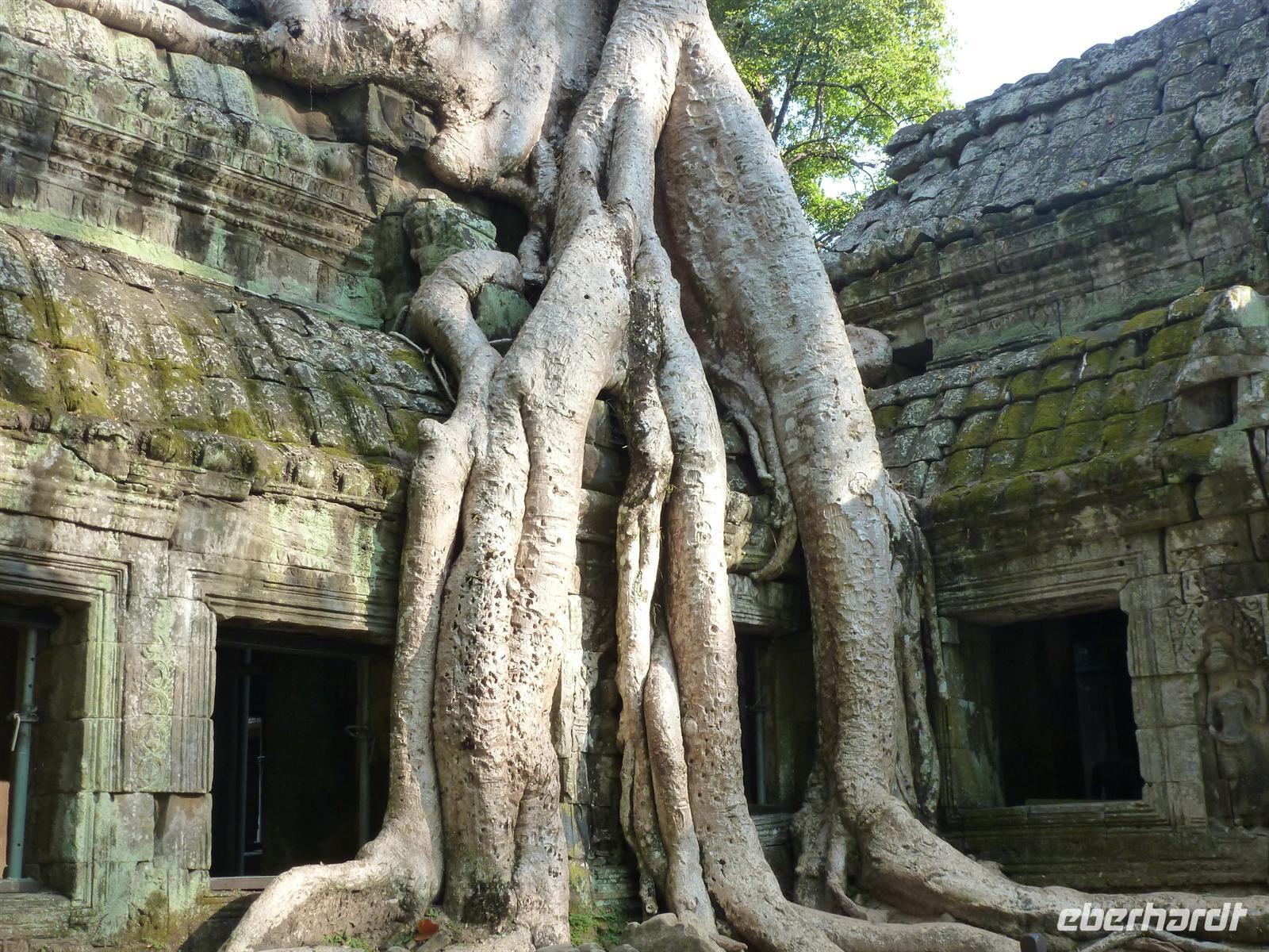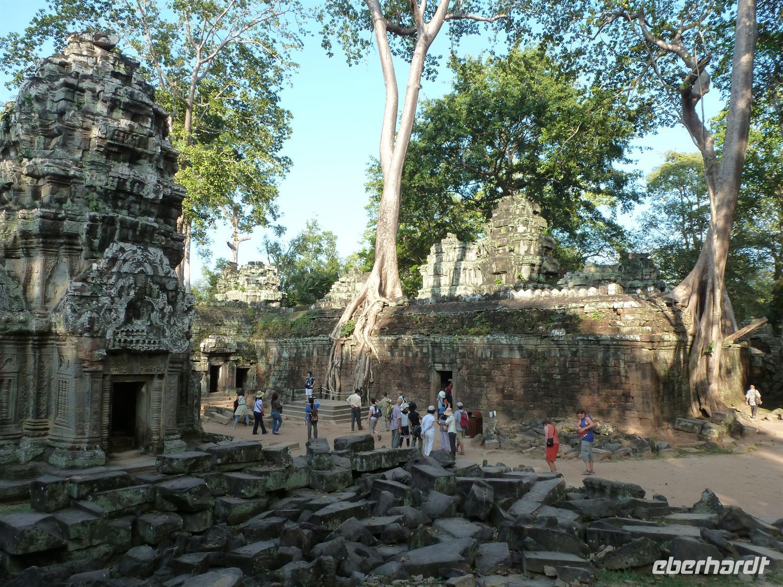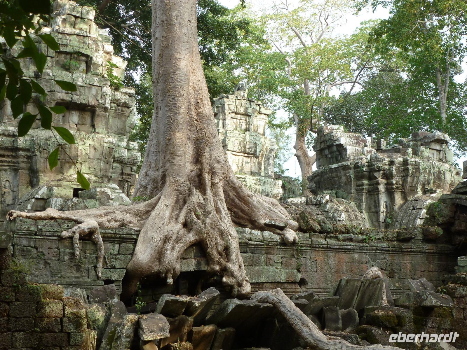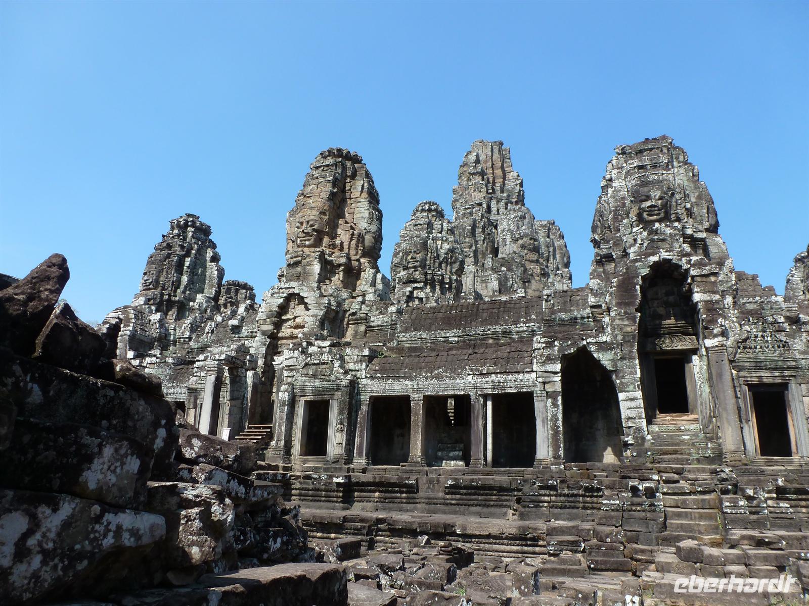 ehemals mächtigen Khmer-Reiches, was an manchen Stellen zu unangenehmen Warteschlangen führt. So auch beim Aufstieg in die dritte Ebene. Und da das mächtige Bauwerk leider nicht an allen Ecken und Ende vor der unbarmherzig brennenden Sonne schützt, wurde uns echtes Durchhaltevermögen und Standfestigkeit abverlangt. Lohn der Mühe war dafür der faszinierende Blick aus über fünfzig Meter Höhe auf die Ebene von Angkor. Trotz 35 Grad Hitze setzten wir tapfer unsere Fahrt durch die Tempelanlagen fort. Wir betraten den Komplex von Angkor Thom durch das Südtor und besichtigten den Bayon-Tempel, der sich in drei Ebenen achtundfünfzig Meter hoch über dem Erdboden erhebt. Von den ehemals neunundvierzig Türmen sind heute noch siebenunddreißig weitestgehend erhalten. Am markantesten sind die Prasate mit den Gesichtern von Lokeshvara, die in die vier Himmelsrichtungen schauen. Ein kurzer Spaziergang zur Elefantenterrasse und zur Terrasse des Lepra-Königs beschließt das vormittägliche Programm. Wir suchen Schatten in einem Freiluftrestaurant und lassen uns erst einmal kalte Getränke und eine Kleinigkeit zu Essen schmecken. Gut gestärkt und etwas erholt geht es zum letzten Tempel des heutigen Tages, den aus Kino und Werbung weltweit bekannten „Dschungeltempel“ Ta Prohm. Hier, wo sich die Baumriesen ihr natürliches Umfeld langsam zurückerobern und dabei durch den weichen Sandstein stoßen, kann man beeindruckende Bilder von den unfreiwilligen Symbiosen von Bäumen und Gebäuden fotografieren. Die Urgewalt des Dschungels, die alles verändernde Kraft der Natur gegenüber der Vergänglichkeit menschlicher Baukunst kommt nirgendwo so deutlich zum Ausdruck wie in dieser Anlage. Noch tief beeindruckt und fasziniert von diesen Bildern treten wir unsere Rückfahrt zum Hotel an. Obwohl alle ein wenig von der Hitze und der Weitläufigkeit der Anlagen geschafft sind, möchte niemand diese Erfahrungen und Erlebnisse missen. Und nach einer kalten Dusche und einem angenehmen Abendessen im Hotel reicht bei allen noch die Kraft, um bei einem Gläschen an der Lobby-Bar in Erinnerungen an die hinter uns liegenden Tage zu schwelgen und lustige Anekdoten nochmals Revue passieren zu lassen.