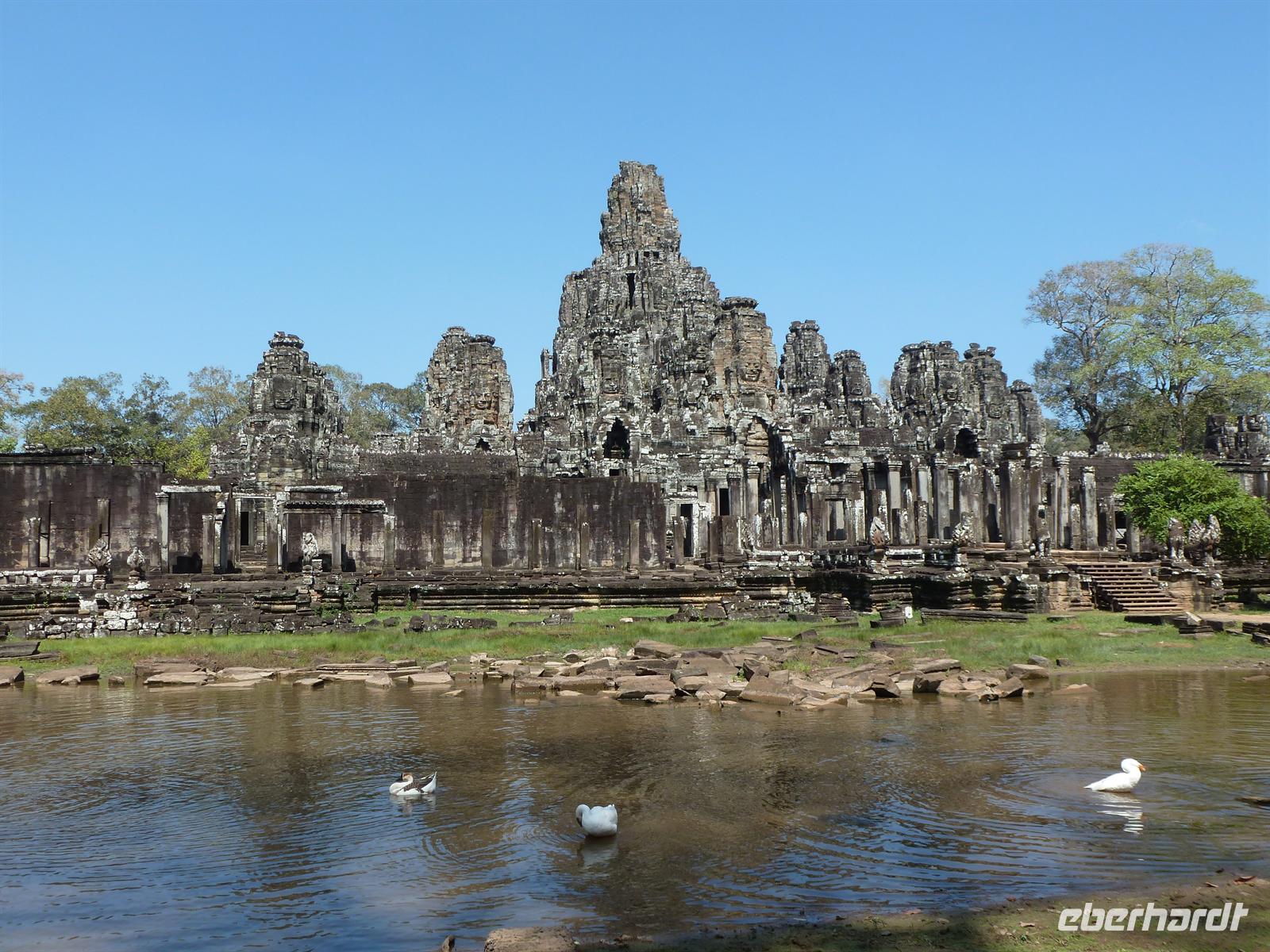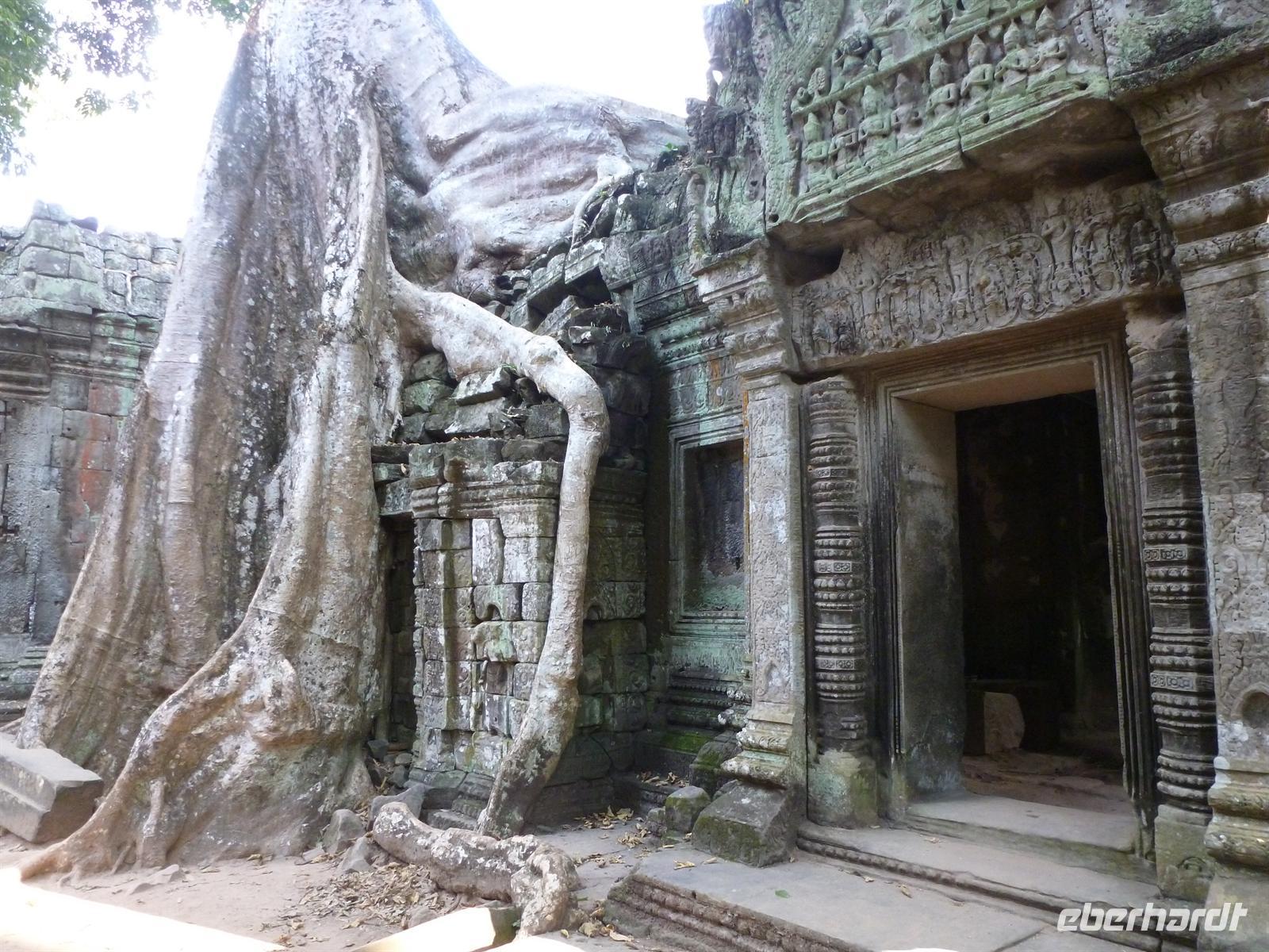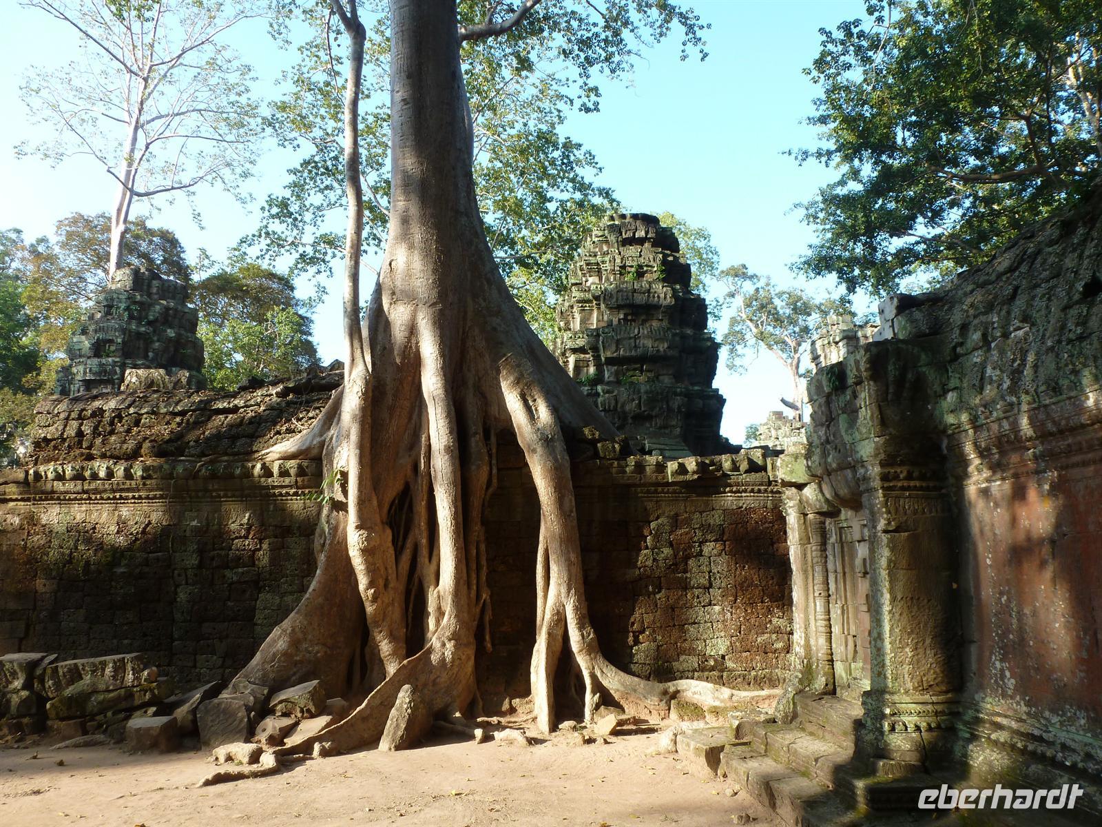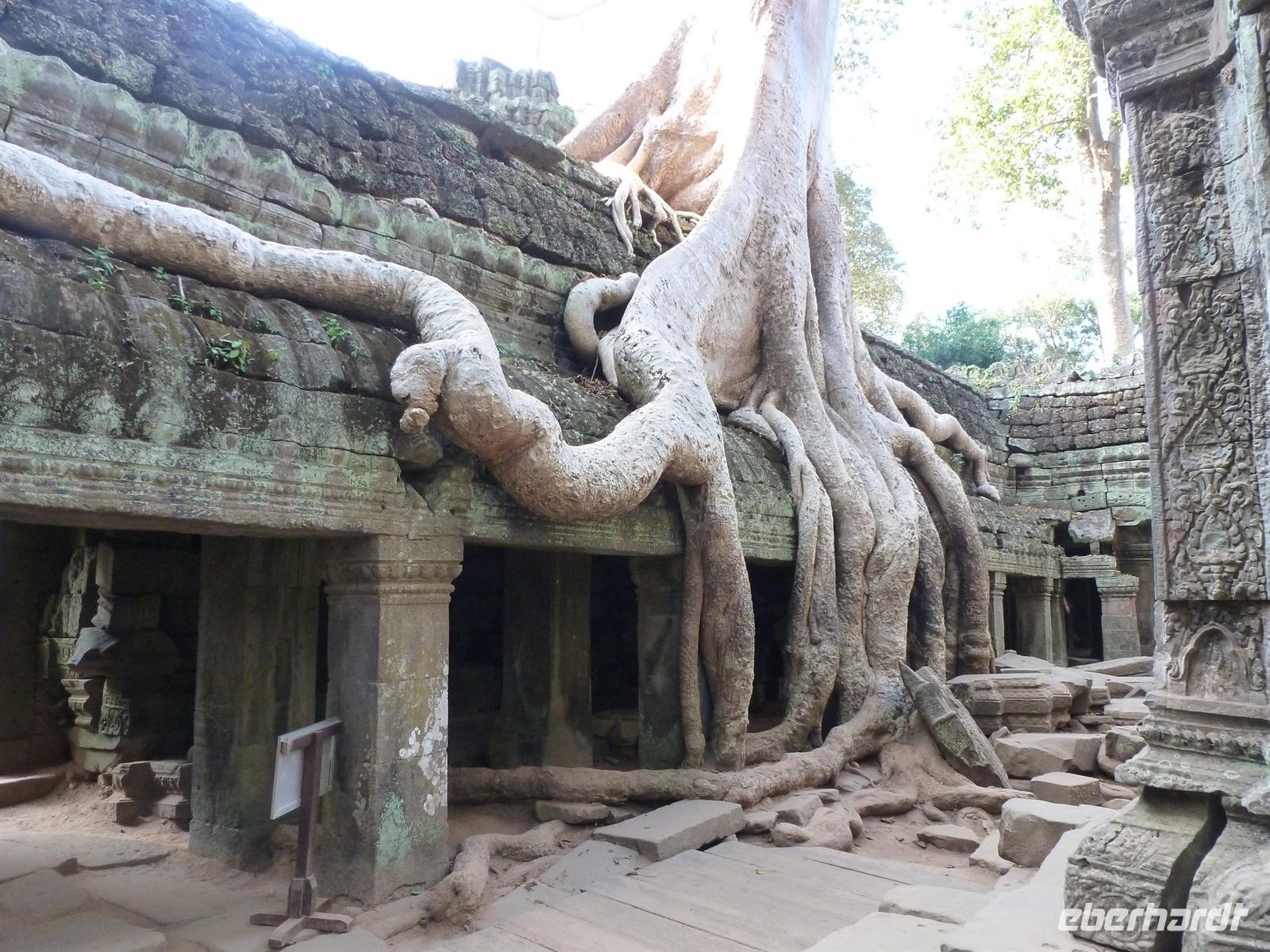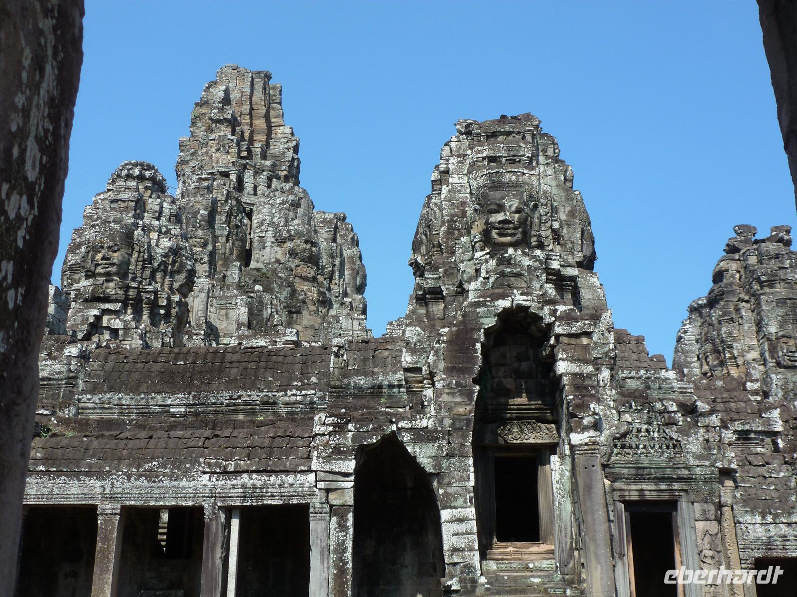 ehemals mächtigen Khmer-Reiches, was an manchen Stellen zu unangenehmen Warteschlangen führt. So auch beim Aufstieg in die dritte Ebene. Und da das mächtige Bauwerk leider nicht an allen Ecken und Ende vor der unbarmherzig brennenden Sonne schützt, wurde uns echtes Durchhaltevermögen und Standfestigkeit abverlangt. Lohn der Mühe war dafür der faszinierende Blick aus über fünfzig Meter Höhe auf die Ebene von Angkor. Trotz 35 Grad Hitze setzten wir tapfer unsere Fahrt durch die Tempelanlagen fort. Wir betraten den Komplex von Angkor Thom durch das Südtor und besichtigten den Bayon-Tempel, der sich in drei Ebenen achtundfünfzig Meter hoch über dem Erdboden erhebt. Von den ehemals neunundvierzig Türmen sind heute noch siebenunddreißig weitestgehend erhalten. Am markantesten sind die Prasate mit den Gesichtern von Lokeshvara, die in die vier Himmelsrichtungen schauen. Ein kurzer Spaziergang zur Elefantenterrasse und zur Terrasse des Lepra-Königs beschließt das vormittägliche Programm. Wir suchen Schatten in einem Freiluftrestaurant und lassen uns erst einmal kalte Getränke und eine Kleinigkeit zu Essen schmecken. Gut gestärkt und etwas erholt geht es zum letzten Tempel des heutigen Tages, den aus Kino und Werbung weltweit bekannten „Dschungeltempel“ Ta Prohm. Hier, wo sich die Baumriesen ihr natürliches Umfeld langsam zurückerobern und dabei durch den weichen Sandstein stoßen, kann man beeindruckende Bilder von den unfreiwilligen Symbiosen von Bäumen und Gebäuden fotografieren. Die Urgewalt des Dschungels, die alles verändernde Kraft der Natur gegenüber der Vergänglichkeit menschlicher Baukunst kommt nirgendwo so deutlich zum Ausdruck wie in dieser Anlage. Noch tief beeindruckt und fasziniert von diesen Bildern treten wir unsere Rückfahrt zum Hotel an. Obwohl alle ein wenig von der Hitze und der Weitläufigkeit der Anlagen geschafft sind, möchte niemand diese Erfahrungen und Erlebnisse missen. Und nach einer kalten Dusche und einem angenehmen Abendessen im Hotel reicht bei allen noch die Kraft, um bei einem Gläschen an der Lobby-Bar in Erinnerungen an die hinter uns liegenden Tage zu schwelgen und lustige Anekdoten nochmals Revue passieren zu lassen.