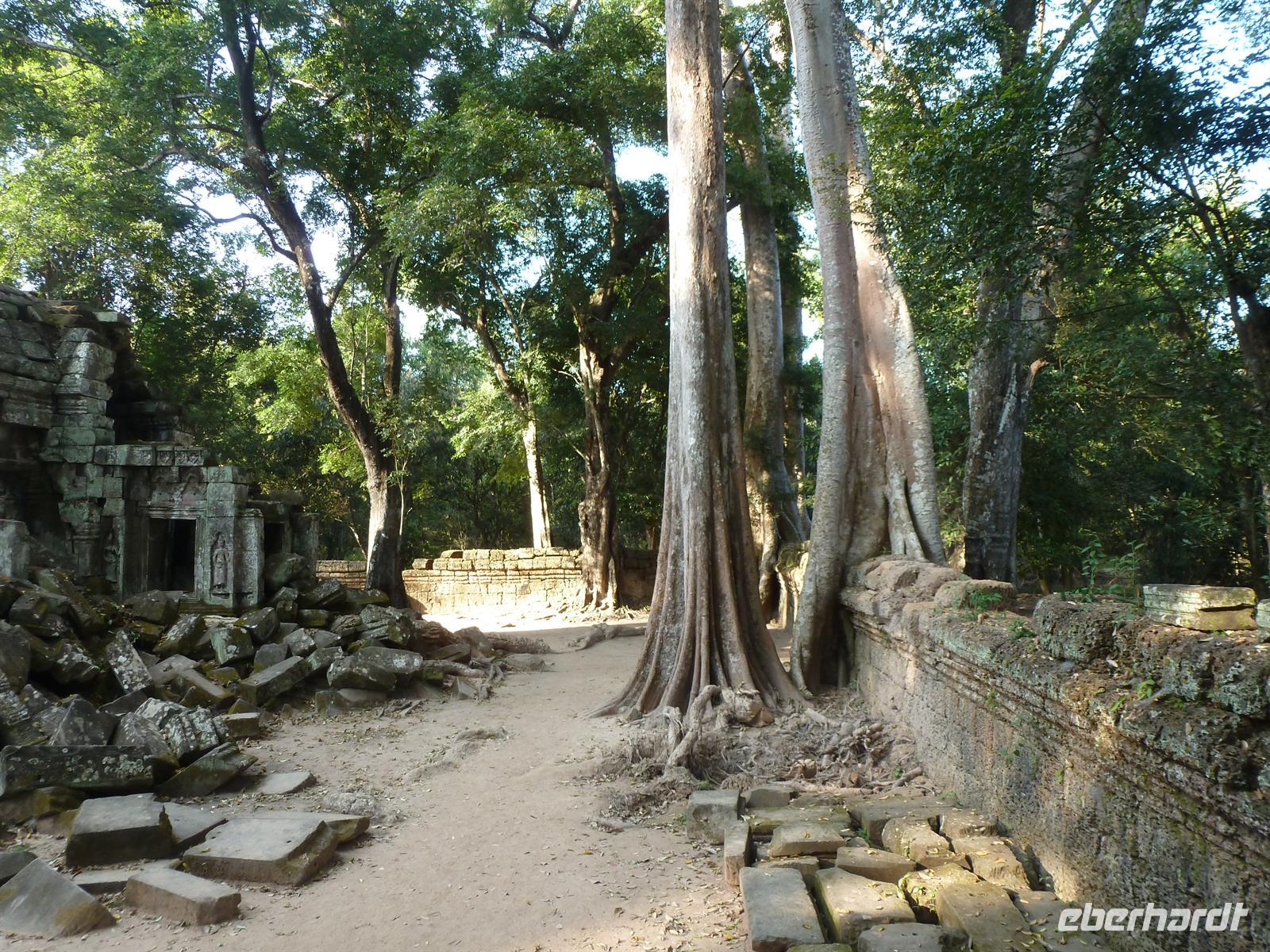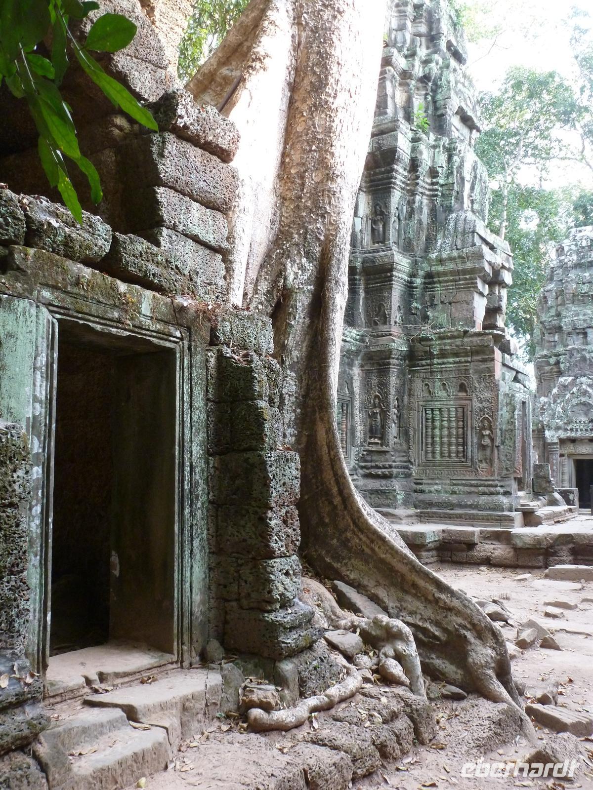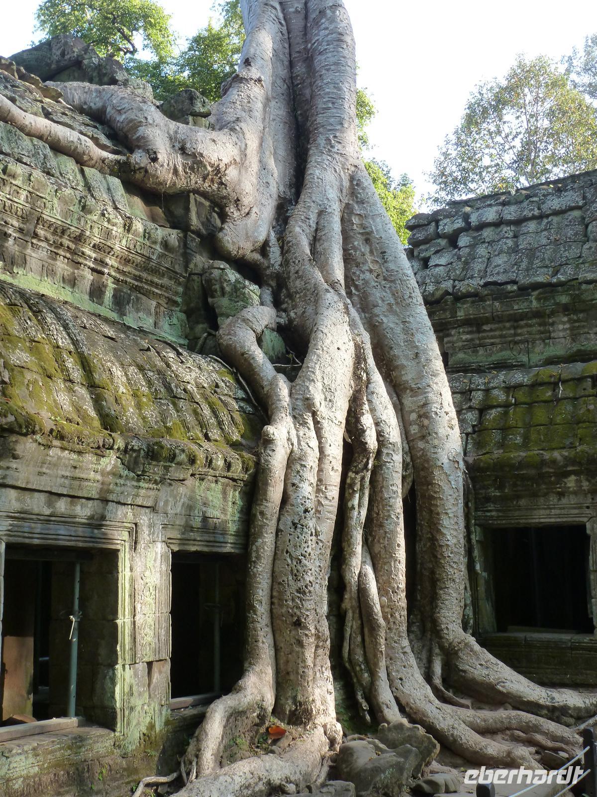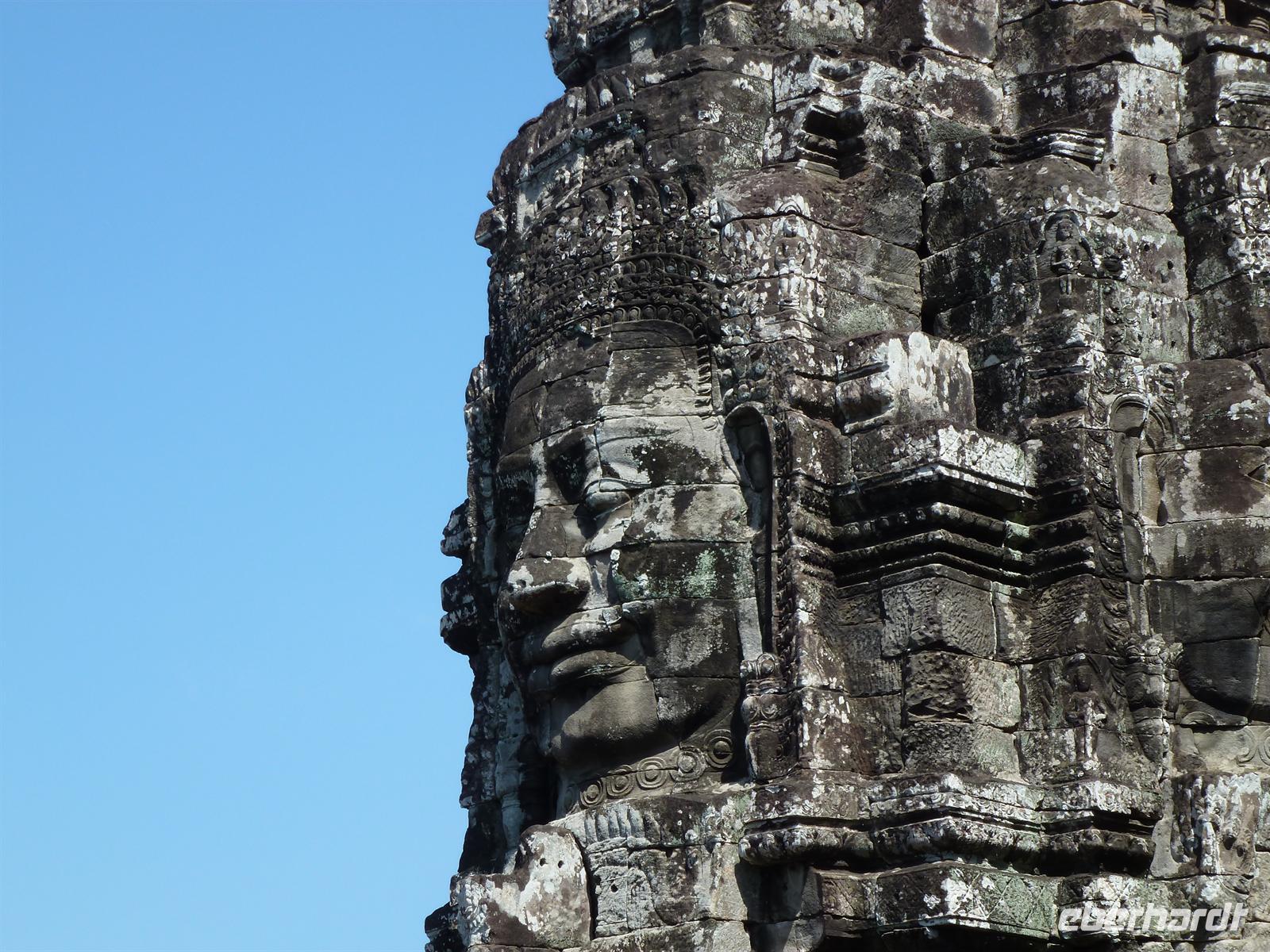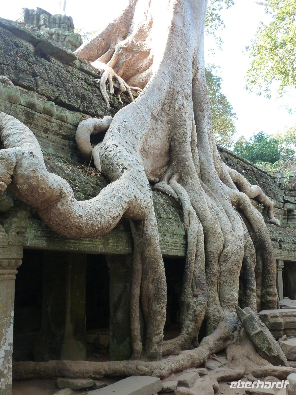 ehemals mächtigen Khmer-Reiches, was an manchen Stellen zu unangenehmen Warteschlangen führt. So auch beim Aufstieg in die dritte Ebene. Und da das mächtige Bauwerk leider nicht an allen Ecken und Ende vor der unbarmherzig brennenden Sonne schützt, wurde uns echtes Durchhaltevermögen und Standfestigkeit abverlangt. Lohn der Mühe war dafür der faszinierende Blick aus über fünfzig Meter Höhe auf die Ebene von Angkor. Trotz 35 Grad Hitze setzten wir tapfer unsere Fahrt durch die Tempelanlagen fort. Wir betraten den Komplex von Angkor Thom durch das Südtor und besichtigten den Bayon-Tempel, der sich in drei Ebenen achtundfünfzig Meter hoch über dem Erdboden erhebt. Von den ehemals neunundvierzig Türmen sind heute noch siebenunddreißig weitestgehend erhalten. Am markantesten sind die Prasate mit den Gesichtern von Lokeshvara, die in die vier Himmelsrichtungen schauen. Ein kurzer Spaziergang zur Elefantenterrasse und zur Terrasse des Lepra-Königs beschließt das vormittägliche Programm. Wir suchen Schatten in einem Freiluftrestaurant und lassen uns erst einmal kalte Getränke und eine Kleinigkeit zu Essen schmecken. Gut gestärkt und etwas erholt geht es zum letzten Tempel des heutigen Tages, den aus Kino und Werbung weltweit bekannten „Dschungeltempel“ Ta Prohm. Hier, wo sich die Baumriesen ihr natürliches Umfeld langsam zurückerobern und dabei durch den weichen Sandstein stoßen, kann man beeindruckende Bilder von den unfreiwilligen Symbiosen von Bäumen und Gebäuden fotografieren. Die Urgewalt des Dschungels, die alles verändernde Kraft der Natur gegenüber der Vergänglichkeit menschlicher Baukunst kommt nirgendwo so deutlich zum Ausdruck wie in dieser Anlage. Noch tief beeindruckt und fasziniert von diesen Bildern treten wir unsere Rückfahrt zum Hotel an. Obwohl alle ein wenig von der Hitze und der Weitläufigkeit der Anlagen geschafft sind, möchte niemand diese Erfahrungen und Erlebnisse missen. Und nach einer kalten Dusche und einem angenehmen Abendessen im Hotel reicht bei allen noch die Kraft, um bei einem Gläschen an der Lobby-Bar in Erinnerungen an die hinter uns liegenden Tage zu schwelgen und lustige Anekdoten nochmals Revue passieren zu lassen.