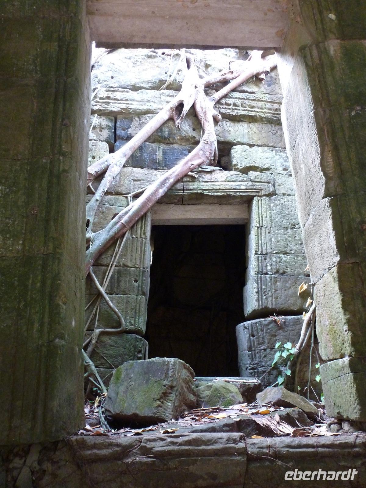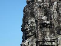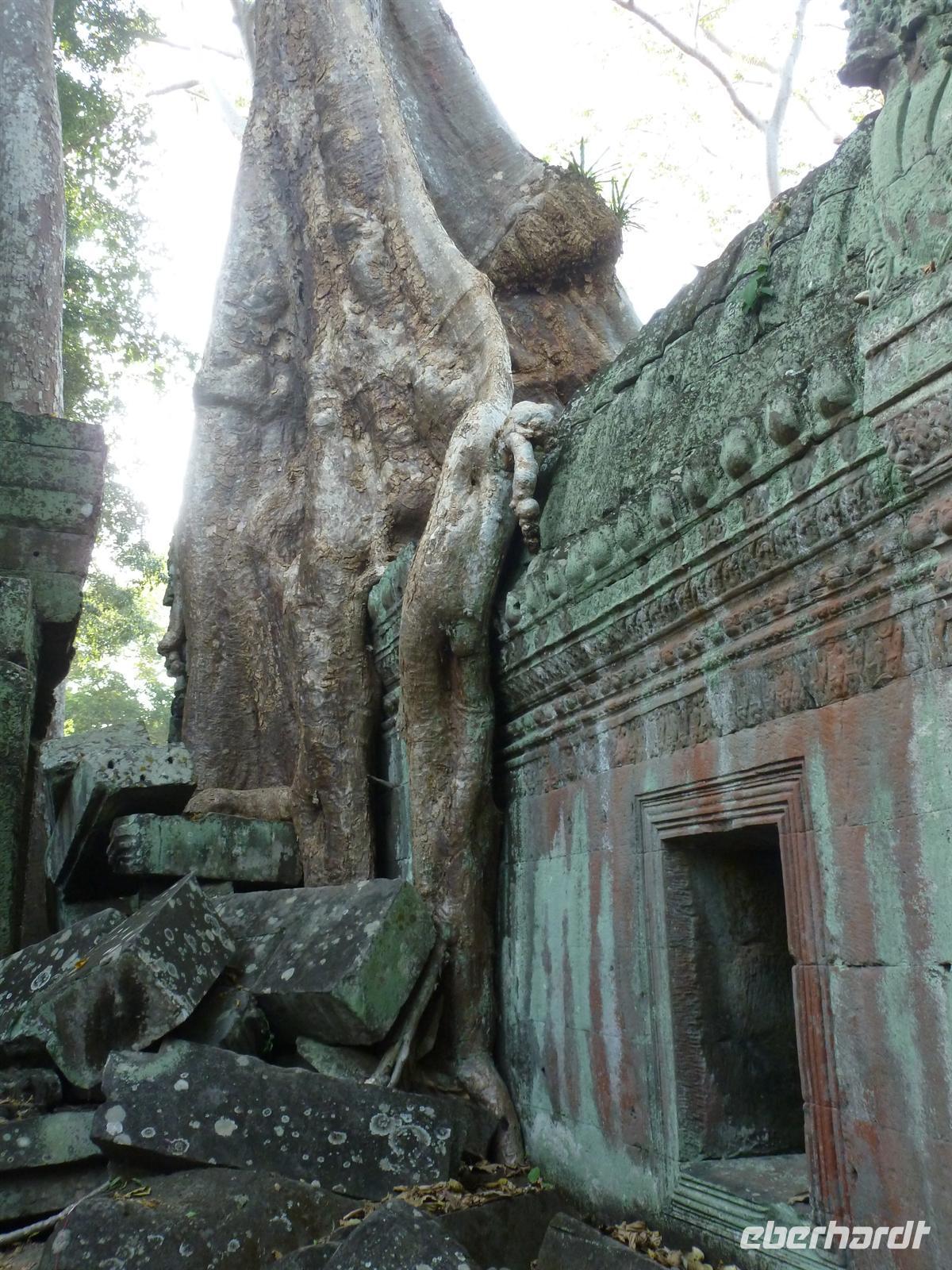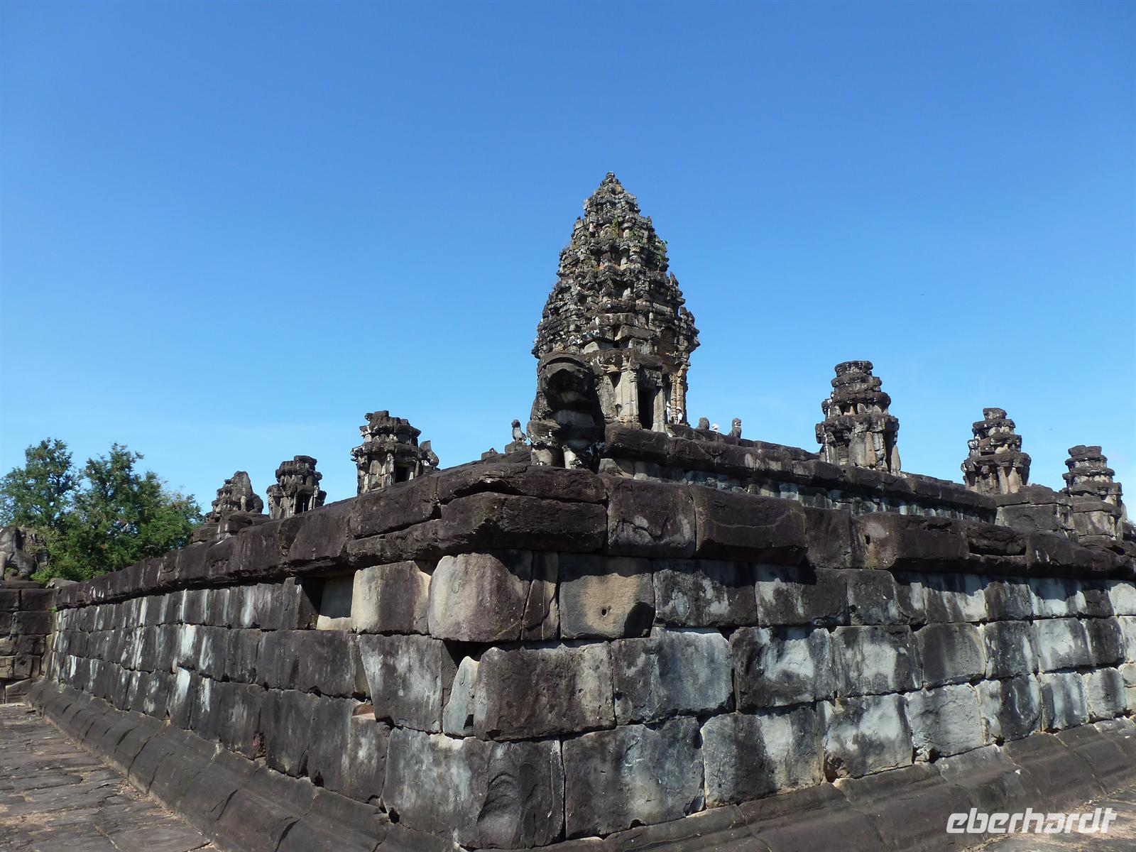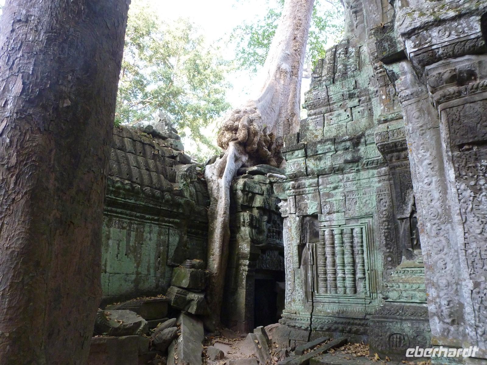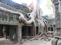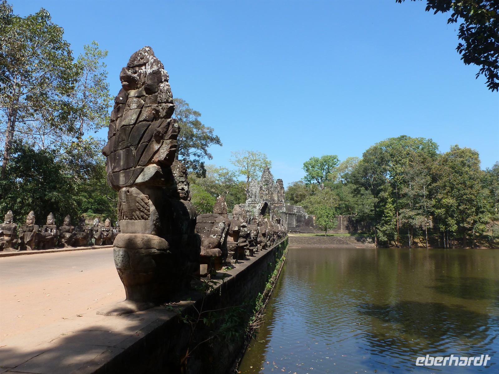 ehemals mächtigen Khmer-Reiches, was an manchen Stellen zu unangenehmen Warteschlangen führt. So auch beim Aufstieg in die dritte Ebene. Und da das mächtige Bauwerk leider nicht an allen Ecken und Ende vor der unbarmherzig brennenden Sonne schützt, wurde uns echtes Durchhaltevermögen und Standfestigkeit abverlangt. Lohn der Mühe war dafür der faszinierende Blick aus über fünfzig Meter Höhe auf die Ebene von Angkor. Trotz 35 Grad Hitze setzten wir tapfer unsere Fahrt durch die Tempelanlagen fort. Wir betraten den Komplex von Angkor Thom durch das Südtor und besichtigten den Bayon-Tempel, der sich in drei Ebenen achtundfünfzig Meter hoch über dem Erdboden erhebt. Von den ehemals neunundvierzig Türmen sind heute noch siebenunddreißig weitestgehend erhalten. Am markantesten sind die Prasate mit den Gesichtern von Lokeshvara, die in die vier Himmelsrichtungen schauen. Ein kurzer Spaziergang zur Elefantenterrasse und zur Terrasse des Lepra-Königs beschließt das vormittägliche Programm. Wir suchen Schatten in einem Freiluftrestaurant und lassen uns erst einmal kalte Getränke und eine Kleinigkeit zu Essen schmecken. Gut gestärkt und etwas erholt geht es zum letzten Tempel des heutigen Tages, den aus Kino und Werbung weltweit bekannten „Dschungeltempel“ Ta Prohm. Hier, wo sich die Baumriesen ihr natürliches Umfeld langsam zurückerobern und dabei durch den weichen Sandstein stoßen, kann man beeindruckende Bilder von den unfreiwilligen Symbiosen von Bäumen und Gebäuden fotografieren. Die Urgewalt des Dschungels, die alles verändernde Kraft der Natur gegenüber der Vergänglichkeit menschlicher Baukunst kommt nirgendwo so deutlich zum Ausdruck wie in dieser Anlage. Noch tief beeindruckt und fasziniert von diesen Bildern treten wir unsere Rückfahrt zum Hotel an. Obwohl alle ein wenig von der Hitze und der Weitläufigkeit der Anlagen geschafft sind, möchte niemand diese Erfahrungen und Erlebnisse missen. Und nach einer kalten Dusche und einem angenehmen Abendessen im Hotel reicht bei allen noch die Kraft, um bei einem Gläschen an der Lobby-Bar in Erinnerungen an die hinter uns liegenden Tage zu schwelgen und lustige Anekdoten nochmals Revue passieren zu lassen.