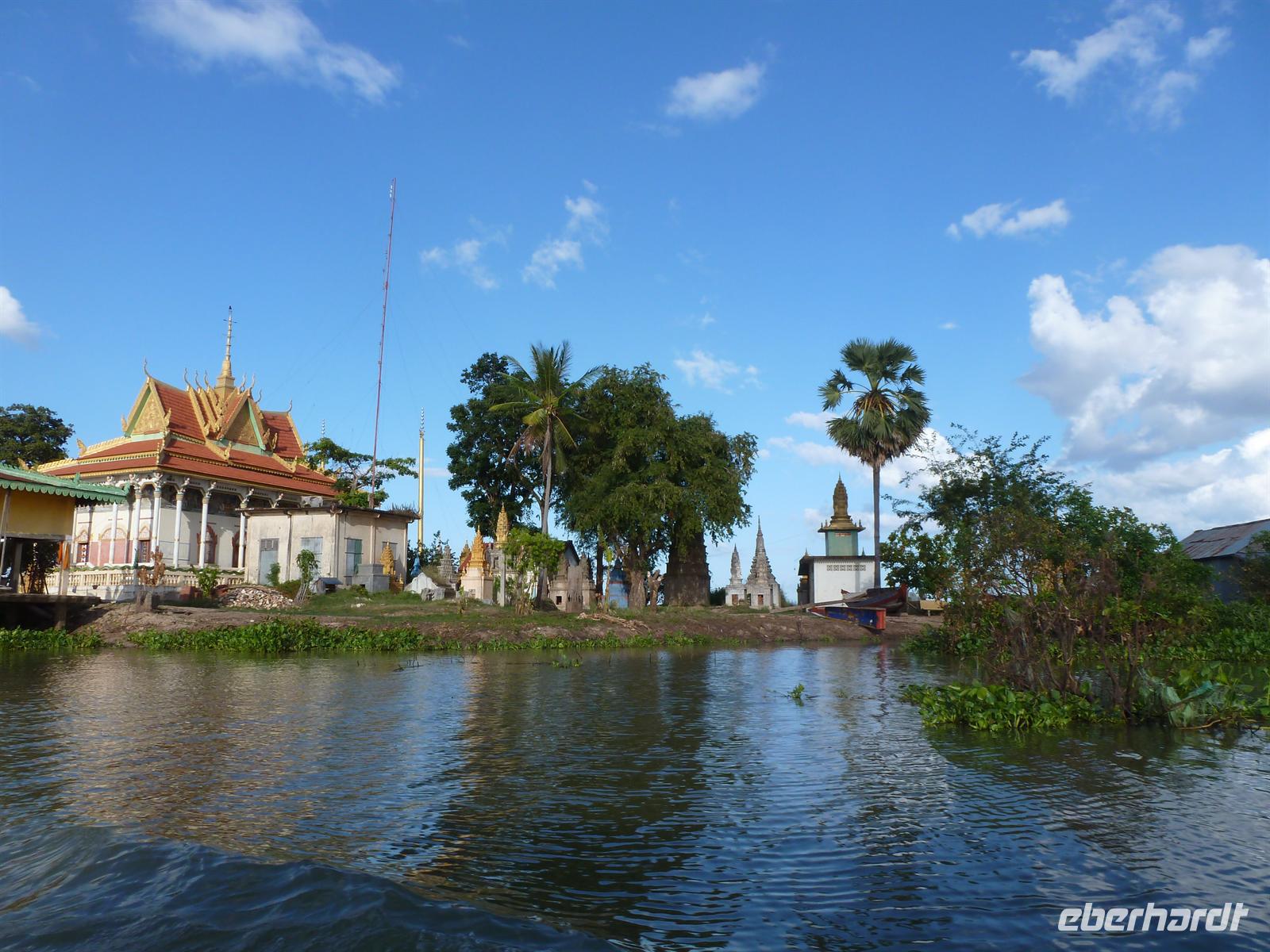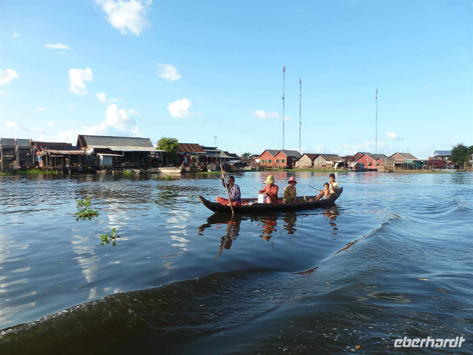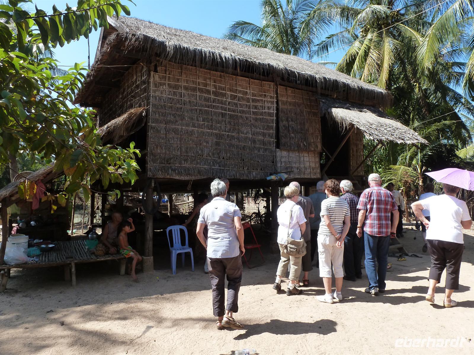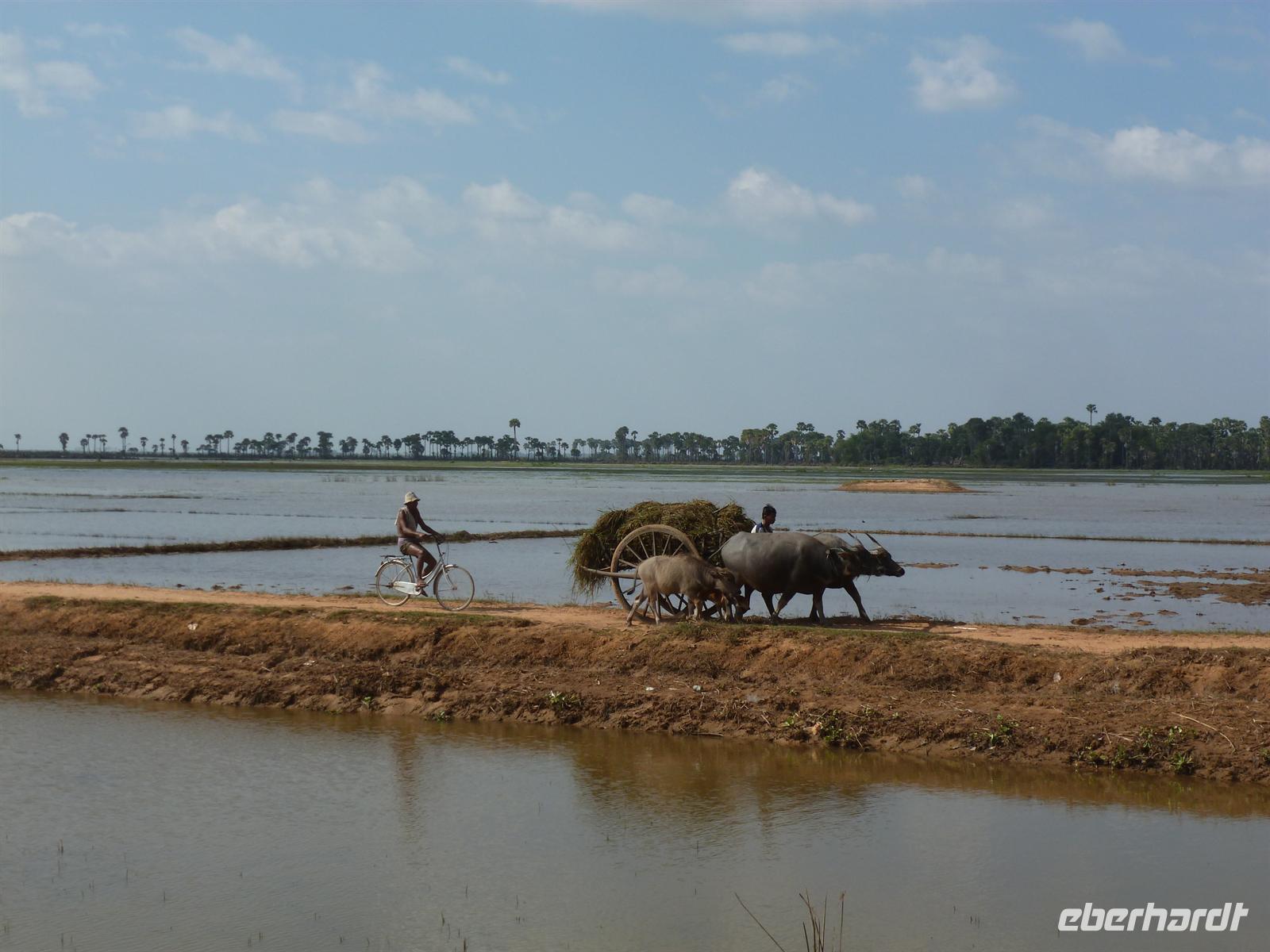von Siem Reap. Unser Reiseleiter Min Thol erklärte uns dabei die verschiedenen Baustile der Häuser und Pagoden anhand von Zeichnungen, wir bekommen Infos zur vielfältigen Nutzung von Wasserhyazinthen, u.a. zur Seilproduktion, als Wasserfilter und für medizinische Belange und erfahren, das man aus den Samen des Kapokbaumes Seife herstellen kann. Wir treffen Dorfbewohner und bekommen einen unmittelbaren Eindruck von den teilweise sehr schwierigen Lebensumständen, mit denen sich die überwiegend arme Landbevölkerung auseinandersetzen muss. Aber wir sehen trotz allem auch Hoffnung, Lebenslust und den Willen, dieses Leben gut zu meistern. Mit diesen Eindrücken fahren wir zurück in die Stadt und bereiten uns auf unseren bevorstehenden Abflug vor. Ein stärkendes, spätes Mittagessen, ein paar Gespräche über die Erlebnisse der vergangenen Wochen und schon war die Zeit herum und unser Bus brachte uns zum Flughafen. Entgegen unserem verpatzten Hinflug funktionierte dieses Mal alles einwandfrei und wir landeten pünktlich, aber etwas müde am frühen Samstagmorgen wieder in der Heimat. Damit ging eine erlebnisreiche, wunderschöne Reise durch zwei faszinierende Länder der Indochinesischen Halbinsel zu Ende.