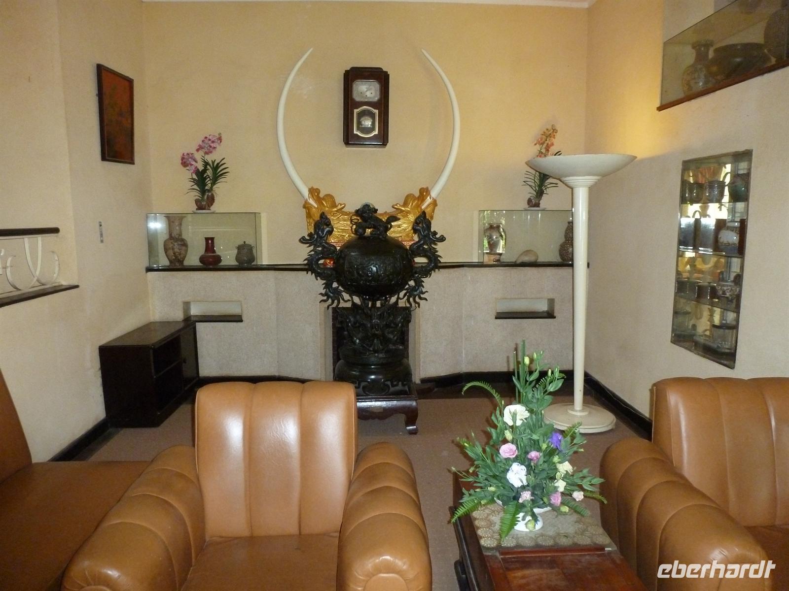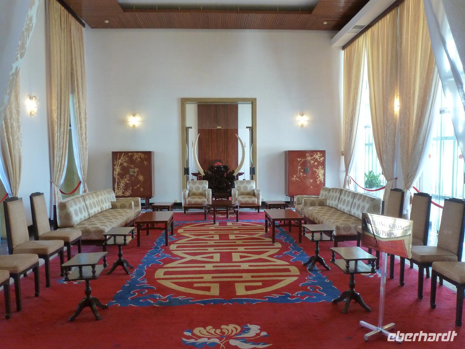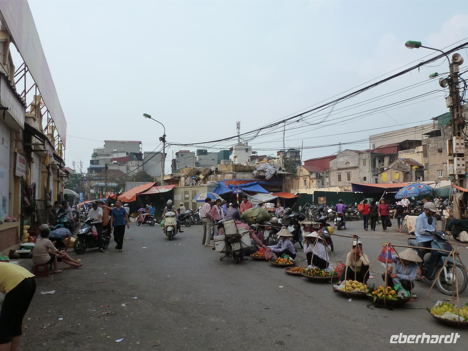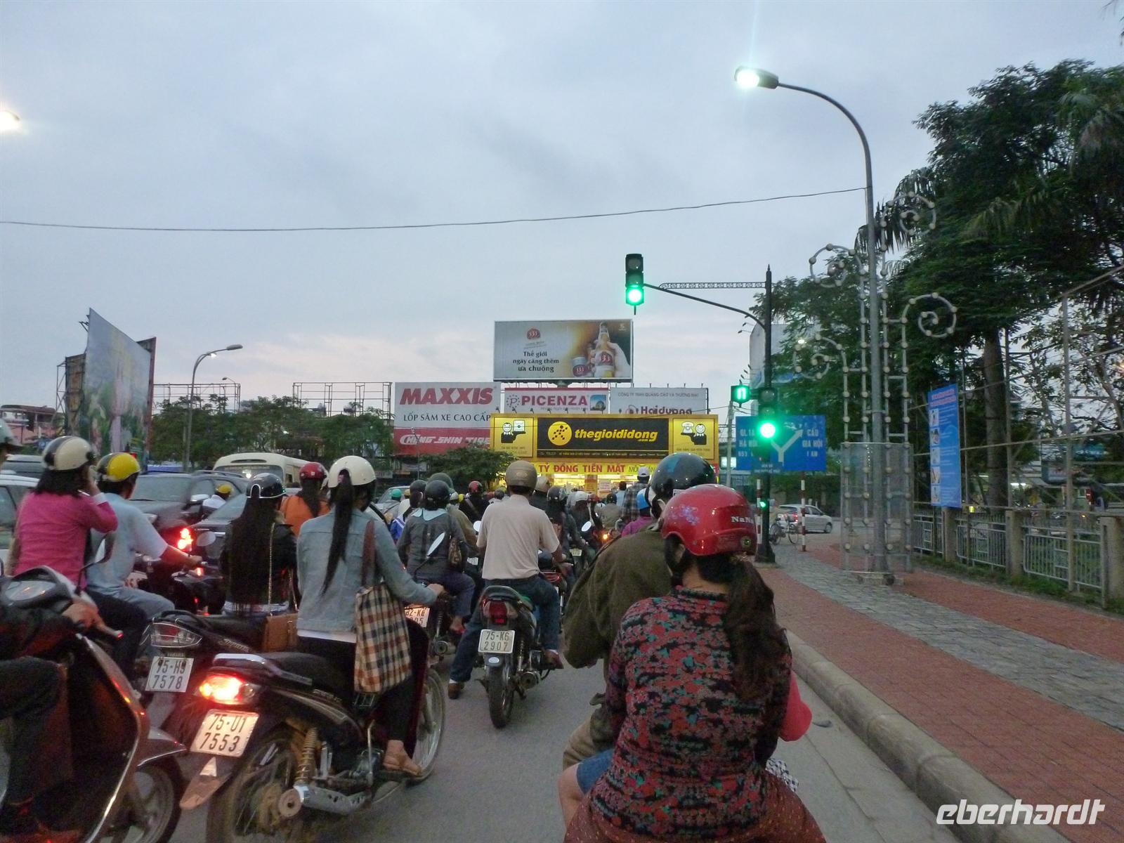 Wohlwissend, dass sich mit uns weitere dreihundert Passagiere an den Transfer- und Transit-Countern drängeln werden, um einen einigermaßen zeitnahen Anschlussflug zu erhalten, begaben wir uns auf dem schnellsten Weg zum Transit-Counter der Thai, wo uns ein Weiterflug um 17.35 Uhr angeboten wurde, was weitere 12 Stunden Wartezeit bedeutet hätte. Völlig unmöglich! Nachdem wir die freundliche Dame von Thai-Airways auf die in Kürze startende 07.50 Uhr Maschine hingewiesen hatten, stellte sie ohne Diskussionen die entsprechenden Bordkarten aus, was für uns insofern eine große Erleichterung bedeutete, da wir nun noch den größten Teil unseres Programmes in Hanoi an diesem Tage absolvieren konnten. Nach der Landung und einer kurzen Passkontrolle fiel uns ein weiterer Stein vom Herzen, denn auch unsere Koffer hatten, trotz diverser Umsortierungen auf dem langen Weg von Deutschland nach Vietnam, den Flieger an der richtigen Stelle verlassen. Unser vietnamesischer Reiseleiter, Herr Ot, erwartete uns schon am Ausgang und begrüßte uns herzlich nach durchstandener Odyssee. Wir fuhren anschließend zu unserem Hotel im Zentrum von Hanoi, um uns wenigstens etwas frisch zu machen von den Anstrengungen der letzten 24 Stunden, bevor wir mit unseren Erkundungen der vietnamesischen Hauptstadt begannen. Nachdem wir zwei weitere Mitglieder unserer kleinen Gruppe begrüßt hatten, die schon gestern aus Myanmar kommend in Hanoi gelandet waren, stürzten wir uns in das Getümmel und Gewimmel der 6-Millionen-Metropole am Roten Fluss. Die ersten Stationen unserer Besichtigungstour waren das Ho-Chi-Minh-Mausoleum und die berühmte Ein-Säulen-Pagode aus dem 11. Jahrhundert, eines der Wahrzeichen Hanois. Leider konnten wir das Wohnhaus des vietnamesischen Staatsgründers und den ehemaligen Präsidentenpalast nicht besuchen, da diese wegen einer Staatsdelegation für die Öffentlichkeit nicht zugänglich waren.