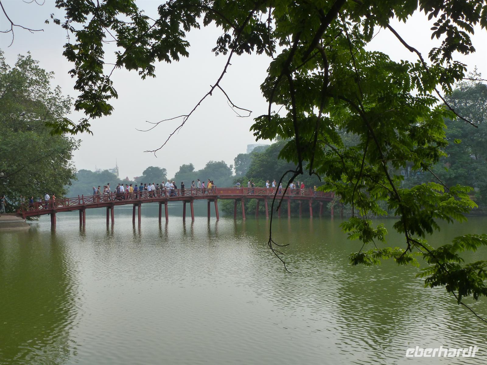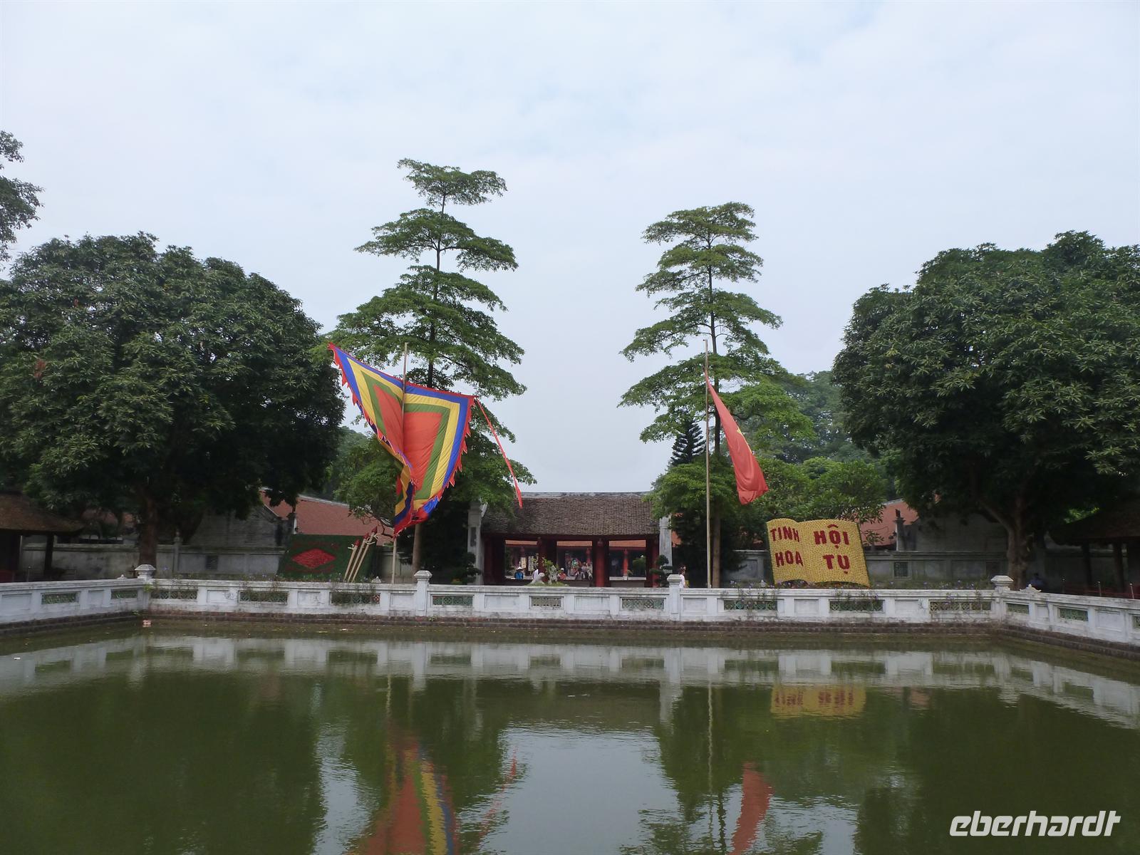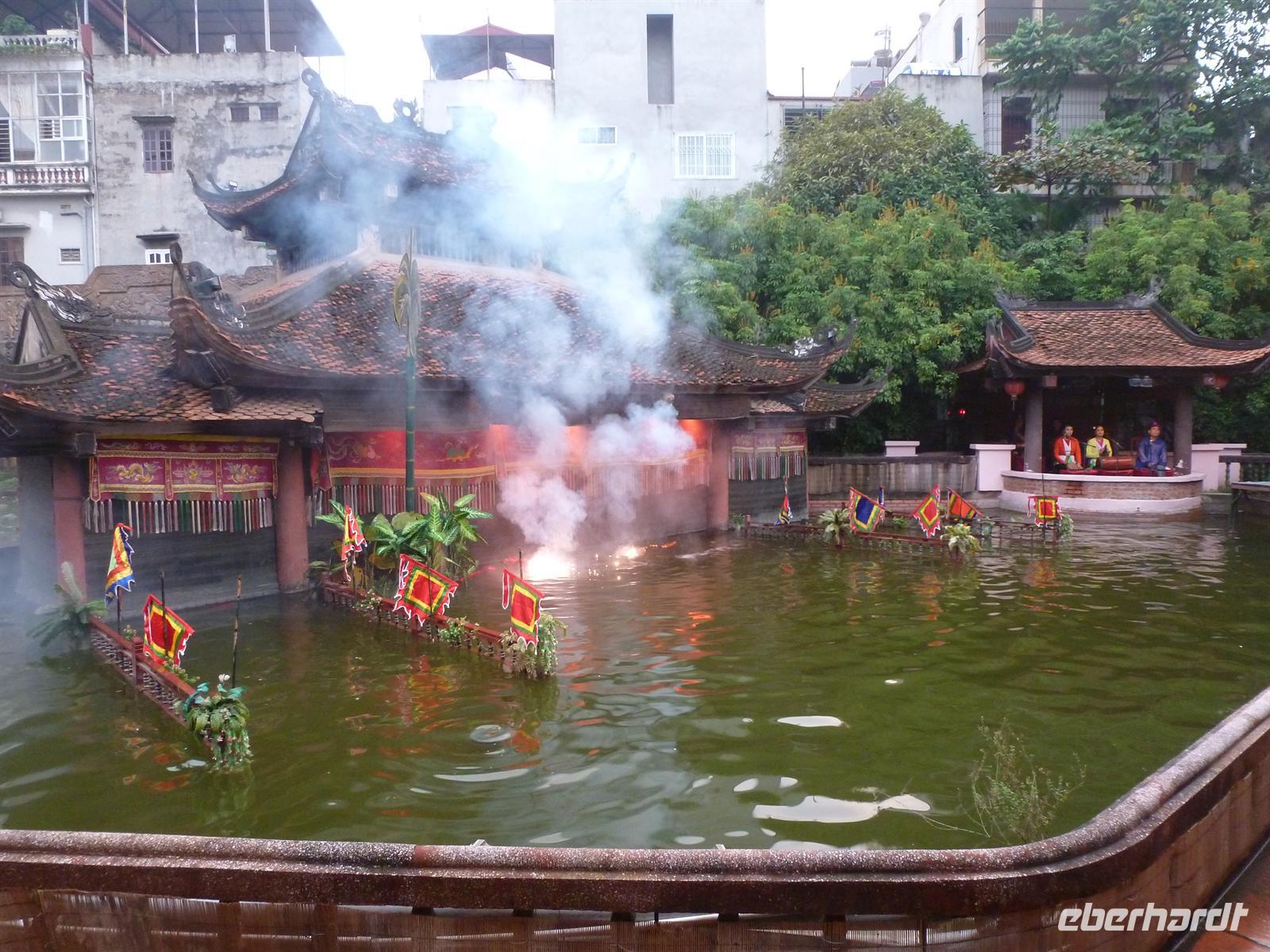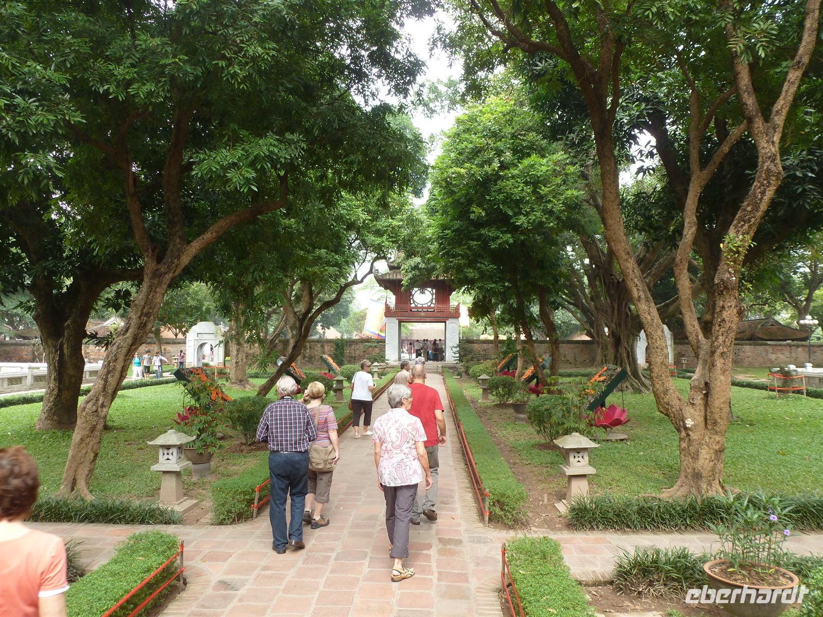 Deshalb fuhren wir weiter zum konfuzianischen Literaturtempel Van Mieu, in dem zu früheren Zeiten die Staatsbeamten ausgebildet wurden. Am Westsee besichtigten wir anschließend Tran Quoc, Hanois älteste Pagode, bevor wir uns in das chaotisch-lärmende, alle fünf Sinne betäubende, den meisten Regeln widersprechende und doch am Ende gut funktionierende Gewühl der Altstadtgassen wagten. Für alle asiatischen „Ersttäter“ der Kulturschock schlechthin, für Kenner und Liebhaber der pulsierende Atem einer völlig anders strukturierten Lebensweise. Dem scheinbaren Chaos entronnen, genossen wir den Besuch des friedlich im Hoan-Kiem-See gelegenen Jadeberg-Tempels, bevor es uns wieder auf die Straßen des Mopedmolochs Hanoi verschlug, um zu einer Aufführung des berühmten Wasserpuppen-Theaters zu fahren. Inmitten des Großstadtdschungels erwartete uns fast eine Oase der Ruhe, eingerahmt von der wunderbaren Kunst und Musik der Puppenspieler. Ein schönes, achtgängiges Abendessen in einem kleinen Gartenrestaurant rundete unseren ersten Tag auf vietnamesischen Boden ab, bevor wir alle ziemlich müde und voller neuer Eindrücke ins Bett gingen.