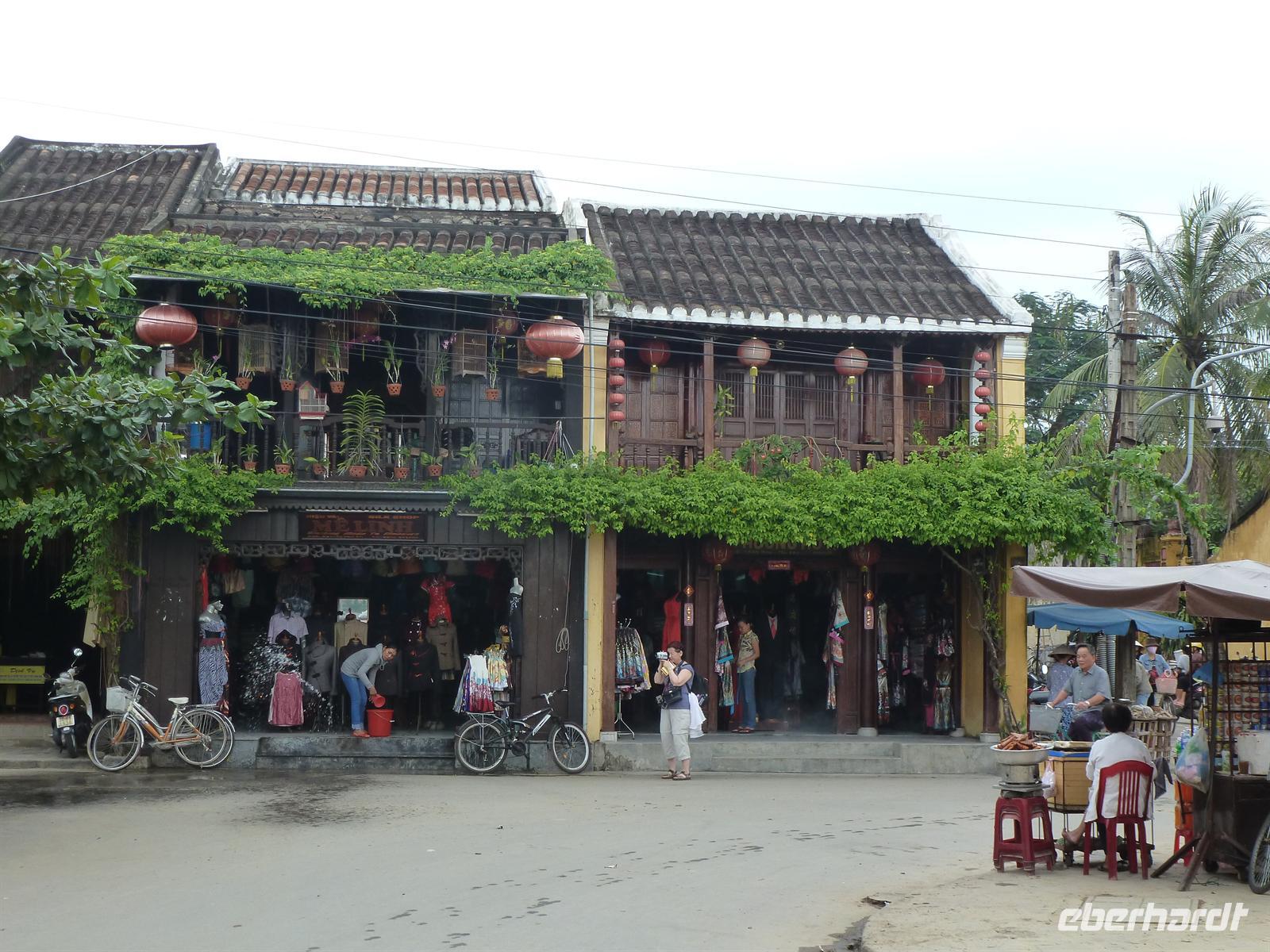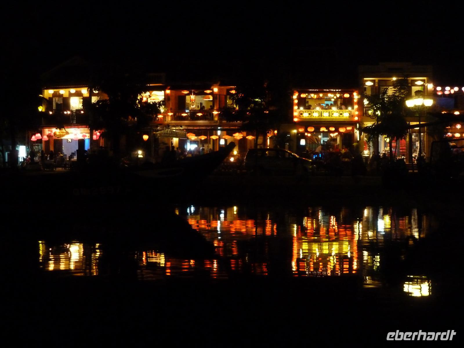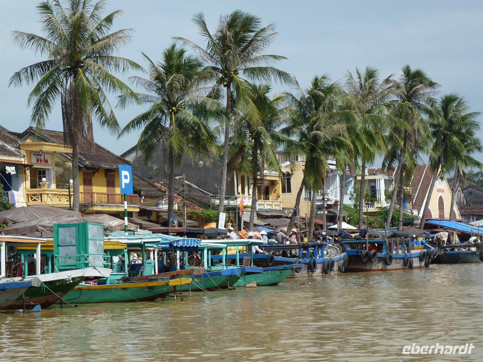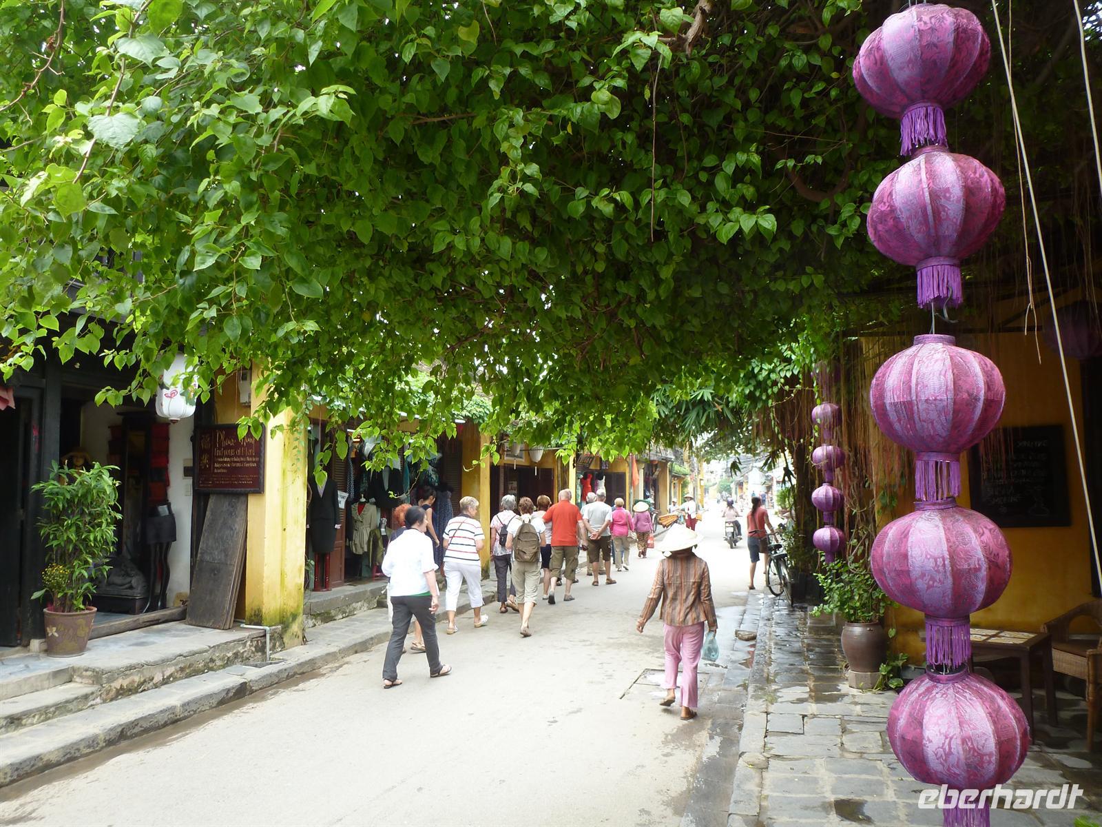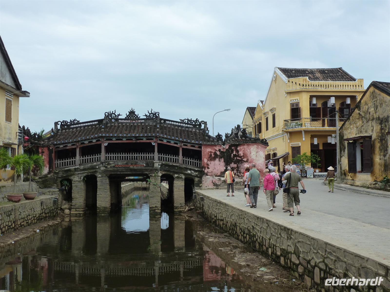 Gemüse, Kräutern und allerlei weiteren Dingen, die man im und zum Leben so braucht. Die ungewohnten Düfte aus den Garküchen stehen im Widerstreit mit den für unsere europäischen Nasen eher schwierigen, durchdringenden Gerüchen der Fischstände, die etwas nasale Gleichgültigkeit und Abhärtung von uns verlangen. Wir ziehen uns zurück und besichtigen die Versammlungshalle der Chinesen aus Fujian, die ihren Ursprung im 17. Jahrhundert haben soll und einst der größten und einflussreichsten Gruppe chinesischer Bürger in Hoi An gehörte. Im Anschluss betreten wir eines der ältesten Häuser der Stadt, welches mittlerweile in der achten Generation bewohnt wird und einen charakteristischen Einblick in die Wohnkultur des alten Hoi An bietet. Weiter führt uns unser Weg zur japanischen Brücke, welche einst das chinesische mit dem japanischen Stadtviertel verband und heute wichtigstes Fotomotiv bei allen Hoi An-Besuchern ist. Nachdem wir eine Manufaktur für Seidenstickereien besucht haben, begaben wir uns zum kleinen Hafen, um an Bord eines abenteuerlichen Holzbootes den Thu Bon Fluss entlang zum Töpferdorf Thanh Ha zu fahren. Wir bekamen ein paar Einblicke in die mittelalterlich anmutende, weil mit einfachsten Mitteln produzierte Handwerkskunst. Zurück in Hoi An nutzten wir den Nachmittag für einen Bummel durch die Gassen der Altstadt oder für ein erfrischendes Bad im Hotel-Pool. Unser heutiges Abendessen nahmen wir in einem schönen Restaurant am Rande der Stadt, gelegen inmitten eines von zahlreichen bunten Seidenlampions beleuchteten tropischen Gartens ein. Den Abschluss unseres Tages bildete ein kleiner Bummel durch die schön illuminierte Altstadt bzw. ein erfrischender Drink an der hoteleigenen Poolbar.