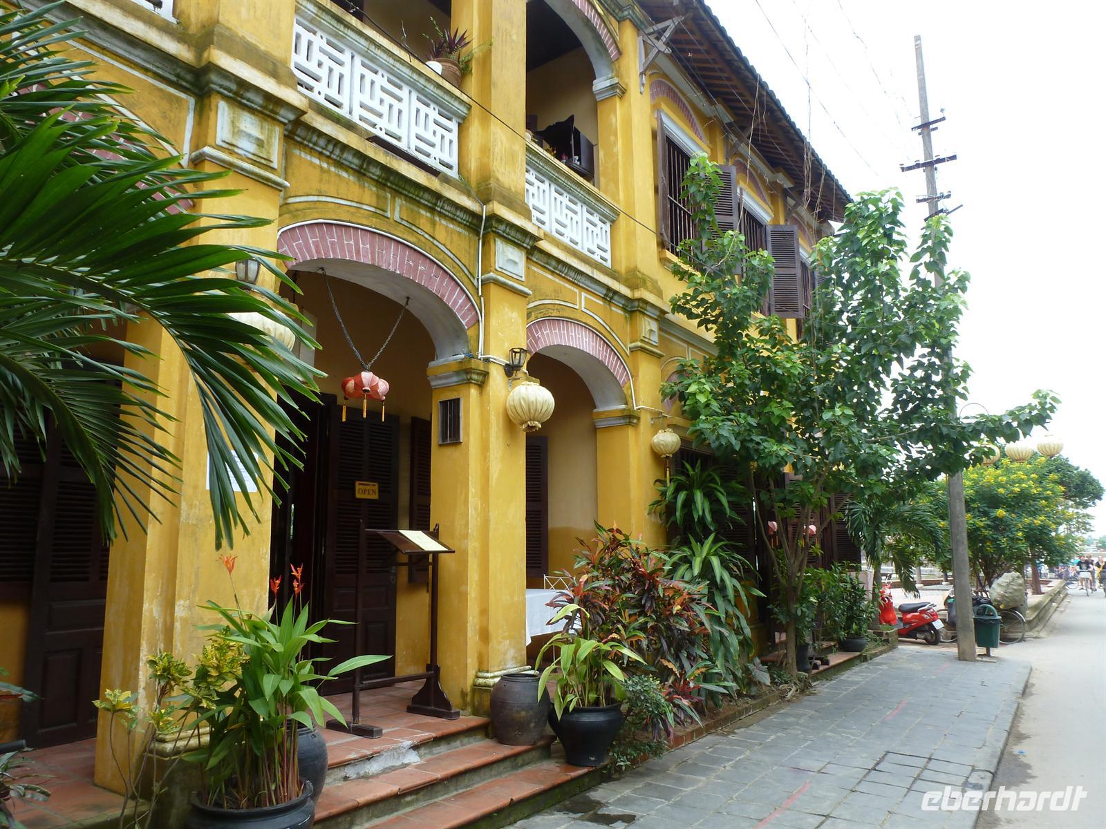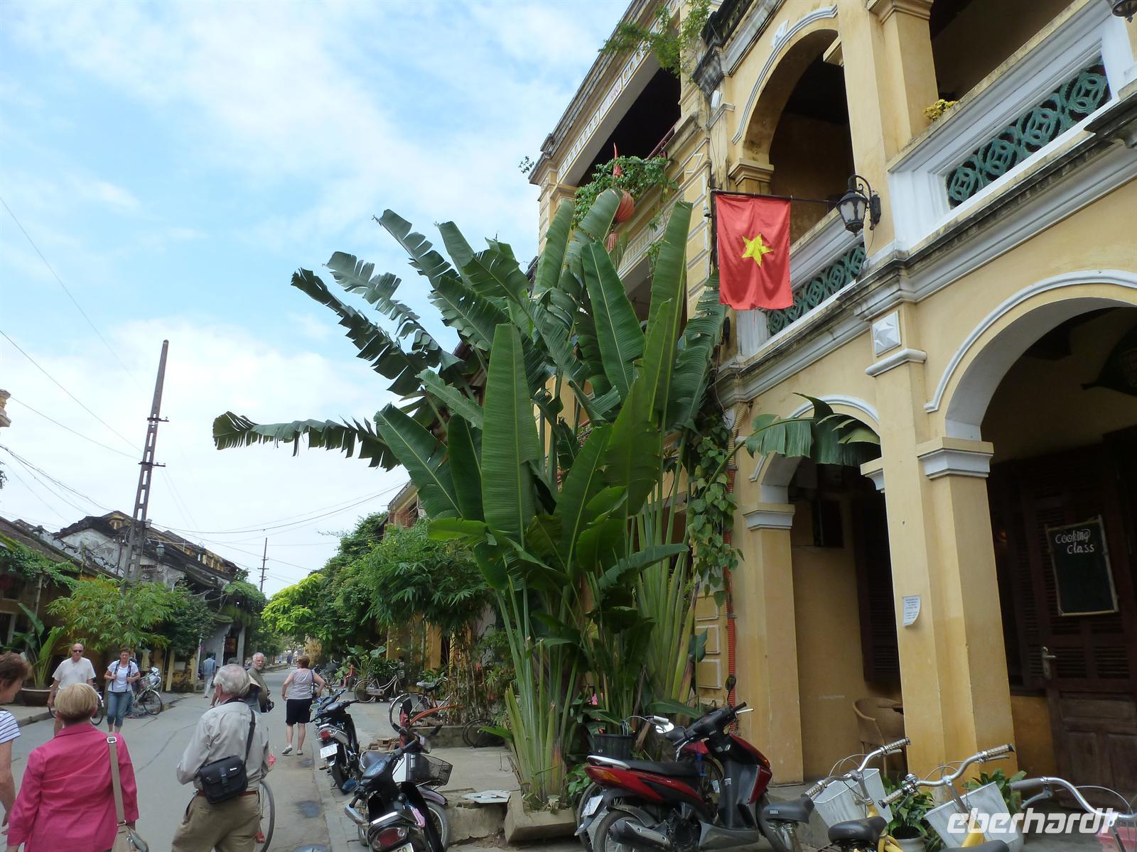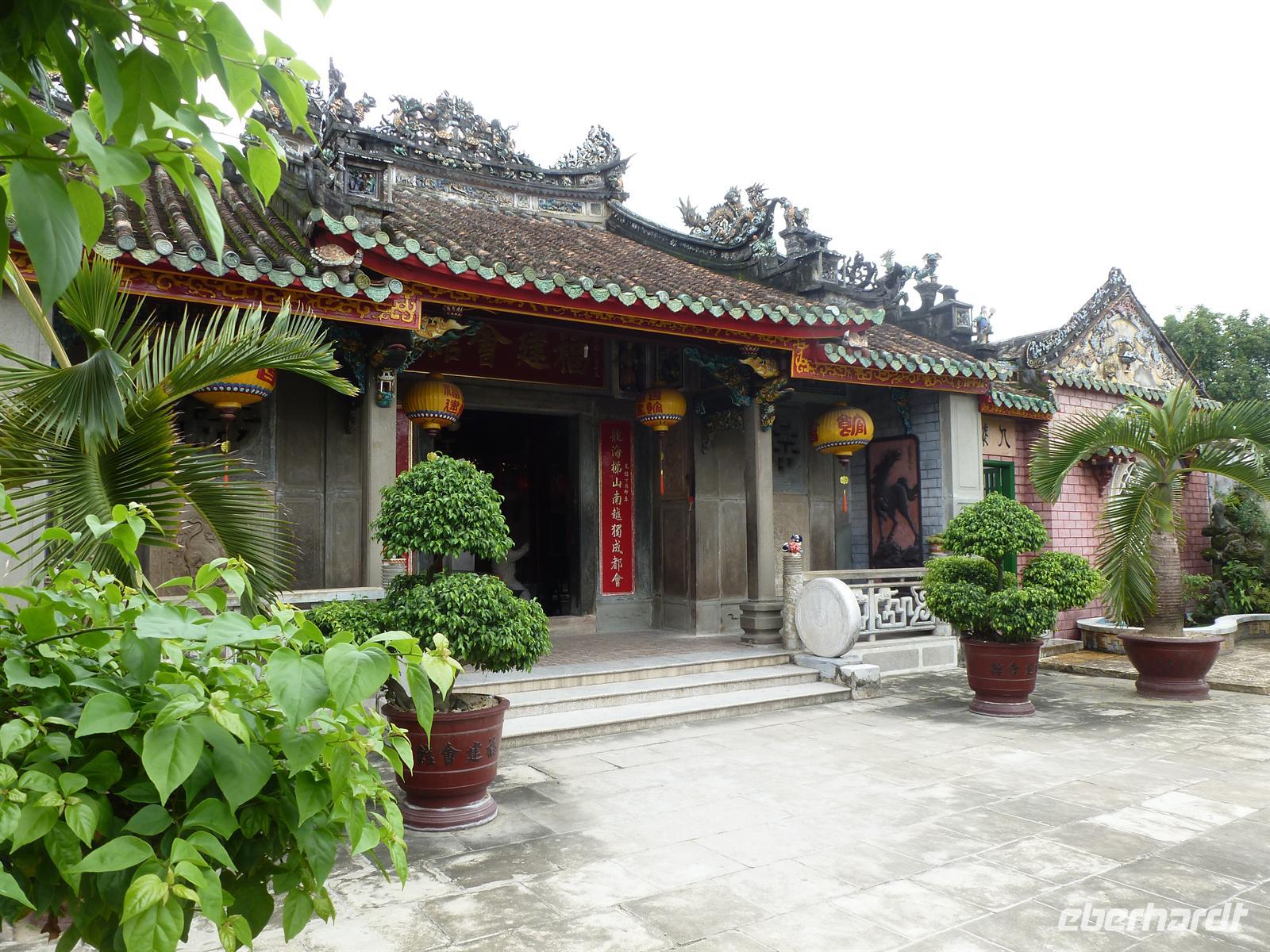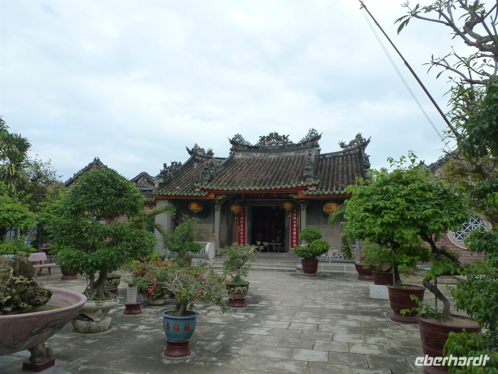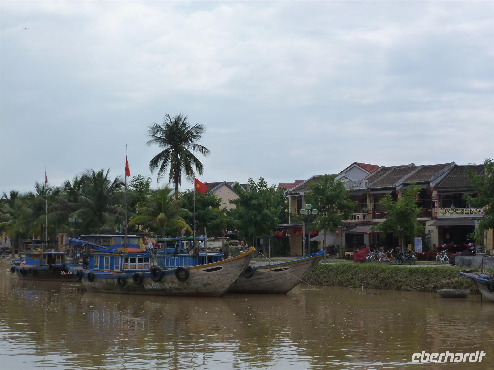 Gemüse, Kräutern und allerlei weiteren Dingen, die man im und zum Leben so braucht. Die ungewohnten Düfte aus den Garküchen stehen im Widerstreit mit den für unsere europäischen Nasen eher schwierigen, durchdringenden Gerüchen der Fischstände, die etwas nasale Gleichgültigkeit und Abhärtung von uns verlangen. Wir ziehen uns zurück und besichtigen die Versammlungshalle der Chinesen aus Fujian, die ihren Ursprung im 17. Jahrhundert haben soll und einst der größten und einflussreichsten Gruppe chinesischer Bürger in Hoi An gehörte. Im Anschluss betreten wir eines der ältesten Häuser der Stadt, welches mittlerweile in der achten Generation bewohnt wird und einen charakteristischen Einblick in die Wohnkultur des alten Hoi An bietet. Weiter führt uns unser Weg zur japanischen Brücke, welche einst das chinesische mit dem japanischen Stadtviertel verband und heute wichtigstes Fotomotiv bei allen Hoi An-Besuchern ist. Nachdem wir eine Manufaktur für Seidenstickereien besucht haben, begaben wir uns zum kleinen Hafen, um an Bord eines abenteuerlichen Holzbootes den Thu Bon Fluss entlang zum Töpferdorf Thanh Ha zu fahren. Wir bekamen ein paar Einblicke in die mittelalterlich anmutende, weil mit einfachsten Mitteln produzierte Handwerkskunst. Zurück in Hoi An nutzten wir den Nachmittag für einen Bummel durch die Gassen der Altstadt oder für ein erfrischendes Bad im Hotel-Pool. Unser heutiges Abendessen nahmen wir in einem schönen Restaurant am Rande der Stadt, gelegen inmitten eines von zahlreichen bunten Seidenlampions beleuchteten tropischen Gartens ein. Den Abschluss unseres Tages bildete ein kleiner Bummel durch die schön illuminierte Altstadt bzw. ein erfrischender Drink an der hoteleigenen Poolbar.