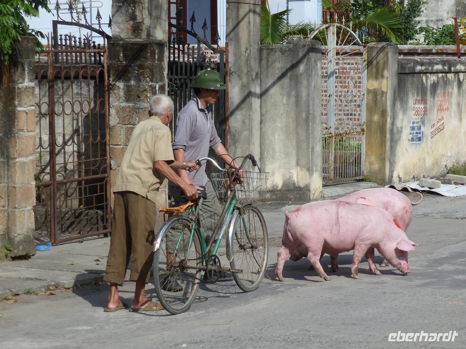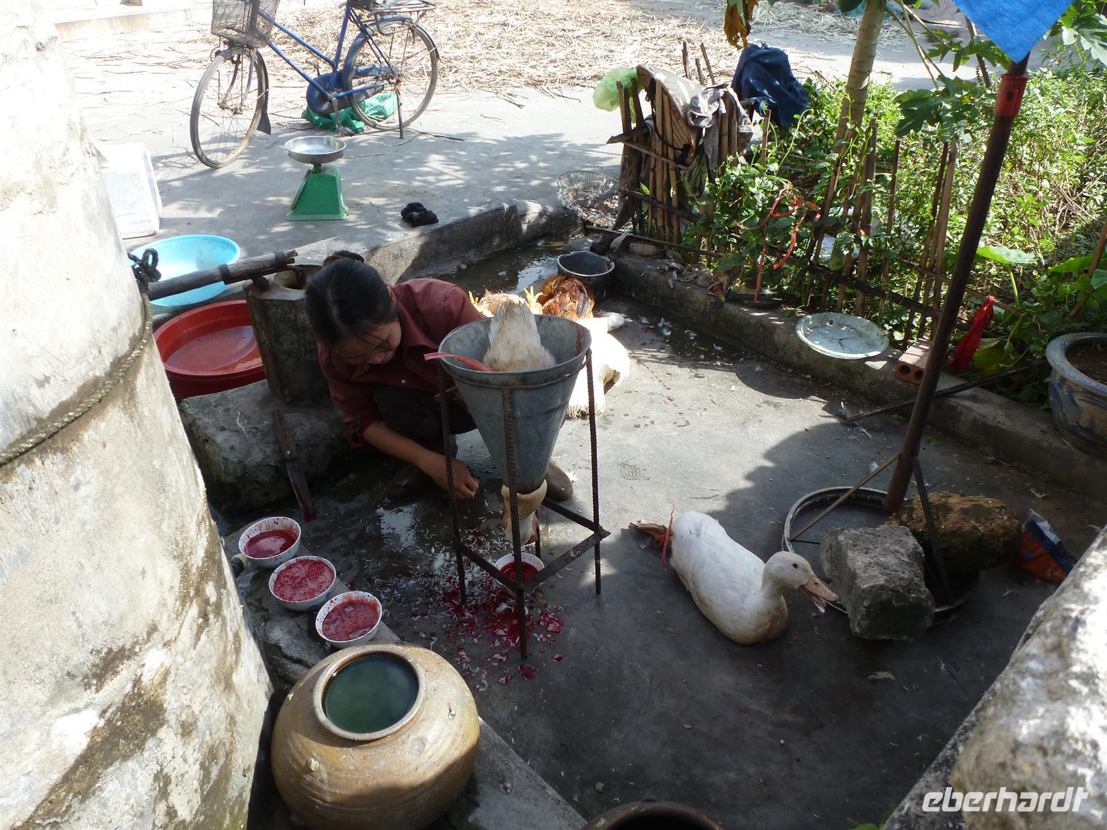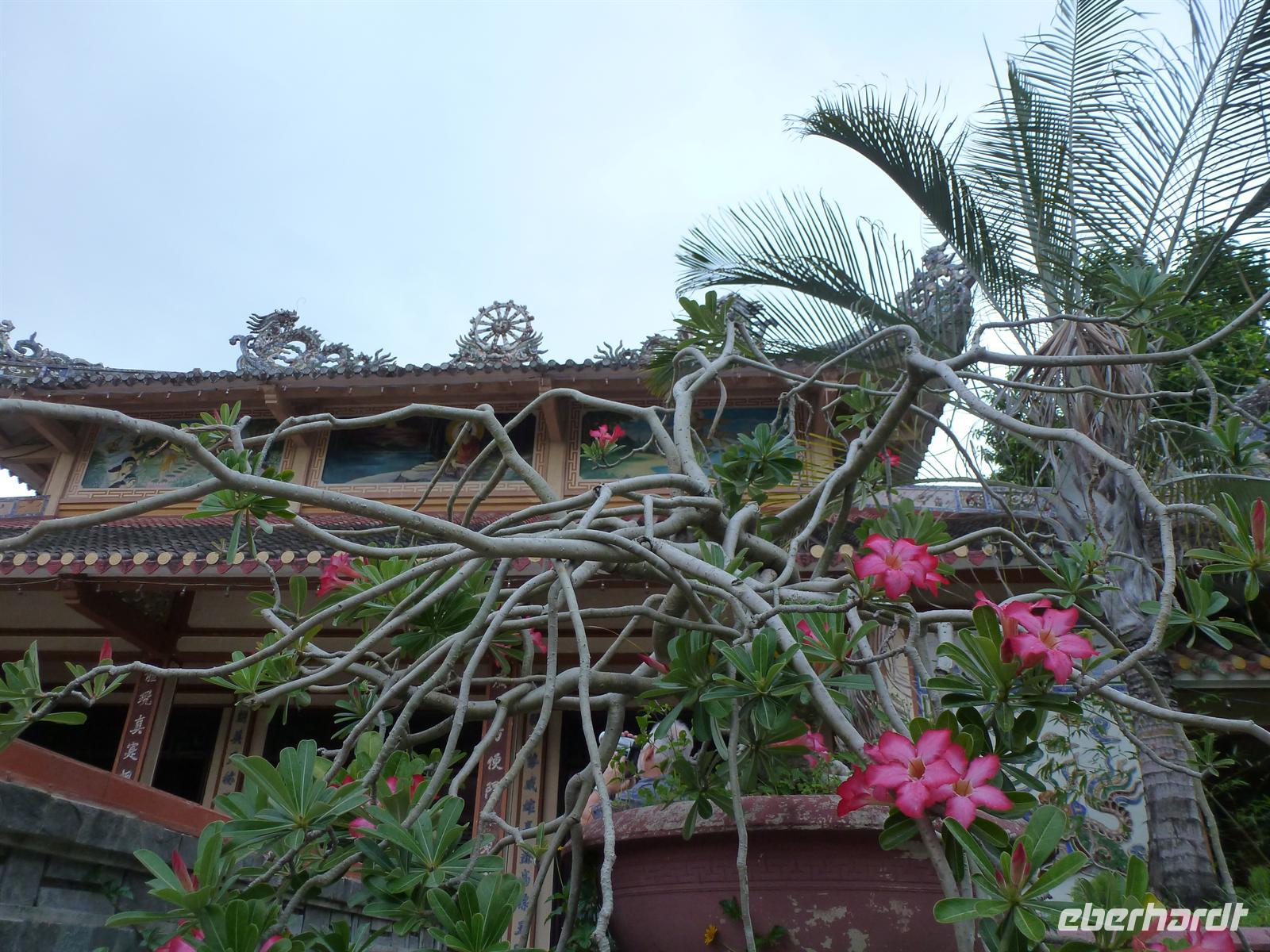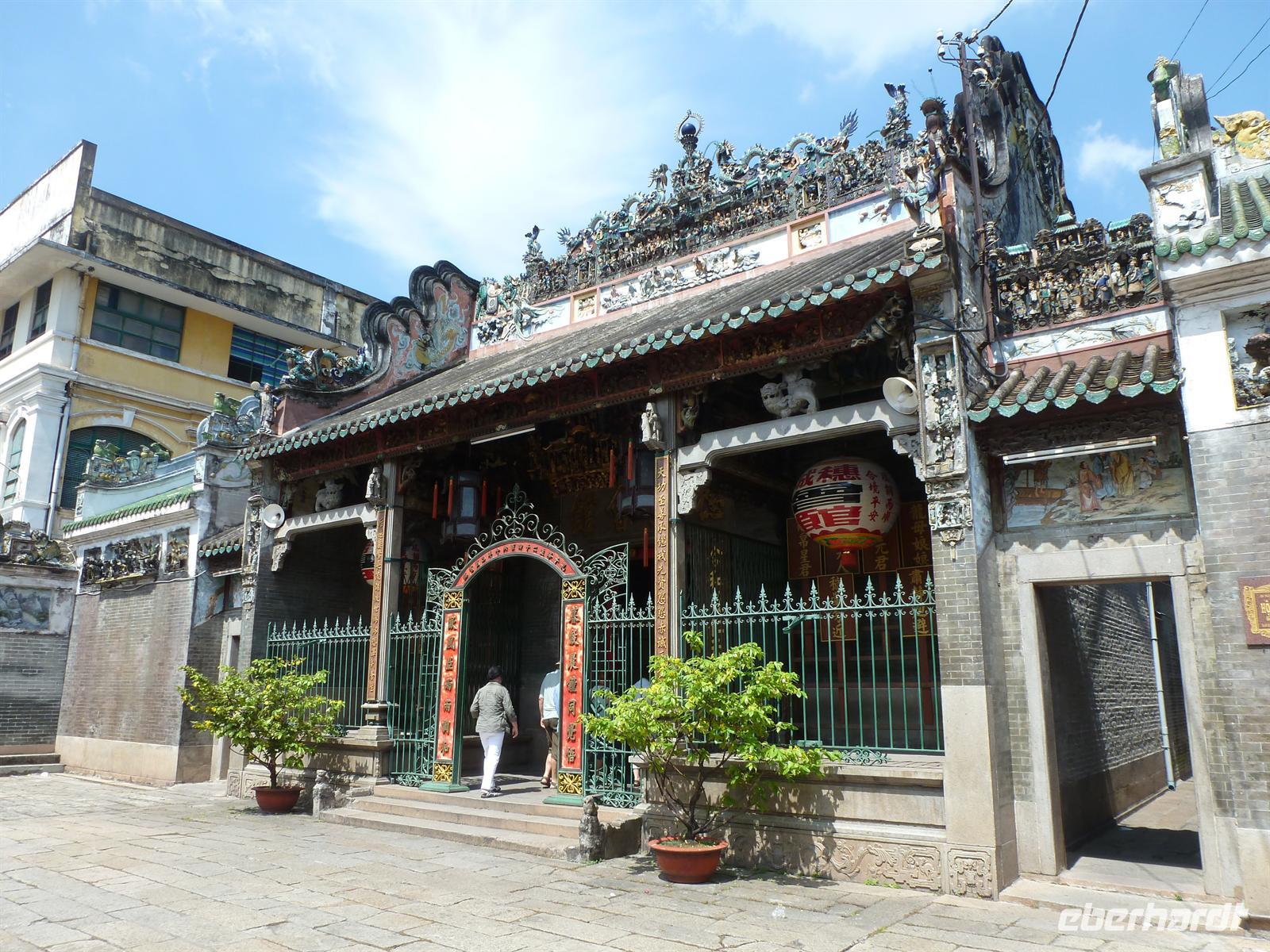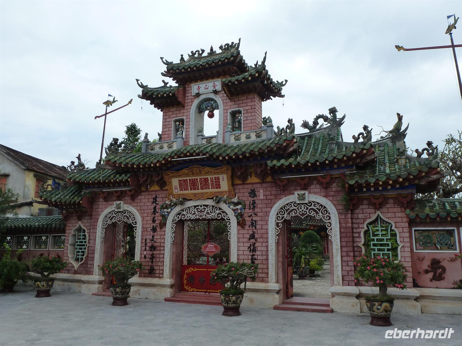 Gemüse, Kräutern und allerlei weiteren Dingen, die man im und zum Leben so braucht. Die ungewohnten Düfte aus den Garküchen stehen im Widerstreit mit den für unsere europäischen Nasen eher schwierigen, durchdringenden Gerüchen der Fischstände, die etwas nasale Gleichgültigkeit und Abhärtung von uns verlangen. Wir ziehen uns zurück und besichtigen die Versammlungshalle der Chinesen aus Fujian, die ihren Ursprung im 17. Jahrhundert haben soll und einst der größten und einflussreichsten Gruppe chinesischer Bürger in Hoi An gehörte. Im Anschluss betreten wir eines der ältesten Häuser der Stadt, welches mittlerweile in der achten Generation bewohnt wird und einen charakteristischen Einblick in die Wohnkultur des alten Hoi An bietet. Weiter führt uns unser Weg zur japanischen Brücke, welche einst das chinesische mit dem japanischen Stadtviertel verband und heute wichtigstes Fotomotiv bei allen Hoi An-Besuchern ist. Nachdem wir eine Manufaktur für Seidenstickereien besucht haben, begaben wir uns zum kleinen Hafen, um an Bord eines abenteuerlichen Holzbootes den Thu Bon Fluss entlang zum Töpferdorf Thanh Ha zu fahren. Wir bekamen ein paar Einblicke in die mittelalterlich anmutende, weil mit einfachsten Mitteln produzierte Handwerkskunst. Zurück in Hoi An nutzten wir den Nachmittag für einen Bummel durch die Gassen der Altstadt oder für ein erfrischendes Bad im Hotel-Pool. Unser heutiges Abendessen nahmen wir in einem schönen Restaurant am Rande der Stadt, gelegen inmitten eines von zahlreichen bunten Seidenlampions beleuchteten tropischen Gartens ein. Den Abschluss unseres Tages bildete ein kleiner Bummel durch die schön illuminierte Altstadt bzw. ein erfrischender Drink an der hoteleigenen Poolbar.
