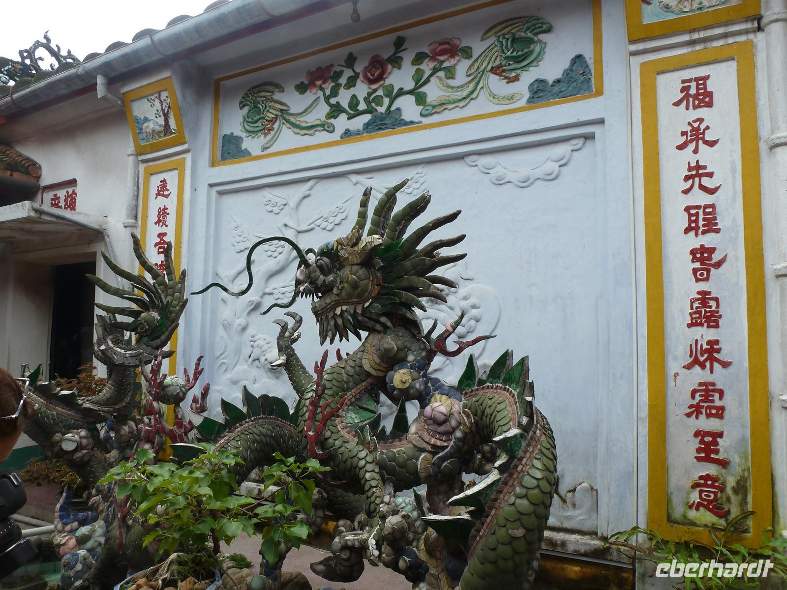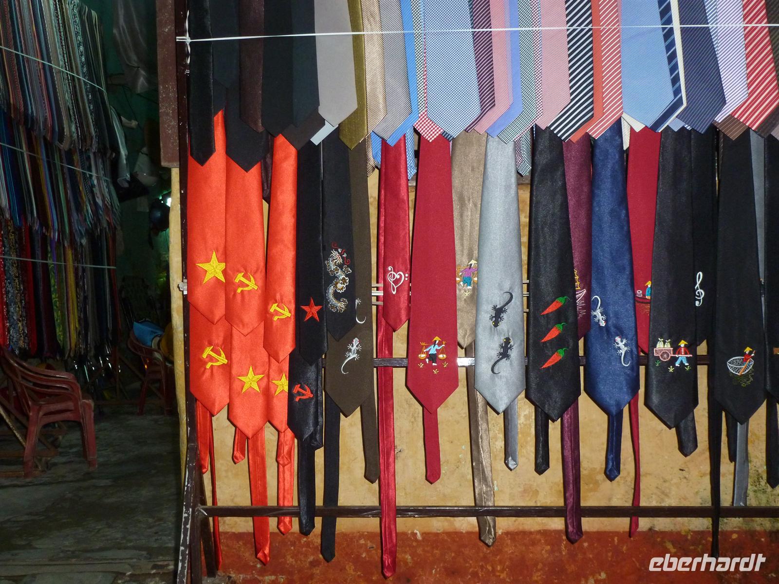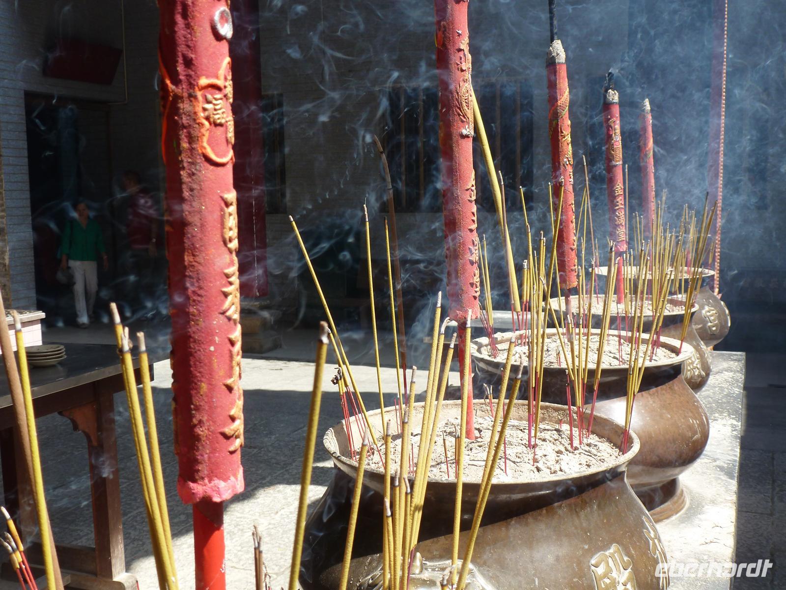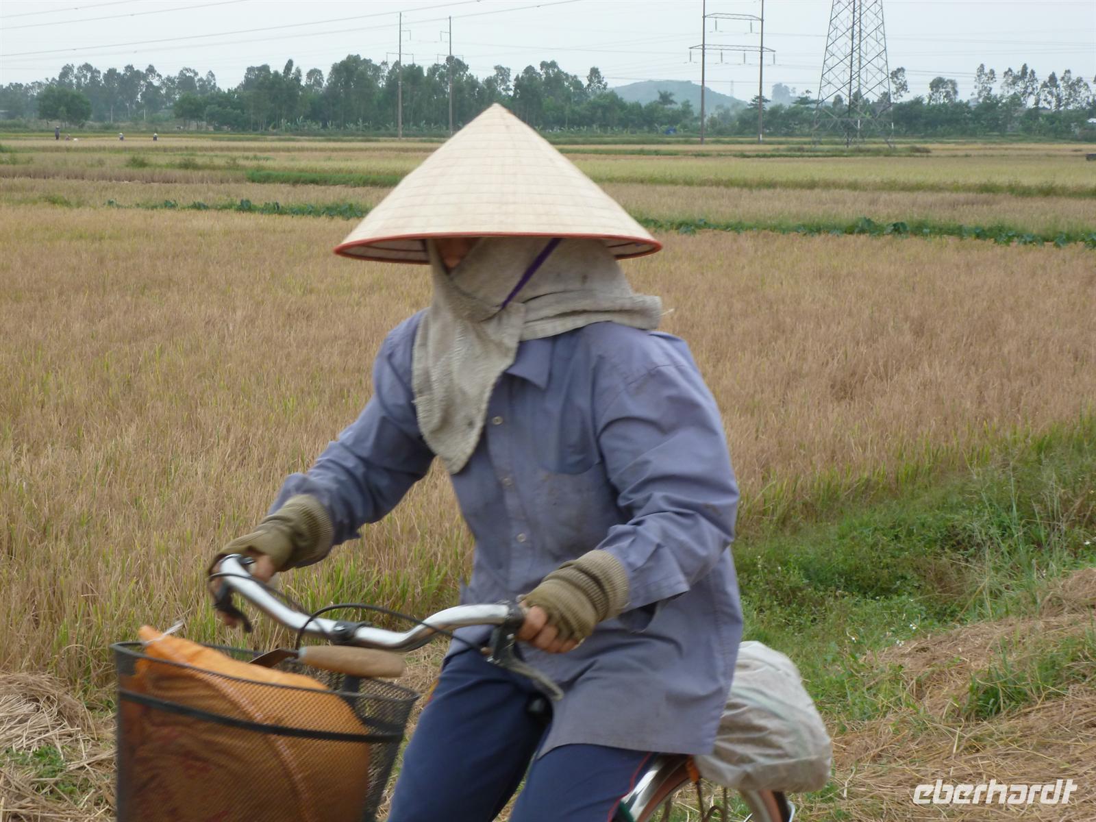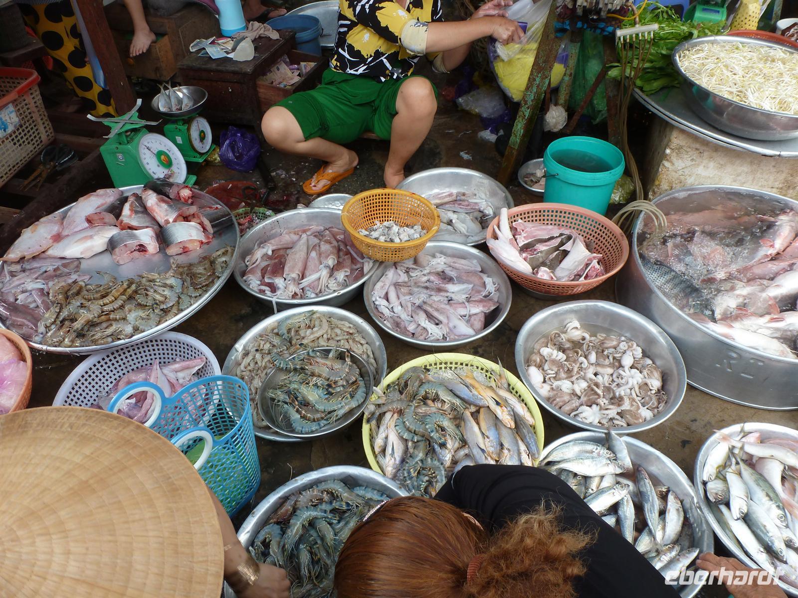 Gemüse, Kräutern und allerlei weiteren Dingen, die man im und zum Leben so braucht. Die ungewohnten Düfte aus den Garküchen stehen im Widerstreit mit den für unsere europäischen Nasen eher schwierigen, durchdringenden Gerüchen der Fischstände, die etwas nasale Gleichgültigkeit und Abhärtung von uns verlangen. Wir ziehen uns zurück und besichtigen die Versammlungshalle der Chinesen aus Fujian, die ihren Ursprung im 17. Jahrhundert haben soll und einst der größten und einflussreichsten Gruppe chinesischer Bürger in Hoi An gehörte. Im Anschluss betreten wir eines der ältesten Häuser der Stadt, welches mittlerweile in der achten Generation bewohnt wird und einen charakteristischen Einblick in die Wohnkultur des alten Hoi An bietet. Weiter führt uns unser Weg zur japanischen Brücke, welche einst das chinesische mit dem japanischen Stadtviertel verband und heute wichtigstes Fotomotiv bei allen Hoi An-Besuchern ist. Nachdem wir eine Manufaktur für Seidenstickereien besucht haben, begaben wir uns zum kleinen Hafen, um an Bord eines abenteuerlichen Holzbootes den Thu Bon Fluss entlang zum Töpferdorf Thanh Ha zu fahren. Wir bekamen ein paar Einblicke in die mittelalterlich anmutende, weil mit einfachsten Mitteln produzierte Handwerkskunst. Zurück in Hoi An nutzten wir den Nachmittag für einen Bummel durch die Gassen der Altstadt oder für ein erfrischendes Bad im Hotel-Pool. Unser heutiges Abendessen nahmen wir in einem schönen Restaurant am Rande der Stadt, gelegen inmitten eines von zahlreichen bunten Seidenlampions beleuchteten tropischen Gartens ein. Den Abschluss unseres Tages bildete ein kleiner Bummel durch die schön illuminierte Altstadt bzw. ein erfrischender Drink an der hoteleigenen Poolbar.