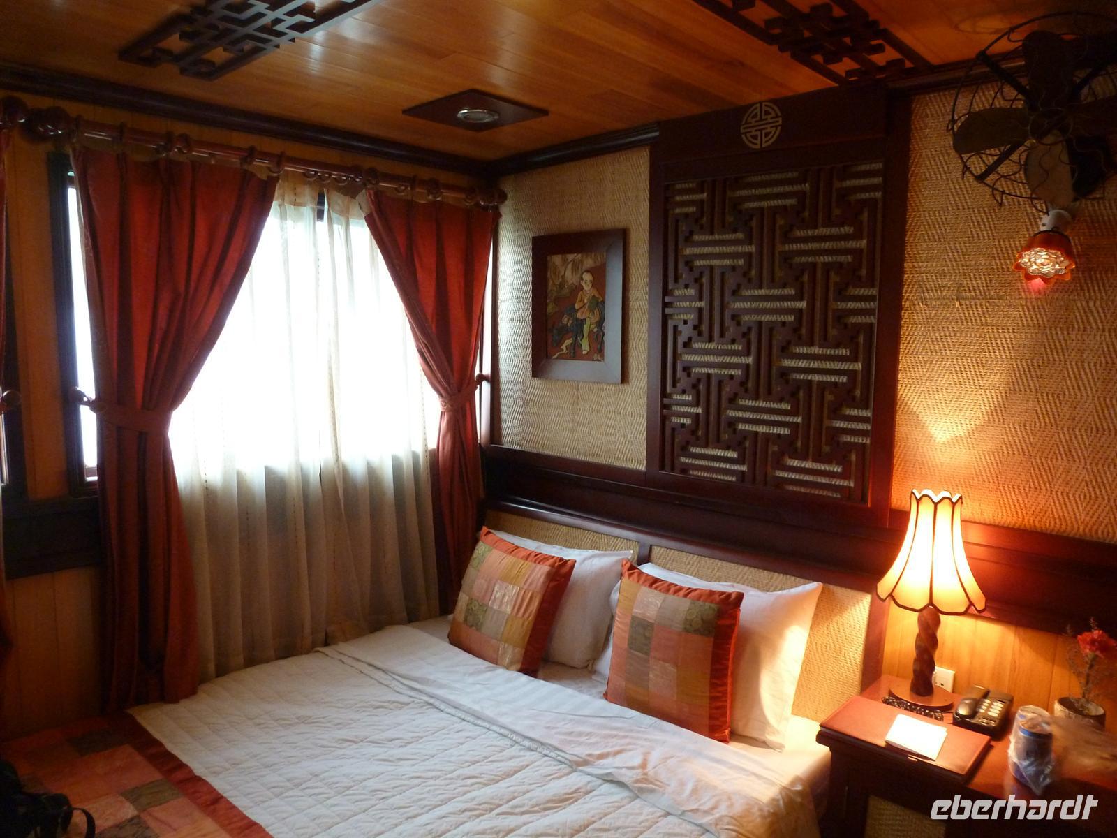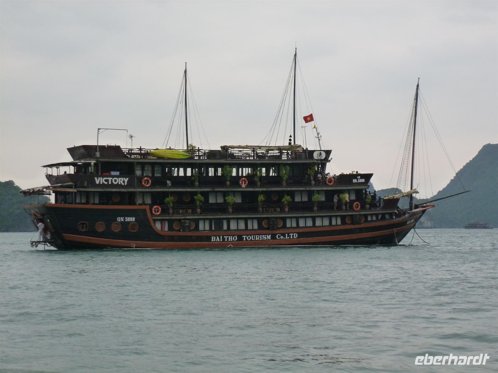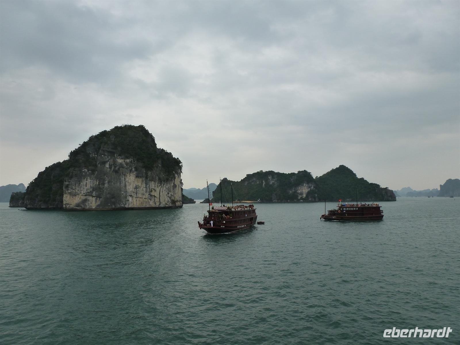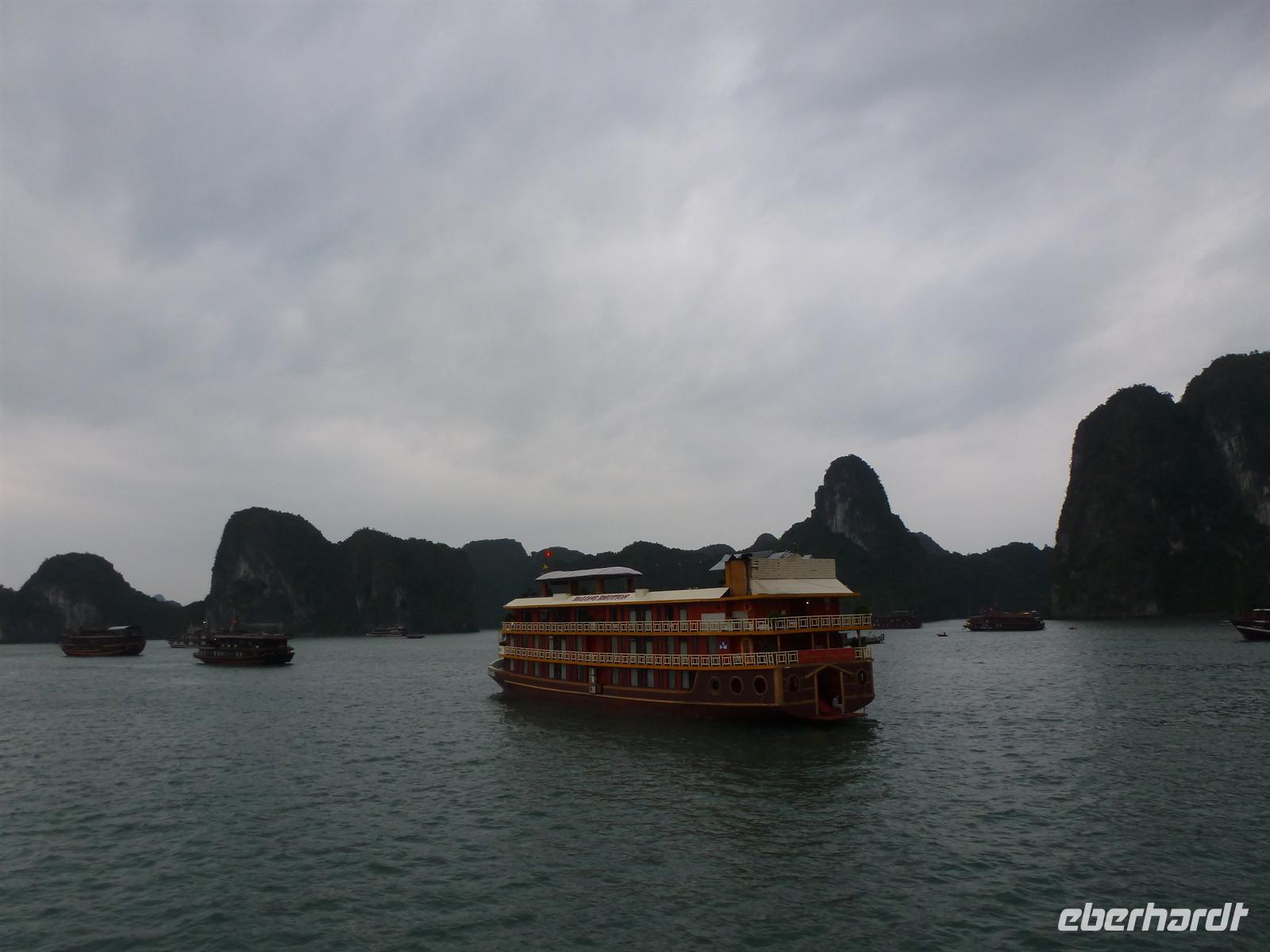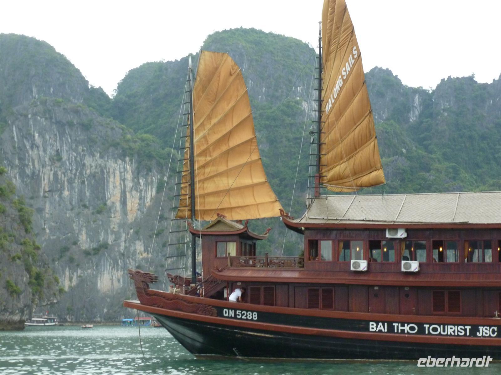 Ausgeschlafen und ausgeruht hieß es heute schon wieder Abschied nehmen von der Wiege der vietnamesischen Kultur und wir verließen Hanoi ostwärts in Richtung Halong-Bucht. Vorbei an Reisefeldern, kleinen Dörfern und ehemaligen Kohlerevieren erreichten wir gegen Mittag Halong-City, um hier an Bord einer Dschunke zu gehen. Das aus asiatischem „Aroma Wood“ gebaute, 42 Meter lange und 3 Decks hohe, wunderschöne Schiff hatte Platz für 42 Gäste, welche in komfortablen Kabinen mit Dusche/WC und Klimaanlage untergebracht wurden. Die nächsten 24 Stunden war dies unser Zuhause und wir sollten schöne Stunden an Bord verleben. Wir wurden mit fangfrischen Meeresfrüchten und allerlei Spezialitäten verwöhnt und glitten dabei mit unserer Dschunke durch das Labyrinth der mehr als 2000 Karstfelsen in der Halong-Bucht.