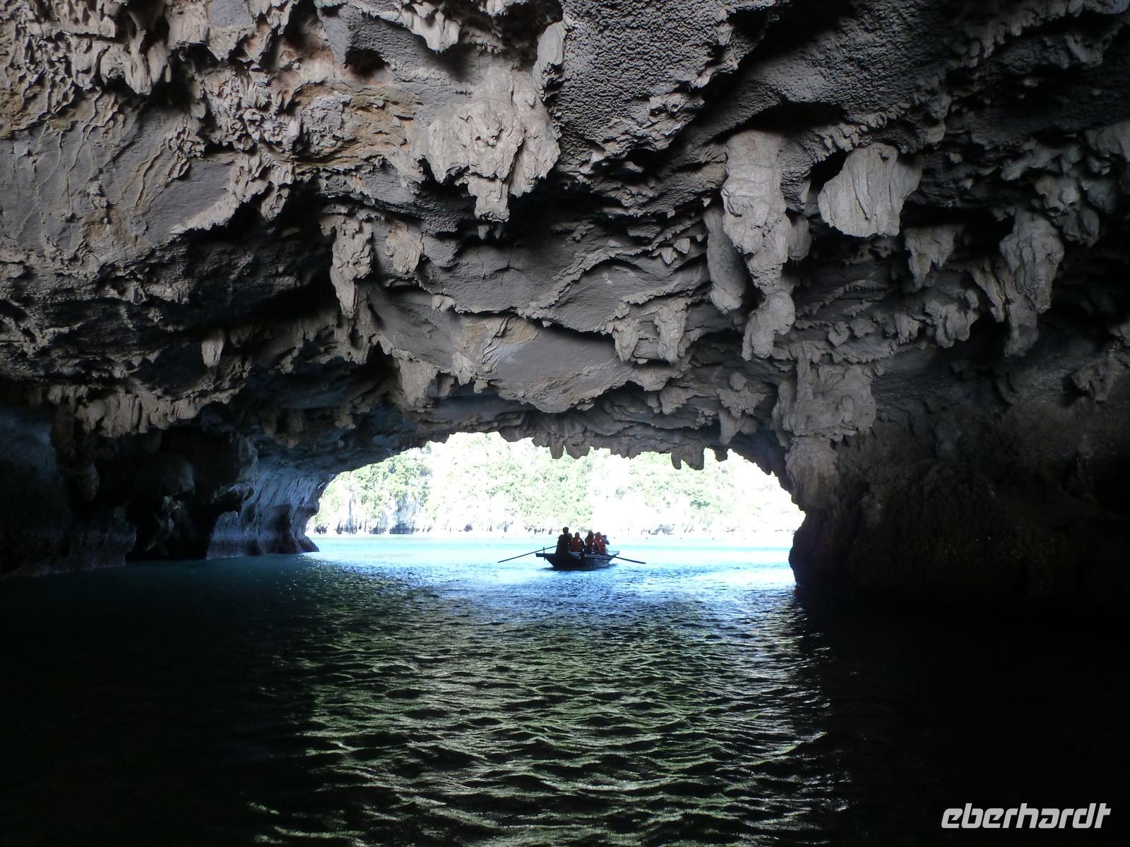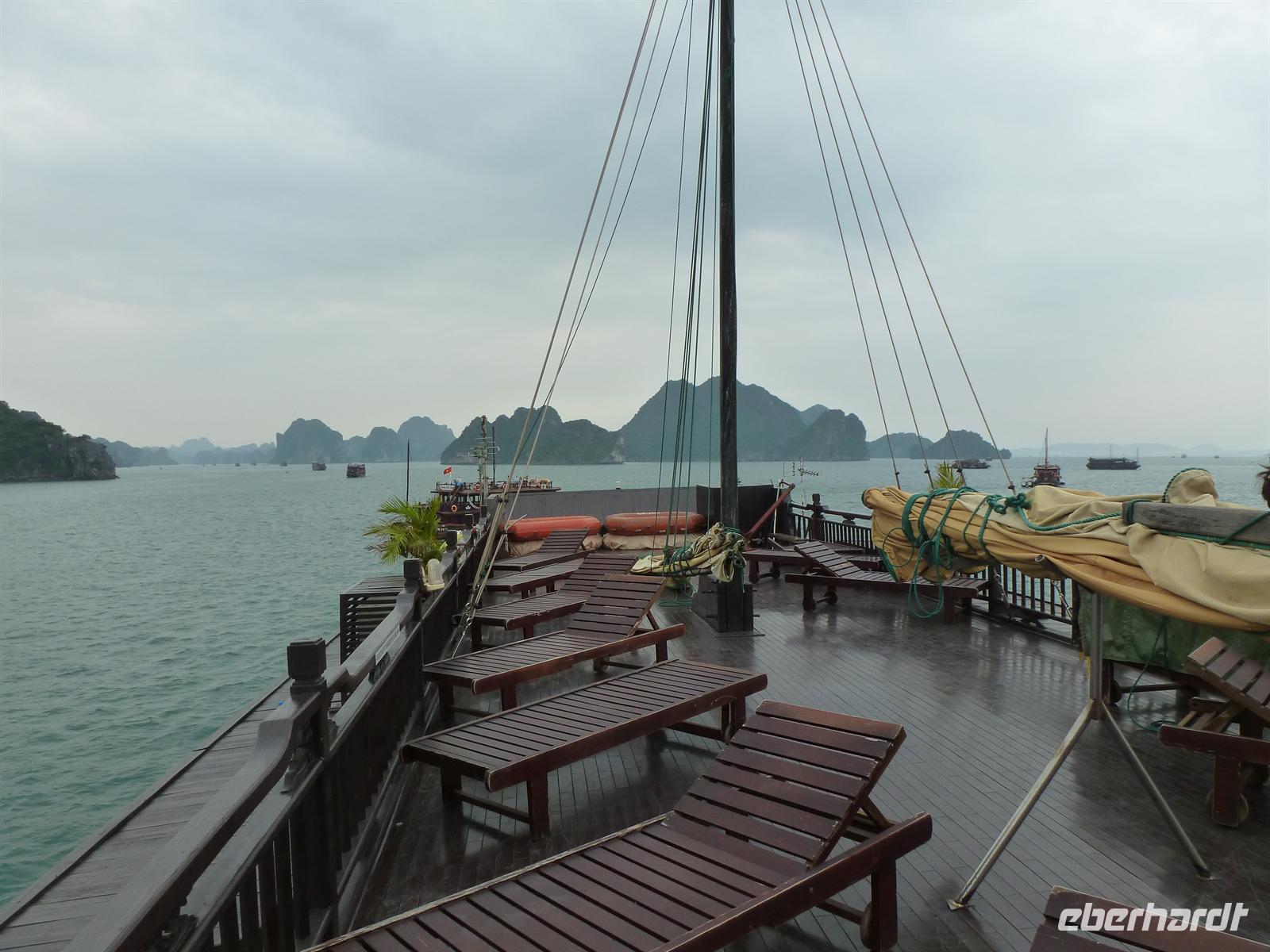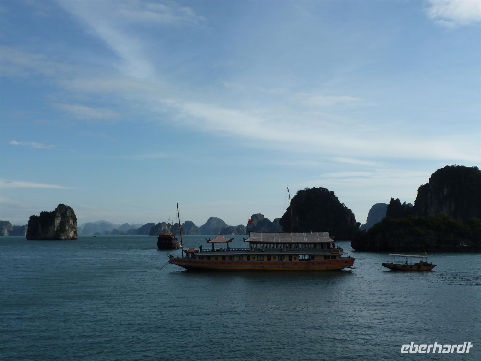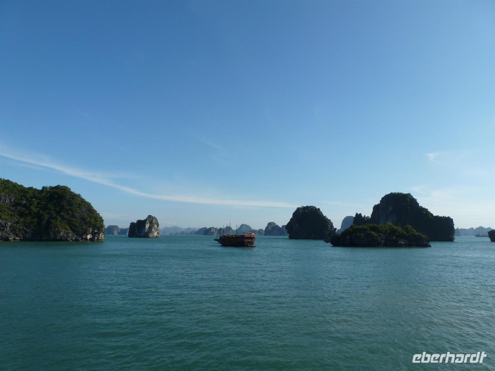 Nach einer mehr oder weniger erholsamen Nacht an Bord (die Geräusche auf hölzernen Schiffen können des Öfteren zum plötzlichen Erwachen beitragen) nahmen wir relativ zeitig am Morgen einen Kaffee oder Tee zu uns und freuten uns über den strahlend blauen Himmel über der Halong-Bucht. Währenddessen nahm unser Schiff wieder Fahrt auf und brachte uns in die Nähe einer Felslagune. Nach dem Umstieg von unserer Dschunke in kleine Ruderboote für jeweils 10 bis 14 Personen erkundeten wir bei einer kleinen Rundfahrt diese Laune der Natur, bevor wir wieder an Bord unserer Dschunke gingen und auf dem Sonnendeck relaxten oder angeregte Gespräche über