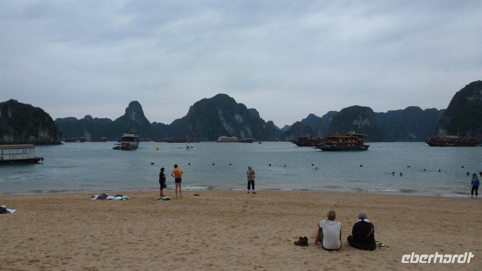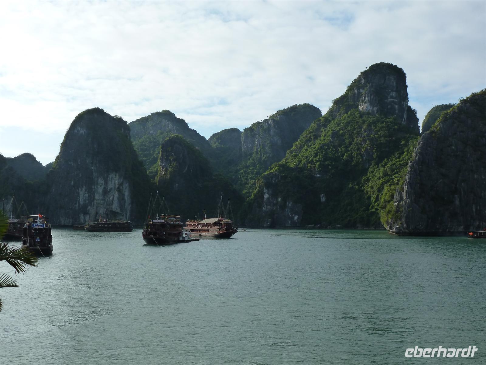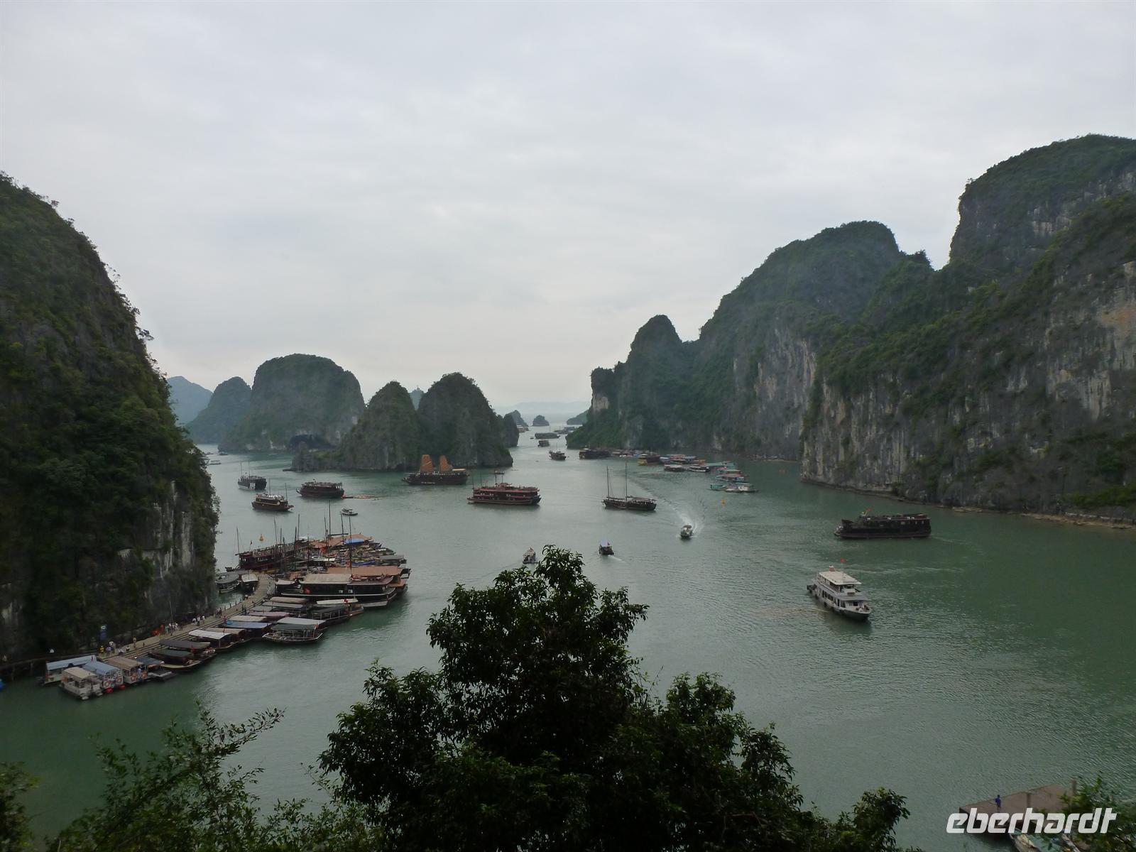 Welch spektakuläre Anblicke boten sich uns! Nicht zu Unrecht wurde dieses traumhafte Fleckchen in das UNESCO Weltnaturerbe aufgenommen. Malerische Felskegel und Gesteinsformationen ragten wie graugrüne Tupfen aus dem blauen Wasser, auf dessen Oberfläche sich Dschunken, Händlerboote und schwimmende Dörfer ein Stelldichein gaben. Dass der Tourismus Fluch und Segen zugleich bedeuten, erfuhren wir beim Besuch der Sung Sot Grotte, einer Tropfsteinhöhle, an deren Eingang sich mit uns der halbe Rest der Welt um ein Weiterkommen bemühte. Wie im All gilt auch hier: Wir sind nicht allein! Nach überstandener Grottenschubserei fuhren wir zur Titow-Insel (benannt nach einem russischen Kosmonauten), um an einem kleinen Sandstrand die müden Füße ins Wasser zu stecken oder knapp 400 Stufen auf den höchsten Punkt der Insel zu klettern, dabei den fantastischen Ausblick auf die umliegende Inselwelt zu genießen. Zurück auf dem Schiff labten wir uns an einem sechsgängigen Menü, welches wieder schmackhafte Lebewesen aus dem uns umgebenden Gewässer zum kulinarischen Inhalt hatte. Satt und zufrieden enterten wir das Oberdeck und genossen mit Blick auf die Sterne eine laue Nacht im Südchinesischen Meer, beleuchtet von hunderten kleinen Lichtern der mit uns vor Anker liegenden Dschunken. Ein Augenblick zum Innehalten, den jetzt und hier gilt: das Leben ist schön. Und wenn das Ganze noch mit schöngeistigen Getränken, hier in Form von Reisschnaps vom vietnamesischen Bauern unterlegt werden kann, sind die kleinen und großen Sorgen der Welt für einen Augenblick vergessen.