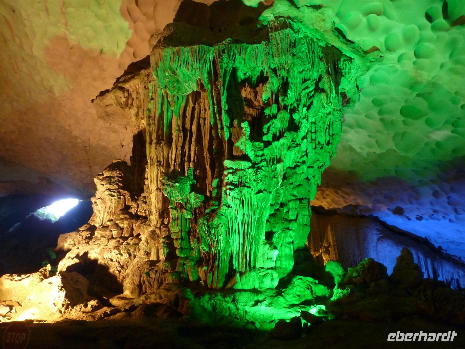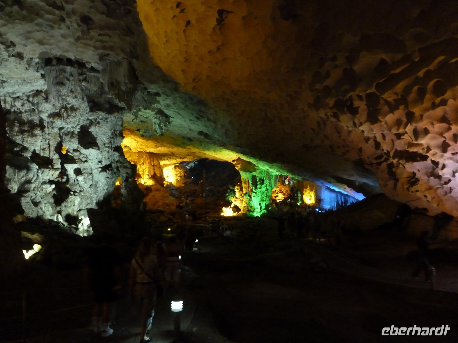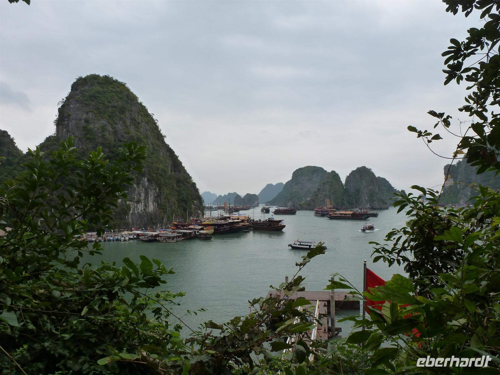 Welch spektakuläre Anblicke boten sich uns! Nicht zu Unrecht wurde dieses traumhafte Fleckchen in das UNESCO Weltnaturerbe aufgenommen. Malerische Felskegel und Gesteinsformationen ragten wie graugrüne Tupfen aus dem blauen Wasser, auf dessen Oberfläche sich Dschunken, Händlerboote und schwimmende Dörfer ein Stelldichein gaben. Dass der Tourismus Fluch und Segen zugleich bedeuten, erfuhren wir beim Besuch der Sung Sot Grotte, einer Tropfsteinhöhle, an deren Eingang sich mit uns der halbe Rest der Welt um ein Weiterkommen bemühte. Wie im All gilt auch hier: Wir sind nicht allein! Nach überstandener Grottenschubserei fuhren wir zur Titow-Insel (benannt nach einem russischen Kosmonauten), um an einem kleinen Sandstrand die müden Füße ins Wasser zu stecken oder knapp 400 Stufen auf den höchsten Punkt der Insel zu klettern, dabei den fantastischen Ausblick auf die umliegende Inselwelt zu genießen. Zurück auf dem Schiff labten wir uns an einem sechsgängigen Menü, welches wieder schmackhafte Lebewesen aus dem uns umgebenden Gewässer zum kulinarischen Inhalt hatte. Satt und zufrieden enterten wir das Oberdeck und genossen mit Blick auf die Sterne eine laue Nacht im Südchinesischen Meer, beleuchtet von hunderten kleinen Lichtern der mit uns vor Anker liegenden Dschunken. Ein Augenblick zum Innehalten, den jetzt und hier gilt: das Leben ist schön. Und wenn das Ganze noch mit schöngeistigen Getränken, hier in Form von Reisschnaps vom vietnamesischen Bauern unterlegt werden kann, sind die kleinen und großen Sorgen der Welt für einen Augenblick vergessen.