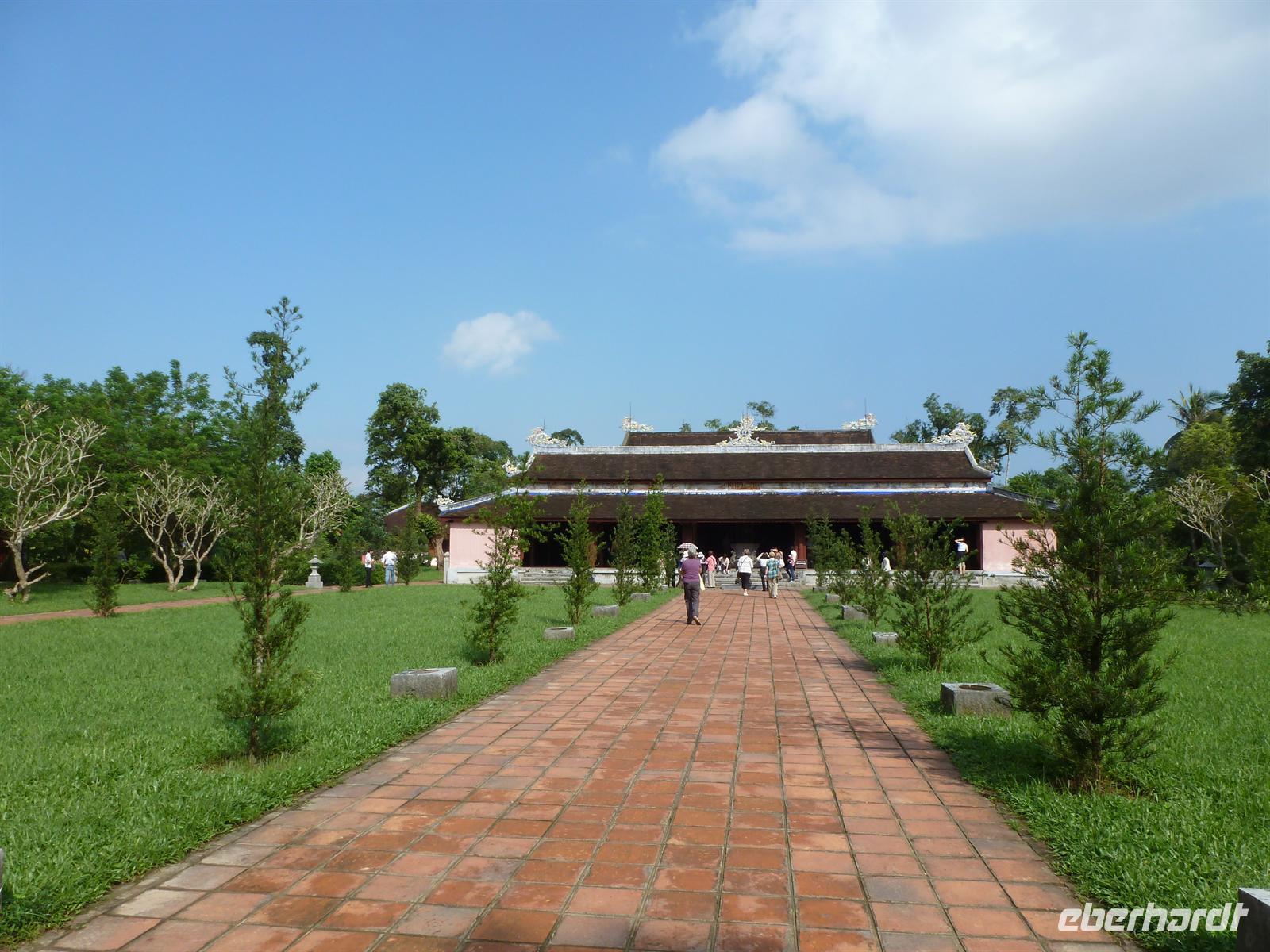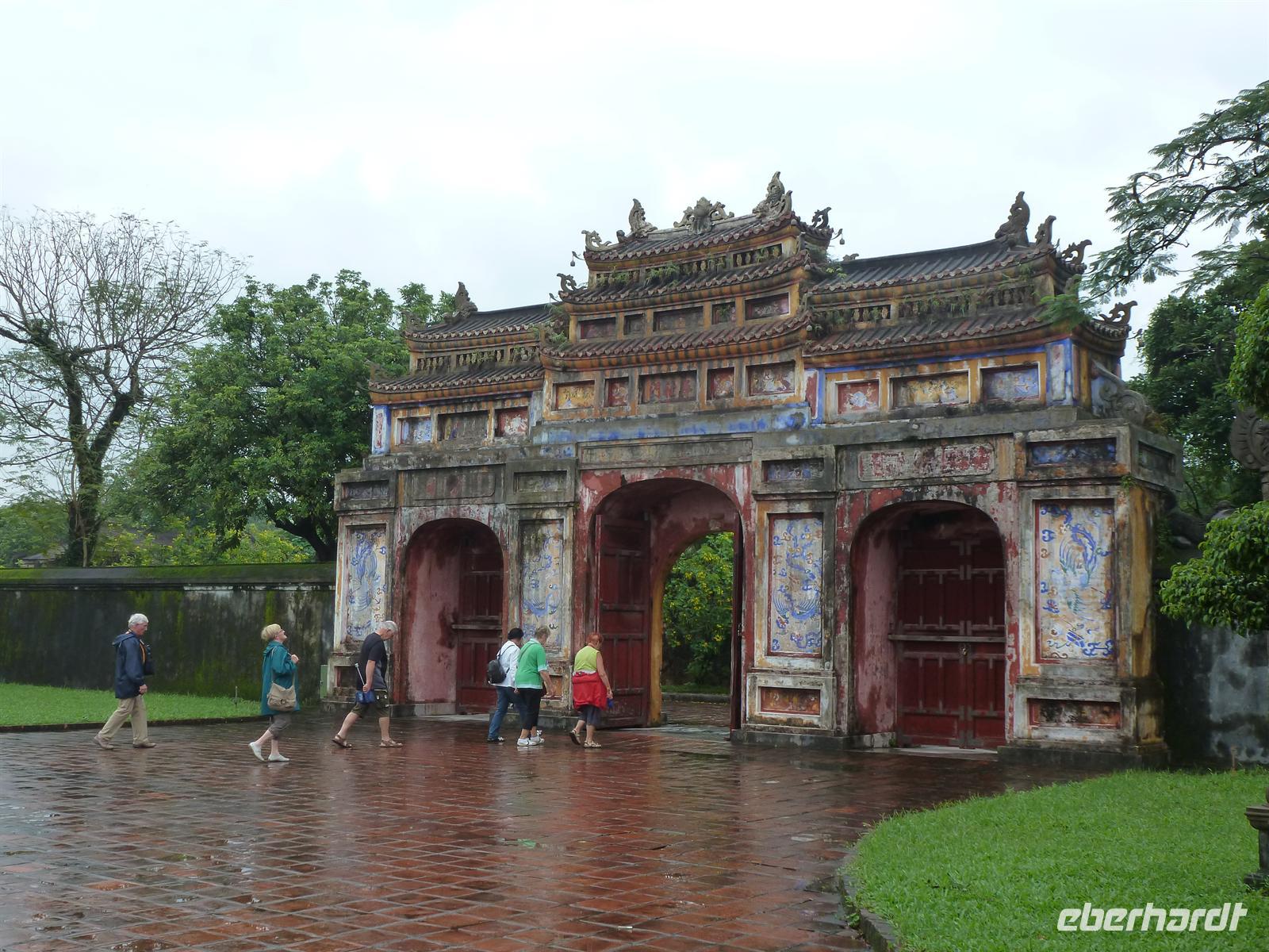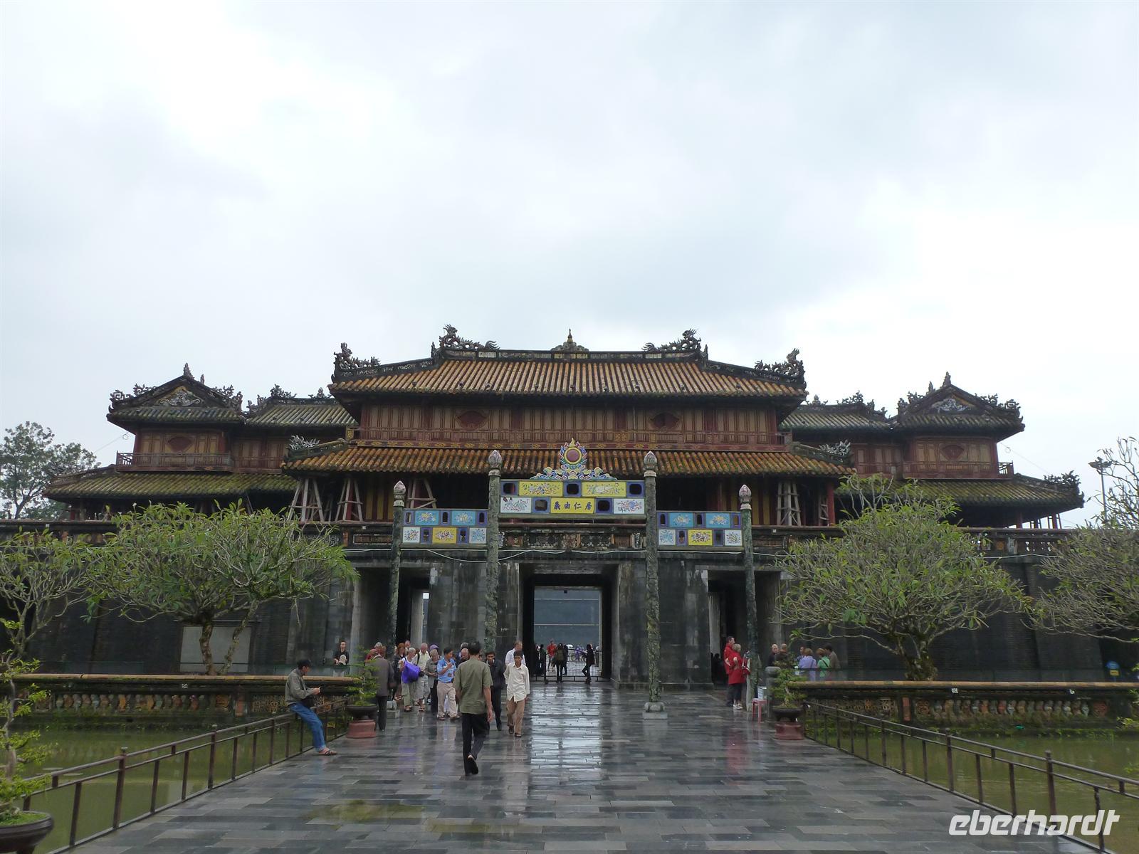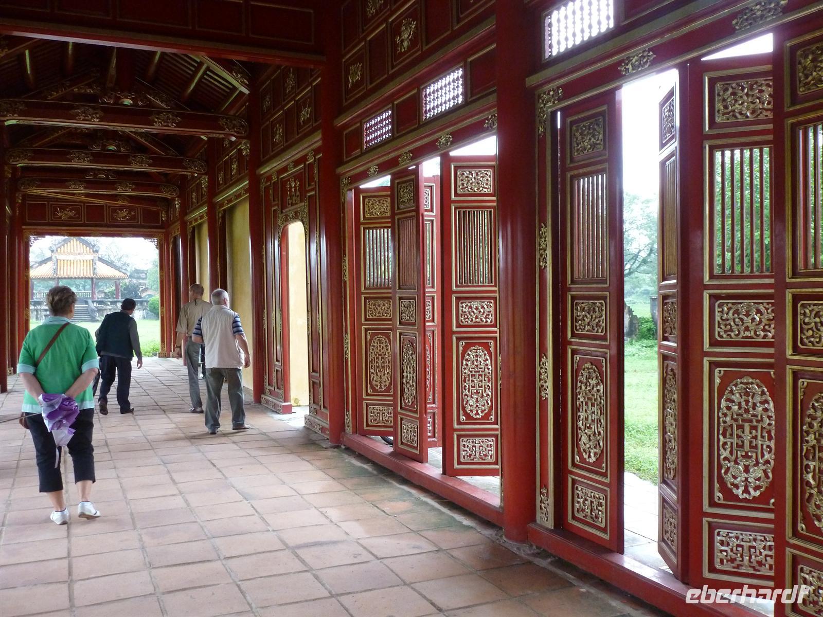 „Verbotenen Stadt“ über. Durch das Mittagstor gelangten wir über die Brücke des Goldenen Wassers in die Halle der Höchsten Harmonie, wo man sich mit ein wenig Fantasie noch immer den kaiserlichen Hofstaat vorstellen kann. Während der Tet-Offensive 1968 zerstört, wird heute innerhalb der Kaiserstadt an vielen Stellen restauriert und wieder aufgebaut. Trotzdem ist von der einstigen Pracht, nach dem Vorbild Pekings geplant und errichtet, heute nicht mehr viel zu sehen. Von den einstmals über 300 Gebäuden kann man heute kaum mehr als 80 noch als solche erkennen. Seit 1993 gehört die Kaiserstadt offiziell zum UNESCO Weltkulturerbe. Wir setzen unseren Rundgang innerhalb Ihrer Mauern fort und besichtigen den Pavillon der berühmten Seelen und die neun Bronzeurnen der Kaiser der Nguyen-Dynastie. Nach diesem beeindruckenden Blick in die Vergangenheit ging es weiter in das Hier und Heute von Hue, welches wir am Besten bei einem Besuch des zentralen Dong-Ba-Marktes erlebten. Etwas müde nach dem umfangreichen Besichtigungsprogramm bezogen wir unsere Zimmer im schönen Vier-Sterne-Hotel Huong Giang, wo ein wenig Ruhe nach dem zeitigen Tagesanbruch auf dem Programm stand. Am frühen Abend ließen wir uns mit der Fahrradrikscha durch die Rush Hour von Hue zum Abendessen innerhalb der Mauern der Kaiserstadt fahren. Welch Erlebnis, auf einer Höhe mit tausenden knatternden Mopeds und Autos durch das Verkehrsgetümmel zu fahren oder im Abgasnebel an der Kreuzung auf Grün zu warten. Ein schweres Los, sowohl für den Fahrer als auch für den Fahrgast. Im schön gelegenen Restaurant „Y Thao Garden“ wurden wir bei traditioneller Musik und Gesang mit einem Acht-Gänge-Menü bewirtet, welches auch die Spezialität von Hue beinhaltete, Banh Khoai, kleine Pfannkuchen, gefüllt mit einer Masse aus Shrimps, Schweinefleisch und Bohnensprossen, welche hervorragend geschmeckt haben.