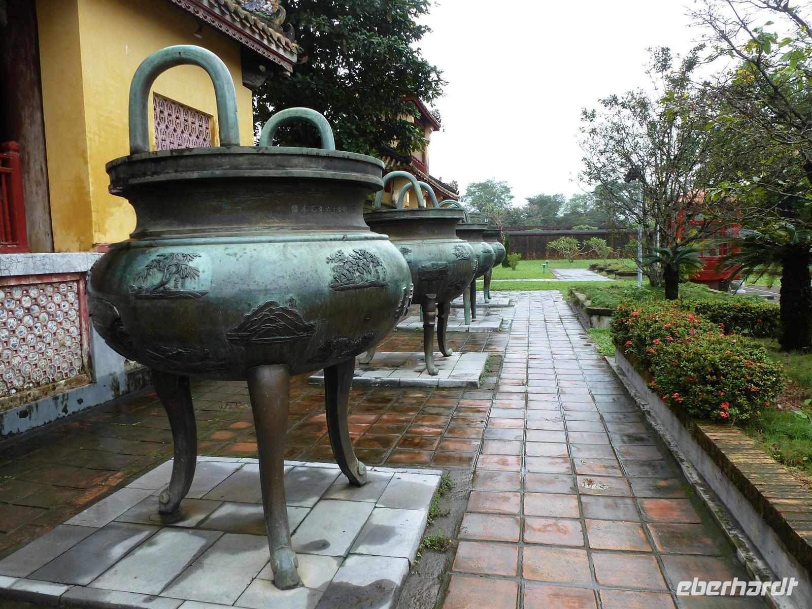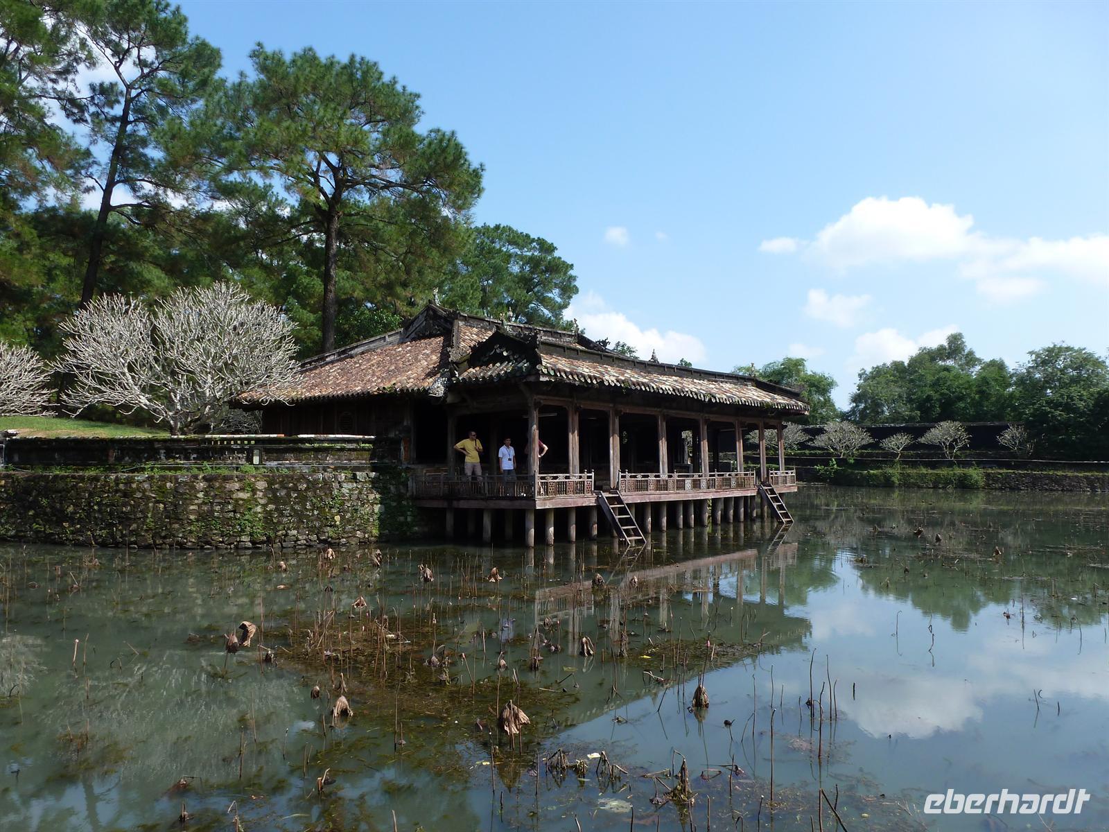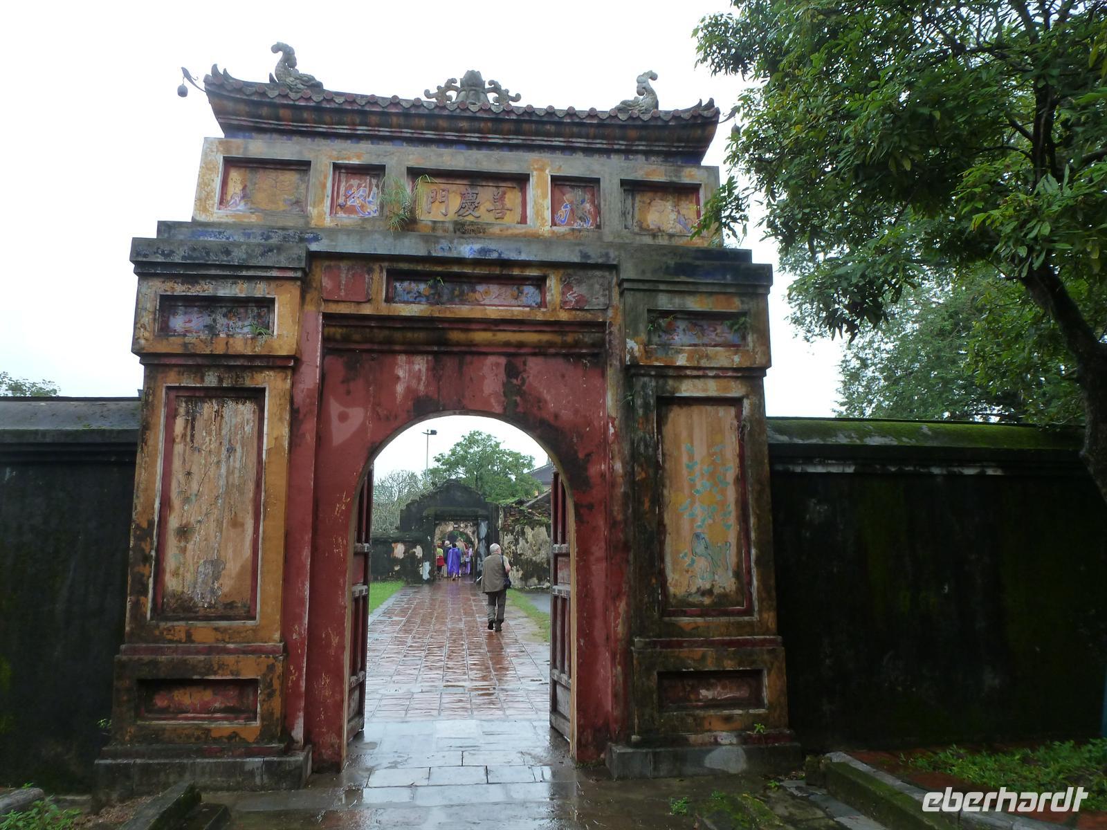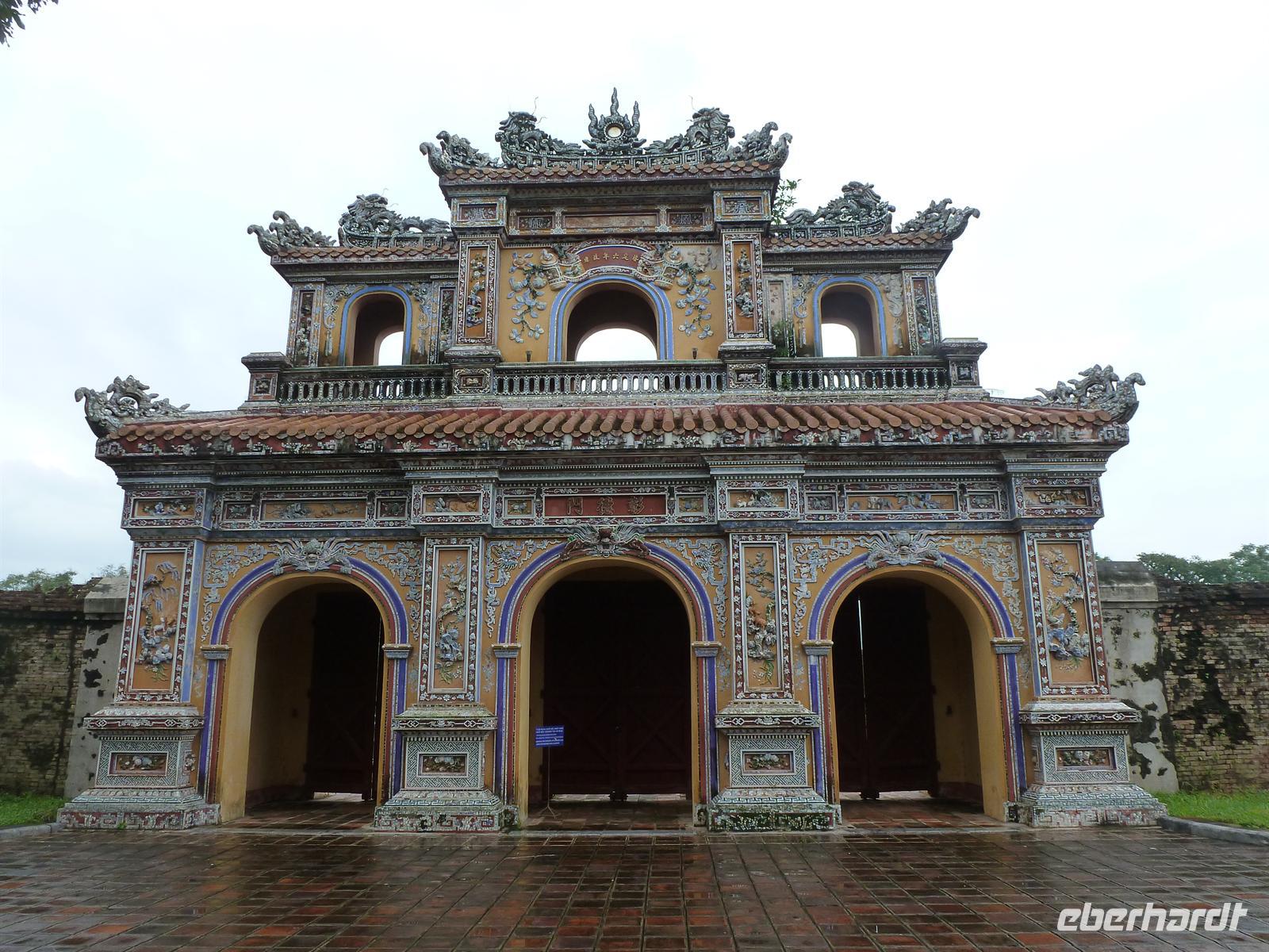 „Verbotenen Stadt“ über. Durch das Mittagstor gelangten wir über die Brücke des Goldenen Wassers in die Halle der Höchsten Harmonie, wo man sich mit ein wenig Fantasie noch immer den kaiserlichen Hofstaat vorstellen kann. Während der Tet-Offensive 1968 zerstört, wird heute innerhalb der Kaiserstadt an vielen Stellen restauriert und wieder aufgebaut. Trotzdem ist von der einstigen Pracht, nach dem Vorbild Pekings geplant und errichtet, heute nicht mehr viel zu sehen. Von den einstmals über 300 Gebäuden kann man heute kaum mehr als 80 noch als solche erkennen. Seit 1993 gehört die Kaiserstadt offiziell zum UNESCO Weltkulturerbe. Wir setzen unseren Rundgang innerhalb Ihrer Mauern fort und besichtigen den Pavillon der berühmten Seelen und die neun Bronzeurnen der Kaiser der Nguyen-Dynastie. Nach diesem beeindruckenden Blick in die Vergangenheit ging es weiter in das Hier und Heute von Hue, welches wir am Besten bei einem Besuch des zentralen Dong-Ba-Marktes erlebten. Etwas müde nach dem umfangreichen Besichtigungsprogramm bezogen wir unsere Zimmer im schönen Vier-Sterne-Hotel Huong Giang, wo ein wenig Ruhe nach dem zeitigen Tagesanbruch auf dem Programm stand. Am frühen Abend ließen wir uns mit der Fahrradrikscha durch die Rush Hour von Hue zum Abendessen innerhalb der Mauern der Kaiserstadt fahren. Welch Erlebnis, auf einer Höhe mit tausenden knatternden Mopeds und Autos durch das Verkehrsgetümmel zu fahren oder im Abgasnebel an der Kreuzung auf Grün zu warten. Ein schweres Los, sowohl für den Fahrer als auch für den Fahrgast. Im schön gelegenen Restaurant „Y Thao Garden“ wurden wir bei traditioneller Musik und Gesang mit einem Acht-Gänge-Menü bewirtet, welches auch die Spezialität von Hue beinhaltete, Banh Khoai, kleine Pfannkuchen, gefüllt mit einer Masse aus Shrimps, Schweinefleisch und Bohnensprossen, welche hervorragend geschmeckt haben.