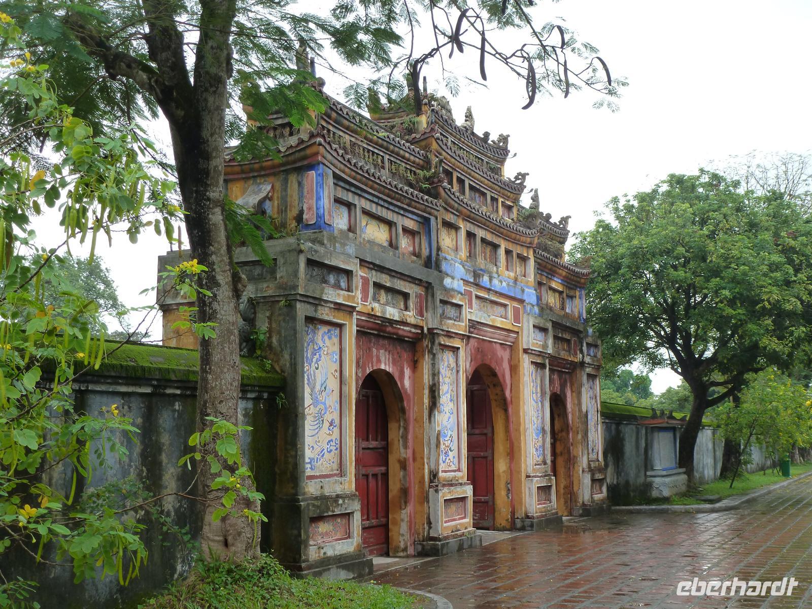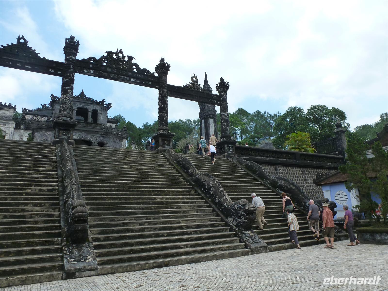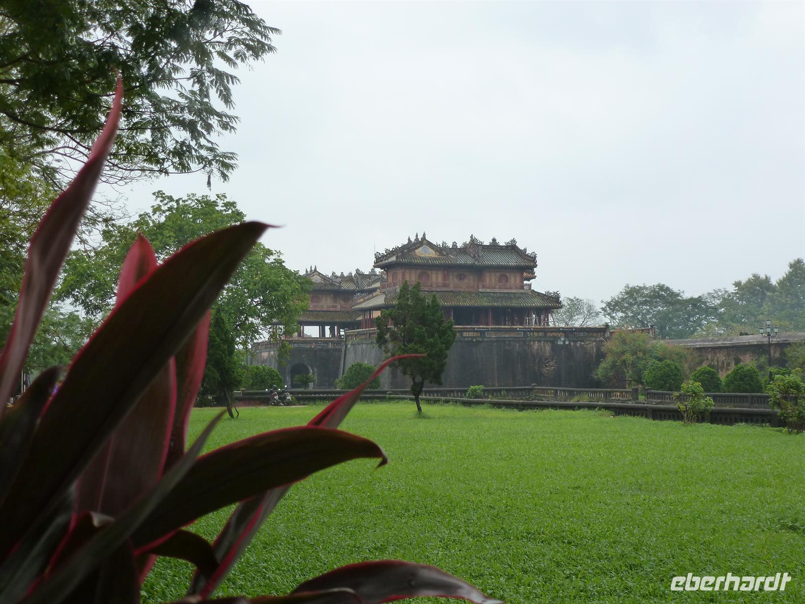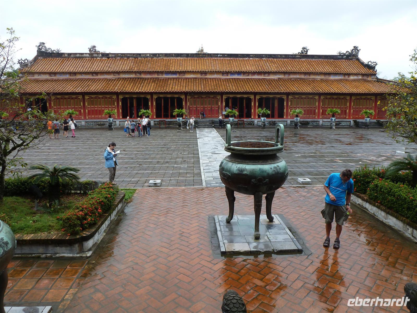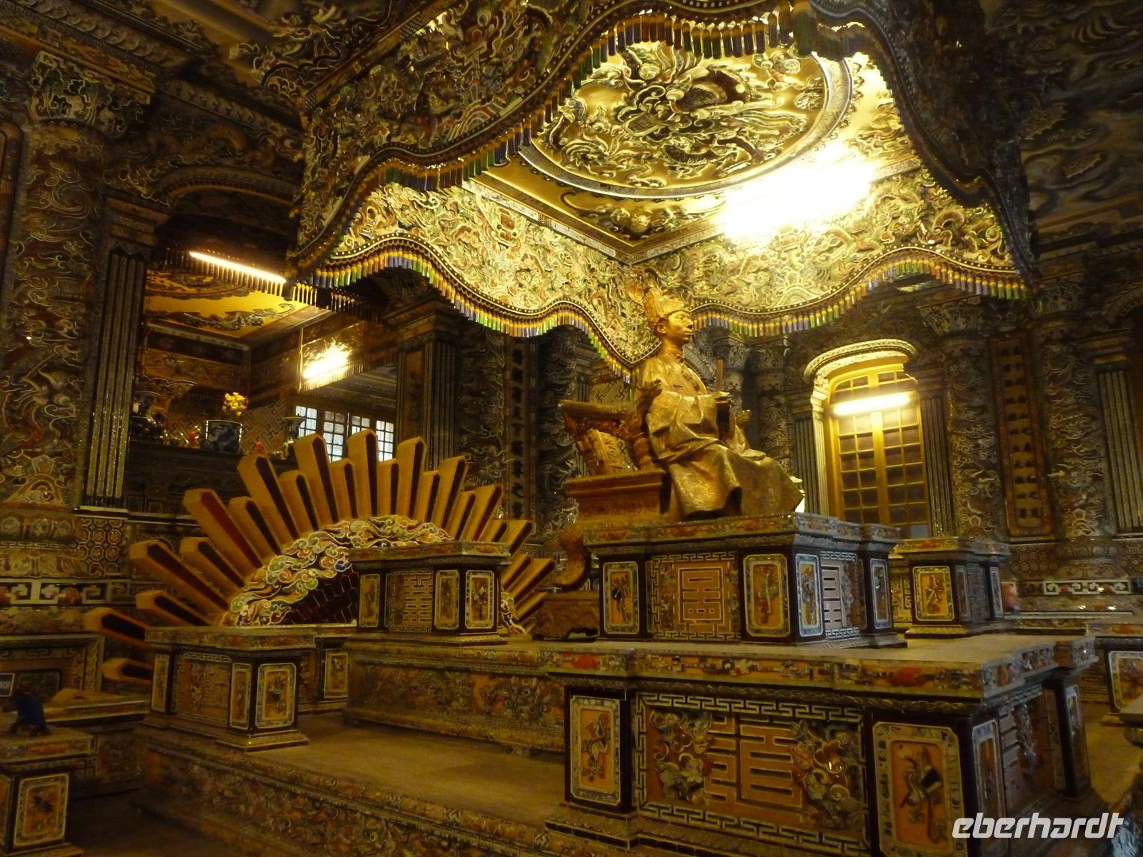 „Verbotenen Stadt“ über. Durch das Mittagstor gelangten wir über die Brücke des Goldenen Wassers in die Halle der Höchsten Harmonie, wo man sich mit ein wenig Fantasie noch immer den kaiserlichen Hofstaat vorstellen kann. Während der Tet-Offensive 1968 zerstört, wird heute innerhalb der Kaiserstadt an vielen Stellen restauriert und wieder aufgebaut. Trotzdem ist von der einstigen Pracht, nach dem Vorbild Pekings geplant und errichtet, heute nicht mehr viel zu sehen. Von den einstmals über 300 Gebäuden kann man heute kaum mehr als 80 noch als solche erkennen. Seit 1993 gehört die Kaiserstadt offiziell zum UNESCO Weltkulturerbe. Wir setzen unseren Rundgang innerhalb Ihrer Mauern fort und besichtigen den Pavillon der berühmten Seelen und die neun Bronzeurnen der Kaiser der Nguyen-Dynastie. Nach diesem beeindruckenden Blick in die Vergangenheit ging es weiter in das Hier und Heute von Hue, welches wir am Besten bei einem Besuch des zentralen Dong-Ba-Marktes erlebten. Etwas müde nach dem umfangreichen Besichtigungsprogramm bezogen wir unsere Zimmer im schönen Vier-Sterne-Hotel Huong Giang, wo ein wenig Ruhe nach dem zeitigen Tagesanbruch auf dem Programm stand. Am frühen Abend ließen wir uns mit der Fahrradrikscha durch die Rush Hour von Hue zum Abendessen innerhalb der Mauern der Kaiserstadt fahren. Welch Erlebnis, auf einer Höhe mit tausenden knatternden Mopeds und Autos durch das Verkehrsgetümmel zu fahren oder im Abgasnebel an der Kreuzung auf Grün zu warten. Ein schweres Los, sowohl für den Fahrer als auch für den Fahrgast. Im schön gelegenen Restaurant „Y Thao Garden“ wurden wir bei traditioneller Musik und Gesang mit einem Acht-Gänge-Menü bewirtet, welches auch die Spezialität von Hue beinhaltete, Banh Khoai, kleine Pfannkuchen, gefüllt mit einer Masse aus Shrimps, Schweinefleisch und Bohnensprossen, welche hervorragend geschmeckt haben.
