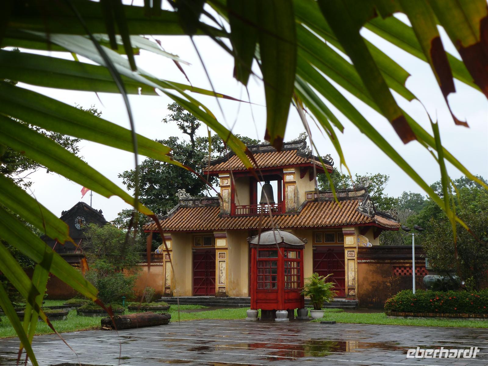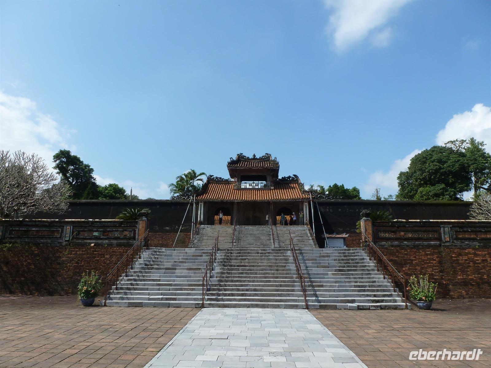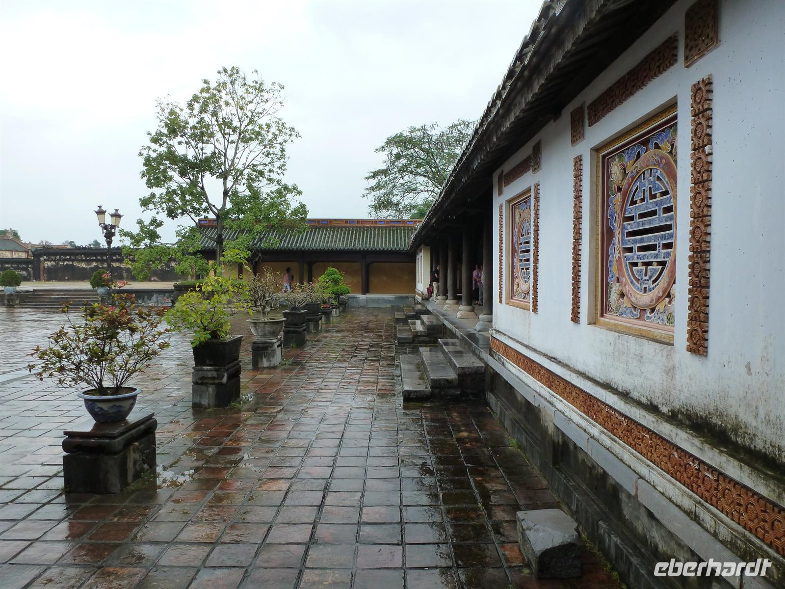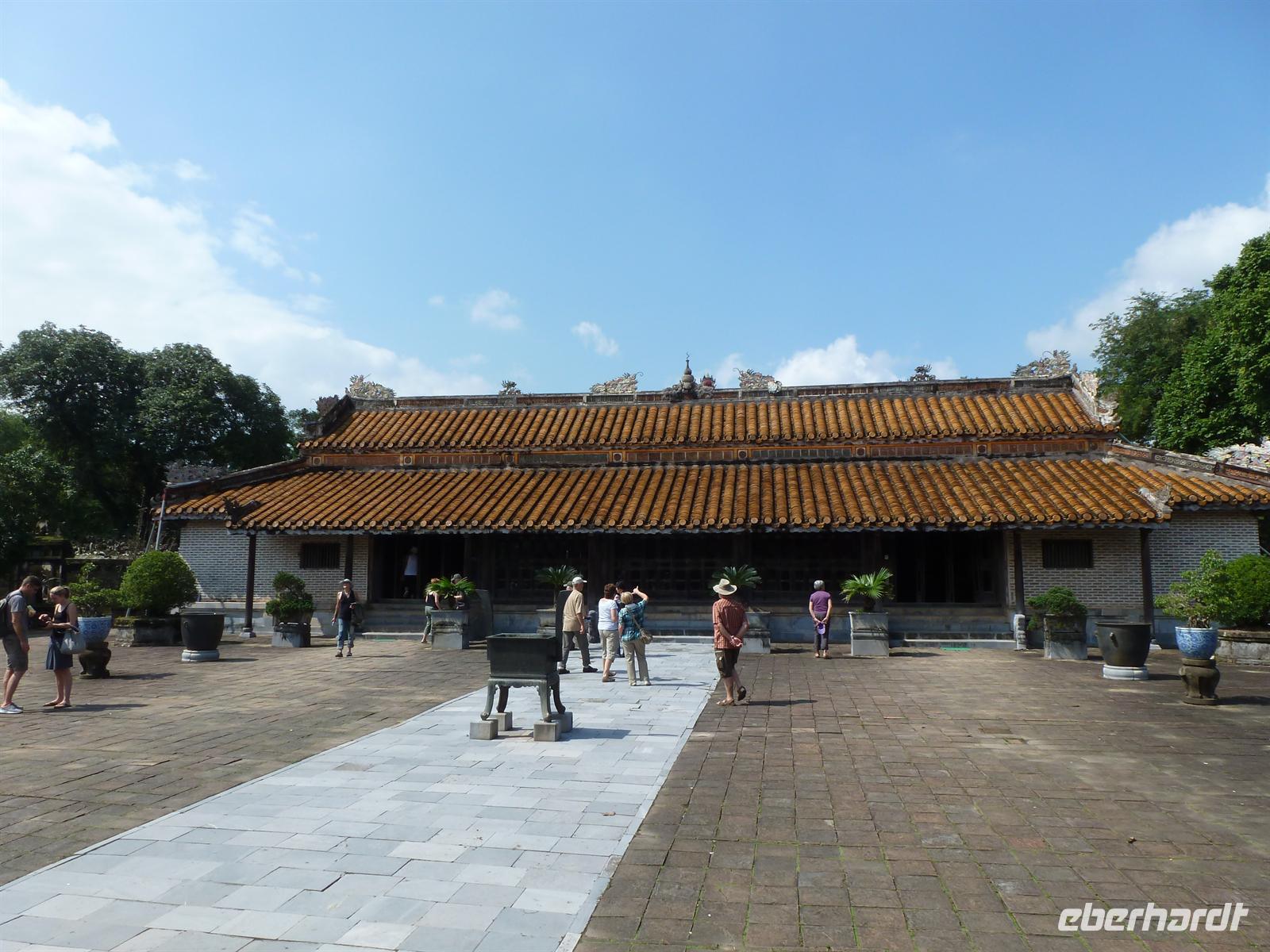 „Verbotenen Stadt“ über. Durch das Mittagstor gelangten wir über die Brücke des Goldenen Wassers in die Halle der Höchsten Harmonie, wo man sich mit ein wenig Fantasie noch immer den kaiserlichen Hofstaat vorstellen kann. Während der Tet-Offensive 1968 zerstört, wird heute innerhalb der Kaiserstadt an vielen Stellen restauriert und wieder aufgebaut. Trotzdem ist von der einstigen Pracht, nach dem Vorbild Pekings geplant und errichtet, heute nicht mehr viel zu sehen. Von den einstmals über 300 Gebäuden kann man heute kaum mehr als 80 noch als solche erkennen. Seit 1993 gehört die Kaiserstadt offiziell zum UNESCO Weltkulturerbe. Wir setzen unseren Rundgang innerhalb Ihrer Mauern fort und besichtigen den Pavillon der berühmten Seelen und die neun Bronzeurnen der Kaiser der Nguyen-Dynastie. Nach diesem beeindruckenden Blick in die Vergangenheit ging es weiter in das Hier und Heute von Hue, welches wir am Besten bei einem Besuch des zentralen Dong-Ba-Marktes erlebten. Etwas müde nach dem umfangreichen Besichtigungsprogramm bezogen wir unsere Zimmer im schönen Vier-Sterne-Hotel Huong Giang, wo ein wenig Ruhe nach dem zeitigen Tagesanbruch auf dem Programm stand. Am frühen Abend ließen wir uns mit der Fahrradrikscha durch die Rush Hour von Hue zum Abendessen innerhalb der Mauern der Kaiserstadt fahren. Welch Erlebnis, auf einer Höhe mit tausenden knatternden Mopeds und Autos durch das Verkehrsgetümmel zu fahren oder im Abgasnebel an der Kreuzung auf Grün zu warten. Ein schweres Los, sowohl für den Fahrer als auch für den Fahrgast. Im schön gelegenen Restaurant „Y Thao Garden“ wurden wir bei traditioneller Musik und Gesang mit einem Acht-Gänge-Menü bewirtet, welches auch die Spezialität von Hue beinhaltete, Banh Khoai, kleine Pfannkuchen, gefüllt mit einer Masse aus Shrimps, Schweinefleisch und Bohnensprossen, welche hervorragend geschmeckt haben.
