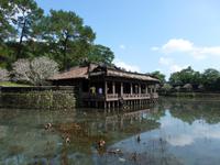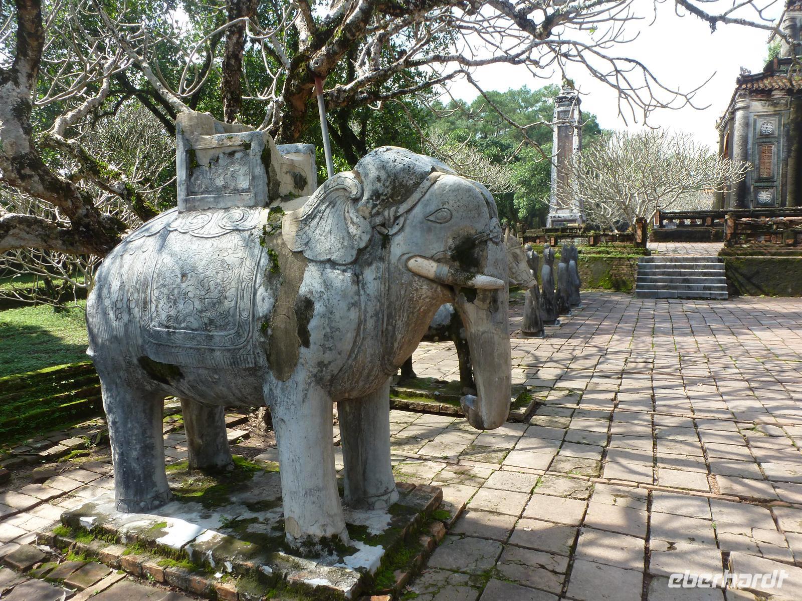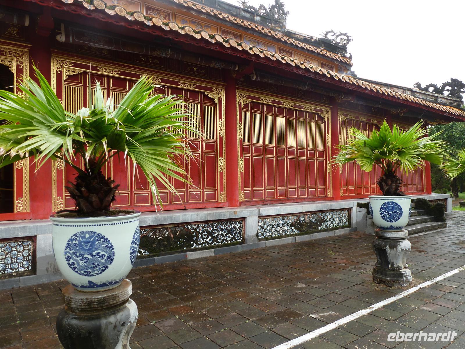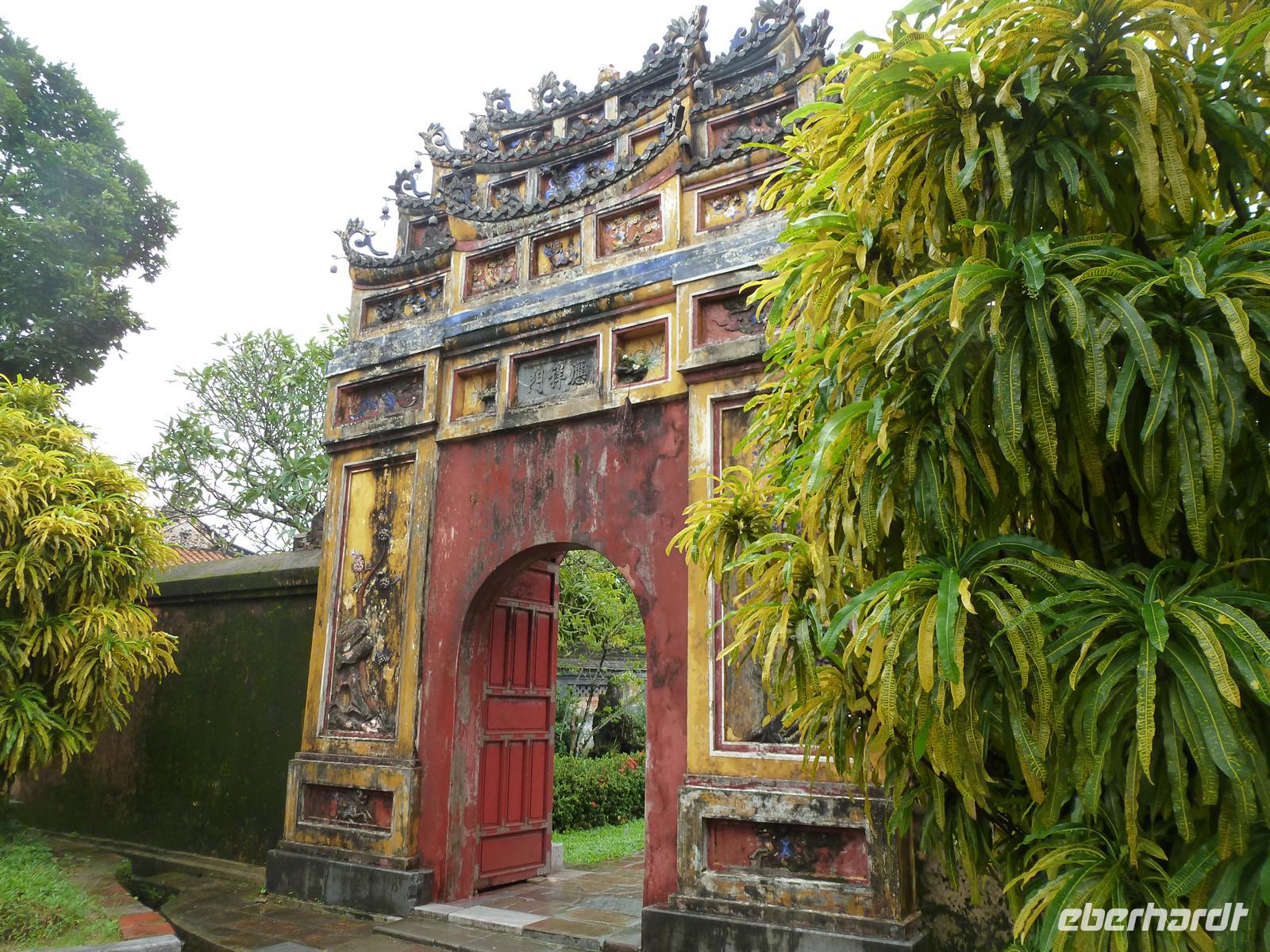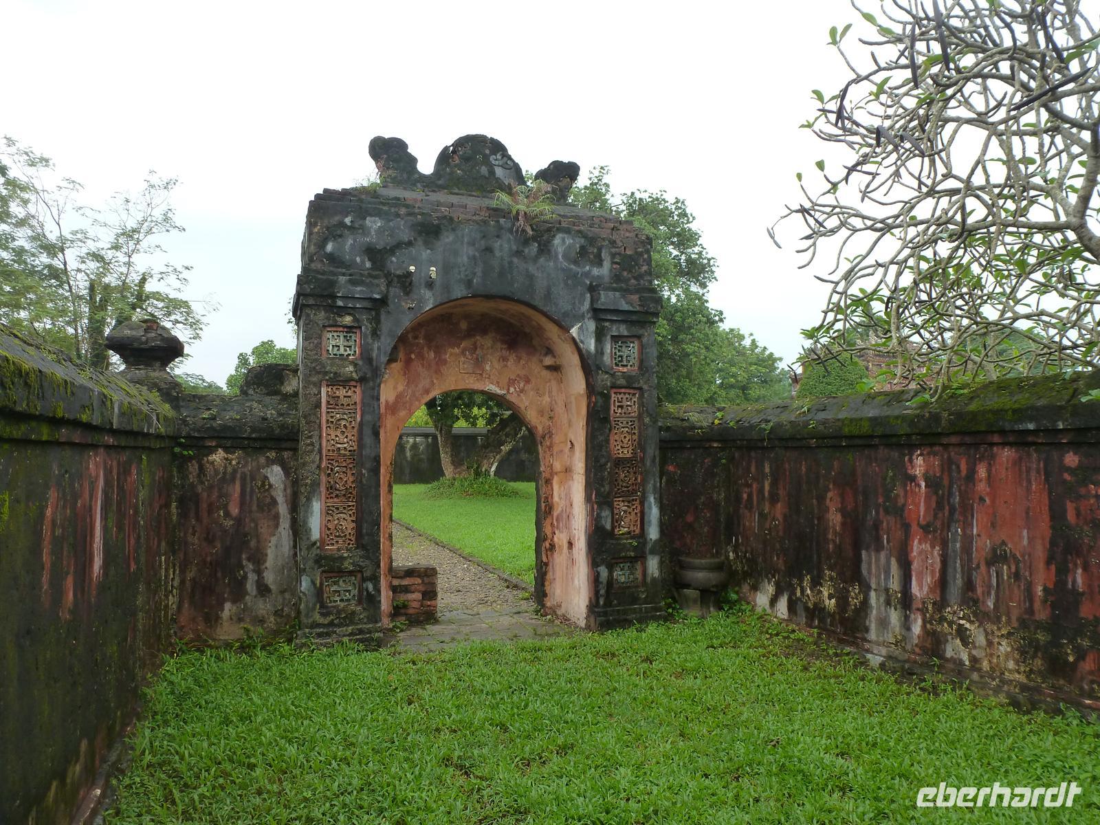 „Verbotenen Stadt“ über. Durch das Mittagstor gelangten wir über die Brücke des Goldenen Wassers in die Halle der Höchsten Harmonie, wo man sich mit ein wenig Fantasie noch immer den kaiserlichen Hofstaat vorstellen kann. Während der Tet-Offensive 1968 zerstört, wird heute innerhalb der Kaiserstadt an vielen Stellen restauriert und wieder aufgebaut. Trotzdem ist von der einstigen Pracht, nach dem Vorbild Pekings geplant und errichtet, heute nicht mehr viel zu sehen. Von den einstmals über 300 Gebäuden kann man heute kaum mehr als 80 noch als solche erkennen. Seit 1993 gehört die Kaiserstadt offiziell zum UNESCO Weltkulturerbe. Wir setzen unseren Rundgang innerhalb Ihrer Mauern fort und besichtigen den Pavillon der berühmten Seelen und die neun Bronzeurnen der Kaiser der Nguyen-Dynastie. Nach diesem beeindruckenden Blick in die Vergangenheit ging es weiter in das Hier und Heute von Hue, welches wir am Besten bei einem Besuch des zentralen Dong-Ba-Marktes erlebten. Etwas müde nach dem umfangreichen Besichtigungsprogramm bezogen wir unsere Zimmer im schönen Vier-Sterne-Hotel Huong Giang, wo ein wenig Ruhe nach dem zeitigen Tagesanbruch auf dem Programm stand. Am frühen Abend ließen wir uns mit der Fahrradrikscha durch die Rush Hour von Hue zum Abendessen innerhalb der Mauern der Kaiserstadt fahren. Welch Erlebnis, auf einer Höhe mit tausenden knatternden Mopeds und Autos durch das Verkehrsgetümmel zu fahren oder im Abgasnebel an der Kreuzung auf Grün zu warten. Ein schweres Los, sowohl für den Fahrer als auch für den Fahrgast. Im schön gelegenen Restaurant „Y Thao Garden“ wurden wir bei traditioneller Musik und Gesang mit einem Acht-Gänge-Menü bewirtet, welches auch die Spezialität von Hue beinhaltete, Banh Khoai, kleine Pfannkuchen, gefüllt mit einer Masse aus Shrimps, Schweinefleisch und Bohnensprossen, welche hervorragend geschmeckt haben.