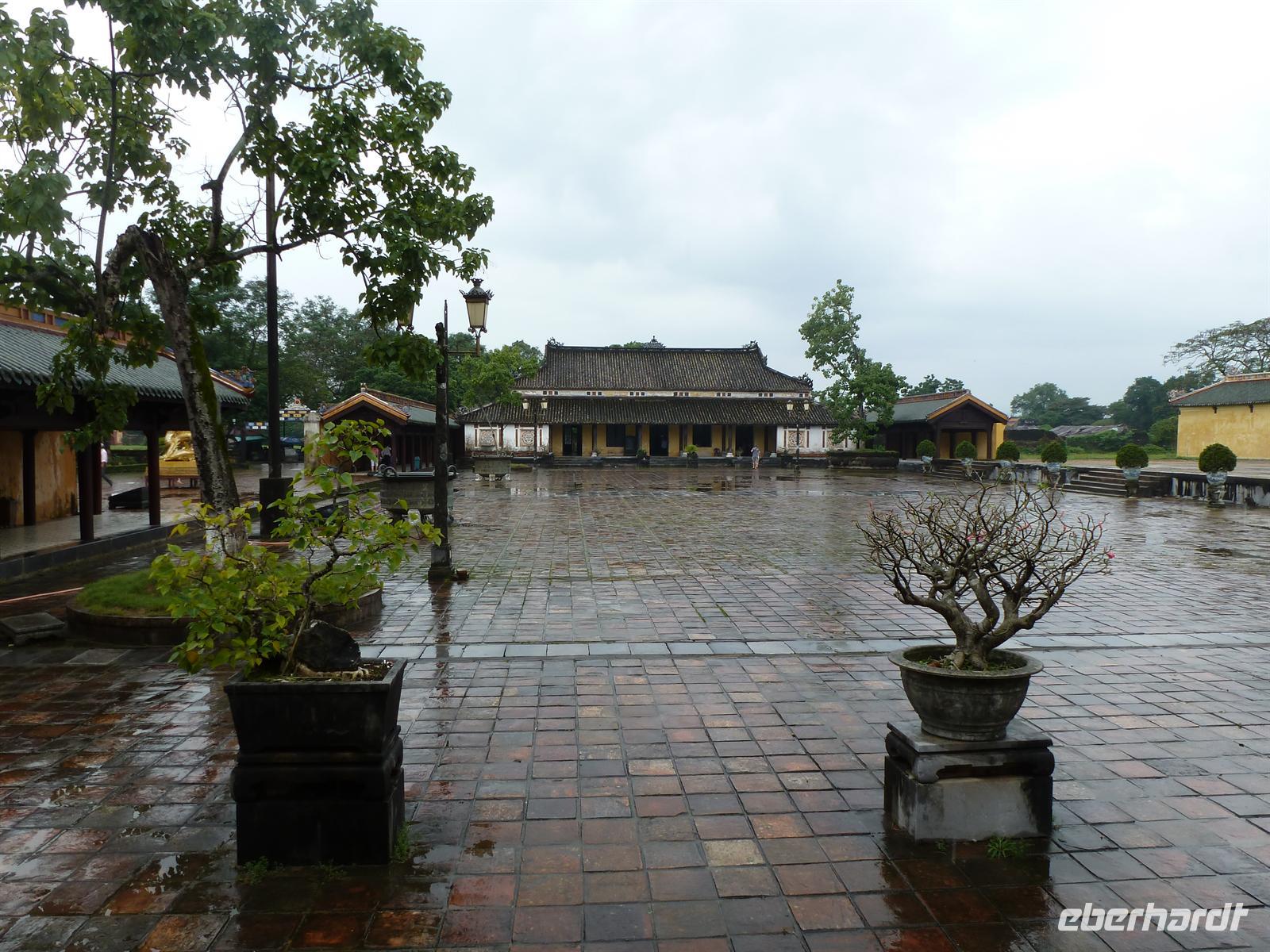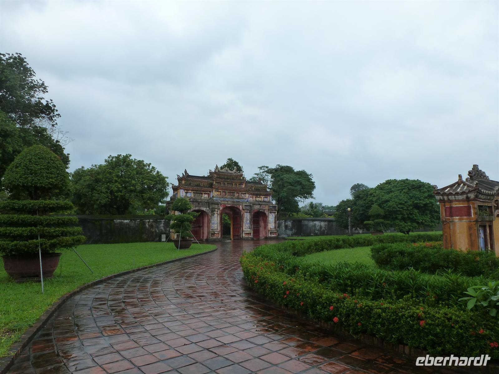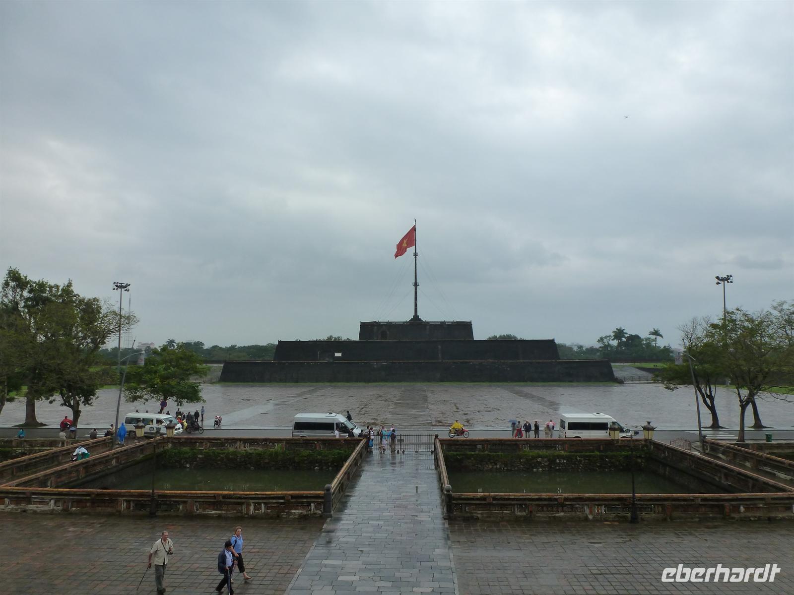 Sehr, sehr zeitig am Morgen machten wir uns auf den Weg nach Süden, nach Hue in Zentralvietnam. Da unser Flieger schon um 06.10 Uhr von Hanoi aus starten sollte, begann für uns der heutige Tag bereits um 03.00 Uhr. Einmal durch fast stille, noch weitgehend menschenleere Straßen zu fahren, in einer sonst quirligen 6-Millionen-Metropole, hatte etwas Düsteres, Unwirkliches an sich. Aber auf unserem Weg zum Airport sahen wir auch die ersten Anzeichen des Erwachens einer Großstadt. Unser Flug nach Hue verlief ohne Probleme und wir landeten pünktlich um 07.15 Uhr in der alten Kaiserstadt. Hier hatte es in den letzten Tagen wie fast überall in Zentralvietnam ungewöhnlich hohe Niederschläge gegeben, weshalb es an vielen Stellen „Land unter“ hieß und wir schon befürchten mussten, die Bootsfahrt auf dem Parfümfluss nicht durchführen zu können. Doch soweit war es noch nicht. Obwohl uns die einstige Hauptstadt des vietnamesischen Reiches mit Regen empfing, gingen wir nach einer Tasse Kaffee oder Tee in einem kleinen Cafe am Flussufer zur Besichtigung der Zitadelle und der darin eingebetteten