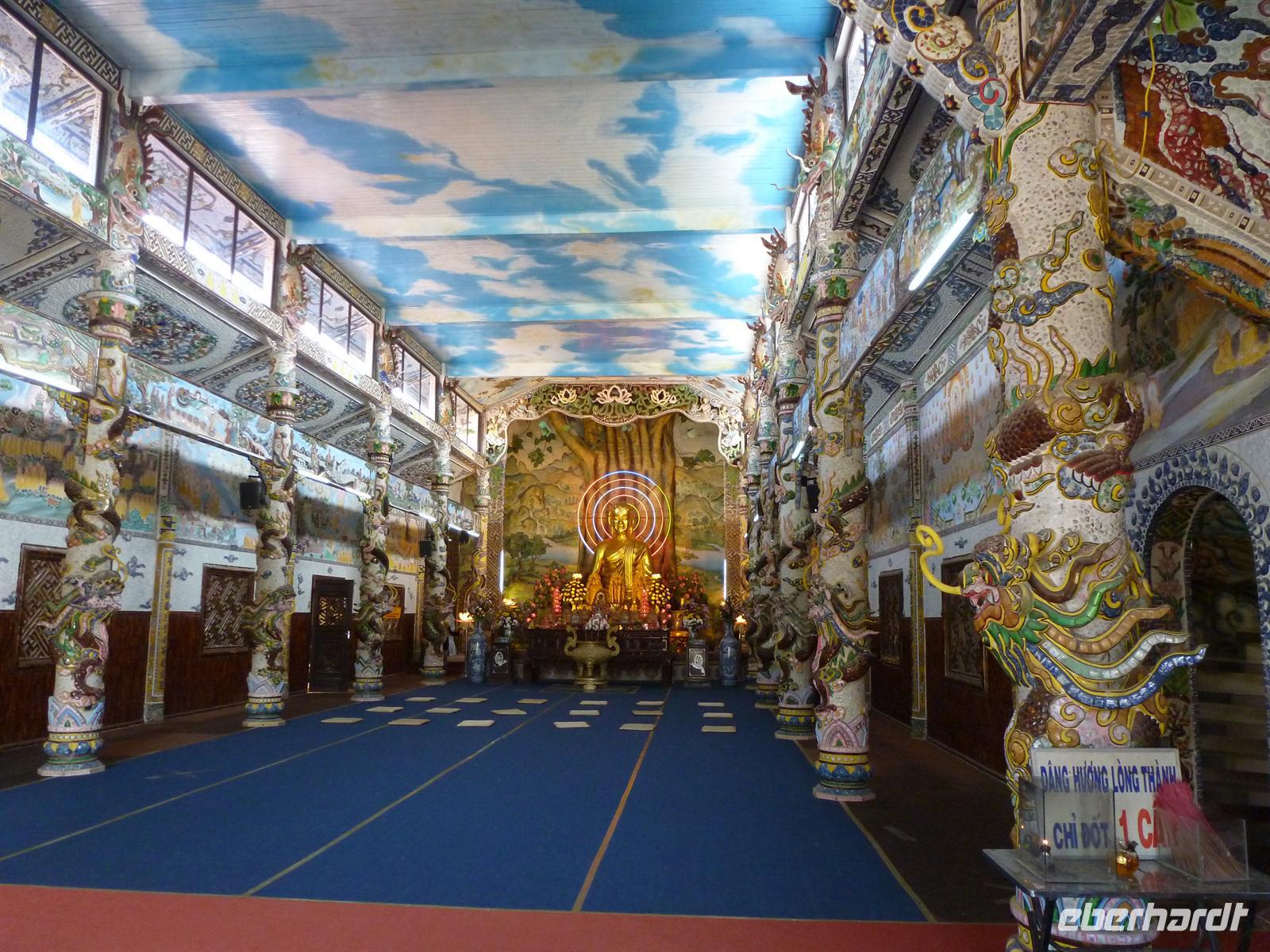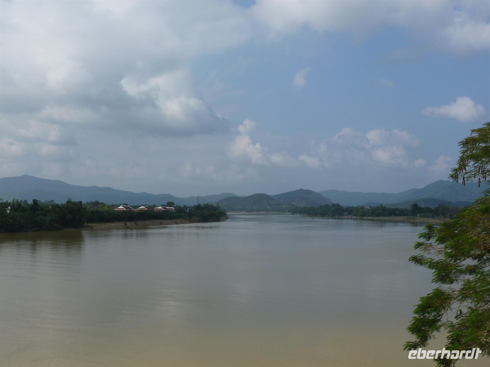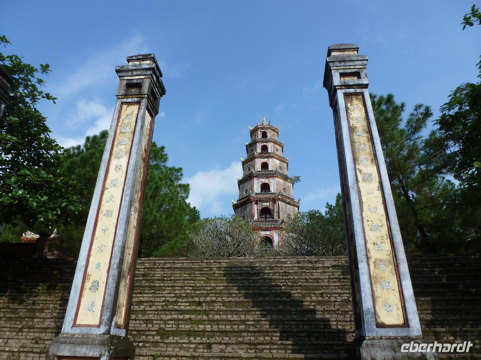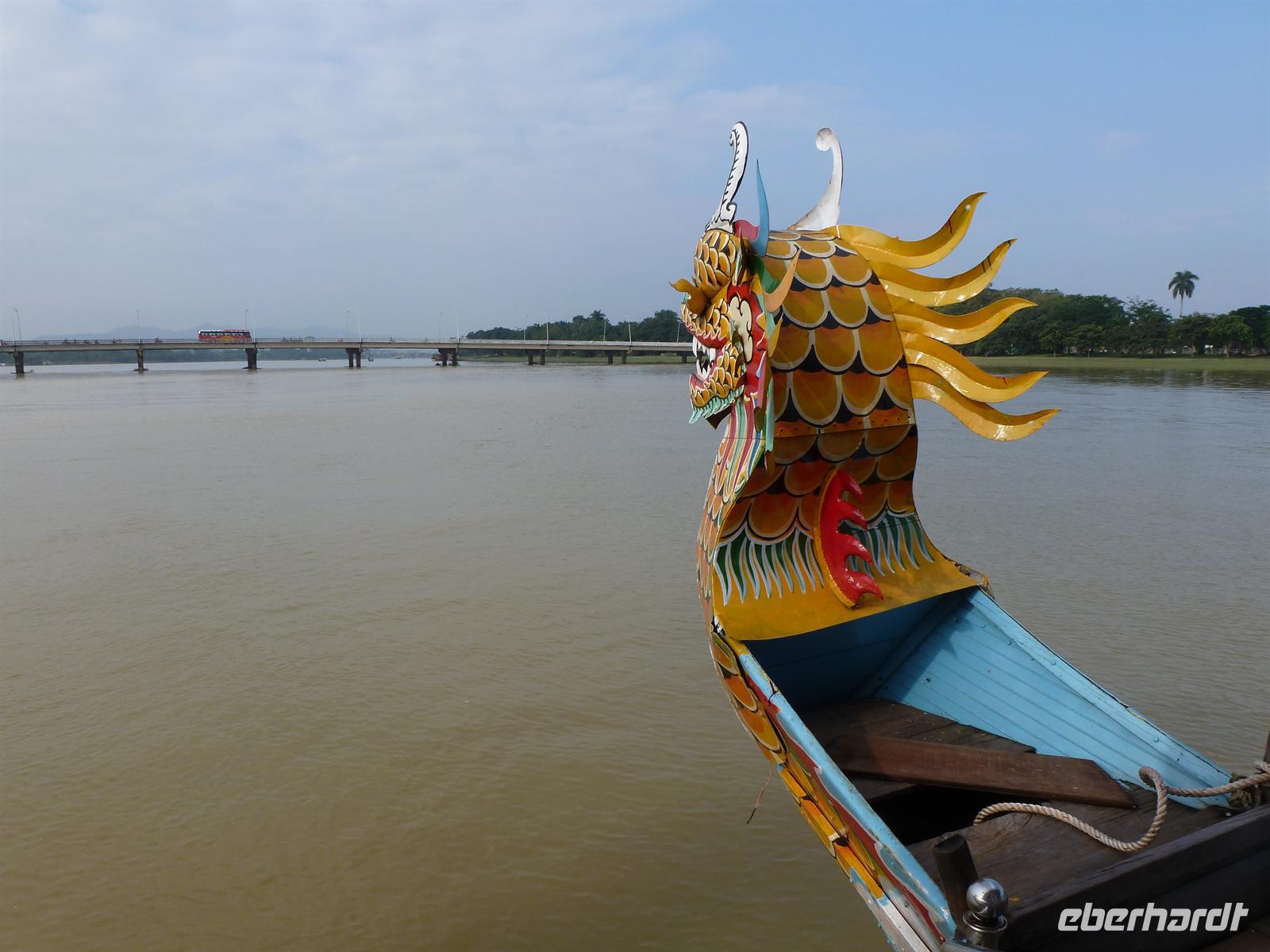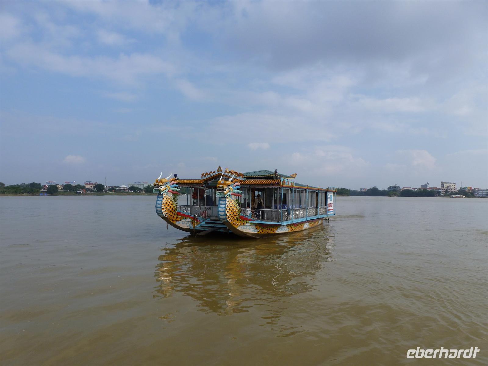Nach einem hervorragenden Frühstück im Hotel hieß es schon wieder Koffer packen und Abschied nehmen. Doch bevor wir Hue endgültig in Richtung Süden verließen, standen noch einige Besichtigungen auf dem Programm. Entgegen unseren bisherigen Befürchtungen konnten wir trotz Hochwassers an Bord eines der berühmten Drachenboote gehen und auf dem Parfümfluss zur ältesten Pagode Hues, zur Thien-Mu, fahren. Allenthalben begegneten uns auf dem Fluss der Wohlgerüche diese bunten Drachenboote, die majestätisch auf dem Strom dahinglitten. Schon von weitem konnten wir den siebenstöckigen Turm der Thien-Mu-Pagode erblicken, der auf einer Anhöhe über dem Fluss steht. Wir besuchten das 1601 errichtete buddhistische Heiligtum, welches sehr gut erhalten ist und auch heute noch Mönche ausbildet und beherbergt.
