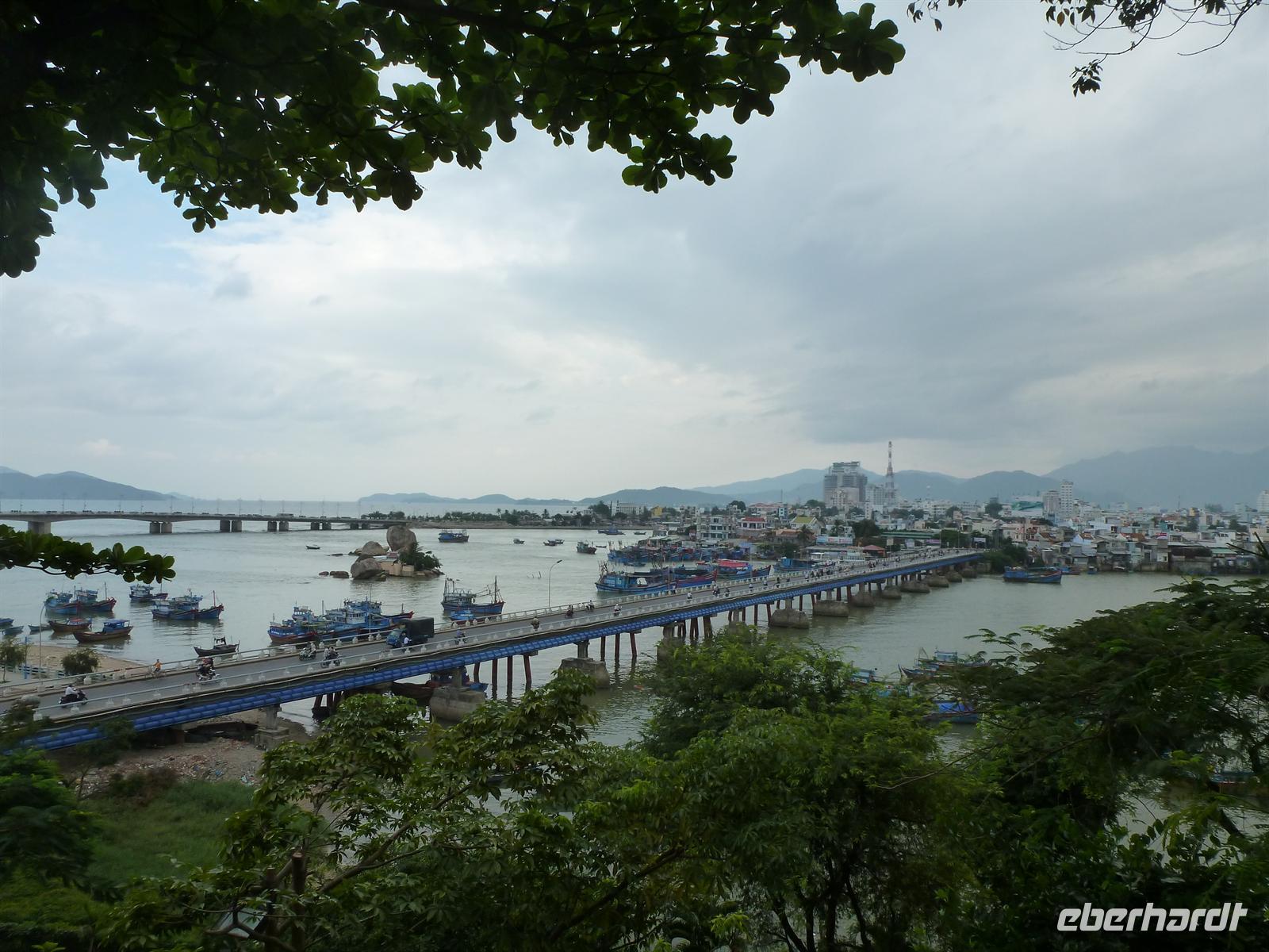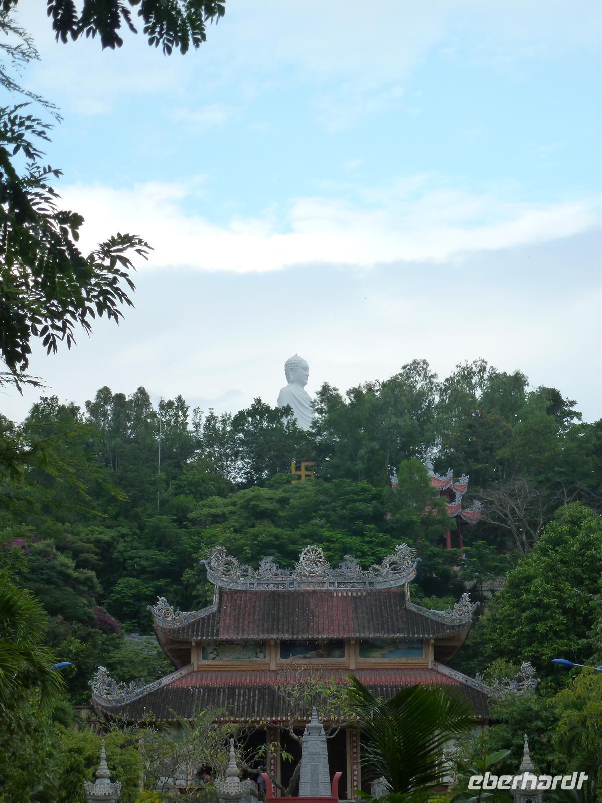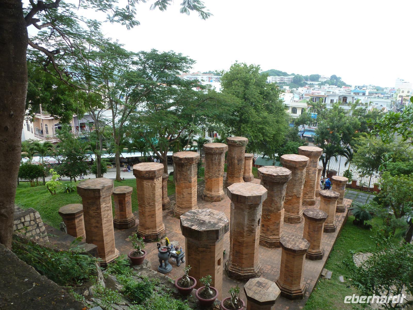 niederschlug. Ein und dasselbe (einfache) Gericht, z.B. Tomatensuppe, wurde im zeitlichen Abstand von dreißig Minuten gebracht. Aber das Personal war engagiert (zum Teil kümmerten sich bis zu acht Mitarbeiter gleichzeitig und völlig durcheinander um uns) und wir hatten trotzdem unseren Spaß dabei. Einigermaßen gestärkt begannen wir unsere Besichtigung bei den mehr als 1000 Jahre alten Türmen von Po Nagar, der Muttergöttin der Cham. Auf einem Hügel nördlich des Zentrums stehend, sind von den ehemals acht Türmen nur noch vier erhalten. Auf dem Hügel führte eine Folkloregruppe der einheimischen Cham-Minderheit traditionelle Tänze auf. Anschließend ging die Fahrt weiter zur Long Son Pagode und der weißen Buddha-Statue, die auf einem Lotosthron sitzend die Stadt weithin sichtbar überragt. Klettert man die 140 Stufen von der Pagode zu dem weißen Buddha empor, kann man einen tollen Ausblick genießen. Zum Abschluss führte uns unser Weg zum zentralen Dam Markt, wie in jeder größeren vietnamesischen Stadt Mittelpunkt einheimischer Aktivitäten und die gleichen Produkte offerierend, wie wir sie in jeder Stadt bisher gesehen haben. Was daran liegt, dass es größtenteils Dinge des täglichen Lebens und benötigte Frischwaren, wie Fisch, Fleisch und Gemüse, sind. Den heutigen Abschluss bildete ein Abendessen im Gia-Restaurant, welches überwiegend aus Meeresfrüchten bestand und in seiner Zubereitung, unter anderem Meeresfrüchtesalat und überbackene Jakobsmuscheln, sehr delikat und schmackhaft war. Aufgrund der vorgerückten Stunde und des einsetzenden leichten Regens konnten wir leider kein Bad im Meer nehmen, so dass uns nur der Blick entlang des sechs Kilometer langen, feinsandigen Strandes als Alternative blieb.