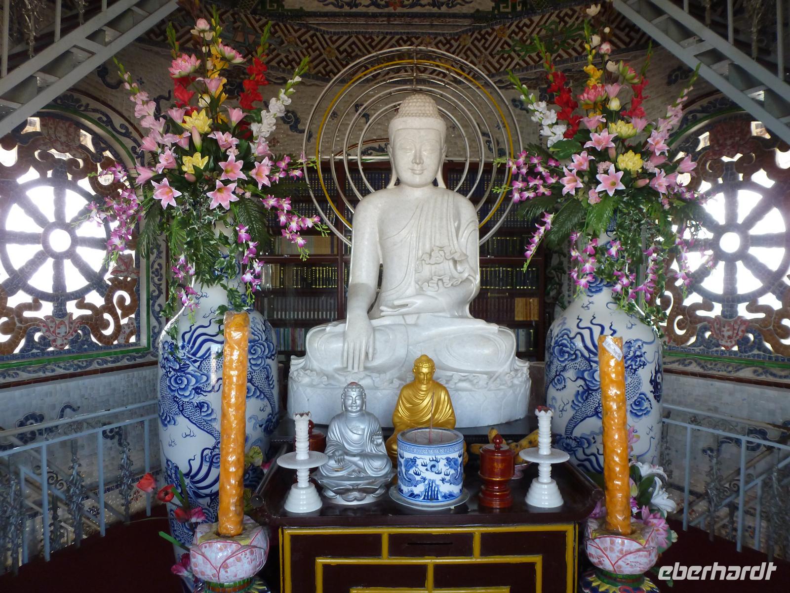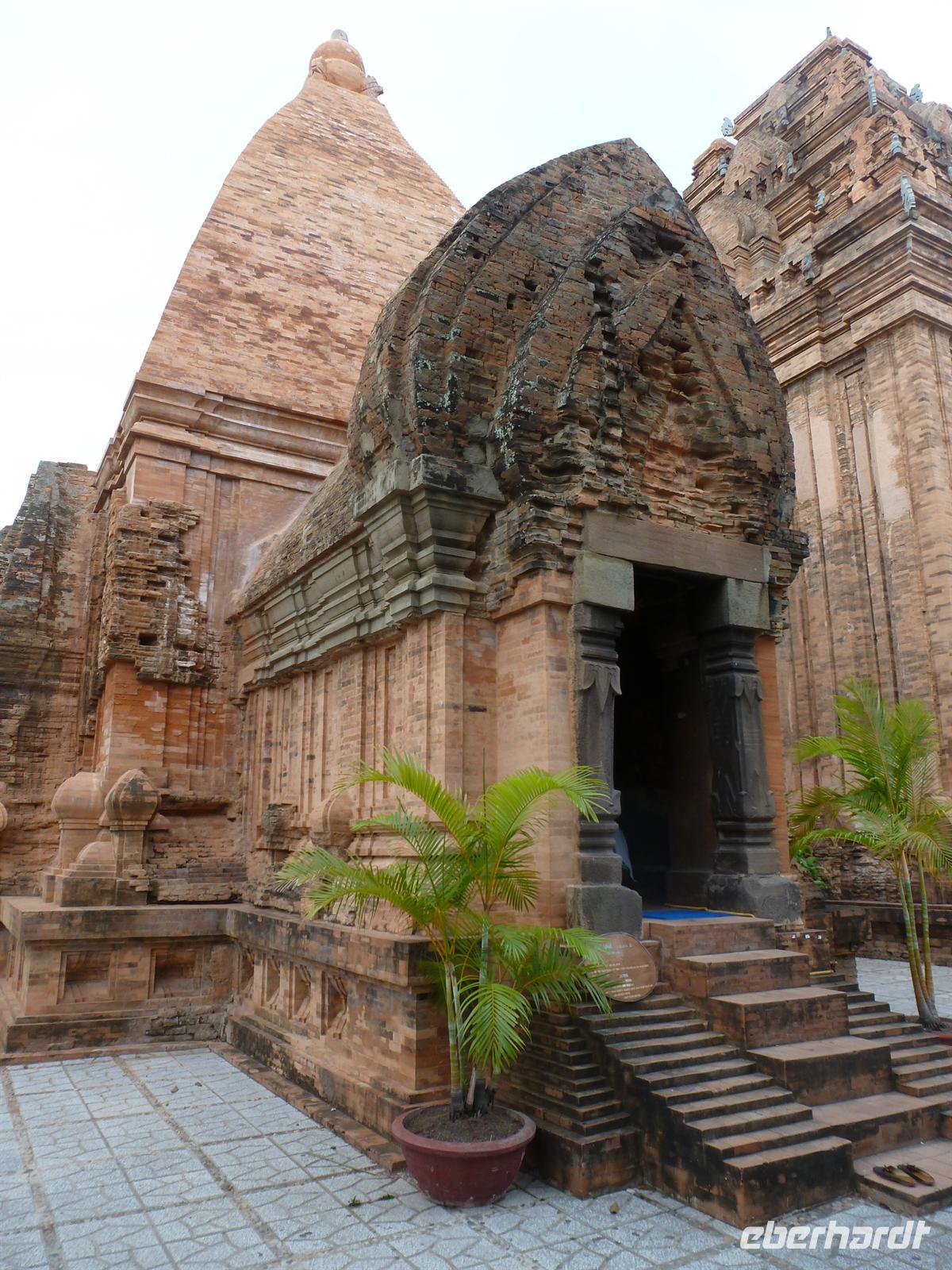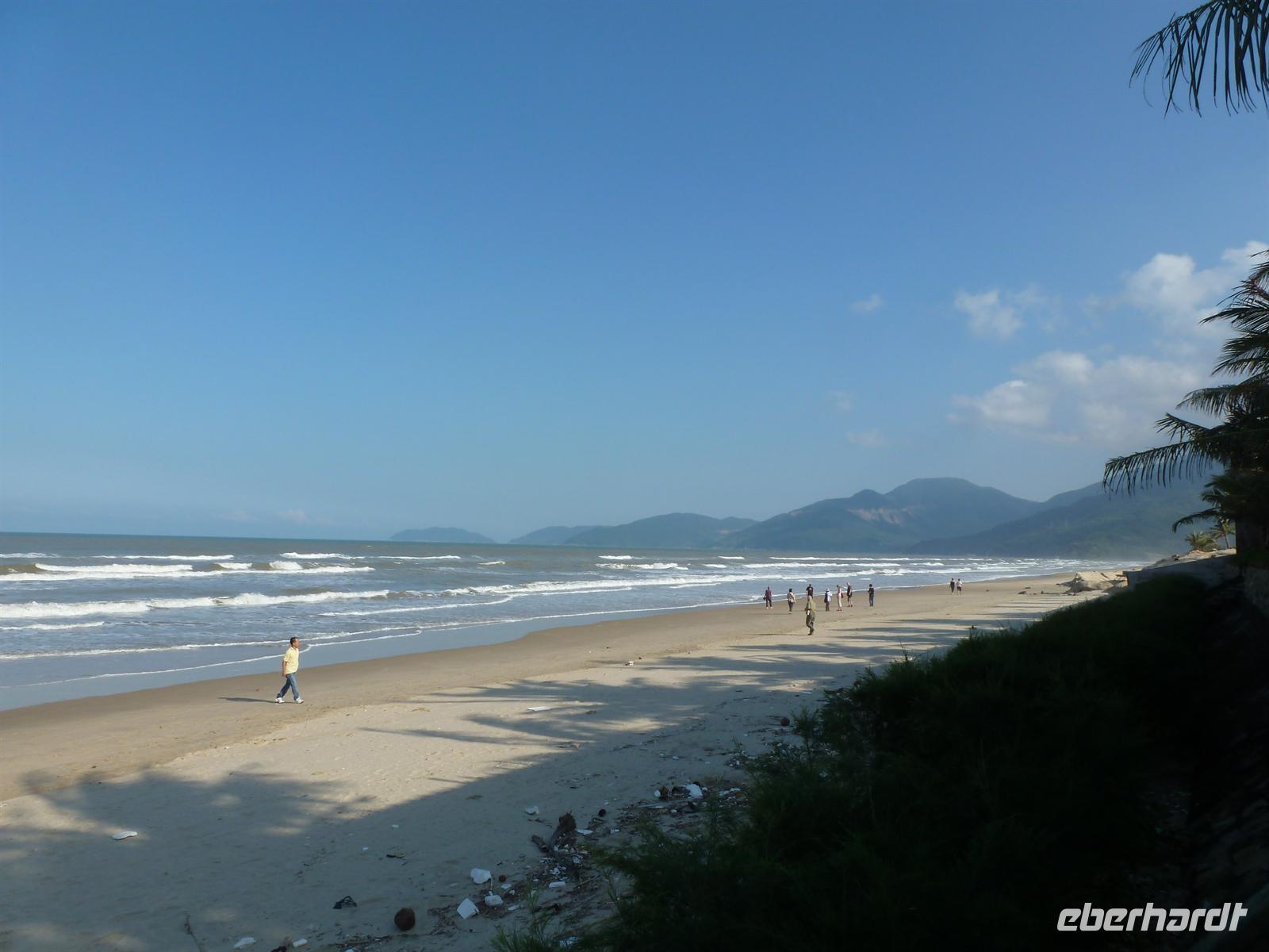 niederschlug. Ein und dasselbe (einfache) Gericht, z.B. Tomatensuppe, wurde im zeitlichen Abstand von dreißig Minuten gebracht. Aber das Personal war engagiert (zum Teil kümmerten sich bis zu acht Mitarbeiter gleichzeitig und völlig durcheinander um uns) und wir hatten trotzdem unseren Spaß dabei. Einigermaßen gestärkt begannen wir unsere Besichtigung bei den mehr als 1000 Jahre alten Türmen von Po Nagar, der Muttergöttin der Cham. Auf einem Hügel nördlich des Zentrums stehend, sind von den ehemals acht Türmen nur noch vier erhalten. Auf dem Hügel führte eine Folkloregruppe der einheimischen Cham-Minderheit traditionelle Tänze auf. Anschließend ging die Fahrt weiter zur Long Son Pagode und der weißen Buddha-Statue, die auf einem Lotosthron sitzend die Stadt weithin sichtbar überragt. Klettert man die 140 Stufen von der Pagode zu dem weißen Buddha empor, kann man einen tollen Ausblick genießen. Zum Abschluss führte uns unser Weg zum zentralen Dam Markt, wie in jeder größeren vietnamesischen Stadt Mittelpunkt einheimischer Aktivitäten und die gleichen Produkte offerierend, wie wir sie in jeder Stadt bisher gesehen haben. Was daran liegt, dass es größtenteils Dinge des täglichen Lebens und benötigte Frischwaren, wie Fisch, Fleisch und Gemüse, sind. Den heutigen Abschluss bildete ein Abendessen im Gia-Restaurant, welches überwiegend aus Meeresfrüchten bestand und in seiner Zubereitung, unter anderem Meeresfrüchtesalat und überbackene Jakobsmuscheln, sehr delikat und schmackhaft war. Aufgrund der vorgerückten Stunde und des einsetzenden leichten Regens konnten wir leider kein Bad im Meer nehmen, so dass uns nur der Blick entlang des sechs Kilometer langen, feinsandigen Strandes als Alternative blieb.