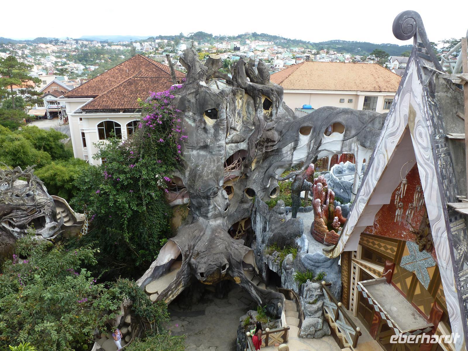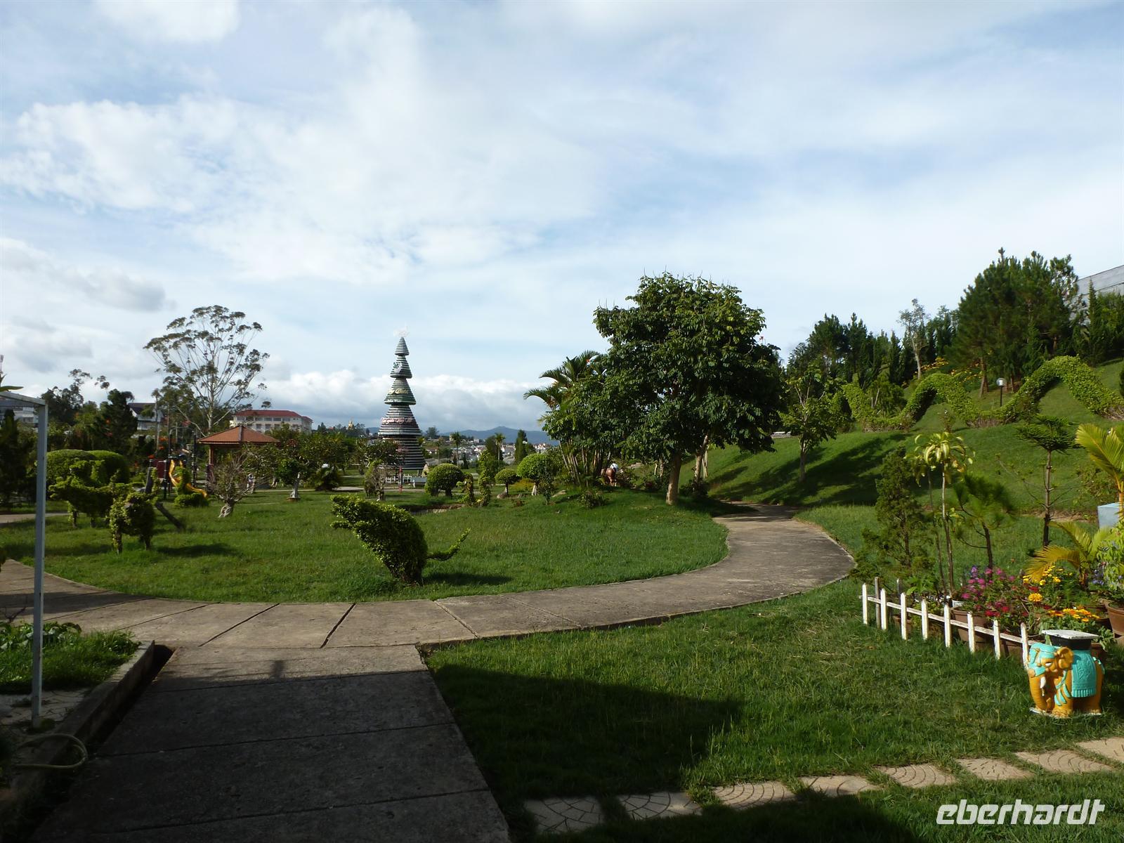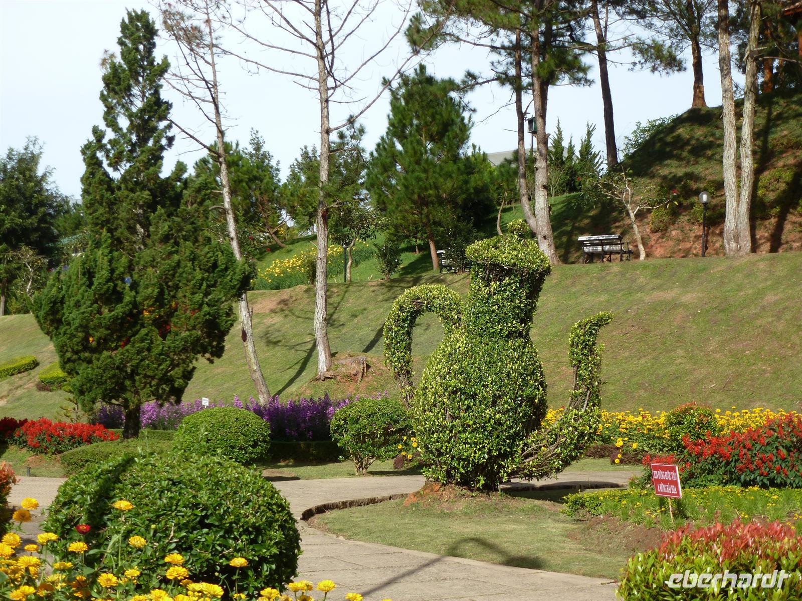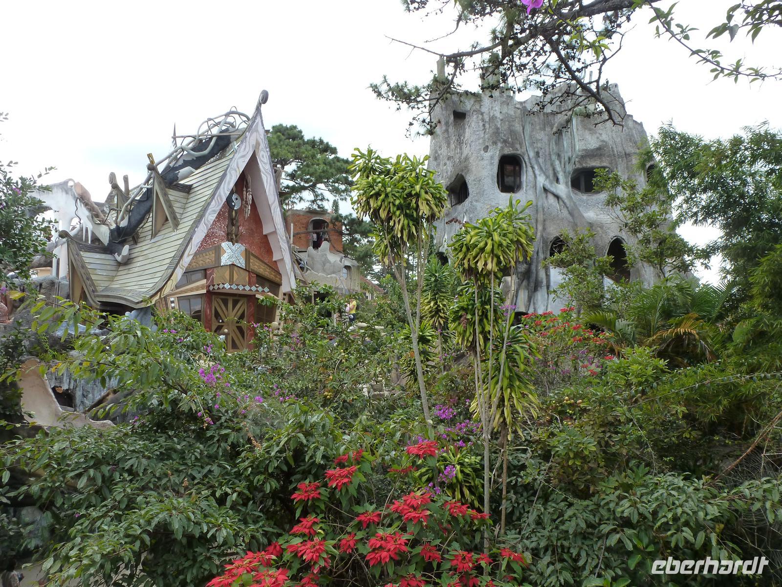 verzierten den Pagodenturm mit tausenden kleinen Keramiksteinchen, die aus buntem Porzellan durch schnödes zerdeppern gewonnen wurden. Und der ganze Schaffensprozess ging ohne Vorlage oder Zeichnung vonstatten, einzig Augenmaß und künstlerische Begabung waren vonnöten. Anschließend fuhren wir mit unserem Bus zum ehemaligen Sommerpalast des letzten vietnamesischen Kaisers, Bao Dai, der auf einer Anhöhe über der Stadt im Bauhaus bzw. Art-Deco-Stil beheimatet. Das eher funktional daherkommende Gebäude aus den dreißiger Jahren liegt in einer weitläufigen Gartenanalage und wirkt trotz oder gerade wegen der Schnörkellosigkeit seiner Inneneinrichtung zeitlos modern. Nach dem Besuch der ehemals kaiserlichen Gemächer wendeten wir uns nun einem ganz anders gearteten Gebäude zu, dem sogenannten Crazy House, dem verrückten Haus, gestaltet von der vietnamesischen Präsidententochter und Architektin Hang Nga. Das Gebäude wurde als Phantasieobjekt ohne Ecken und Kanten aus Beton gestaltet und ist ein steingewordener Kindheitstraum, ein willkürliches ineinander übergehen bunter Wohnhöhlen, verbunden durch abenteuerlich geschwungene Treppen und Pfade in lichten Höhen, ein wenig wie Hundertwasser unter dem Einfluss von Rauschmitteln. Nach einem kleinen Mittagessen ging es zur letzten Station unserer heutigen Tour, dem Botanischen Garten von Da Lat. Inmitten einer großen, gepflegten Anlage können wir viele einheimische Pflanzen und Bäume in voller Blüte bewundern und am schön angelegten See auch ein wenig die Seele baumeln lassen. Der Heimweg führt uns nochmal am großen Markt von Da Lat vorbei. Unser heutiges Abendessen genossen wir im „Art Cafe“, ein kleines, gemütliches Restaurant, betrieben von einem Künstler, der mit seinen „Fingern“ malt und der uns an seiner Kunst vor dem Dessert teilhaben lies, indem er von jedem die Initialen zu Papier brachte und uns dies zum Geschenk machte. Das Essen war auch sehr gut und lecker, in einer etwas anderen geschmacklichen Zusammenstellung als an den vorhergehenden Abenden, was zur Abwechslung beigetragen hat.