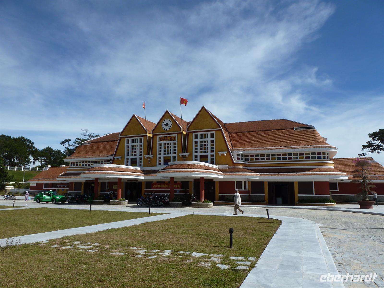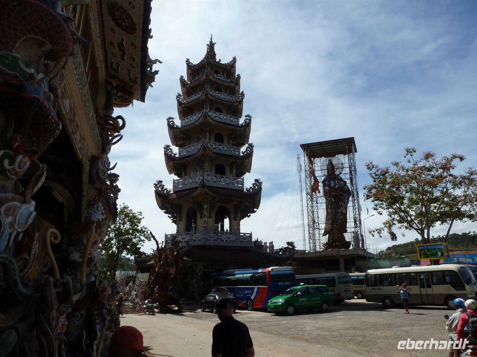 Heute stand ein ganz entspannter Tag auf dem Programm, bewegten wir uns doch hauptsächlich in und um Da Lat herum. Nach einem ausgiebigem Frühstück machten wir uns bei schönstem Sonnenschein und 26 Grad Wärme auf den Weg zum Bahnhof von Da Lat, um hier eine nostalgische Zugfahrt auf ein paar Kilometern noch nicht stillgelegter Gleise in das kleine Örtchen Trai Mat zu erleben. Der ganze Zug bestand aus zwei historischen Wagen und einer Diesellokomotive. Die Fahrt führte durch die schöne Berglandschaft um Da Lat, gesäumt von Obst- und Gemüseplantagen, Terrassenfeldern und vor allem von Gewächshaussiedlungen. Nach halbstündiger Fahrt in Trai Mat angekommen, stiegen wir uns und spazierten zur Linh-Phuoc-Pagode (Pagode des Heiligen Glücks). Unterwegs kauften wir an einem Obststand Drachenaugen-Früchte, die zwar Aufgrund eines großen, mittig sitzenden Kerns wenig Fruchtfleisch hatten, aber sehr lecker schmeckten. Nach der Besichtigung der farbenprächtigen Pagode und der Besteigung des danebenliegenden, fast dreißig Meter hohen Turms schauten wir den Handwerkern bei Ihrer Arbeit zu. Holzbildhauer schufen mit Kettensägen, Elektrohobel und Schleifmaschinen Kunstwerke aus riesigen Wurzeln, bildeten daraus Buddhastatuen oder Drachenskulpturen. Andere Handwerker