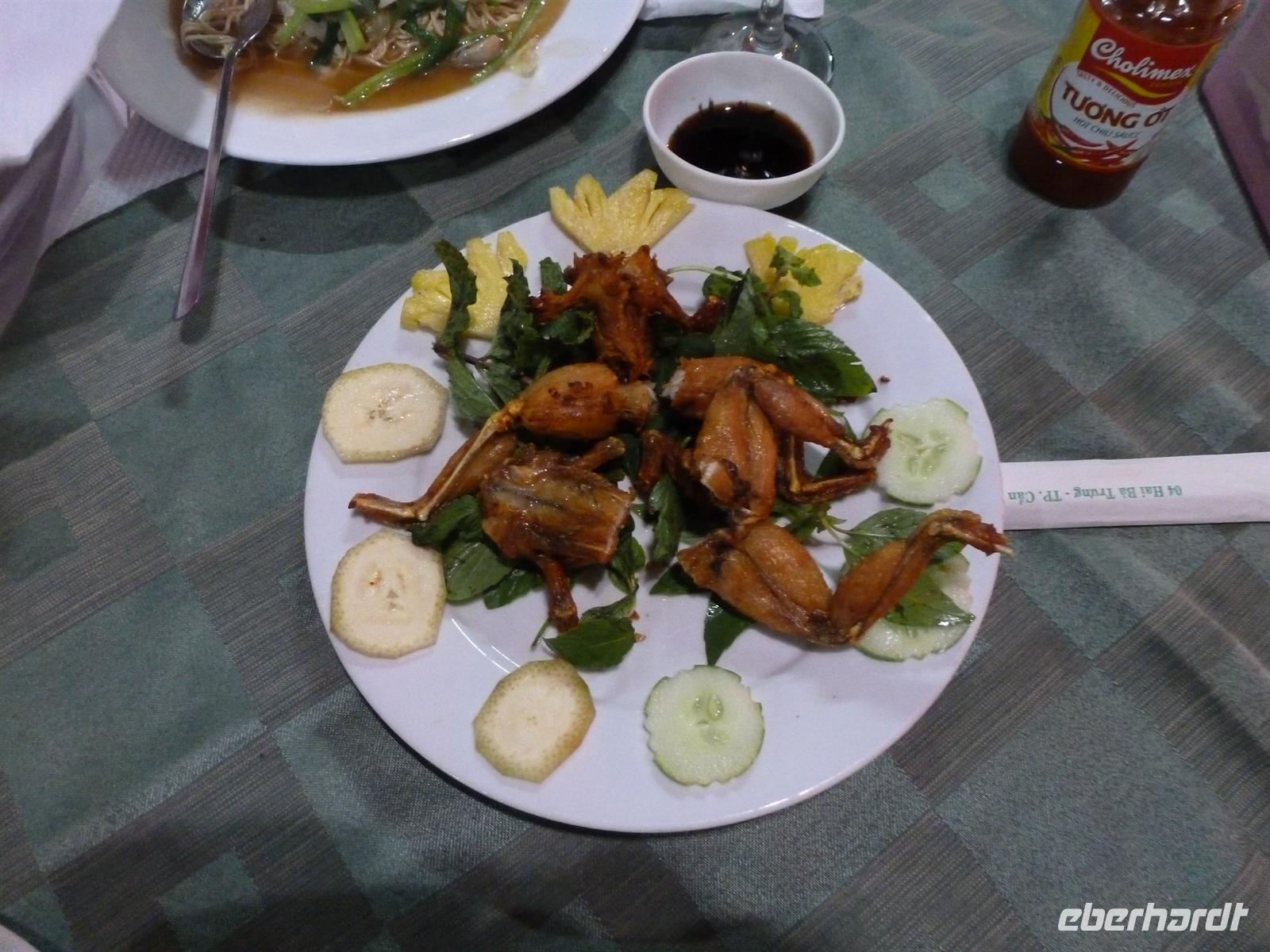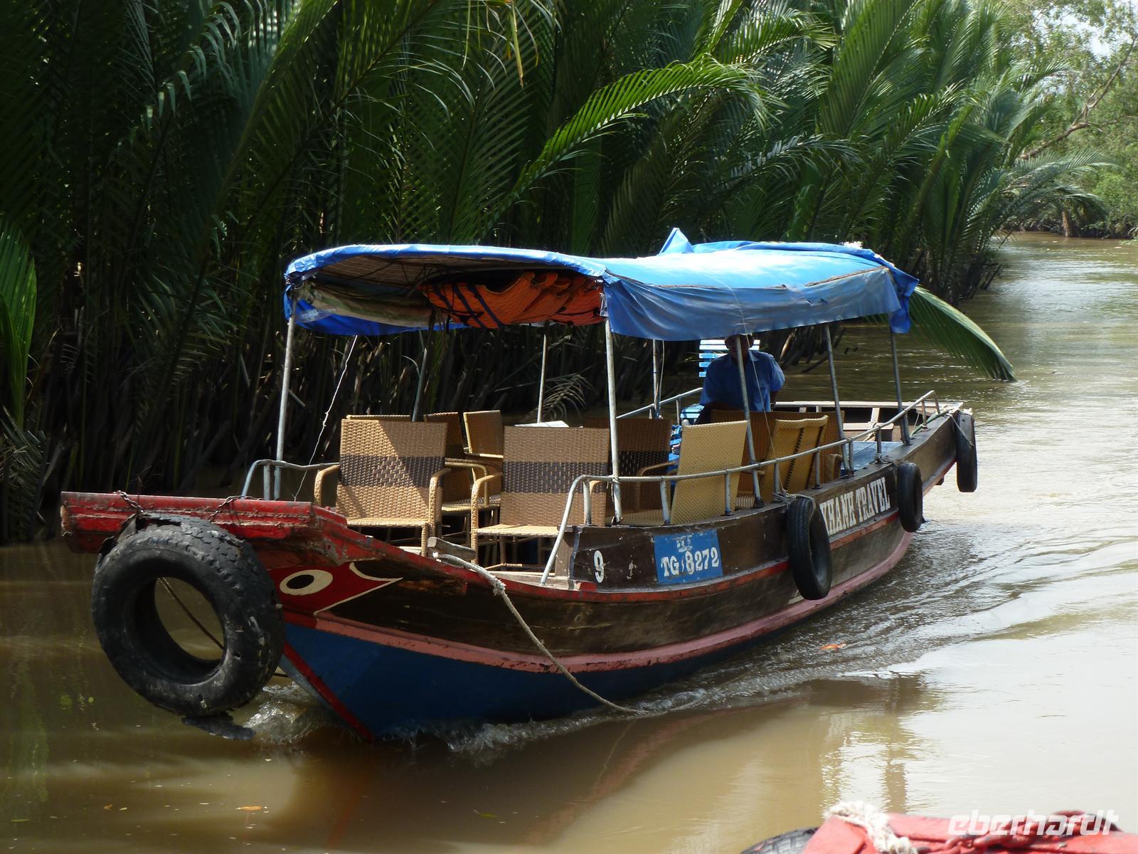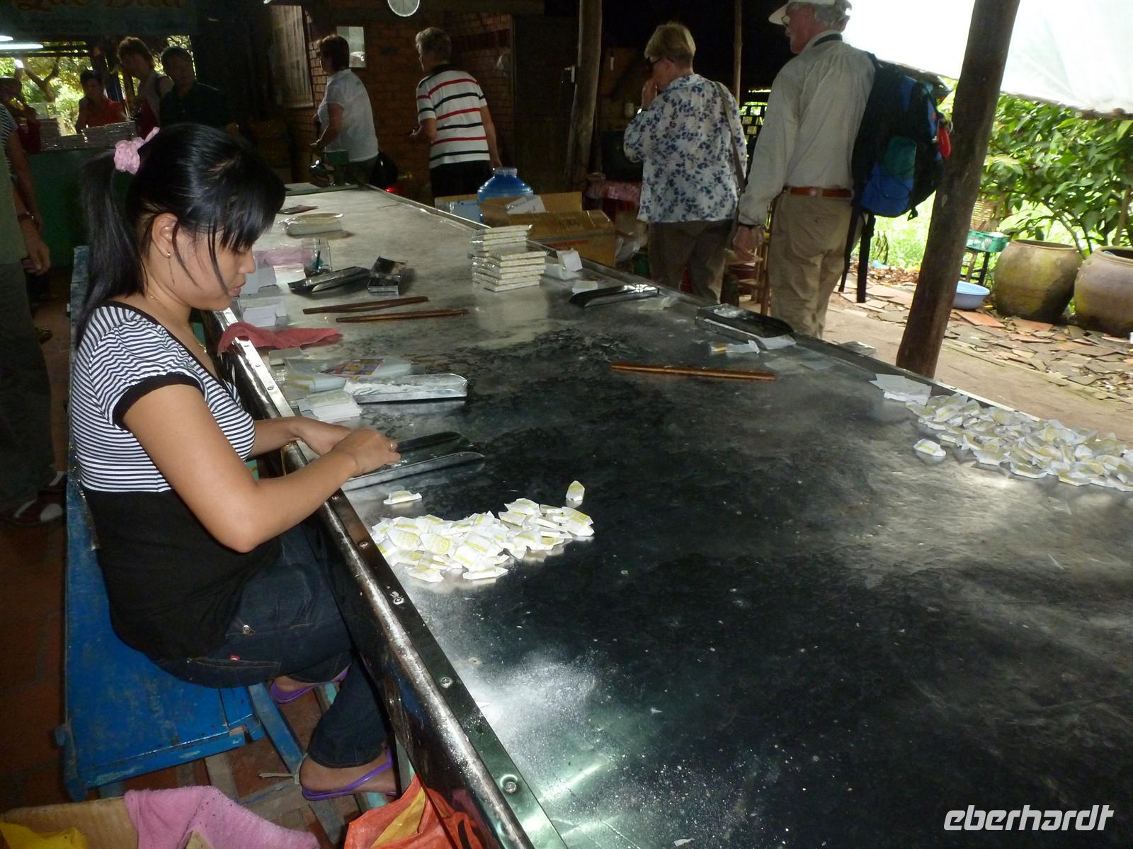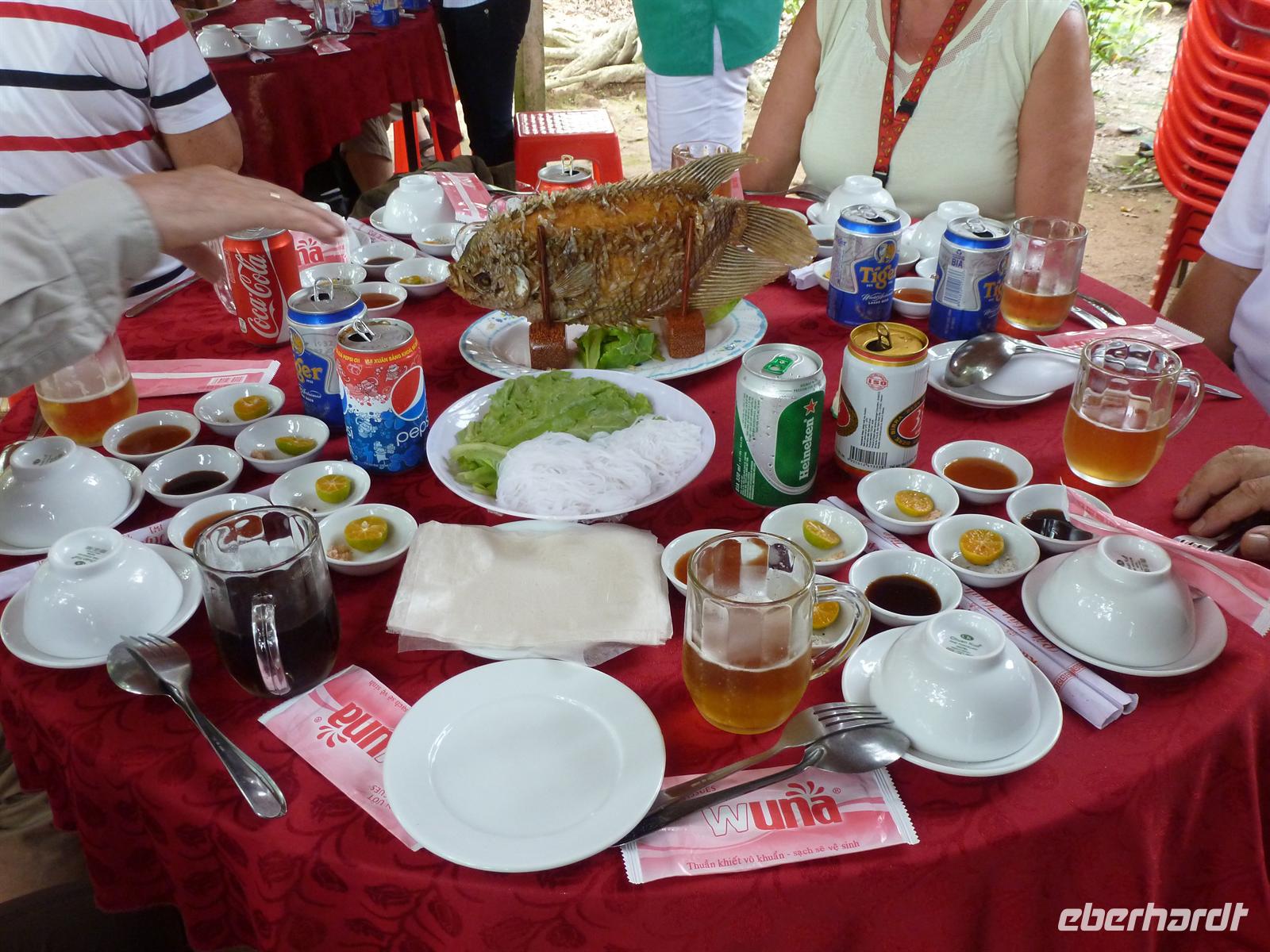 zurück zu unserem großen Boot geht. Das Ufer wird von Wasserpalmen und Mangroven gesäumt und man wähnt sich fernab jeglicher Zivilisation, dabei findet unweit von uns der tägliche Kampf für ein einfaches, bescheidenes Leben statt. Mit unserem großen Boot gelangen wir zu einer weiteren Insel, wo wir eine Kokos-Bonbon-Herstellung besichtigen, Kokosschnaps, Ingwer- und Stinkfruchtbonbons probieren. Das anschließende Mittagessen bei einer Bauernfamilie ist ein einfaches, aber authentisches Mahl und beinhaltet unter anderem neben dem schmackhaften Elefantenohrfisch auch Riesengarnelen, Gemüsesuppe, Rind-, Schwein- und Hühnchenfleisch sowie den obligaten Reis. Geschmeckt hat es allen sehr gut. Sehr Sehens- aber nicht Nutzenswert war die Toilette auf diesem Hof. Ein Betonpfeiler ragte ca. zwei Meter über ein großes Wasserloch hinaus, am Ende befand sich eine viereckige Öffnung im Beton, umschlossen von einer 50 cm hohen Kiste, in die man sich hinein hocken und seinem Bedürfnis nachkommen konnte. Selbstverständlich guckte dabei der gesamte Oberkörper aus der Kiste, was dem ganzen Prozedere eine besonders lustige Note verlieh und Gespräche mit zufällig anwesenden Personen möglich machte. Ein außen angebrachter Drahtkorb enthielt das Papier, ob gebraucht oder ungebraucht wurde von uns nicht eruiert. Fertig. Einfach, urban und rein biologisch. Es gibt nur eine Variante dieser Toilette, die noch einfacher ist: ins Gebüsch hocken ohne Kiste… Nachdem wir alle wieder gut mit unserem Boot in My Tho angelandet waren, ging es mit dem Bus weiter nach Can Tho, unserem heutigen Übernachtungsziel. Nach einer kurzen Erholungspause im Hotel trafen wir uns alle zu einem kulinarischen Festessen der etwas anderen Art in einem Lokal an der Uferstraße, wollten wir doch heute mal Schlange, Frosch oder Feldmaus probieren. Zur Schlange hat es dann den Meisten am Mut gefehlt, dafür hat ein Großteil unserer Gruppe Frosch und Feldmaus probiert und einhellig beides für gut und lecker befunden. Das ungewohnte Essen haben wir mit ein, zwei guten Gläschen Wein begossen und konnten als Fazit eine unbedingte Weiterempfehlung aussprechen.