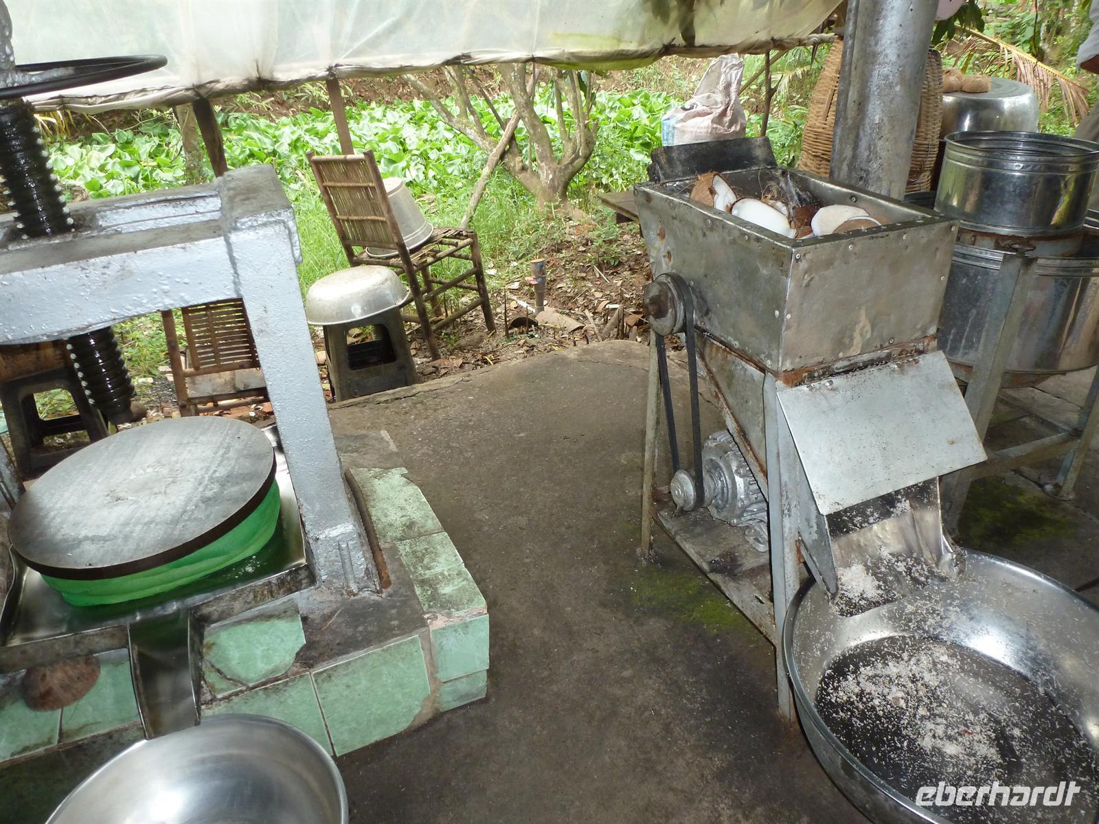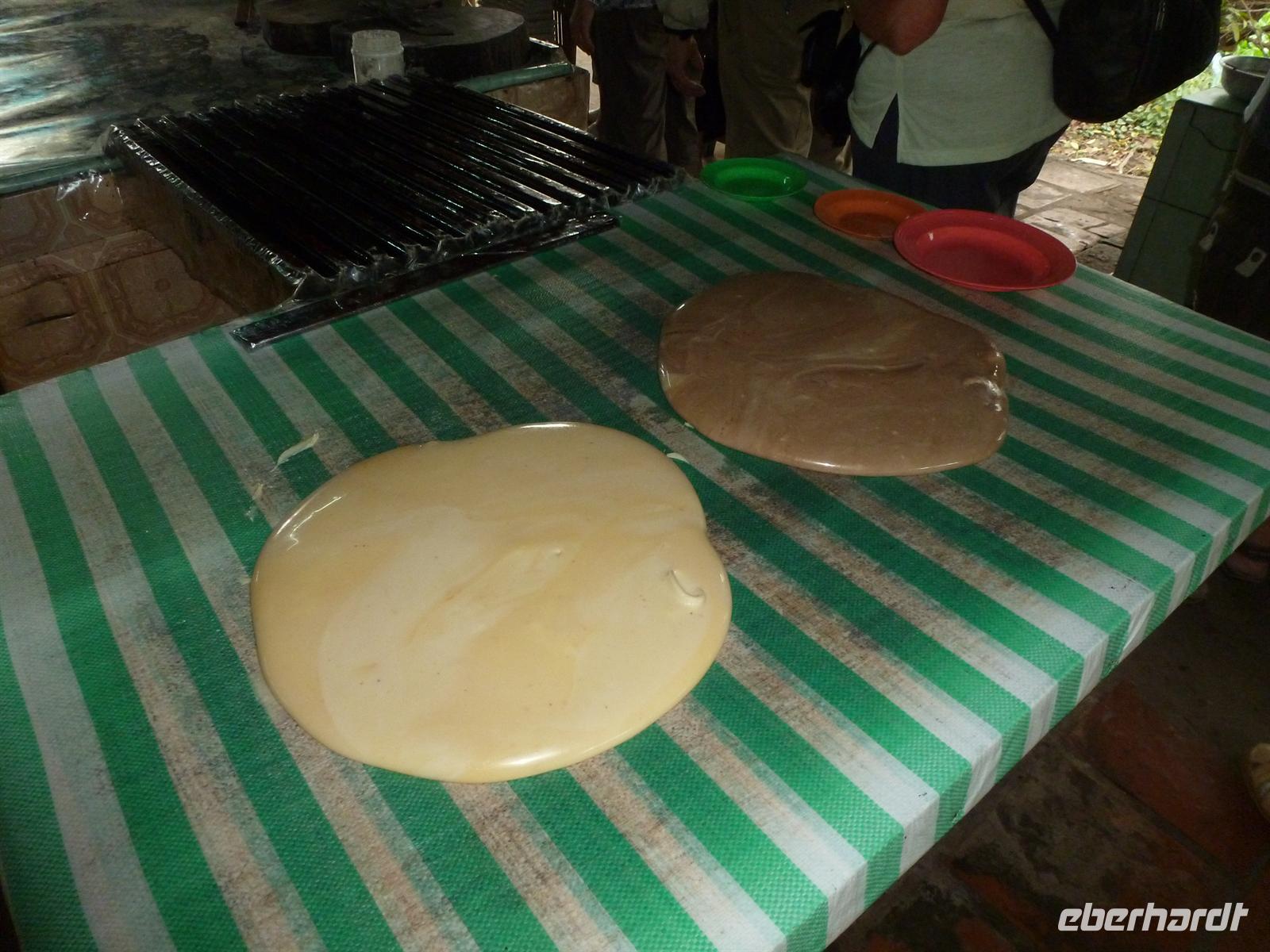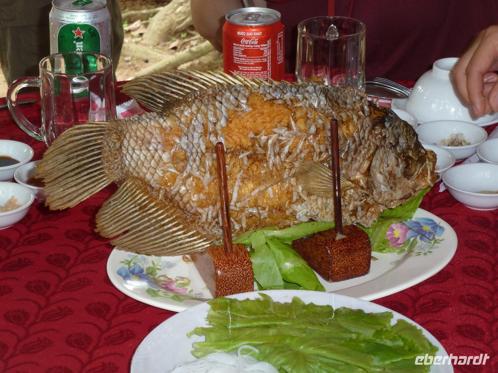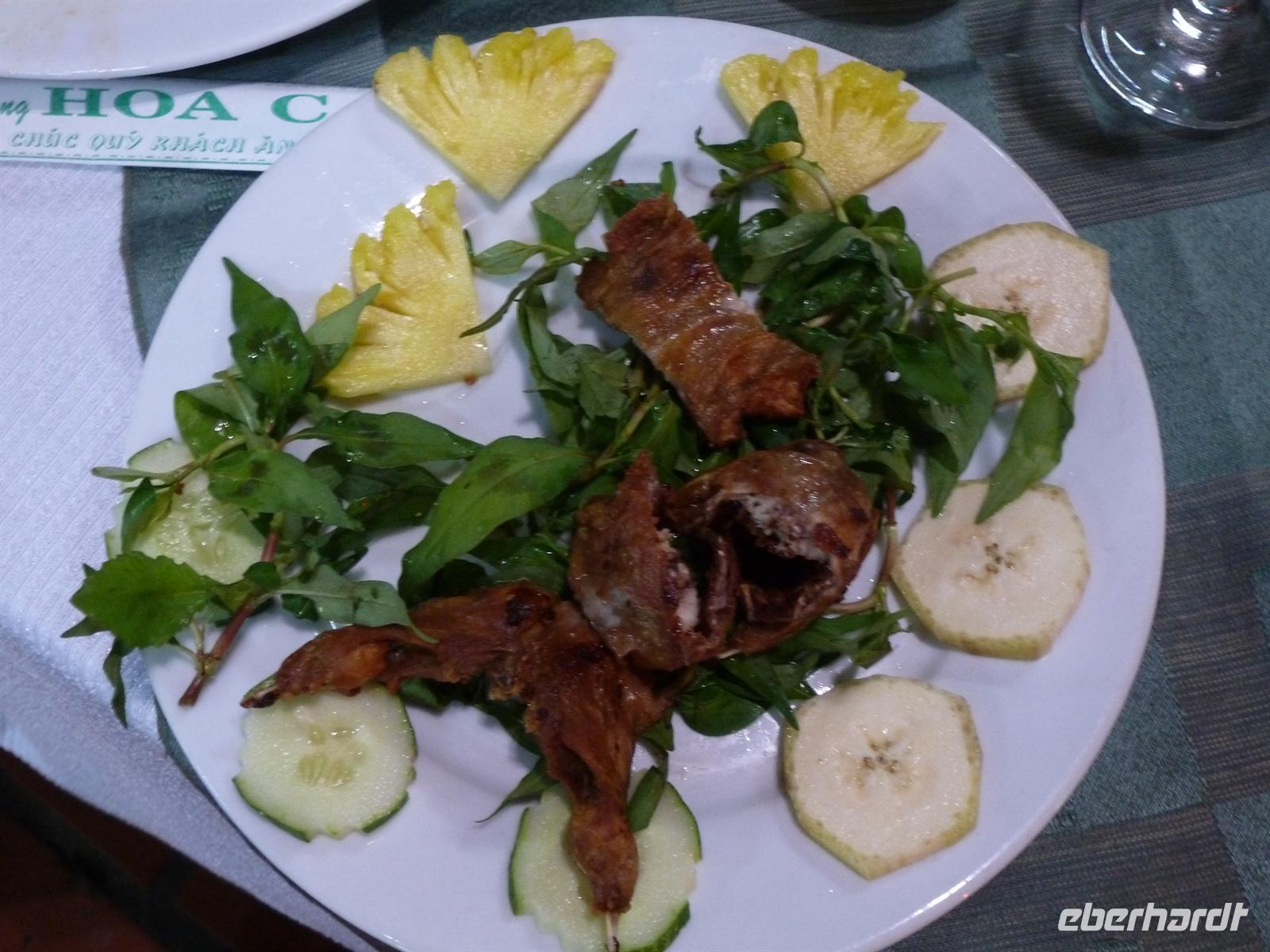 zurück zu unserem großen Boot geht. Das Ufer wird von Wasserpalmen und Mangroven gesäumt und man wähnt sich fernab jeglicher Zivilisation, dabei findet unweit von uns der tägliche Kampf für ein einfaches, bescheidenes Leben statt. Mit unserem großen Boot gelangen wir zu einer weiteren Insel, wo wir eine Kokos-Bonbon-Herstellung besichtigen, Kokosschnaps, Ingwer- und Stinkfruchtbonbons probieren. Das anschließende Mittagessen bei einer Bauernfamilie ist ein einfaches, aber authentisches Mahl und beinhaltet unter anderem neben dem schmackhaften Elefantenohrfisch auch Riesengarnelen, Gemüsesuppe, Rind-, Schwein- und Hühnchenfleisch sowie den obligaten Reis. Geschmeckt hat es allen sehr gut. Sehr Sehens- aber nicht Nutzenswert war die Toilette auf diesem Hof. Ein Betonpfeiler ragte ca. zwei Meter über ein großes Wasserloch hinaus, am Ende befand sich eine viereckige Öffnung im Beton, umschlossen von einer 50 cm hohen Kiste, in die man sich hinein hocken und seinem Bedürfnis nachkommen konnte. Selbstverständlich guckte dabei der gesamte Oberkörper aus der Kiste, was dem ganzen Prozedere eine besonders lustige Note verlieh und Gespräche mit zufällig anwesenden Personen möglich machte. Ein außen angebrachter Drahtkorb enthielt das Papier, ob gebraucht oder ungebraucht wurde von uns nicht eruiert. Fertig. Einfach, urban und rein biologisch. Es gibt nur eine Variante dieser Toilette, die noch einfacher ist: ins Gebüsch hocken ohne Kiste… Nachdem wir alle wieder gut mit unserem Boot in My Tho angelandet waren, ging es mit dem Bus weiter nach Can Tho, unserem heutigen Übernachtungsziel. Nach einer kurzen Erholungspause im Hotel trafen wir uns alle zu einem kulinarischen Festessen der etwas anderen Art in einem Lokal an der Uferstraße, wollten wir doch heute mal Schlange, Frosch oder Feldmaus probieren. Zur Schlange hat es dann den Meisten am Mut gefehlt, dafür hat ein Großteil unserer Gruppe Frosch und Feldmaus probiert und einhellig beides für gut und lecker befunden. Das ungewohnte Essen haben wir mit ein, zwei guten Gläschen Wein begossen und konnten als Fazit eine unbedingte Weiterempfehlung aussprechen.
