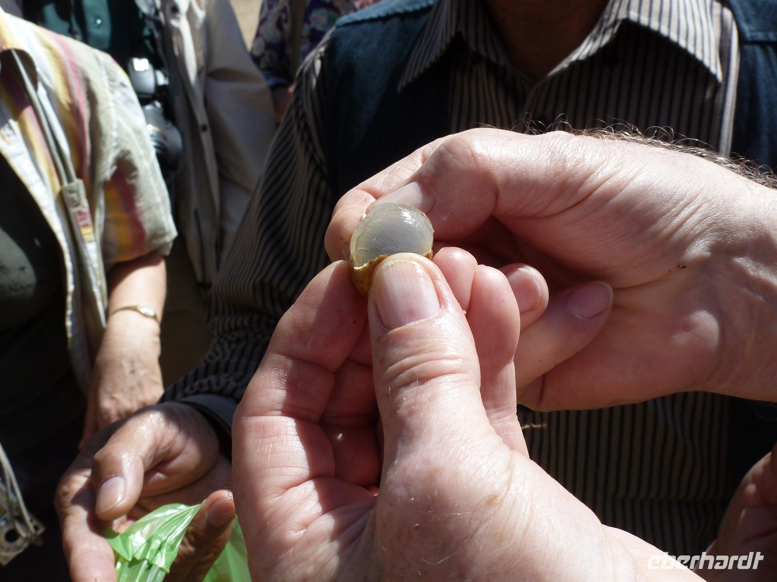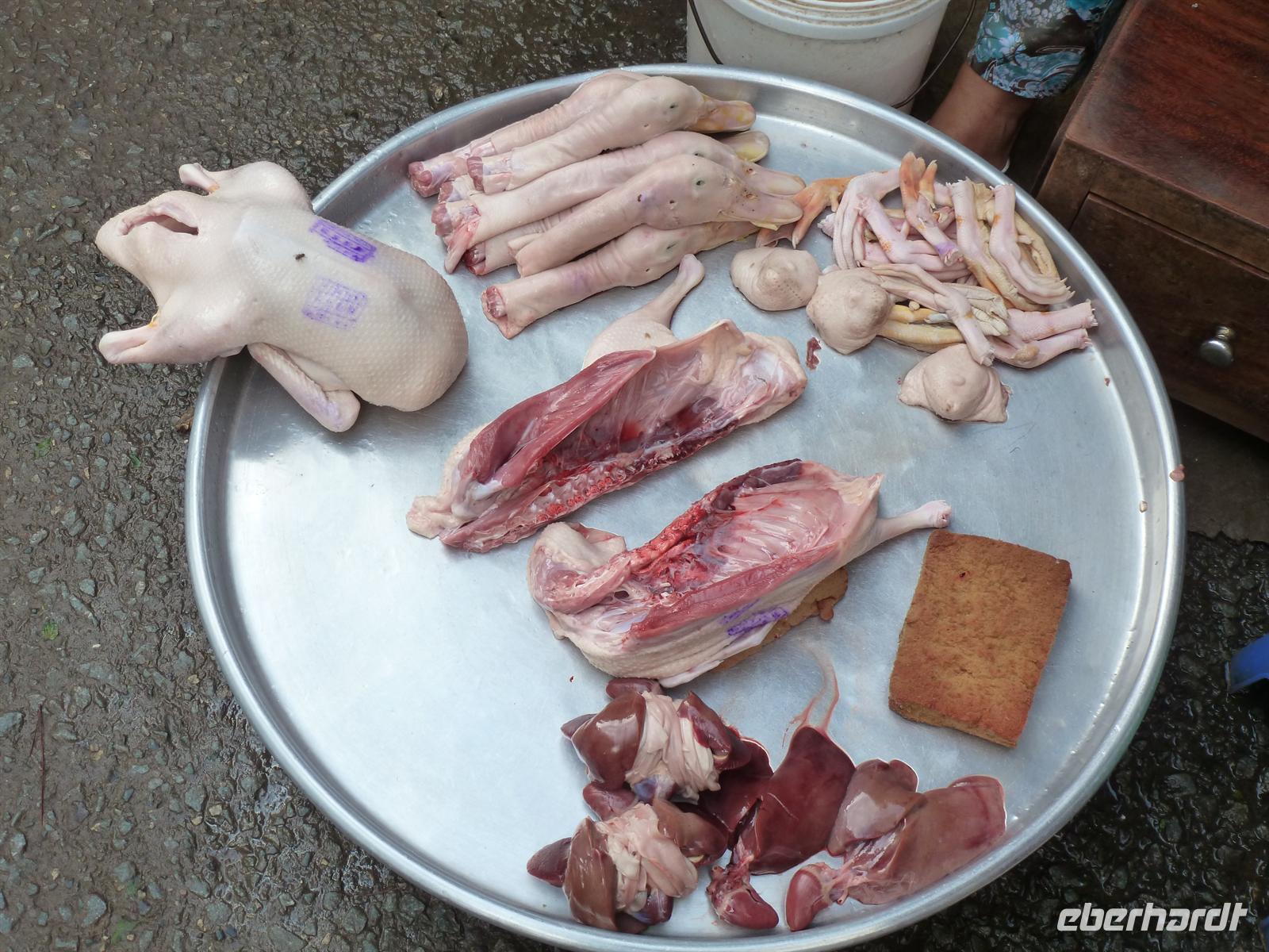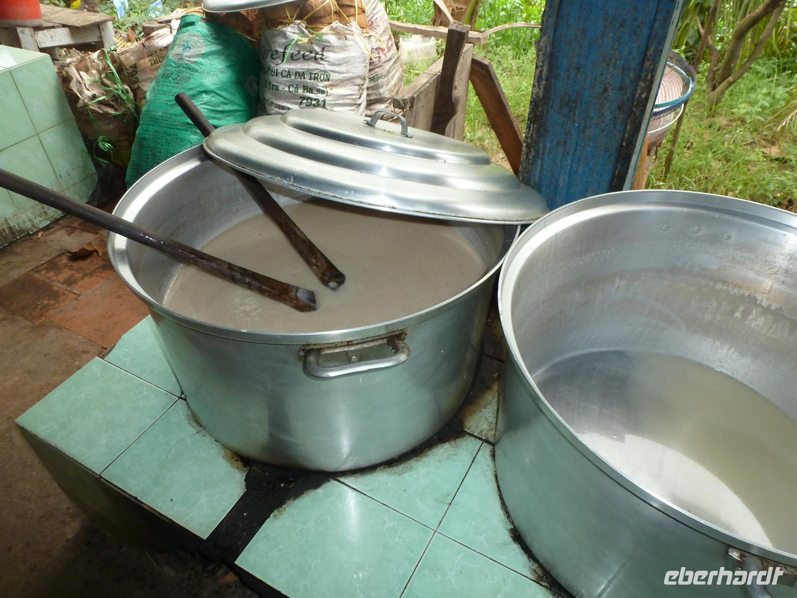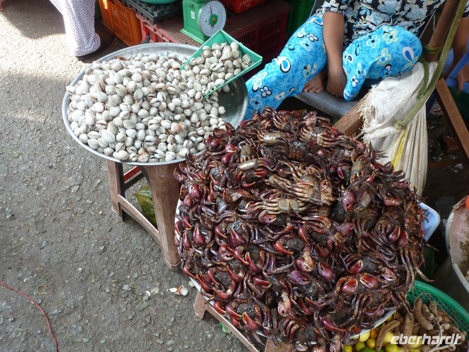 zurück zu unserem großen Boot geht. Das Ufer wird von Wasserpalmen und Mangroven gesäumt und man wähnt sich fernab jeglicher Zivilisation, dabei findet unweit von uns der tägliche Kampf für ein einfaches, bescheidenes Leben statt. Mit unserem großen Boot gelangen wir zu einer weiteren Insel, wo wir eine Kokos-Bonbon-Herstellung besichtigen, Kokosschnaps, Ingwer- und Stinkfruchtbonbons probieren. Das anschließende Mittagessen bei einer Bauernfamilie ist ein einfaches, aber authentisches Mahl und beinhaltet unter anderem neben dem schmackhaften Elefantenohrfisch auch Riesengarnelen, Gemüsesuppe, Rind-, Schwein- und Hühnchenfleisch sowie den obligaten Reis. Geschmeckt hat es allen sehr gut. Sehr Sehens- aber nicht Nutzenswert war die Toilette auf diesem Hof. Ein Betonpfeiler ragte ca. zwei Meter über ein großes Wasserloch hinaus, am Ende befand sich eine viereckige Öffnung im Beton, umschlossen von einer 50 cm hohen Kiste, in die man sich hinein hocken und seinem Bedürfnis nachkommen konnte. Selbstverständlich guckte dabei der gesamte Oberkörper aus der Kiste, was dem ganzen Prozedere eine besonders lustige Note verlieh und Gespräche mit zufällig anwesenden Personen möglich machte. Ein außen angebrachter Drahtkorb enthielt das Papier, ob gebraucht oder ungebraucht wurde von uns nicht eruiert. Fertig. Einfach, urban und rein biologisch. Es gibt nur eine Variante dieser Toilette, die noch einfacher ist: ins Gebüsch hocken ohne Kiste… Nachdem wir alle wieder gut mit unserem Boot in My Tho angelandet waren, ging es mit dem Bus weiter nach Can Tho, unserem heutigen Übernachtungsziel. Nach einer kurzen Erholungspause im Hotel trafen wir uns alle zu einem kulinarischen Festessen der etwas anderen Art in einem Lokal an der Uferstraße, wollten wir doch heute mal Schlange, Frosch oder Feldmaus probieren. Zur Schlange hat es dann den Meisten am Mut gefehlt, dafür hat ein Großteil unserer Gruppe Frosch und Feldmaus probiert und einhellig beides für gut und lecker befunden. Das ungewohnte Essen haben wir mit ein, zwei guten Gläschen Wein begossen und konnten als Fazit eine unbedingte Weiterempfehlung aussprechen.