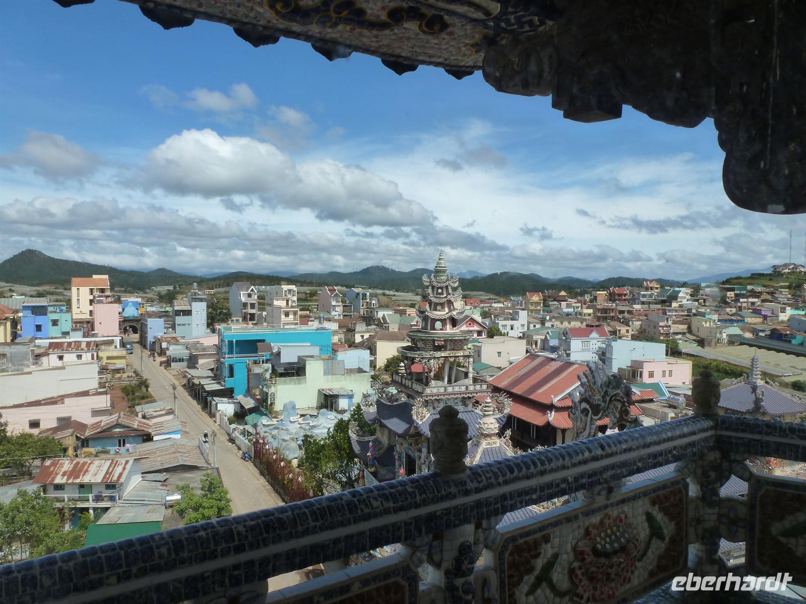 wunderbar aromatischen Kaffee in einem kleinen Bistro an einer Hochlandplantage und stoppten an der einen oder anderen Stelle, um von da aus einen Blick in das unter uns liegende Gebirgsvorland zu werfen. Wir ließen die dreißig Grad heiße und feuchte Wärme der Küstenregion hinter uns und kletterten mit jedem Straßenmeter weiter in die für uns Europäer so erträgliche gemäßigte Klimazone mit Werten von 20 Grad und des Nächtens auch darunter. Da wir uns Da Lat erst am nächsten Tag von seiner touristischen Seite her nähern wollten, beschränkten wir uns an diesem Tag auf den Bezug unserer Hotelzimmer im Herzen der „Stadt des ewigen Frühlings“ und auf eine kleinen Spaziergang in die Umgebung unseres Hotels. Selbstverständlich darf auch in Da Lat das obligate Abendessen nicht fehlen, welches wir hoch über dem kleinen städtischen See in einem netten Restaurant eingenommen haben. Suppe Rosaviolett, Shrimps im Teigmantel, Rindfleisch (am Tisch gebraten), Chicken und Pommes a’la ordinär, Banane flambiert - es war wie immer ein buntes Potpourri an asiatisch zubereiteten Speisen mit unterschiedlich hohen Herausforderungen an unser Geschmackszentrum. Der anschließende Bummel über den Markt und durch die belebten Straßen zurück zum Hotel war der sportliche Abschluss eines Tages ohne wirkliche Anstrengungen. Aber dafür hat man ja auch einen Namen erfunden - Urlaub. Und es wurde kühl am Abend in den Bergen von Da Lat….